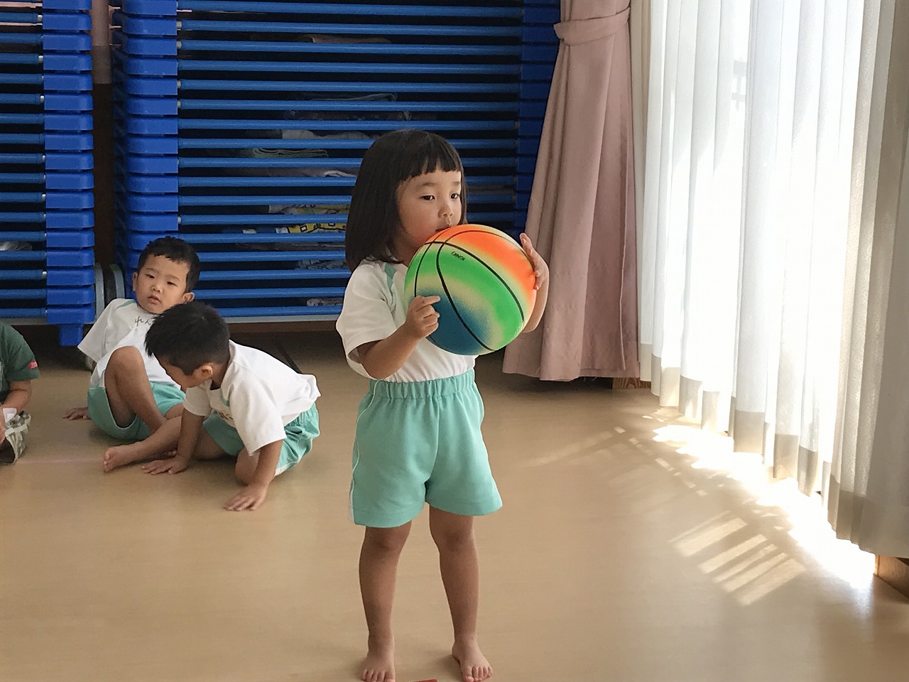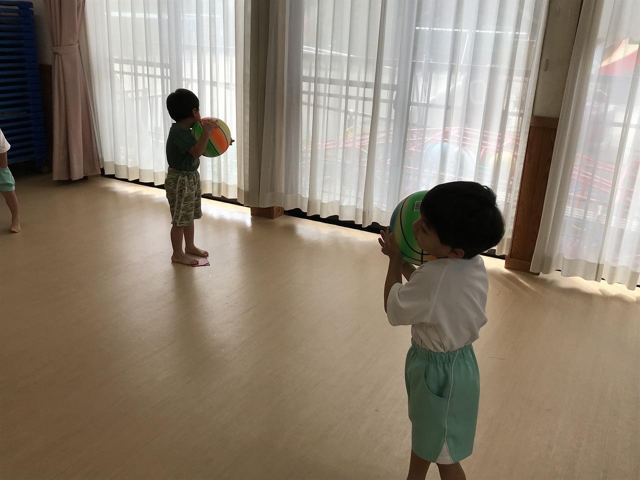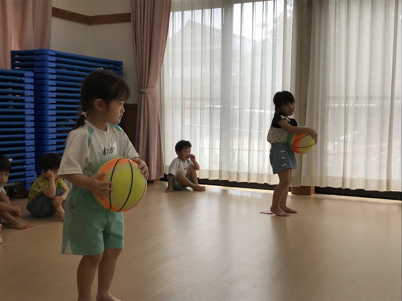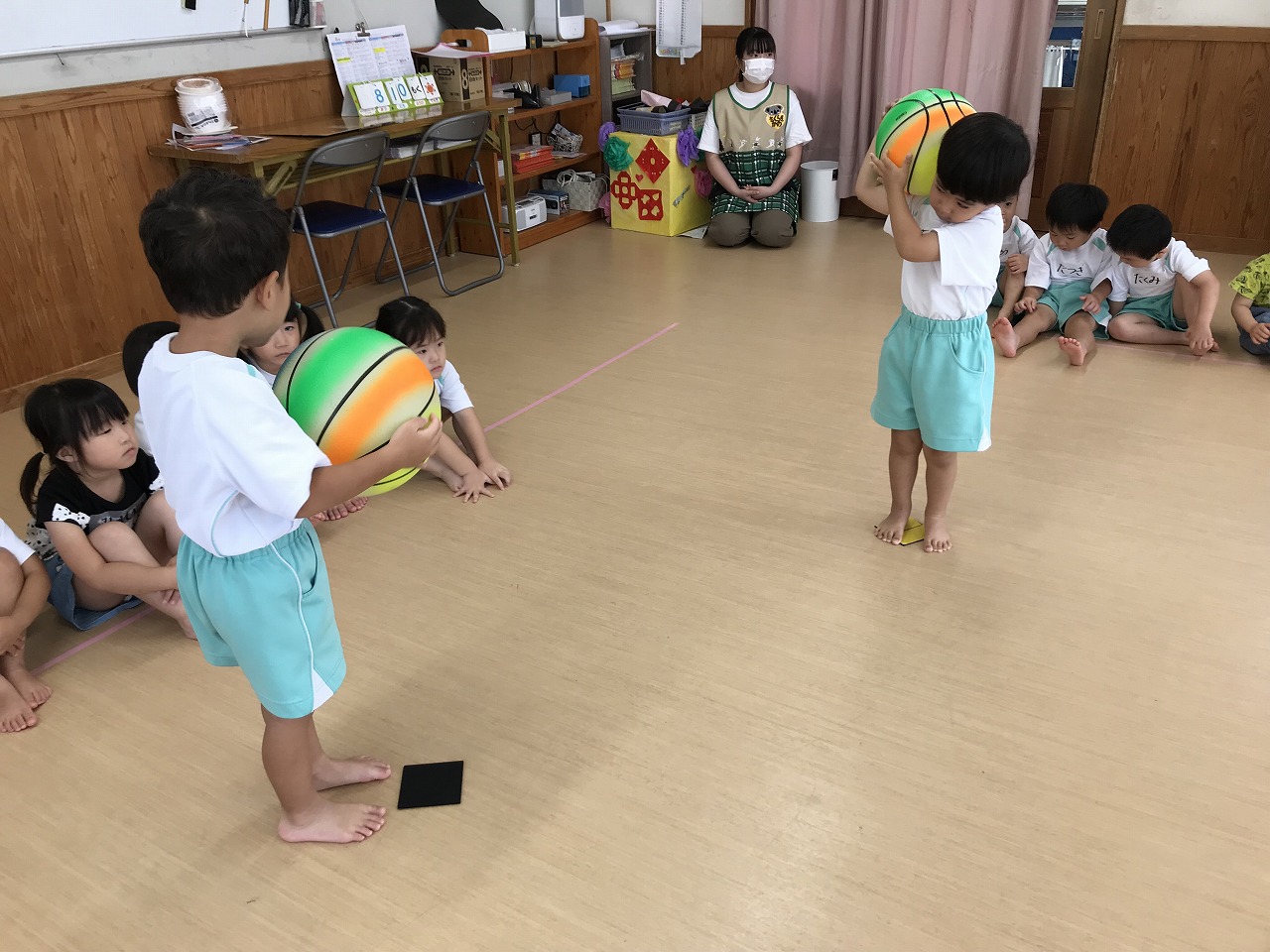 うめ組(3歳児)は、体操教室に参加しました。ボールを使った運動遊びをしました。首・おなか・膝の周りを順番にボールを回していきました。以前もしたことのある遊びだったので、やり方のコツを覚えていたのか、ゆっくりと落とさないようにボールを体に沿わせていきながら、とっても上手に回すことができていました。ボールを落としてしまった時は「あっ!おちた!」と言って慌てて拾い上げ、今度は、もっと慎重にチャレンジする姿がみられました。次は、手の平でボールを持ち、腕をまっすぐに伸ばして、その状態からボールを手から放してバウンドさせ、キャッチする遊びをしました。なかなかキャッチするのが難しく、何回も何回も諦めずにキャッチできるまで頑張っている様子がみられ、成功すると「やったー!」と喜んでいました。今日は、ボールを使って、体の色んな場所を動かしながら、楽しく運動遊びができました。子どもたちも「また、したーい!」と次の体操教室を楽しみにしているようです。