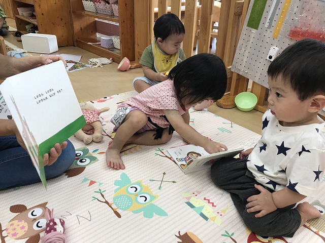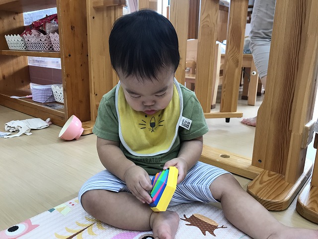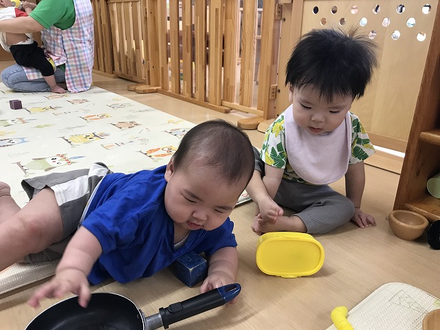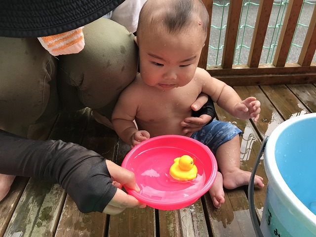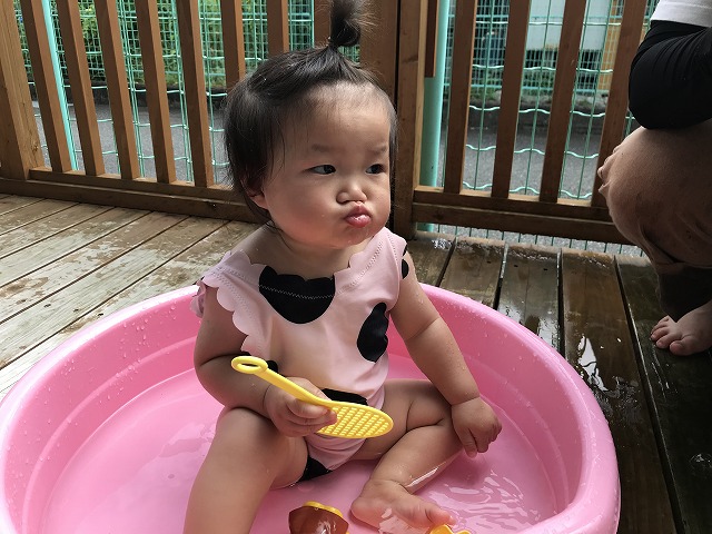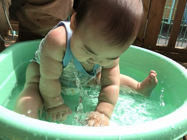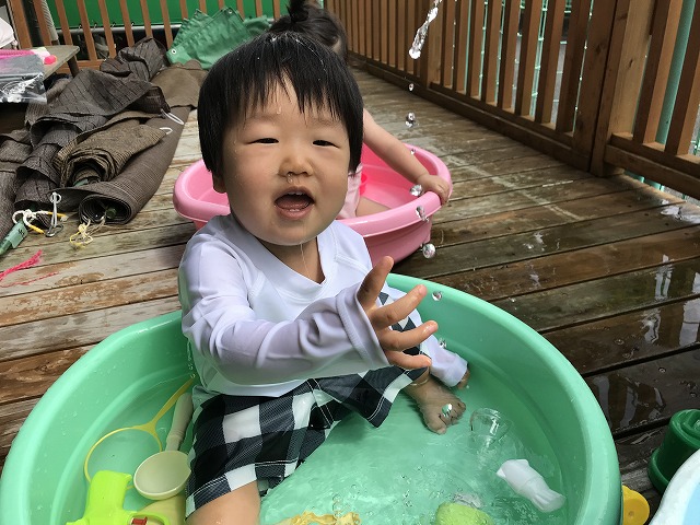 ひよこ組では新しいお友だちもすっかり園に慣れて、にこにこ笑顔がみられるようになりました。良いお天気、今日はお水遊びをしました。はじめての園のプールにワクワクドキドキ、ちょっぴり緊張していた様子でしたが、「きもちがいいね~」と声を掛けると、にっこり笑顔も見られ、お水遊びを楽しみました。隣ですみれ組(1歳児)も、水遊びをしていて、楽しんでいる様子を見たり、シャボン玉をしていると、「きゃー!」や「あっ!」などたくさんうれしそうな声も聞こえてきました。お部屋では、絵本を読んだり、リトルジムで身体をたくさん動かして遊びました。