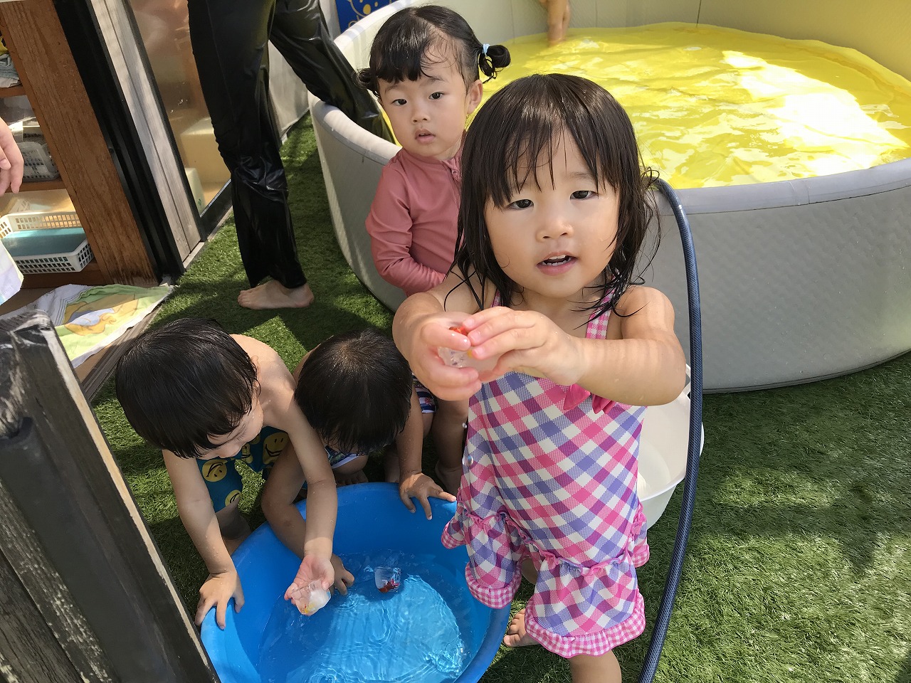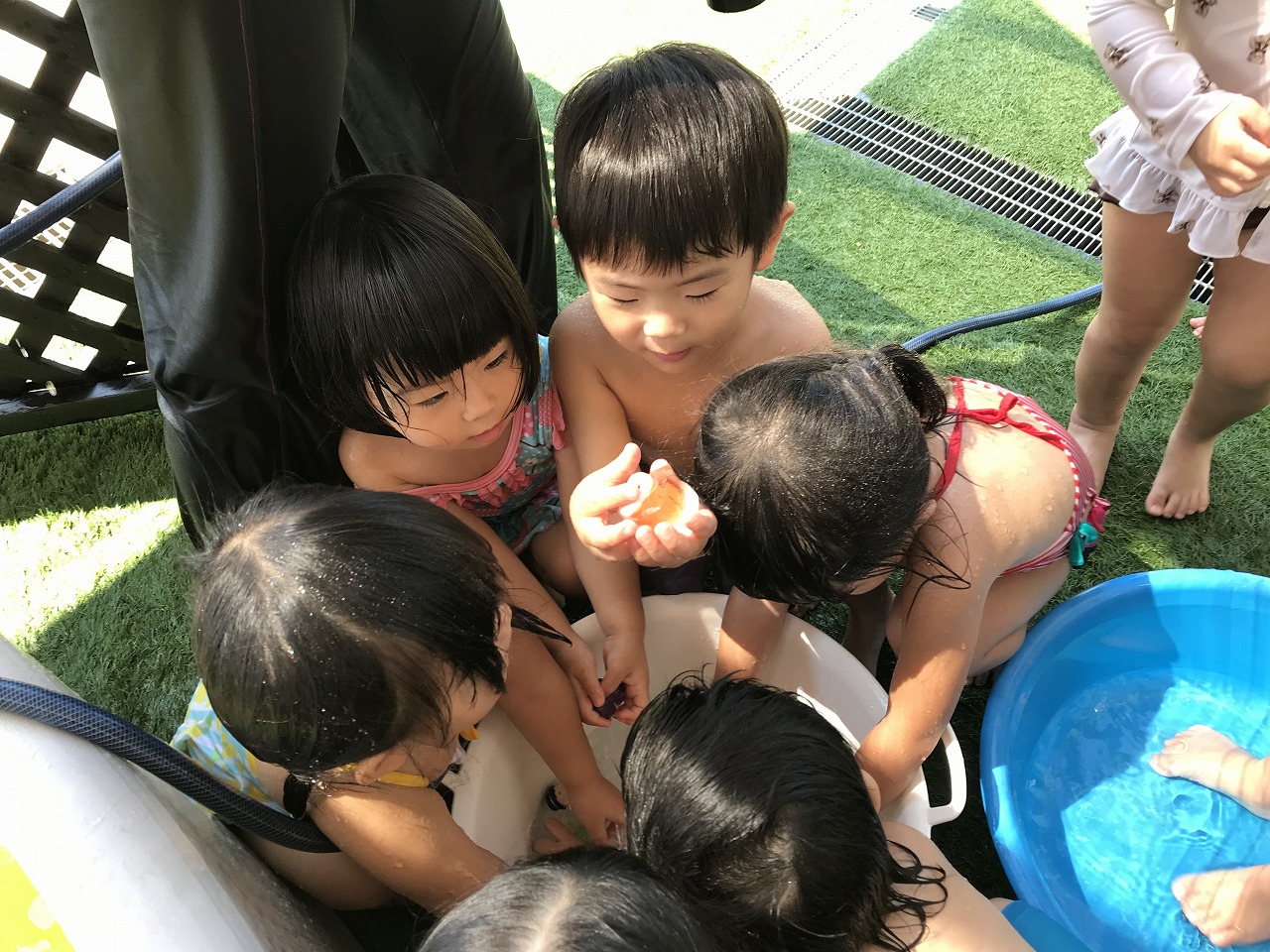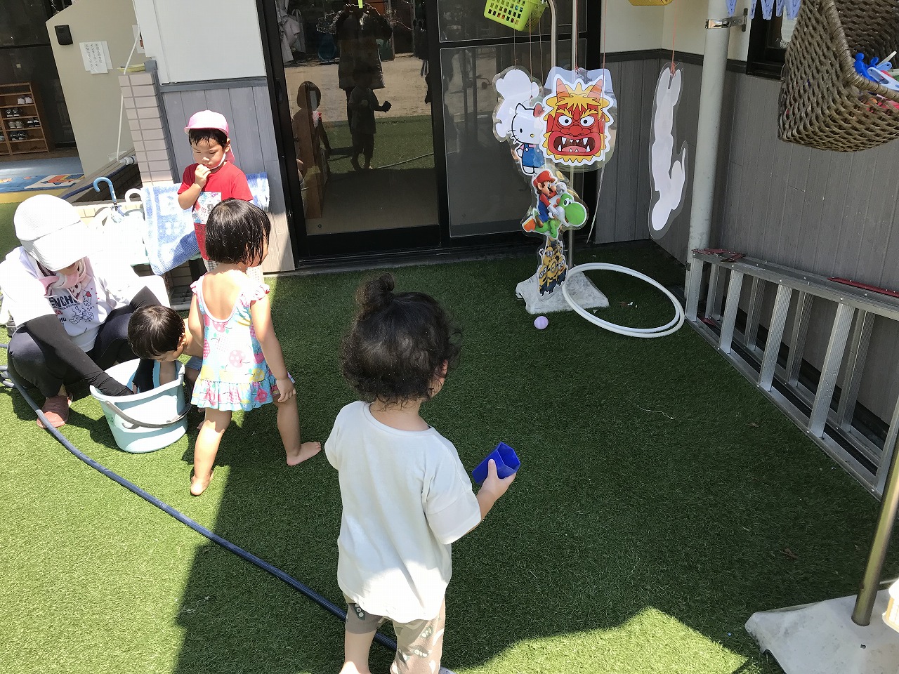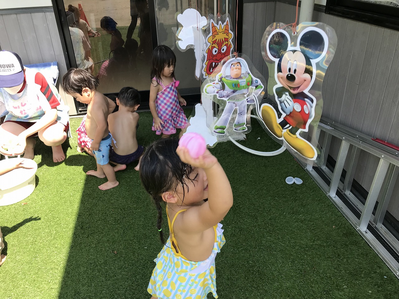 今日はたんぽぽ組(2歳児)でお楽しみ会をしました。夏ならではの遊びを3つ程用意して、水を使った遊びを楽しみました!1つ目は壊れない水風船を使って的当てコーナー、2つ目は氷の中に小さなマスコットを入れて氷の宝探しコーナー、3つ目はタライに手作り金魚を入れて金魚すくいコーナーの、3つのブースを作りました☆壊れない水風船コーナーでは、たくさんのキャラクターの絵をめがけて風船を当てて、当たると「やったー!〇〇にあたった!」と大喜び♪好きな子は何度も挑戦して楽しんでいました。氷の宝探しコーナーでは、氷が溶けてくる様子を不思議そうに眺めたり、キャラクターを氷から出すためにはどうしたら出てくるのか、自分たちで考えたり、保育士等と一緒に溶かしたりと様々でした。出てきたマスコットは、部屋に写真が貼っているので、同じ絵の所にゆっくりと飾っていました。「つめたーい!」と感触を楽しむ子もいましたよ☆金魚すくいコーナーでは、ゆっくりとつかまえようとする子や、サッとつかまえてバケツに入れる子などそれぞれに楽しむ姿が見られました。たくさん遊んだ後はプールで思いきり遊びました☆プールから上がると、口々に「たのしかったー!!!」と笑顔いっぱいで教えてくれました!夏ならではの遊びを楽しむ事ができ、また子ども達の楽しむ笑顔も見られ、また一つ楽しい思い出ができたたんぽぽ組さん(2歳児)です♪