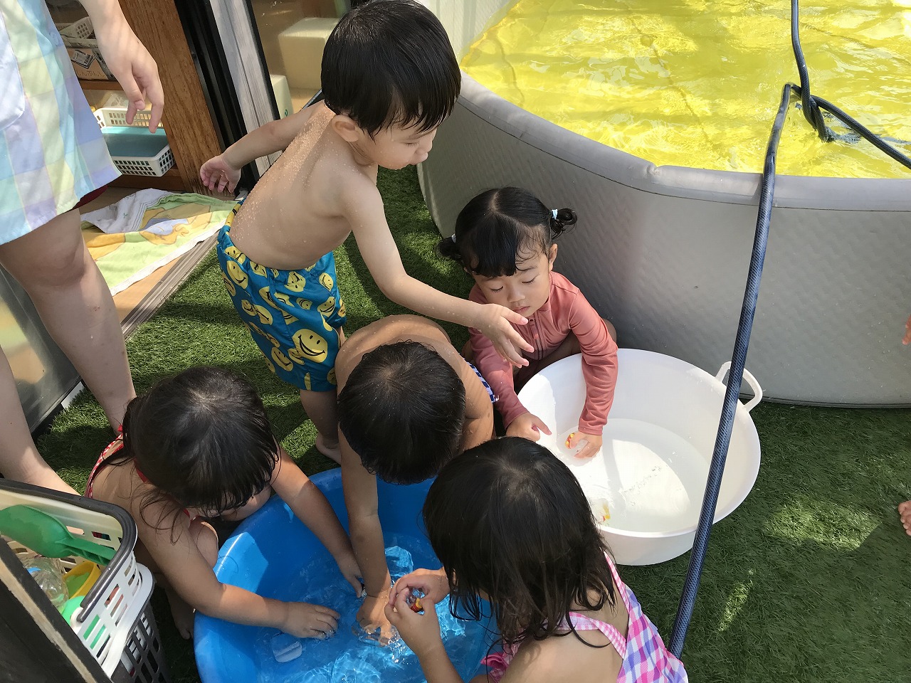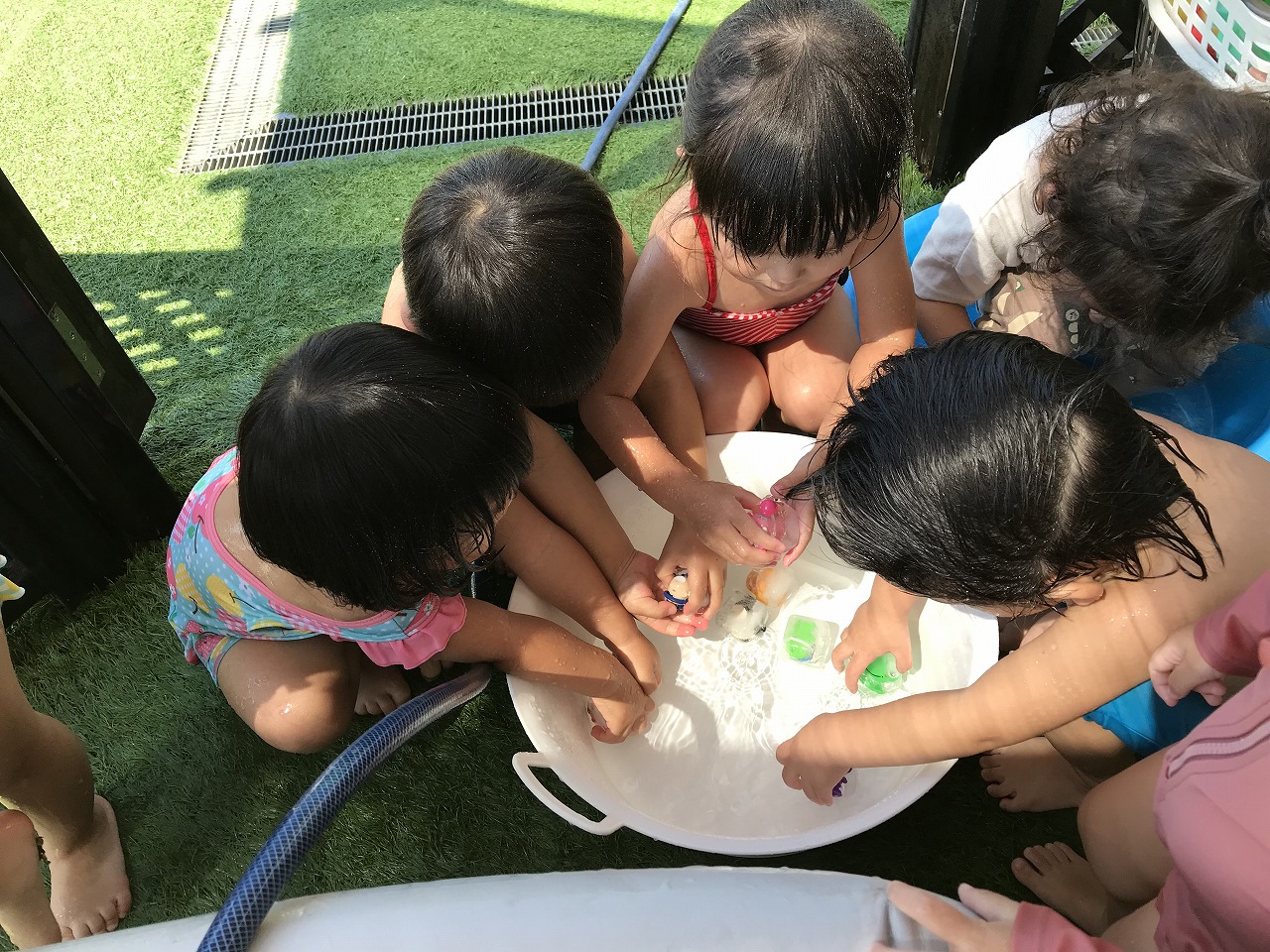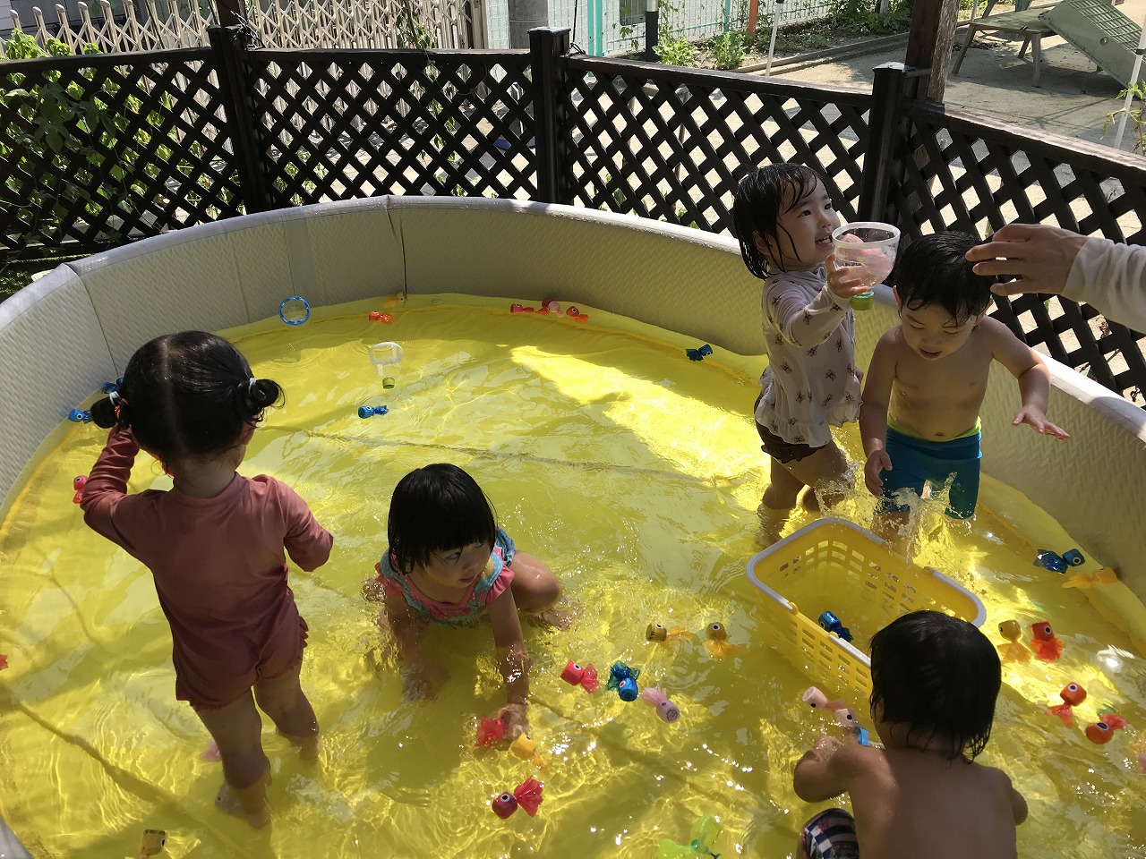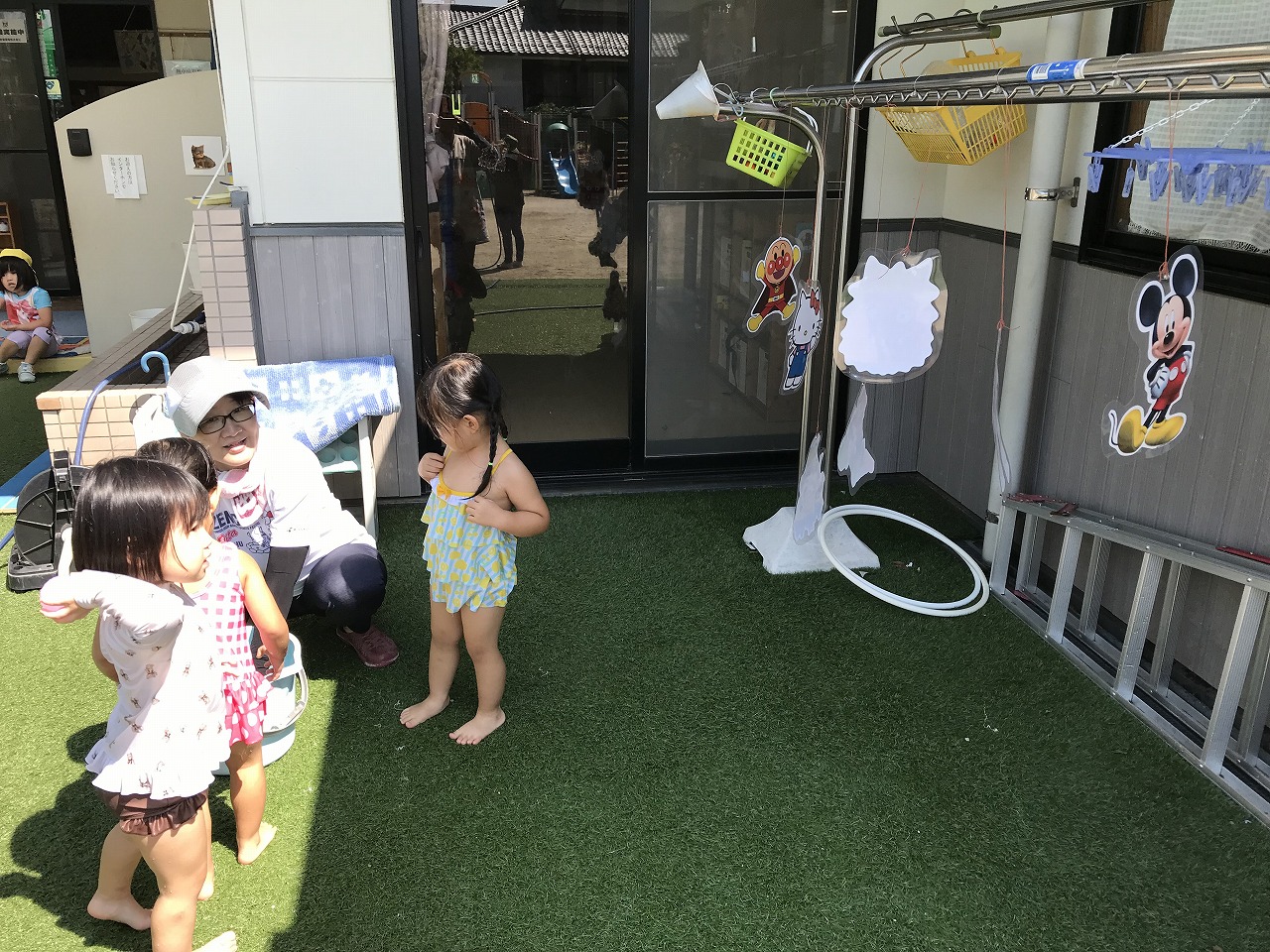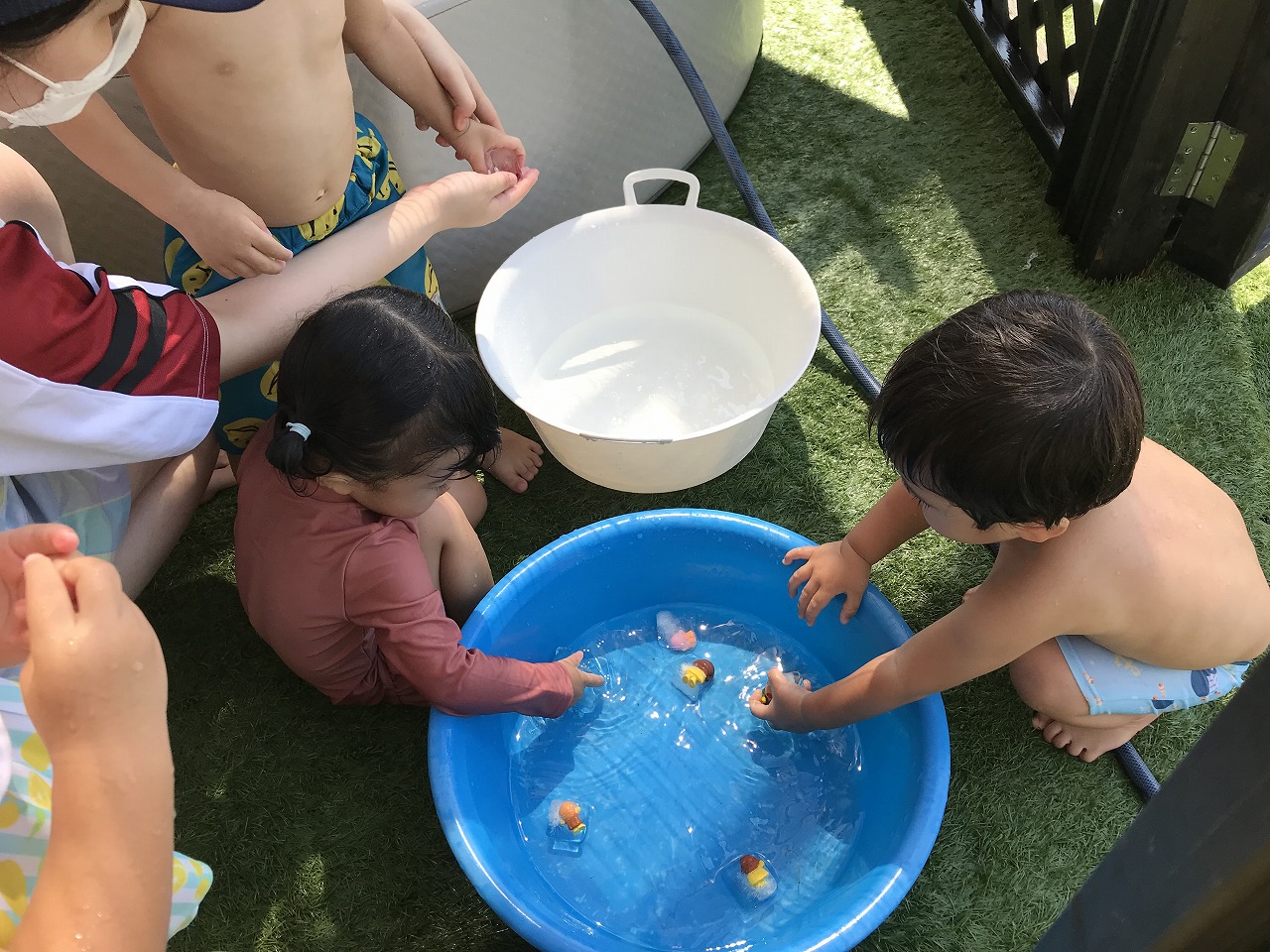 今日はたんぽぽ組(2歳児)でお楽しみ会をしました。夏ならではの遊びを3つ程用意して、水を使った遊びを楽しみました!1つ目は壊れない水風船を使って的当てコーナー、2つ目は氷の中に小さなマスコットを入れて氷の宝探しコーナー、3つ目はタライに手作り金魚を入れて金魚すくいコーナーの、3つのブースを作りました☆壊れない水風船コーナーでは、たくさんのキャラクターの絵をめがけて風船を当てて、当たると「やったー!〇〇にあたった!」と大喜び♪好きな子は何度も挑戦して楽しんでいました。氷の宝探しコーナーでは、氷が溶けてくる様子を不思議そうに眺めたり、キャラクターを氷から出すためにはどうしたら出てくるのか、自分たちで考えたり、保育士等と一緒に溶かしたりと様々でした。出てきたマスコットは、部屋に写真が貼っているので、同じ絵の所にゆっくりと飾っていました。「つめたーい!」と感触を楽しむ子もいましたよ☆金魚すくいコーナーでは、ゆっくりとつかまえようとする子や、サッとつかまえてバケツに入れる子などそれぞれに楽しむ姿が見られました。たくさん遊んだ後はプールで思いきり遊びました☆プールから上がると、口々に「たのしかったー!!!」と笑顔いっぱいで教えてくれました!夏ならではの遊びを楽しむ事ができ、また子ども達の楽しむ笑顔も見られ、また一つ楽しい思い出ができたたんぽぽ組さん(2歳児)です♪