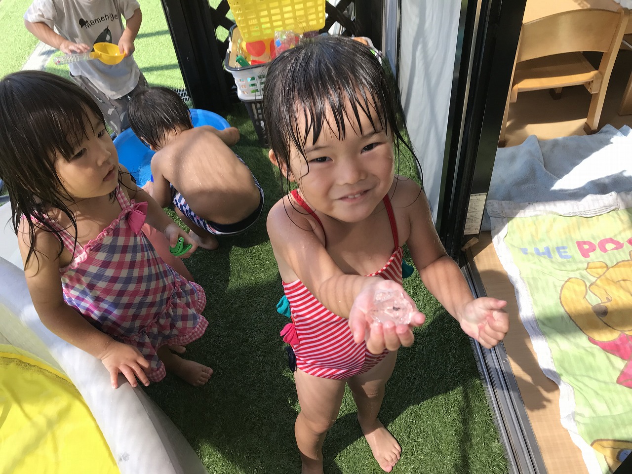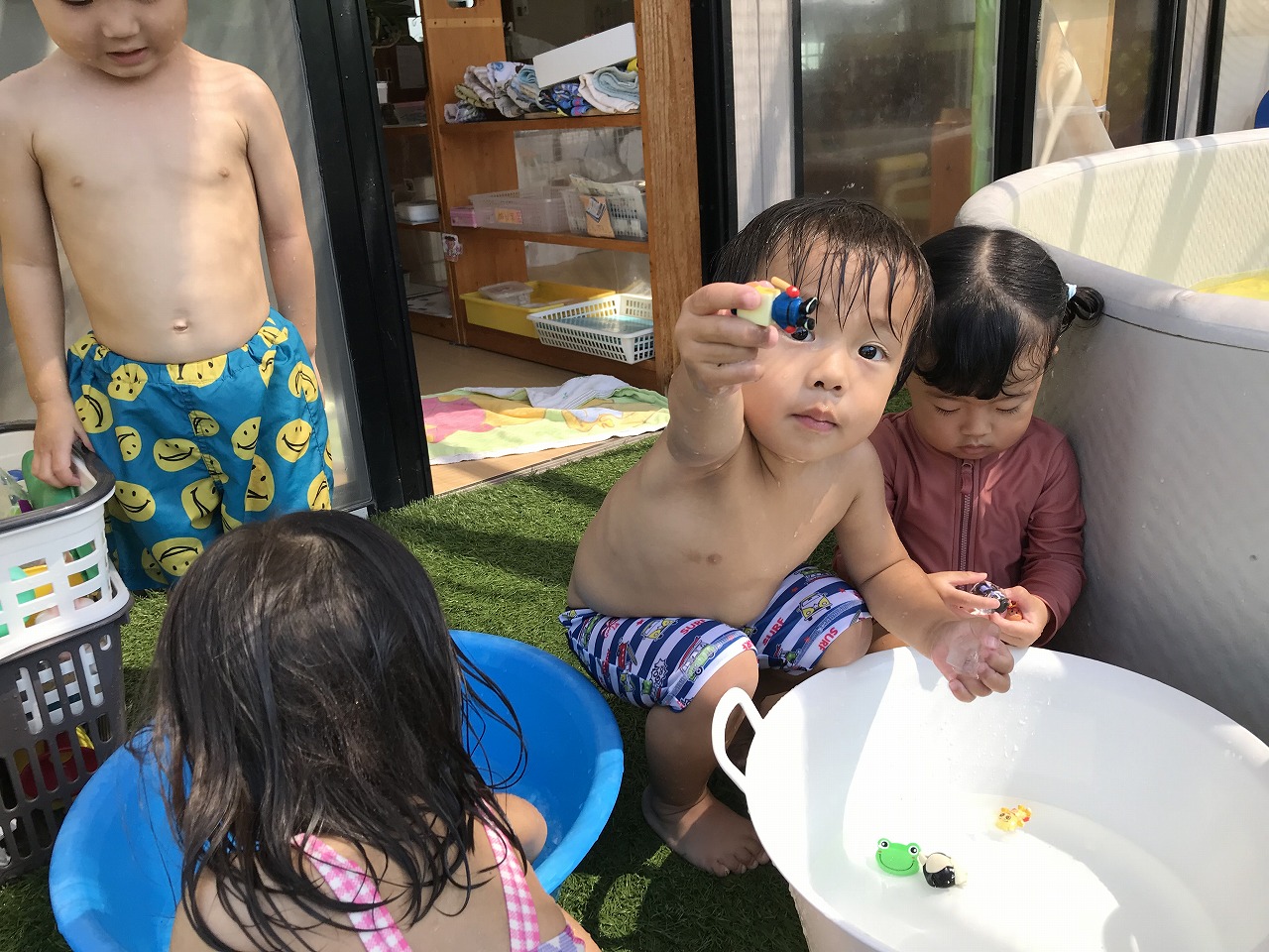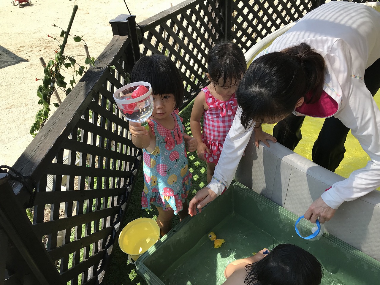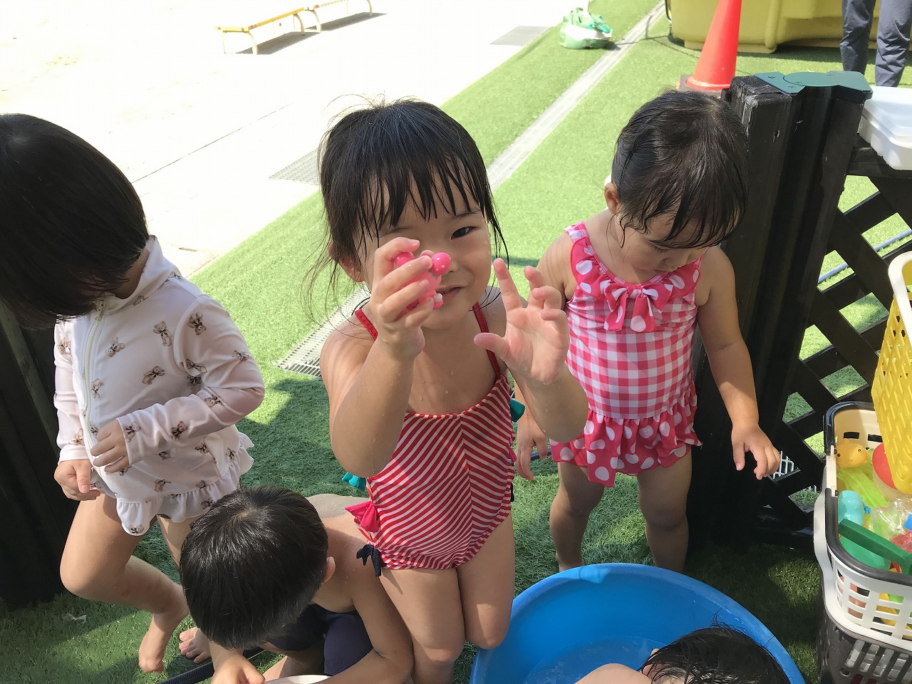 今日はたんぽぽ組(2歳児)でお楽しみ会をしました。夏ならではの遊びを3つ程用意して、水を使った遊びを楽しみました!1つ目は壊れない水風船を使って的当てコーナー、2つ目は氷の中に小さなマスコットを入れて氷の宝探しコーナー、3つ目はタライに手作り金魚を入れて金魚すくいコーナーの、3つのブースを作りました☆壊れない水風船コーナーでは、たくさんのキャラクターの絵をめがけて風船を当てて、当たると「やったー!〇〇にあたった!」と大喜び♪好きな子は何度も挑戦して楽しんでいました。氷の宝探しコーナーでは、氷が溶けてくる様子を不思議そうに眺めたり、キャラクターを氷から出すためにはどうしたら出てくるのか、自分たちで考えたり、保育士等と一緒に溶かしたりと様々でした。出てきたマスコットは、部屋に写真が貼っているので、同じ絵の所にゆっくりと飾っていました。「つめたーい!」と感触を楽しむ子もいましたよ☆金魚すくいコーナーでは、ゆっくりとつかまえようとする子や、サッとつかまえてバケツに入れる子などそれぞれに楽しむ姿が見られました。たくさん遊んだ後はプールで思いきり遊びました☆プールから上がると、口々に「たのしかったー!!!」と笑顔いっぱいで教えてくれました!夏ならではの遊びを楽しむ事ができ、また子ども達の楽しむ笑顔も見られ、また一つ楽しい思い出ができたたんぽぽ組さん(2歳児)です♪