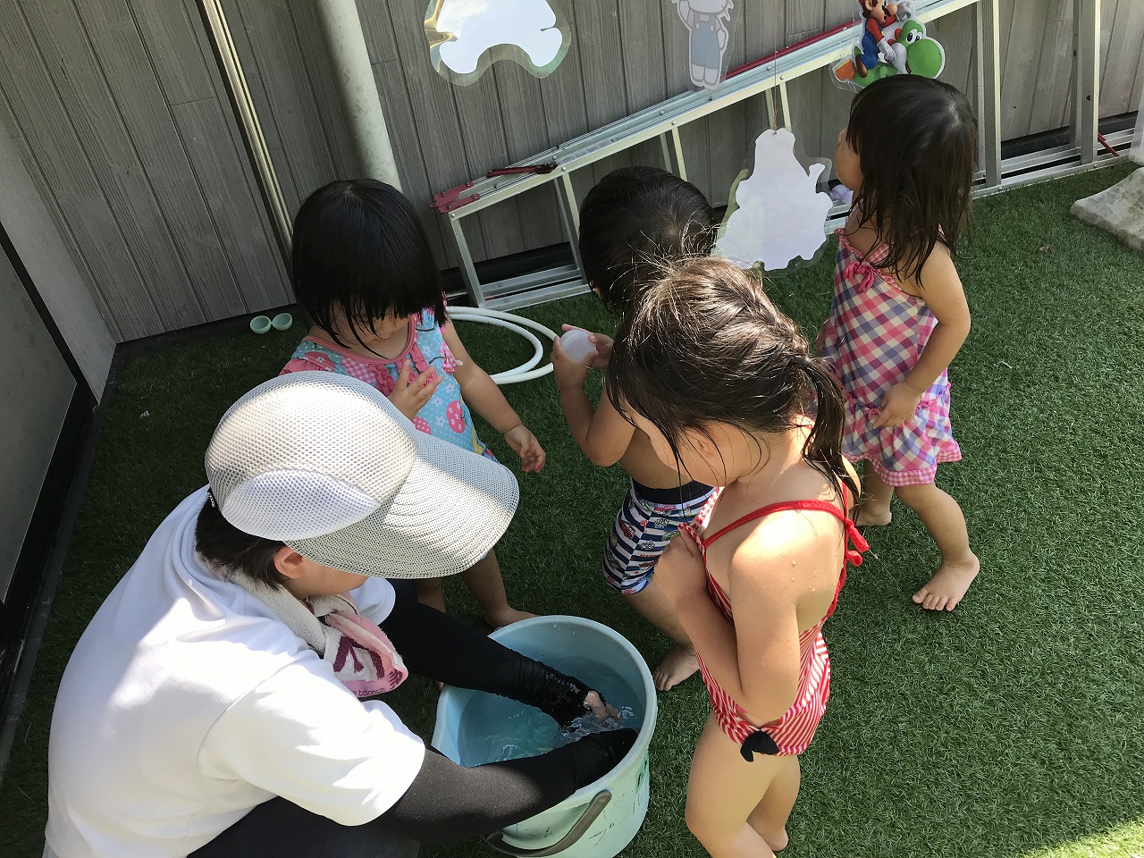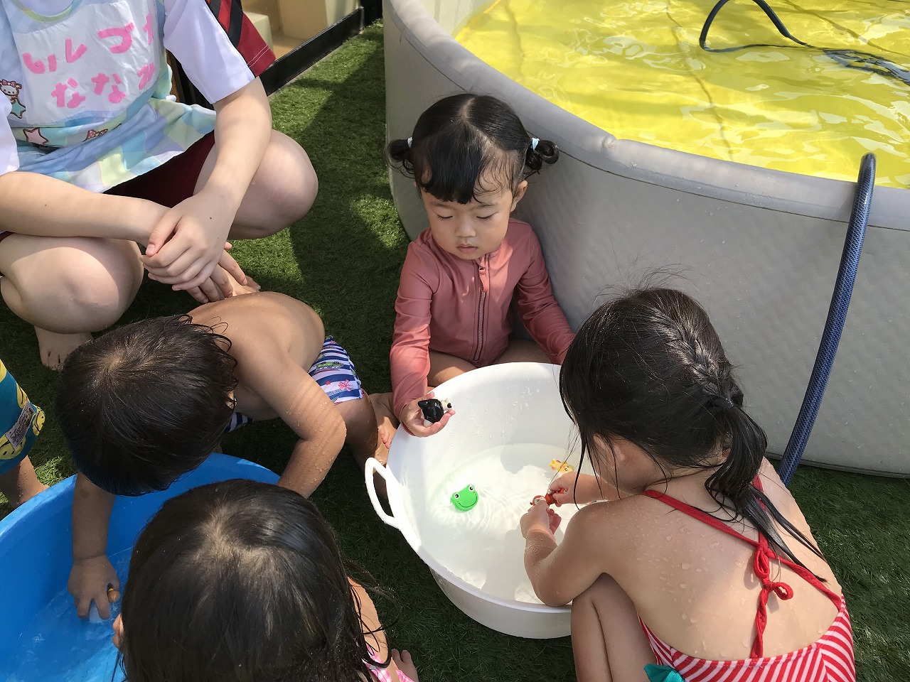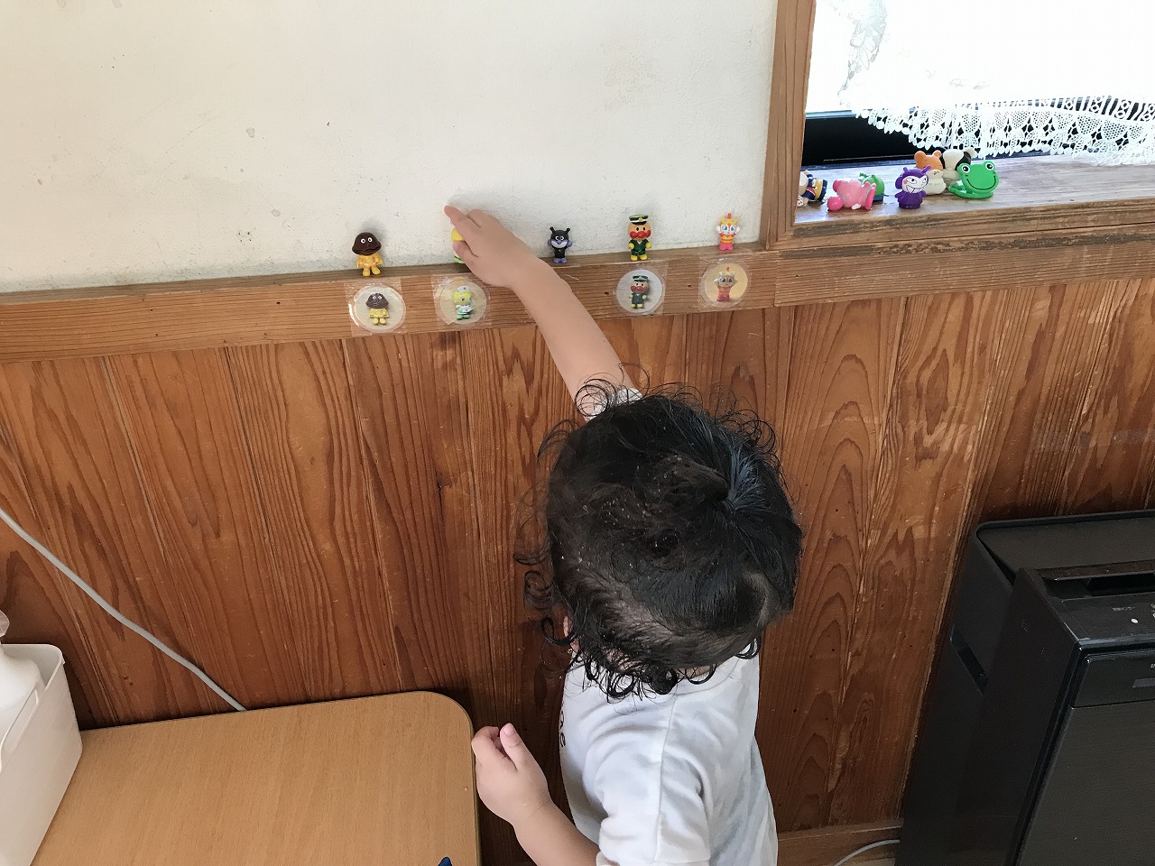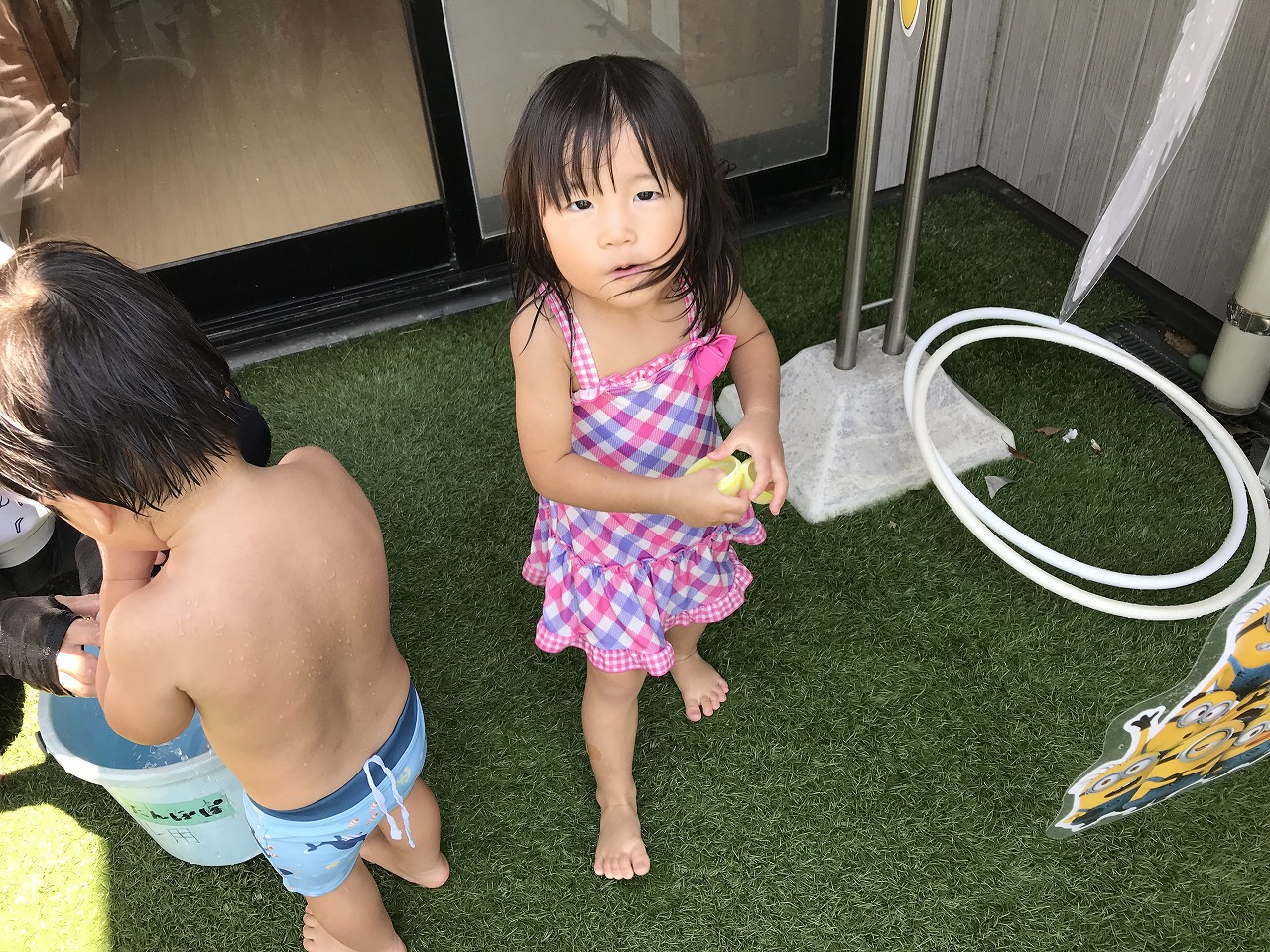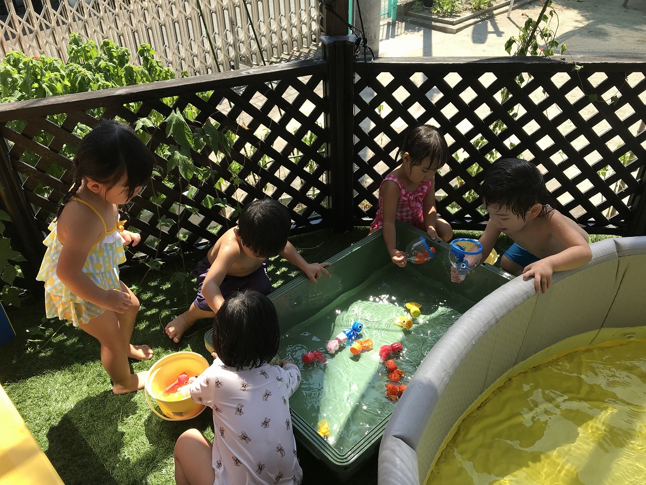 今日はたんぽぽ組(2歳児)でお楽しみ会をしました。夏ならではの遊びを3つ程用意して、水を使った遊びを楽しみました!1つ目は壊れない水風船を使って的当てコーナー、2つ目は氷の中に小さなマスコットを入れて氷の宝探しコーナー、3つ目はタライに手作り金魚を入れて金魚すくいコーナーの、3つのブースを作りました☆壊れない水風船コーナーでは、たくさんのキャラクターの絵をめがけて風船を当てて、当たると「やったー!〇〇にあたった!」と大喜び♪好きな子は何度も挑戦して楽しんでいました。氷の宝探しコーナーでは、氷が溶けてくる様子を不思議そうに眺めたり、キャラクターを氷から出すためにはどうしたら出てくるのか、自分たちで考えたり、保育士等と一緒に溶かしたりと様々でした。出てきたマスコットは、部屋に写真が貼っているので、同じ絵の所にゆっくりと飾っていました。「つめたーい!」と感触を楽しむ子もいましたよ☆金魚すくいコーナーでは、ゆっくりとつかまえようとする子や、サッとつかまえてバケツに入れる子などそれぞれに楽しむ姿が見られました。たくさん遊んだ後はプールで思いきり遊びました☆プールから上がると、口々に「たのしかったー!!!」と笑顔いっぱいで教えてくれました!夏ならではの遊びを楽しむ事ができ、また子ども達の楽しむ笑顔も見られ、また一つ楽しい思い出ができたたんぽぽ組さん(2歳児)です♪