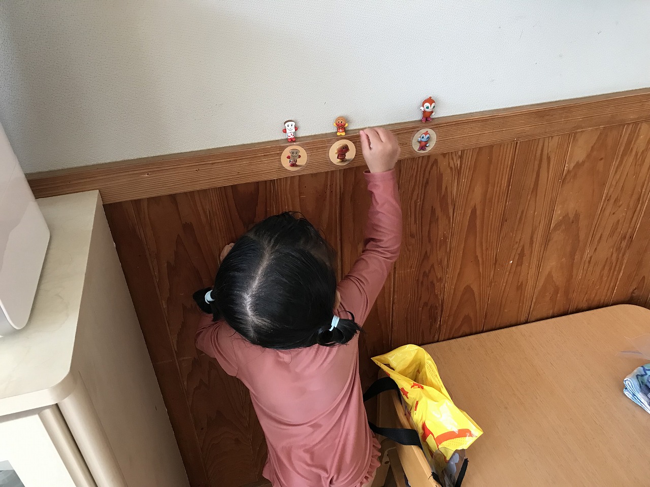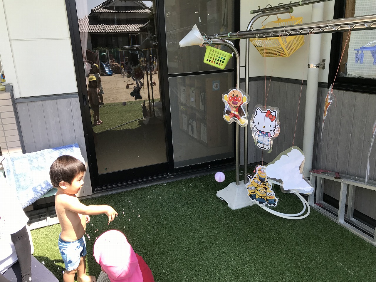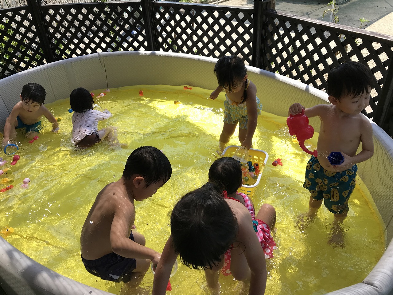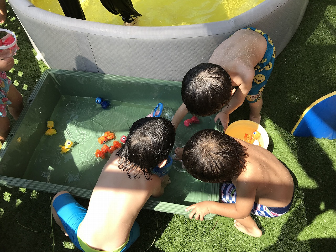 今日はたんぽぽ組(2歳児)でお楽しみ会をしました。夏ならではの遊びを3つ程用意して、水を使った遊びを楽しみました!1つ目は壊れない水風船を使って的当てコーナー、2つ目は氷の中に小さなマスコットを入れて氷の宝探しコーナー、3つ目はタライに手作り金魚を入れて金魚すくいコーナーの、3つのブースを作りました☆壊れない水風船コーナーでは、たくさんのキャラクターの絵をめがけて風船を当てて、当たると「やったー!〇〇にあたった!」と大喜び♪好きな子は何度も挑戦して楽しんでいました。氷の宝探しコーナーでは、氷が溶けてくる様子を不思議そうに眺めたり、キャラクターを氷から出すためにはどうしたら出てくるのか、自分たちで考えたり、保育士等と一緒に溶かしたりと様々でした。出てきたマスコットは、部屋に写真が貼っているので、同じ絵の所にゆっくりと飾っていました。「つめたーい!」と感触を楽しむ子もいましたよ☆金魚すくいコーナーでは、ゆっくりとつかまえようとする子や、サッとつかまえてバケツに入れる子などそれぞれに楽しむ姿が見られました。たくさん遊んだ後はプールで思いきり遊びました☆プールから上がると、口々に「たのしかったー!!!」と笑顔いっぱいで教えてくれました!夏ならではの遊びを楽しむ事ができ、また子ども達の楽しむ笑顔も見られ、また一つ楽しい思い出ができたたんぽぽ組さん(2歳児)です♪