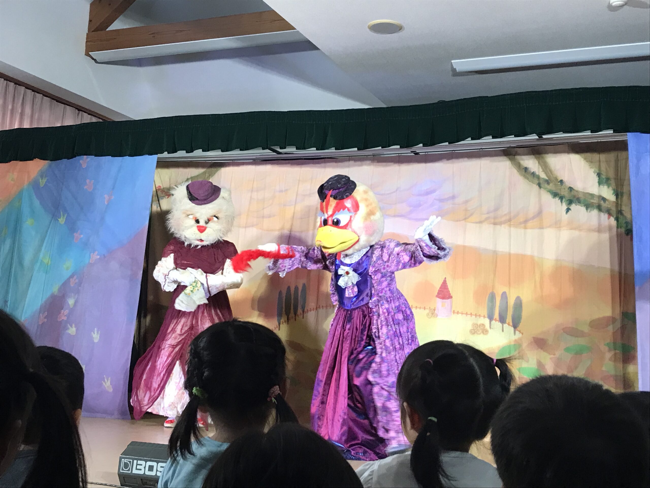 今日は丸の内こども園に劇団バクさんに来ていただきました。「みにくいあひるの子」の楽しく感動的な公演で、楽しいひと時を過ごさせていただきました。子ども達は、舞台上の役者さん達の演技に興味津々で目をキラキラさせて見入っていました。一緒に歌ったり、手拍子をしたりしながら笑顔とはしゃぎ声に溢れていました。物語の展開に応じて笑ったり、切なくなったりと子ども達の表情は一つひとつのシーンに反応していました。主人公のアヒルが成長して美しい姿に変わった時には、子ども達の歓声と拍手が舞台を包み込みました。子ども達の純粋な感情が物語を一層引き立てていました。講演後も、子ども達は劇中のキャラクターやエピソードについて盛り上がり、お友達同士で楽しくお話する姿も見られました。この素晴らしい経験を通じて子ども達の感性や思考力が豊かに育まれていくことを感じました。
