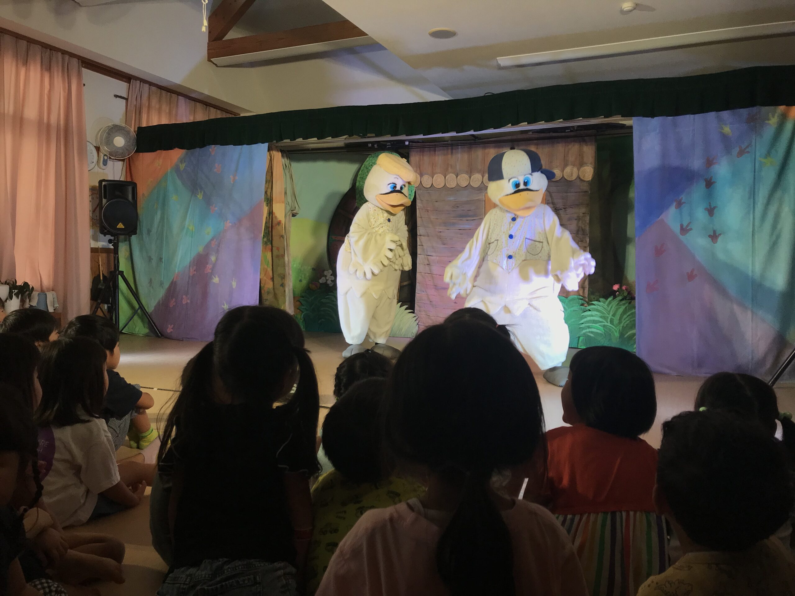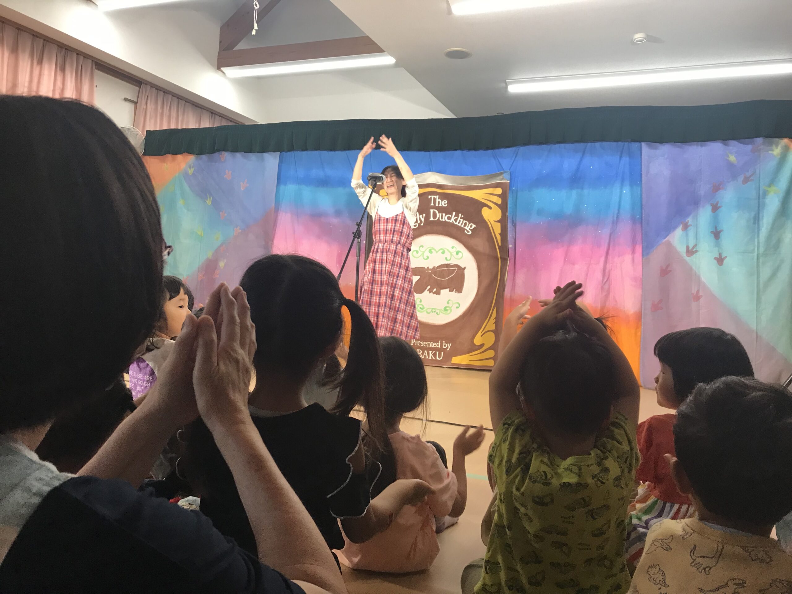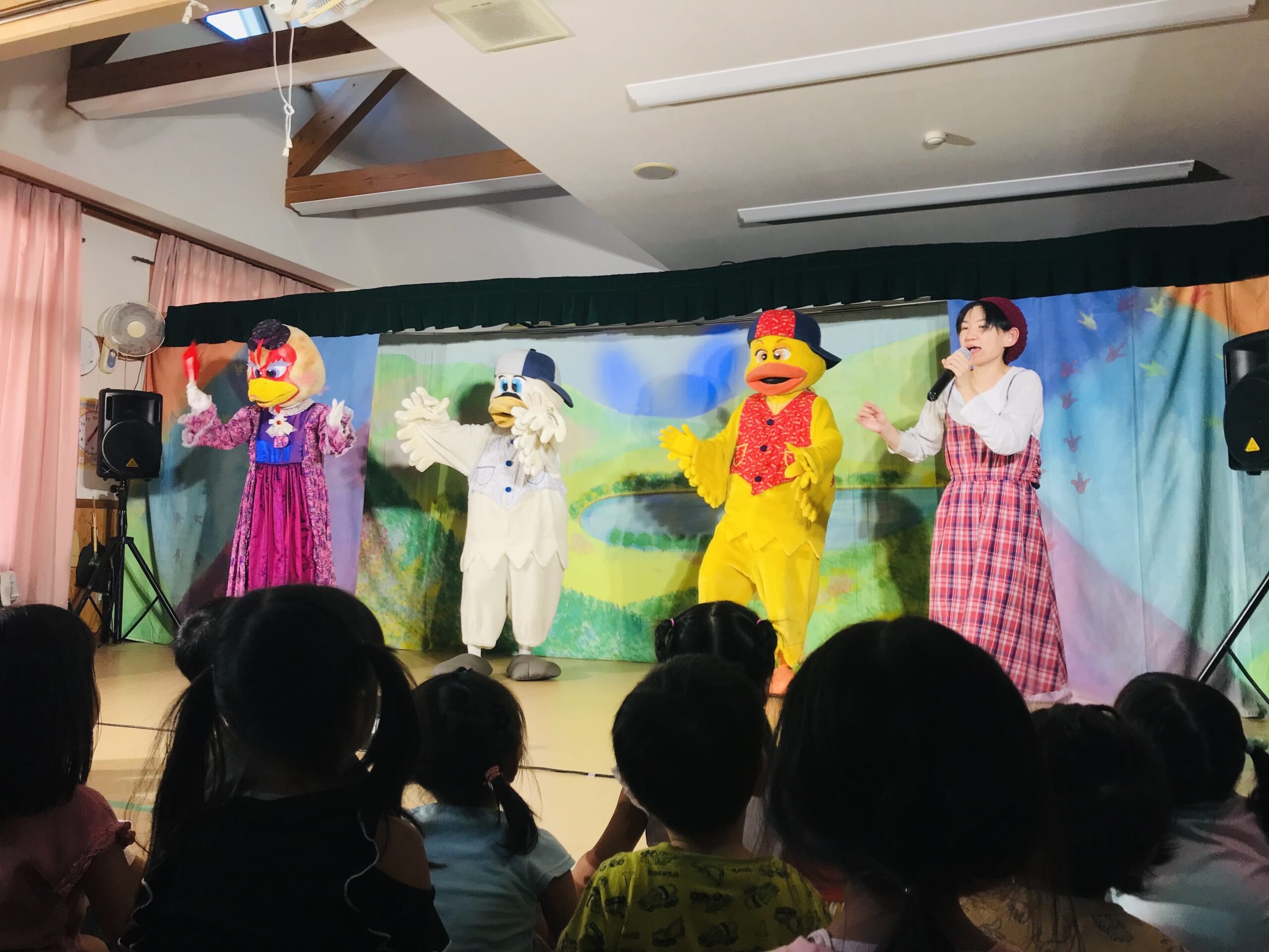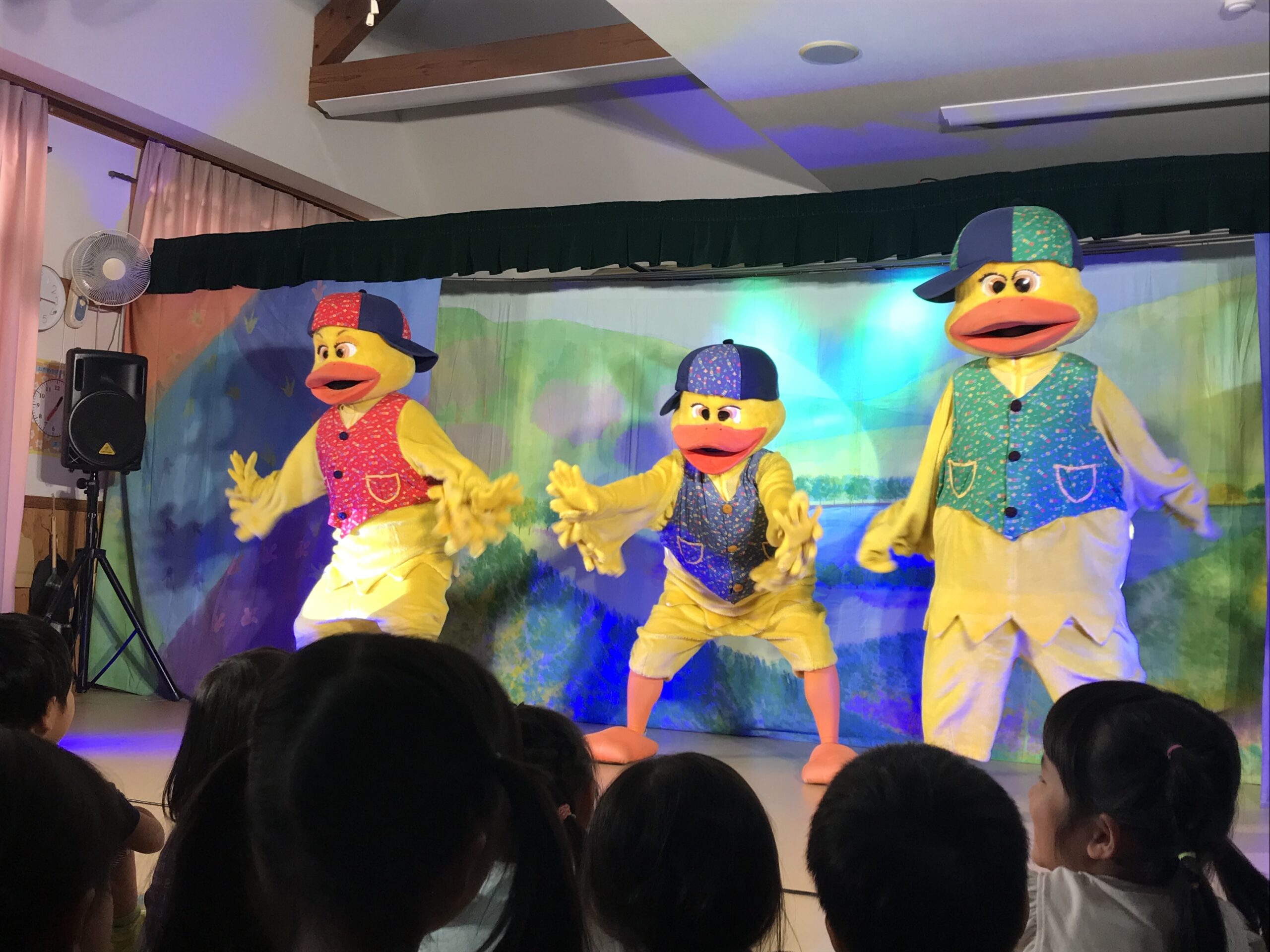 今日は丸の内こども園に劇団バクさんに来ていただきました。「みにくいあひるの子」の楽しく感動的な公演で、楽しいひと時を過ごさせていただきました。子ども達は、舞台上の役者さん達の演技に興味津々で目をキラキラさせて見入っていました。一緒に歌ったり、手拍子をしたりしながら笑顔とはしゃぎ声に溢れていました。物語の展開に応じて笑ったり、切なくなったりと子ども達の表情は一つひとつのシーンに反応していました。主人公のアヒルが成長して美しい姿に変わった時には、子ども達の歓声と拍手が舞台を包み込みました。子ども達の純粋な感情が物語を一層引き立てていました。講演後も、子ども達は劇中のキャラクターやエピソードについて盛り上がり、お友達同士で楽しくお話する姿も見られました。この素晴らしい経験を通じて子ども達の感性や思考力が豊かに育まれていくことを感じました。