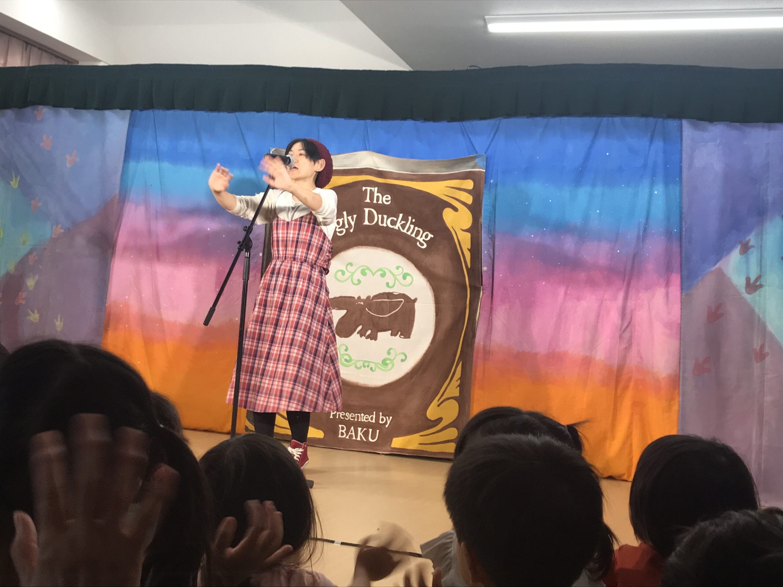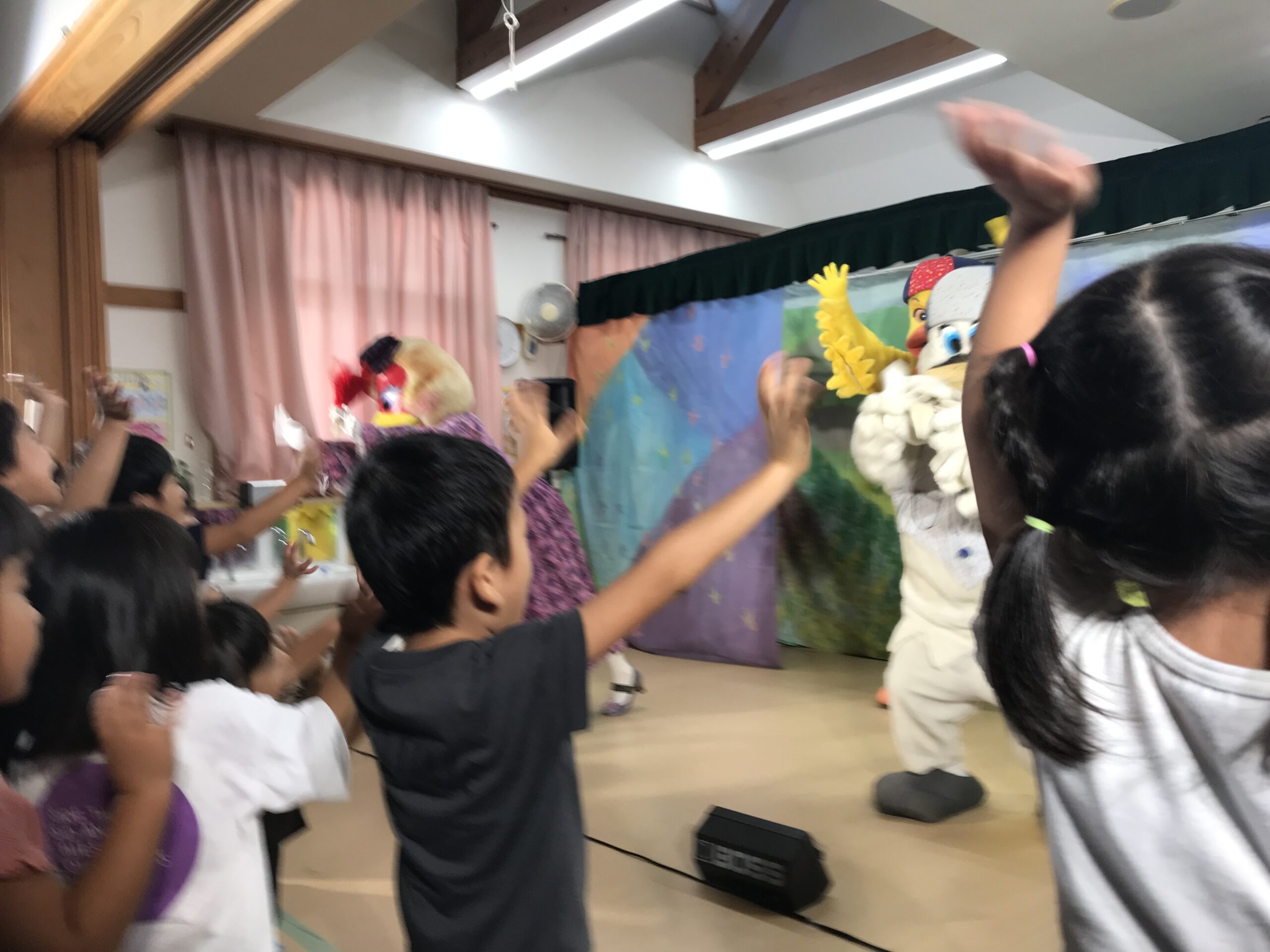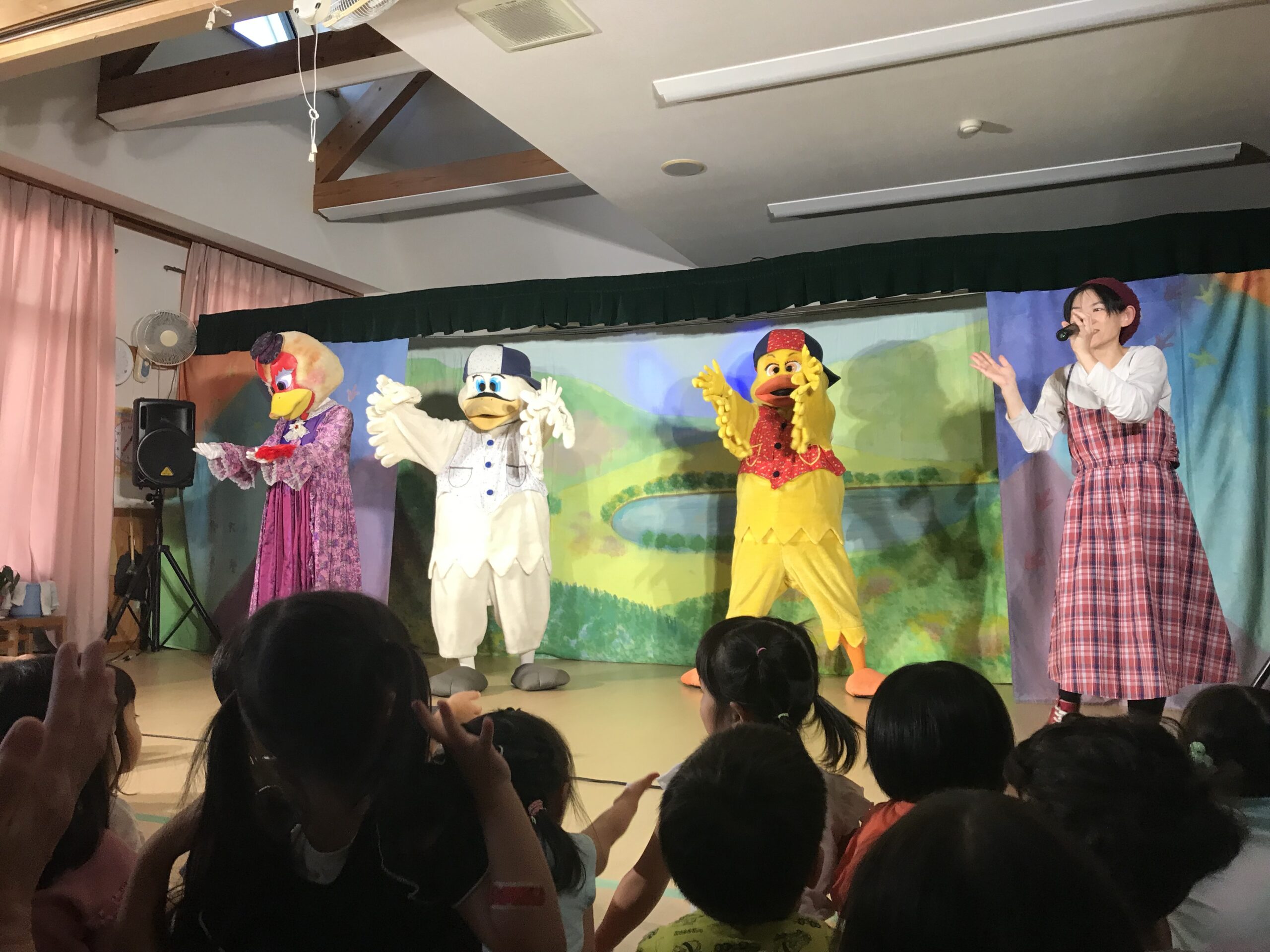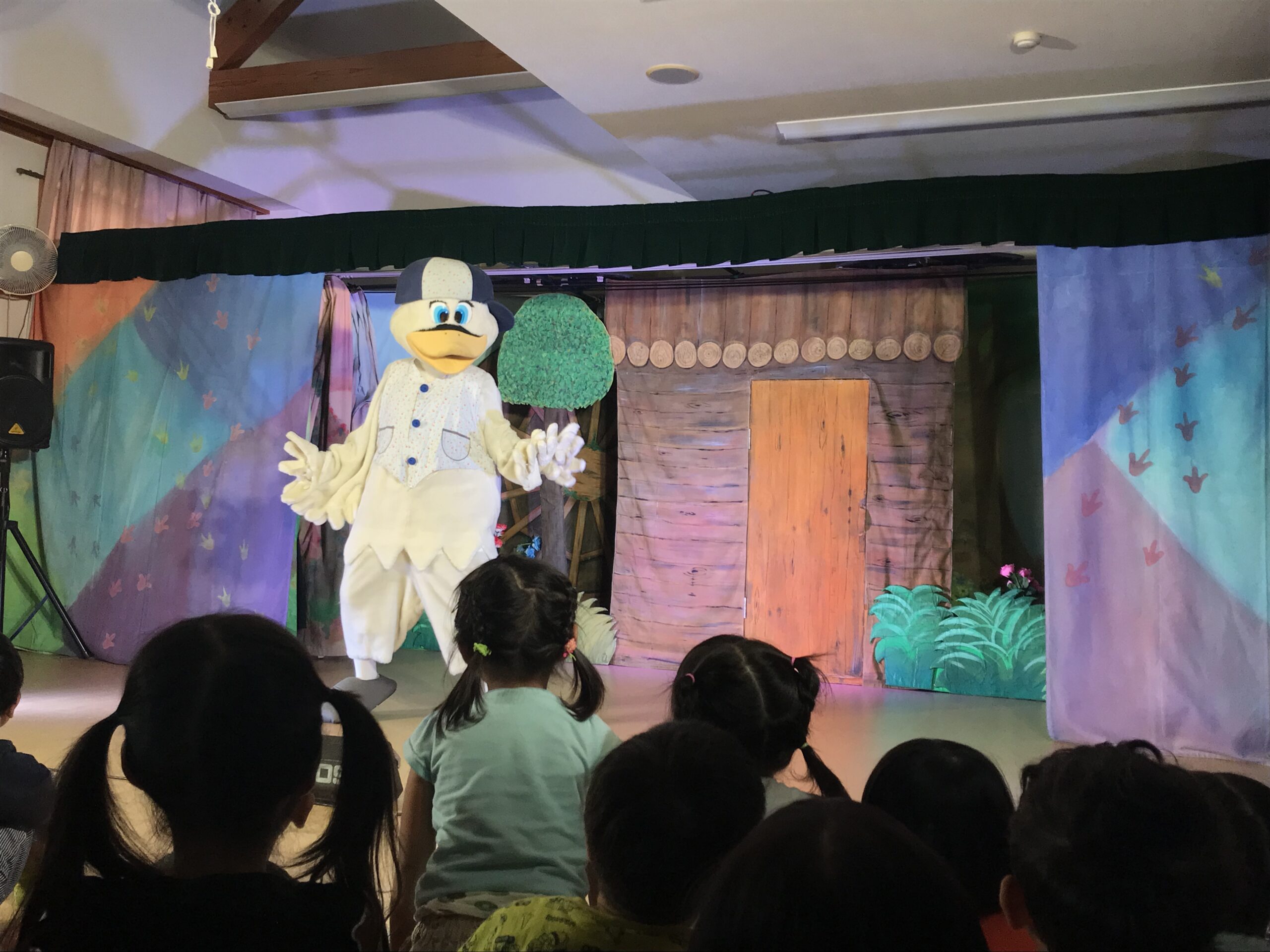 今日は丸の内こども園に劇団バクさんに来ていただきました。「みにくいあひるの子」の楽しく感動的な公演で、楽しいひと時を過ごさせていただきました。子ども達は、舞台上の役者さん達の演技に興味津々で目をキラキラさせて見入っていました。一緒に歌ったり、手拍子をしたりしながら笑顔とはしゃぎ声に溢れていました。物語の展開に応じて笑ったり、切なくなったりと子ども達の表情は一つひとつのシーンに反応していました。主人公のアヒルが成長して美しい姿に変わった時には、子ども達の歓声と拍手が舞台を包み込みました。子ども達の純粋な感情が物語を一層引き立てていました。講演後も、子ども達は劇中のキャラクターやエピソードについて盛り上がり、お友達同士で楽しくお話する姿も見られました。この素晴らしい経験を通じて子ども達の感性や思考力が豊かに育まれていくことを感じました。