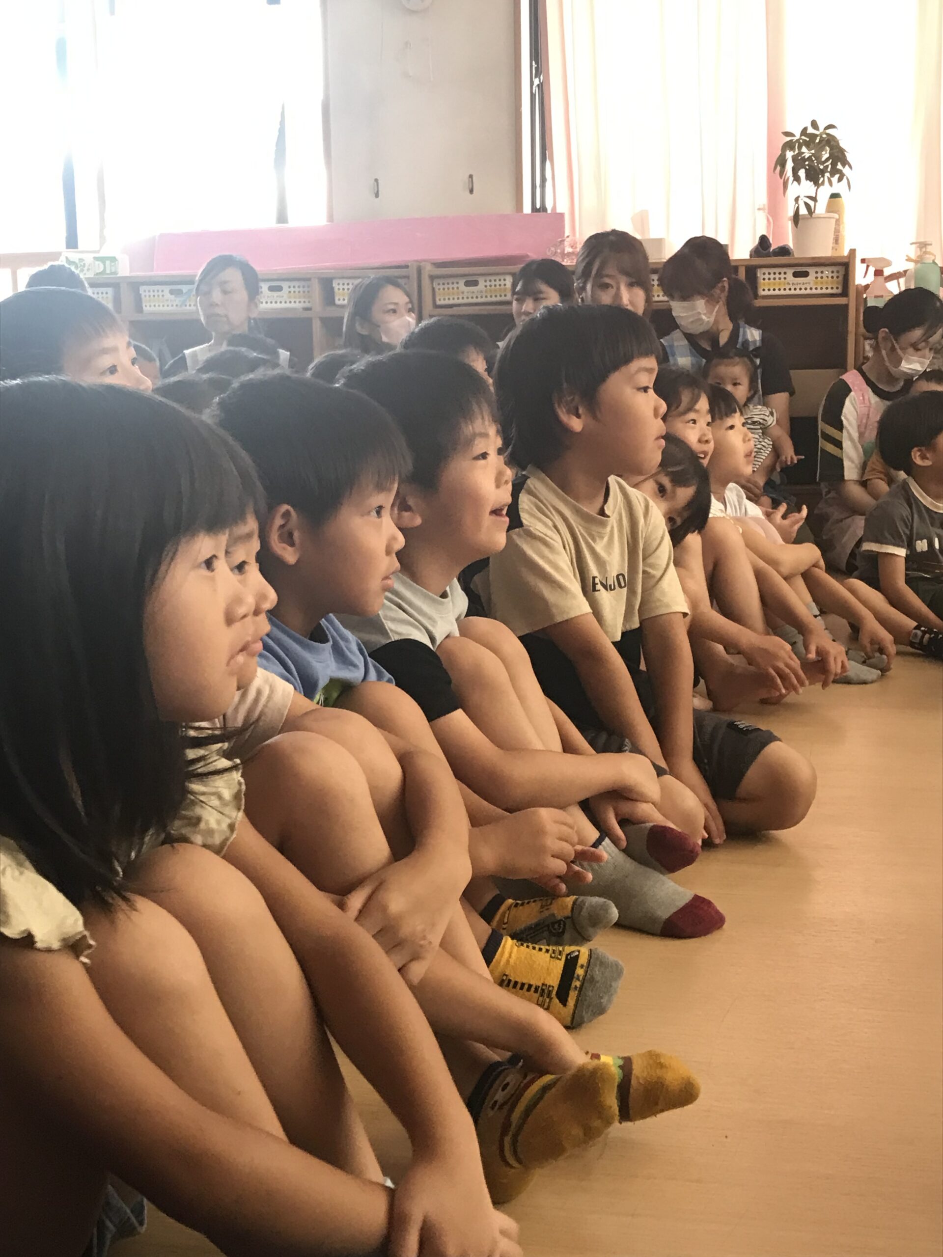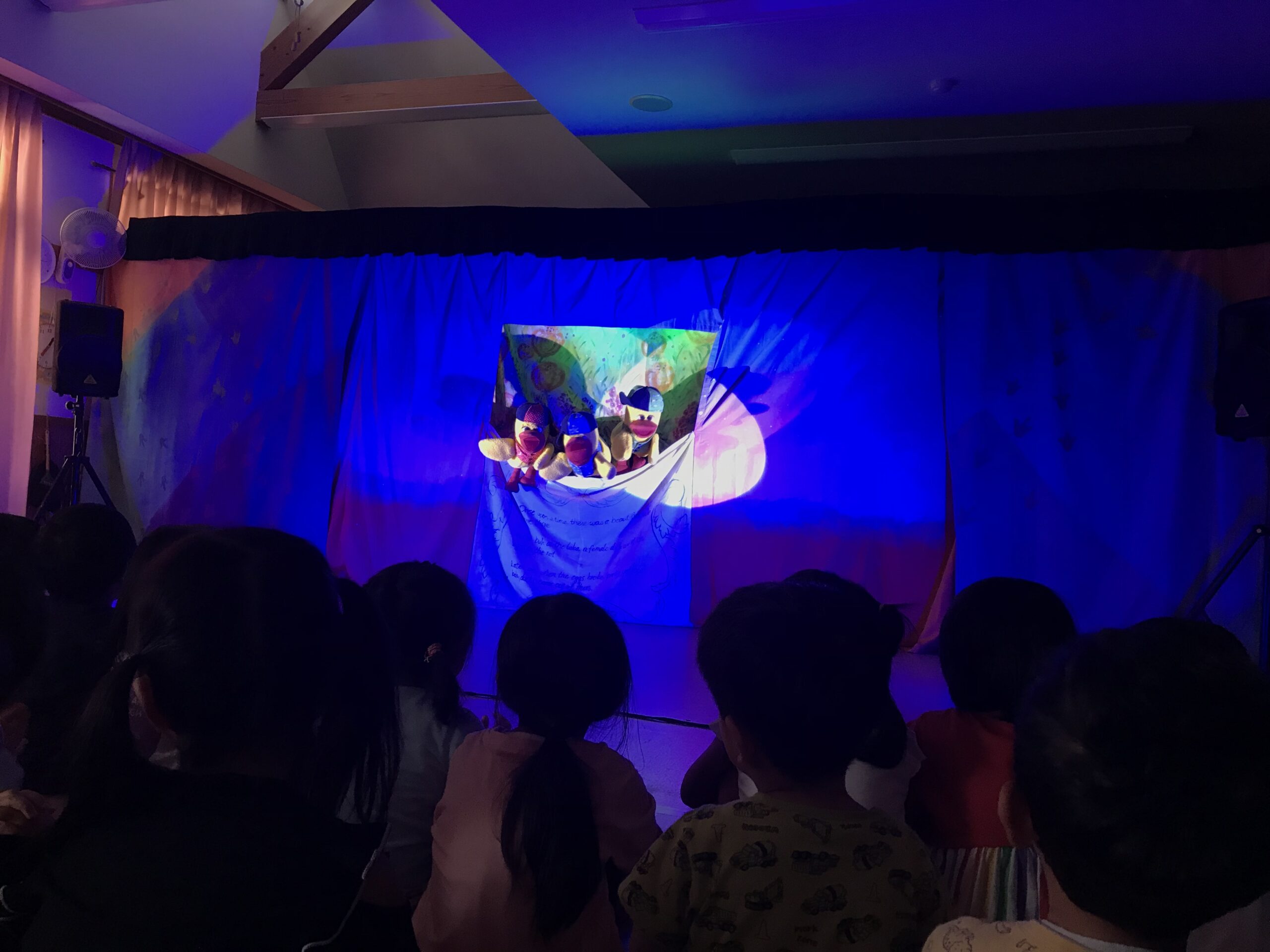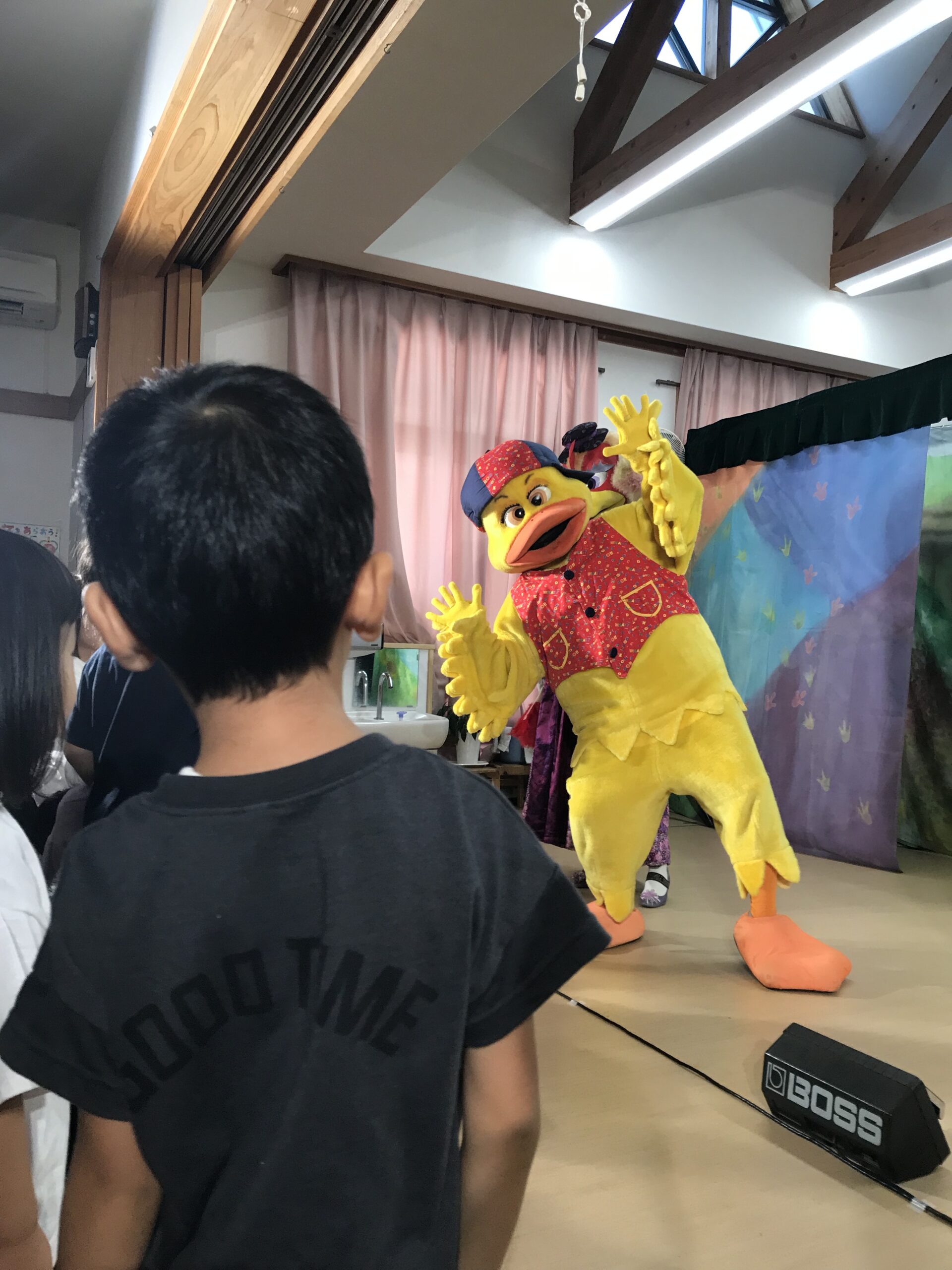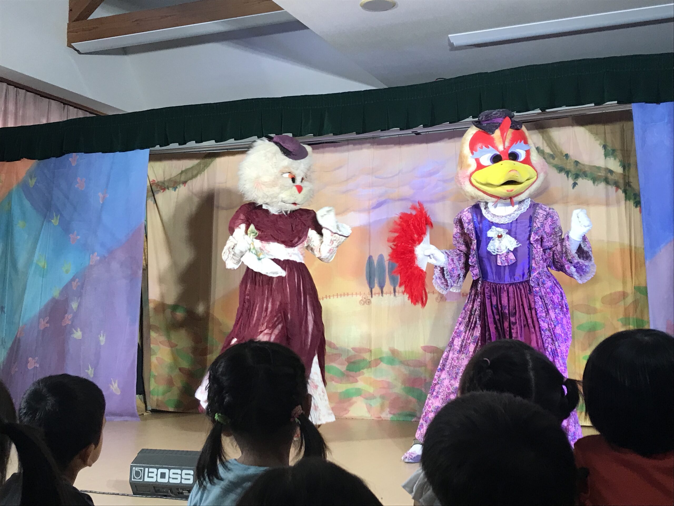今日は丸の内こども園に劇団バクさんに来ていただきました。「みにくいあひるの子」の楽しく感動的な公演で、楽しいひと時を過ごさせていただきました。子ども達は、舞台上の役者さん達の演技に興味津々で目をキラキラさせて見入っていました。一緒に歌ったり、手拍子をしたりしながら笑顔とはしゃぎ声に溢れていました。物語の展開に応じて笑ったり、切なくなったりと子ども達の表情は一つひとつのシーンに反応していました。主人公のアヒルが成長して美しい姿に変わった時には、子ども達の歓声と拍手が舞台を包み込みました。子ども達の純粋な感情が物語を一層引き立てていました。講演後も、子ども達は劇中のキャラクターやエピソードについて盛り上がり、お友達同士で楽しくお話する姿も見られました。この素晴らしい経験を通じて子ども達の感性や思考力が豊かに育まれていくことを感じました。