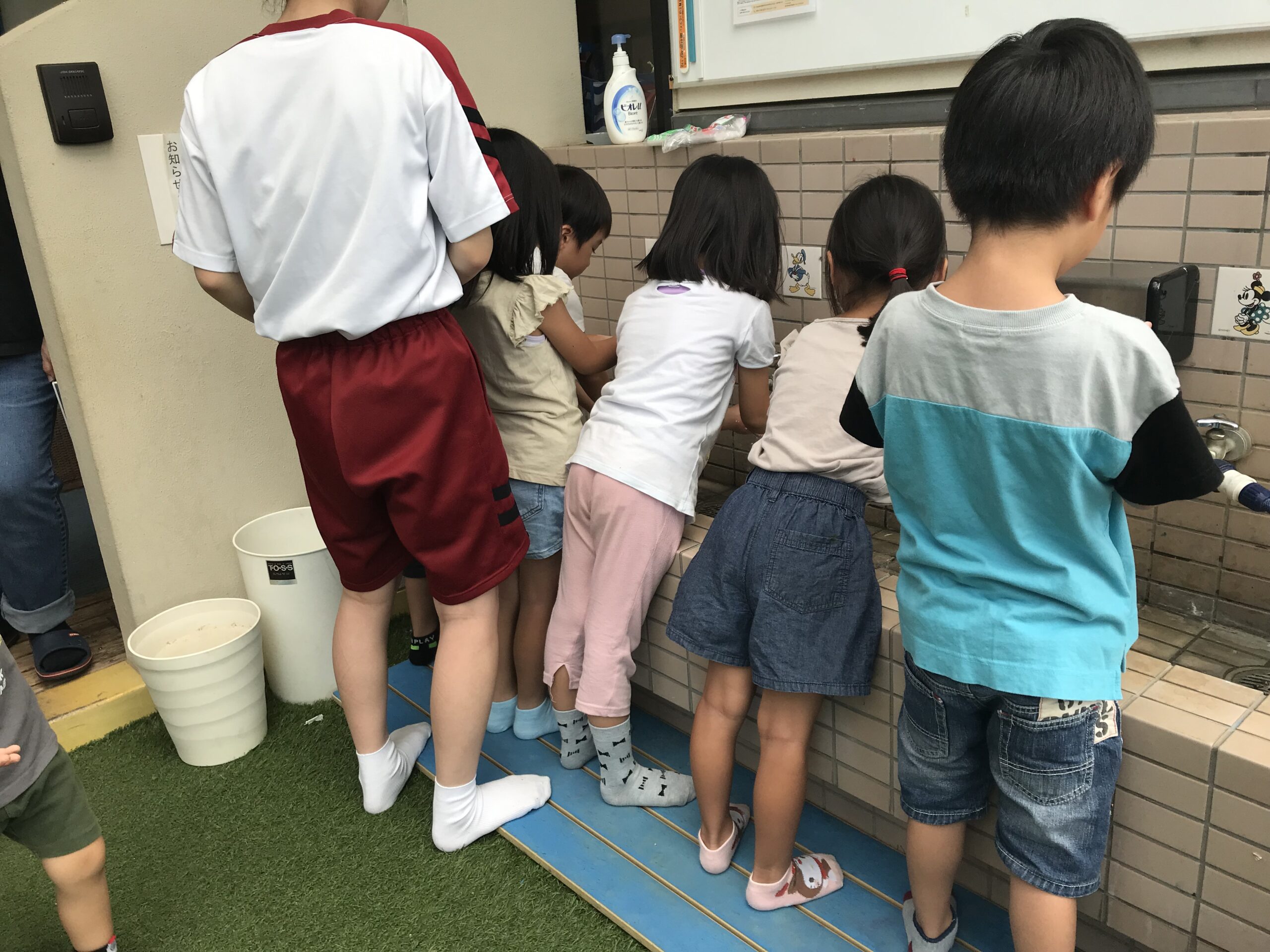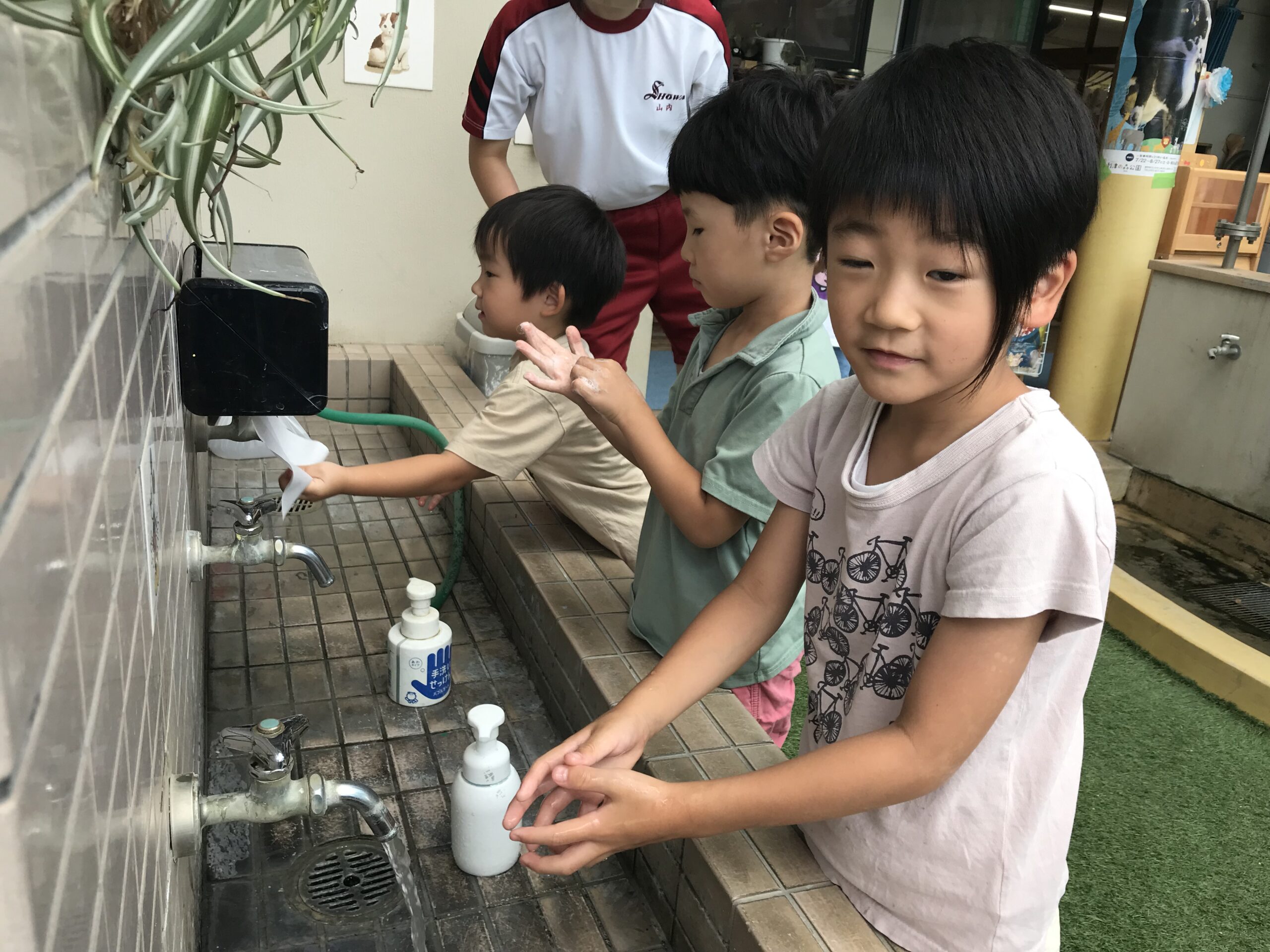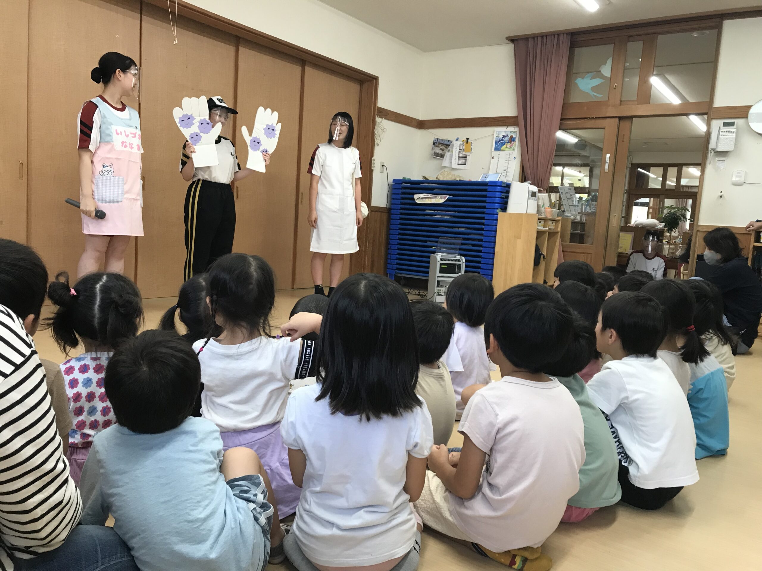 その後、看護実習生さん達から手洗い指導をしていただきました!子ども達は手洗いの歌を聞きながら楽しんで手洗いしていました。手のひらにスタンプを押してもらって、スタンプがしっかり落ちるまで手洗いを頑張りました!「ばいきん、バイバー―イ!」と頑張っていましたよ。