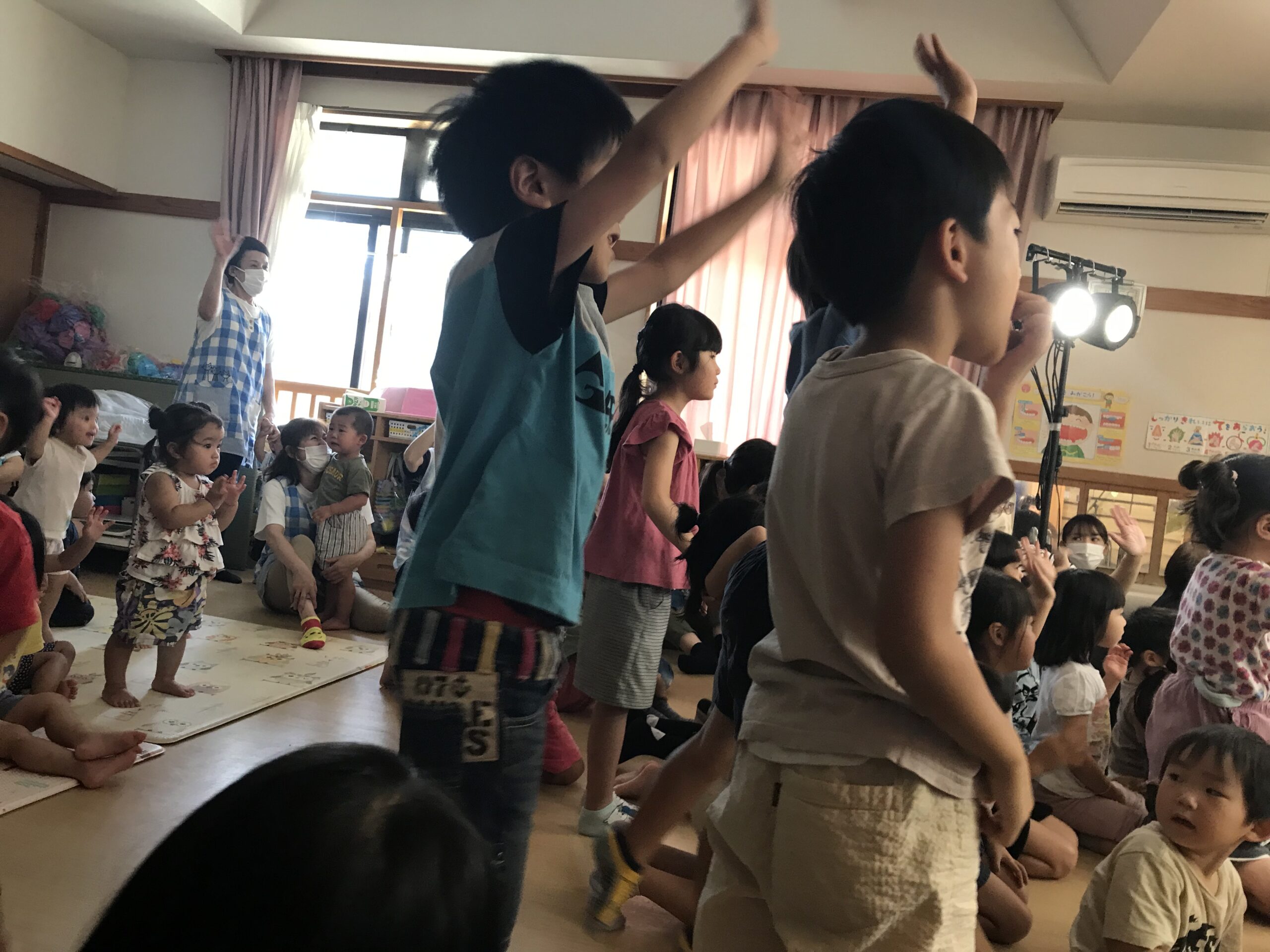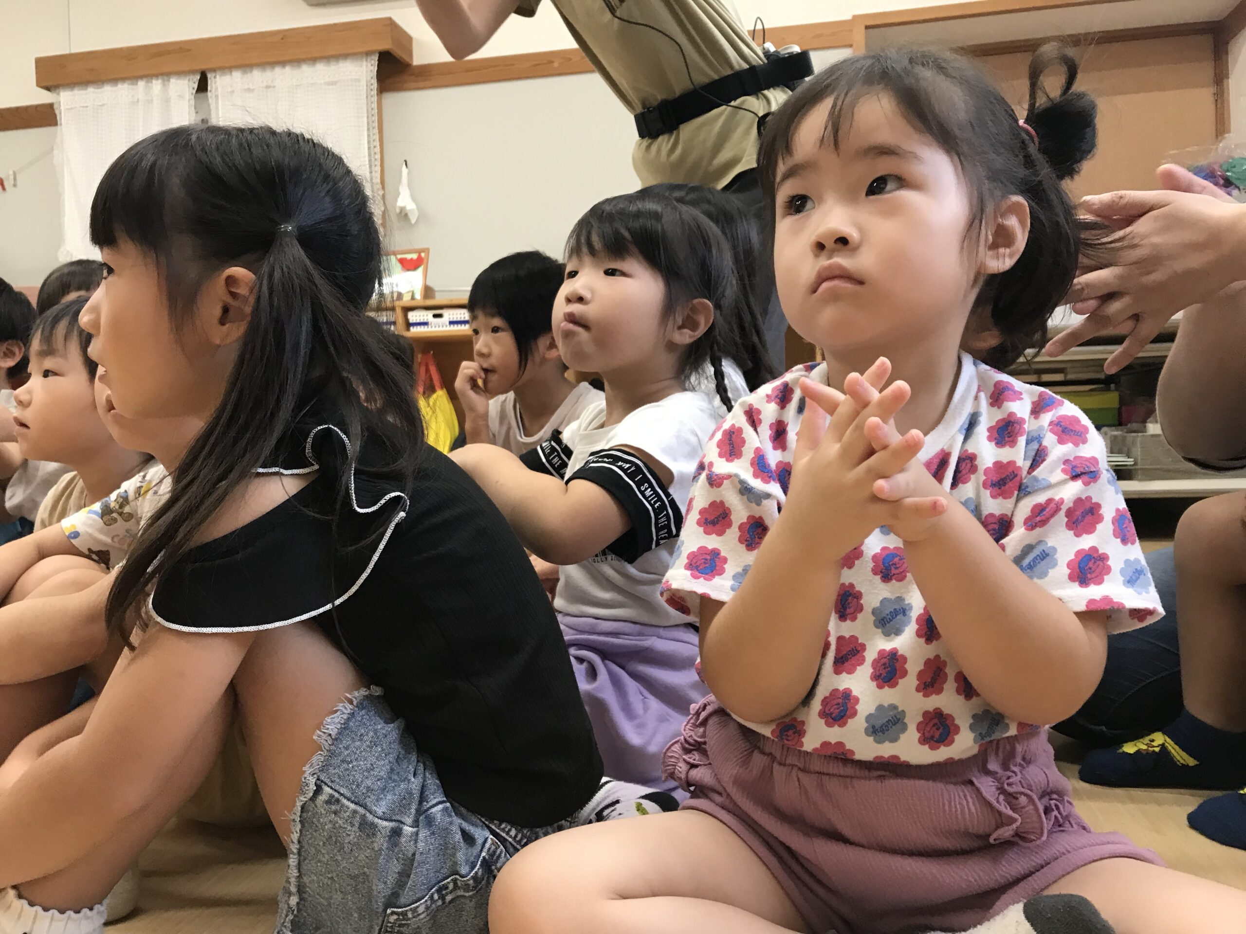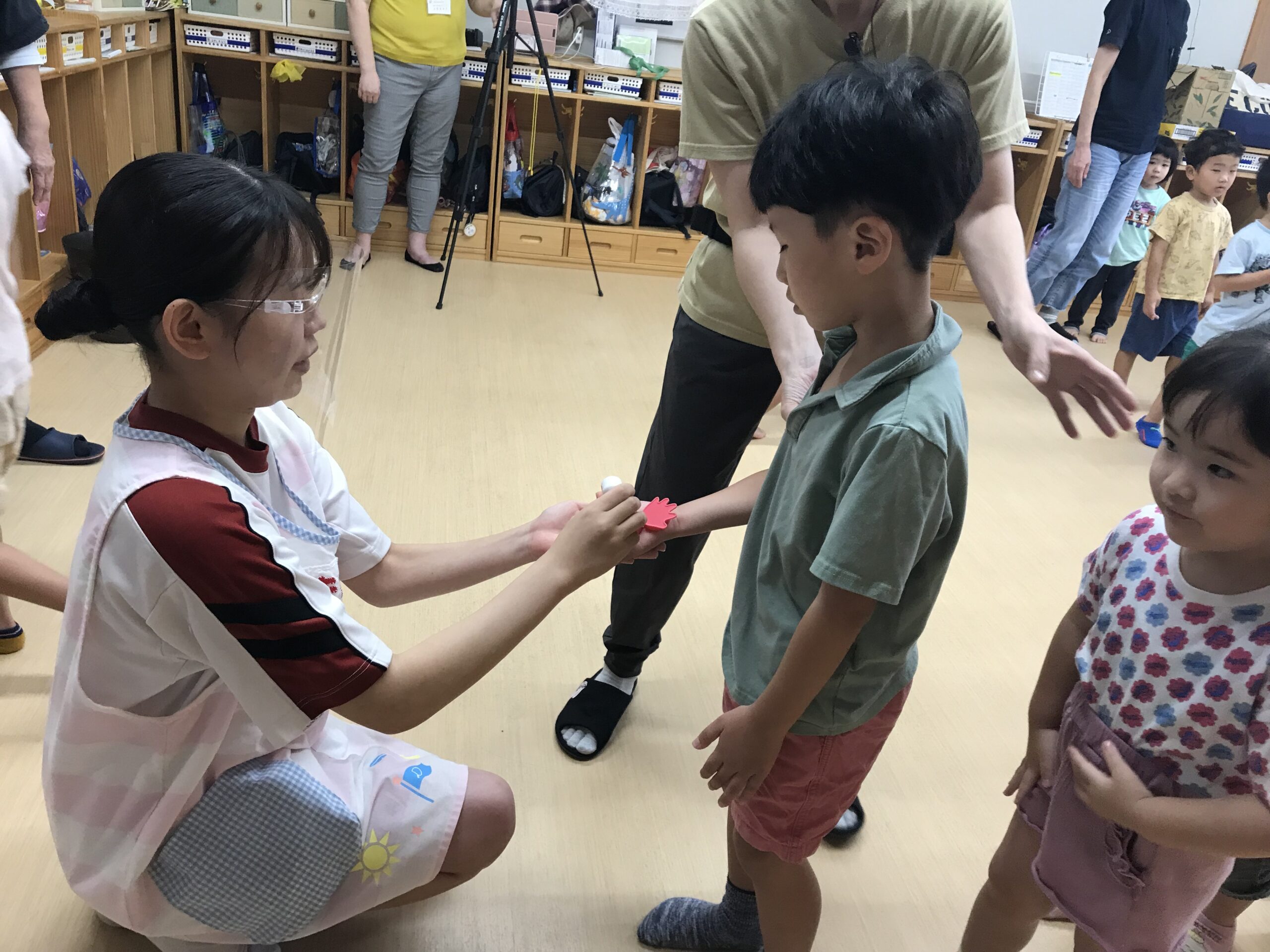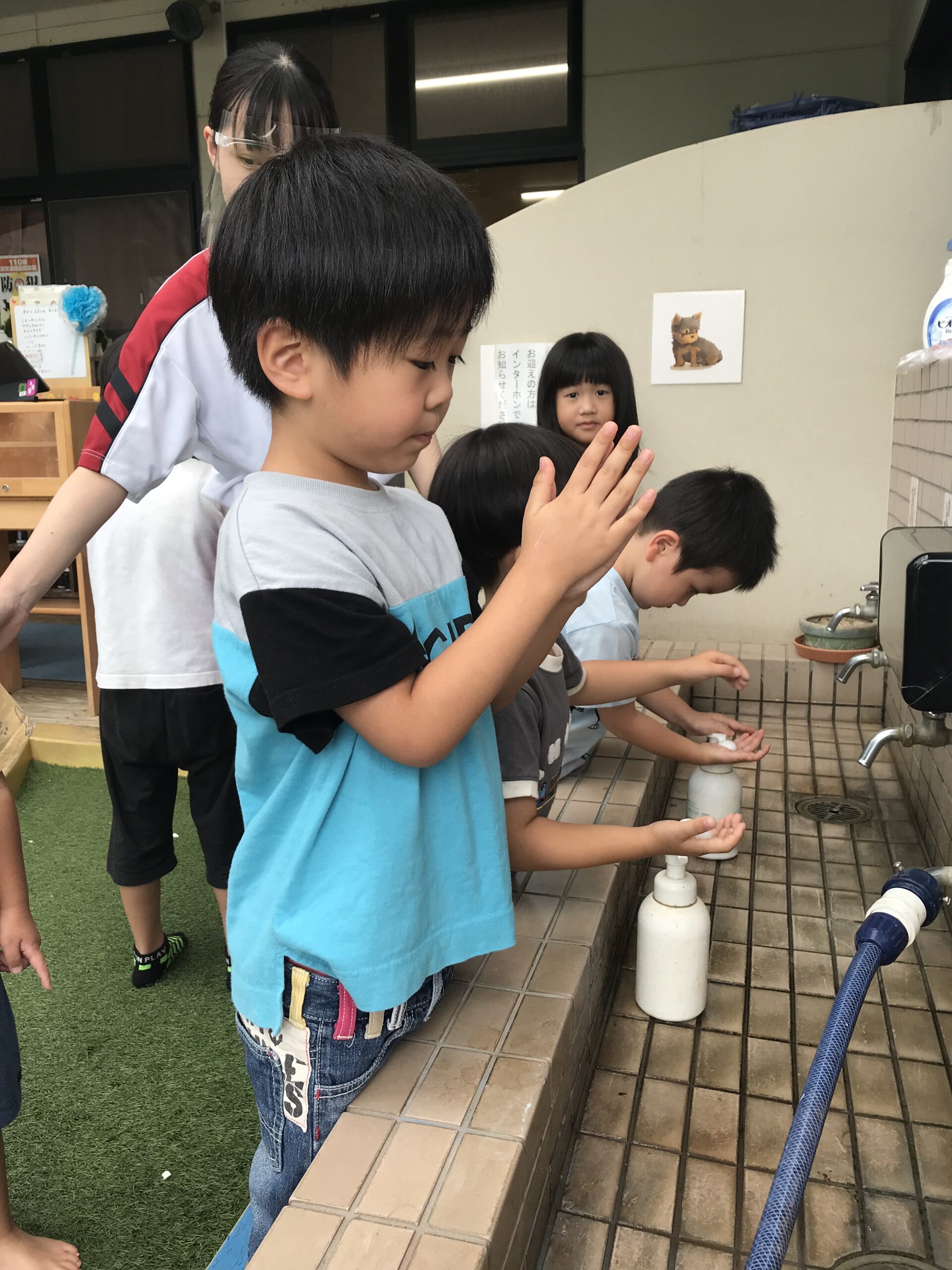 その後、看護実習生さん達から手洗い指導をしていただきました!子ども達は手洗いの歌を聞きながら楽しんで手洗いしていました。手のひらにスタンプを押してもらって、スタンプがしっかり落ちるまで手洗いを頑張りました!「ばいきん、バイバー―イ!」と頑張っていましたよ。