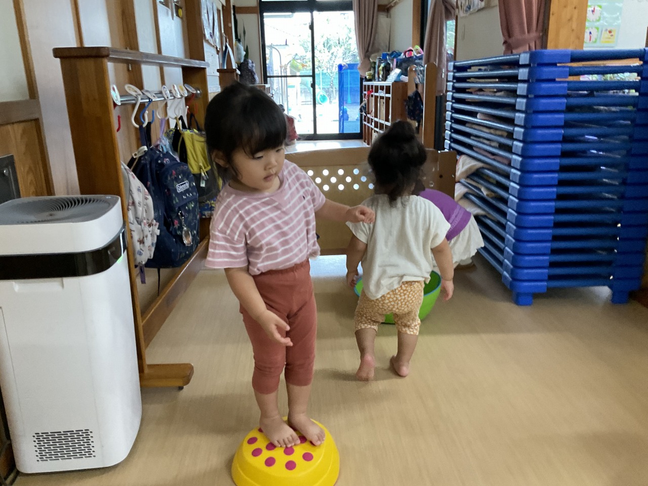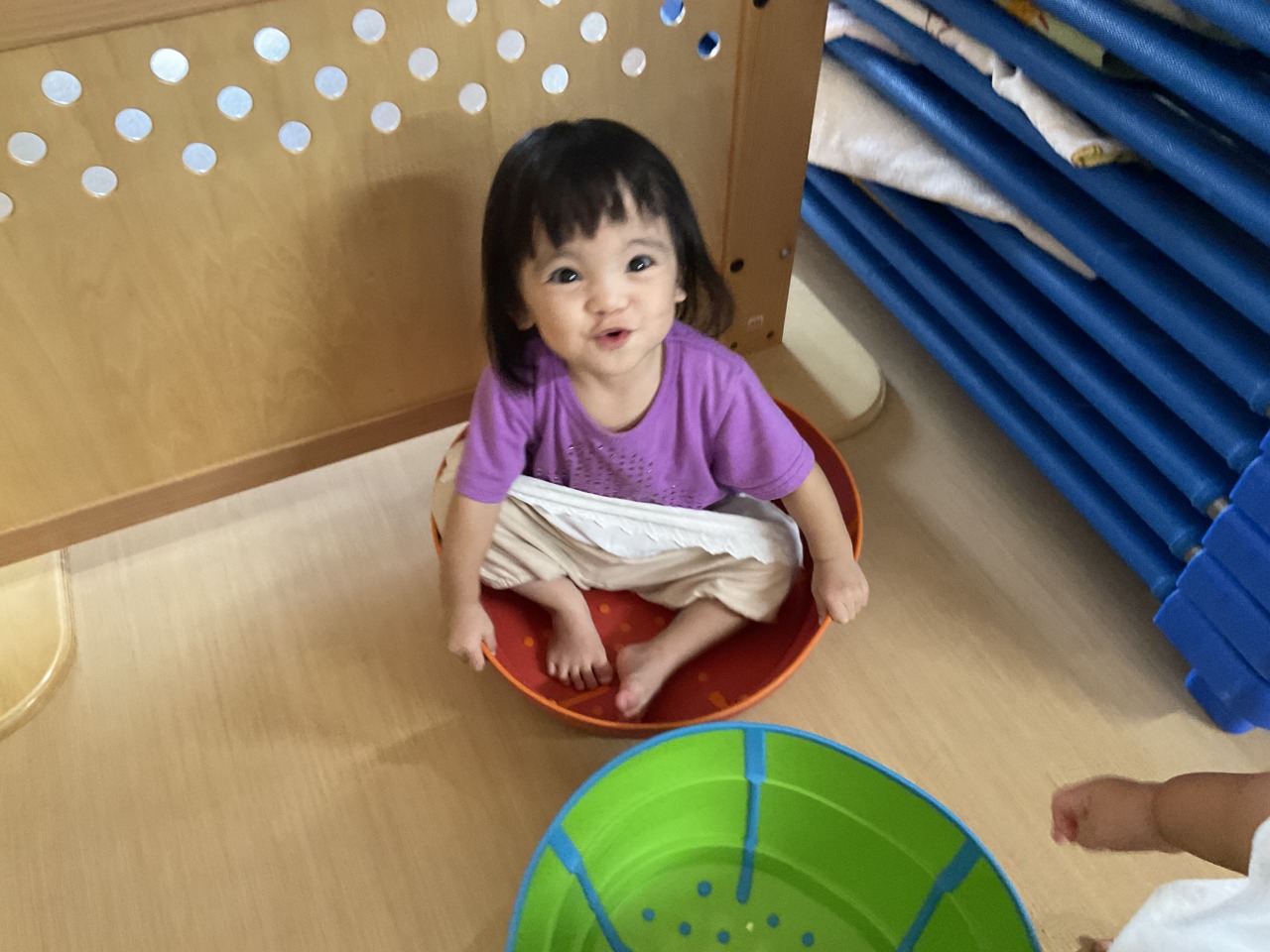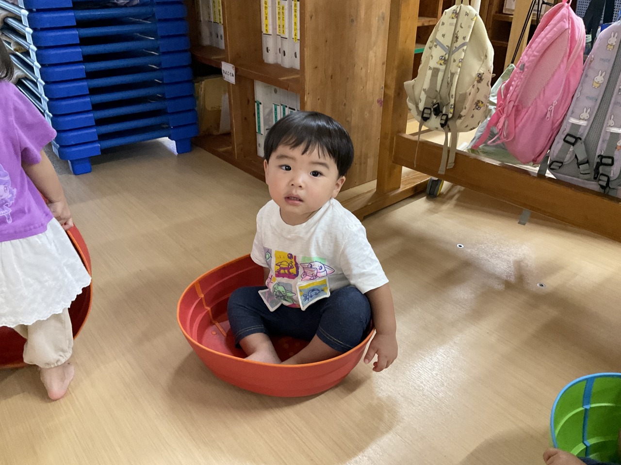 お部屋で過ごしたお友だちは、ホールで運動遊びをしました!最初は上を渡って遊んでいましたがひっくり返すと中に入れることに気が付いて、みんなで楽しそうに中に入って遊んでいました。お部屋の中でも身体を動かして遊べるようにしていきたいと思います。