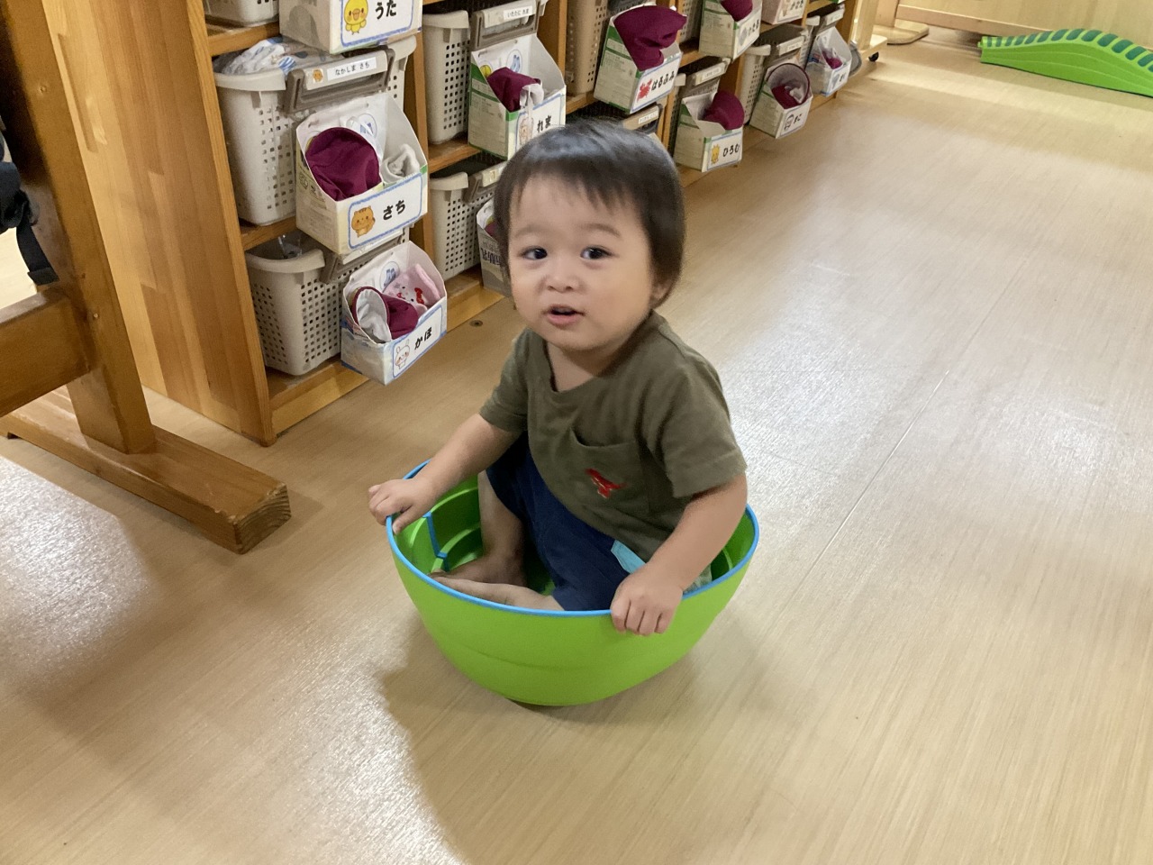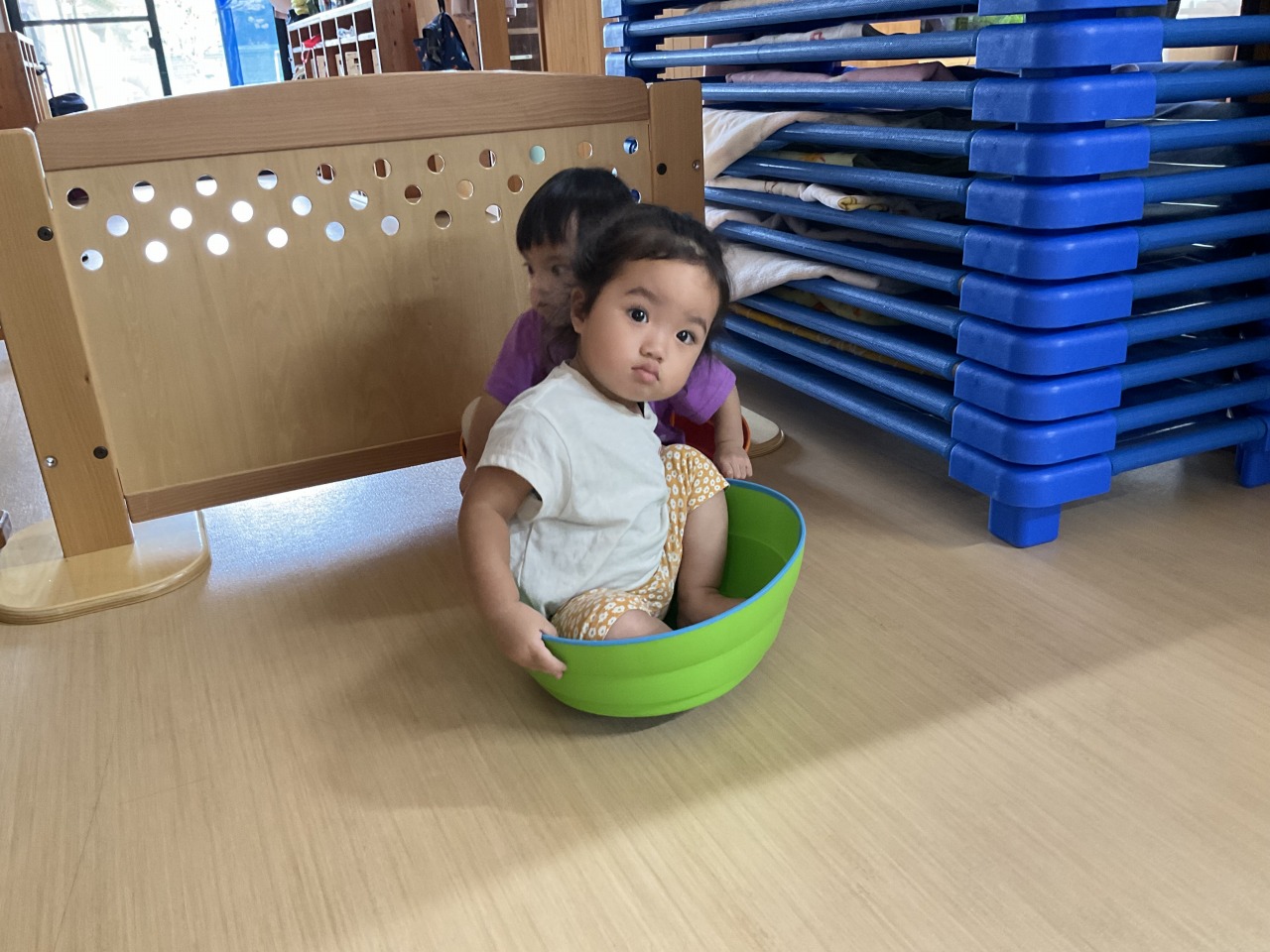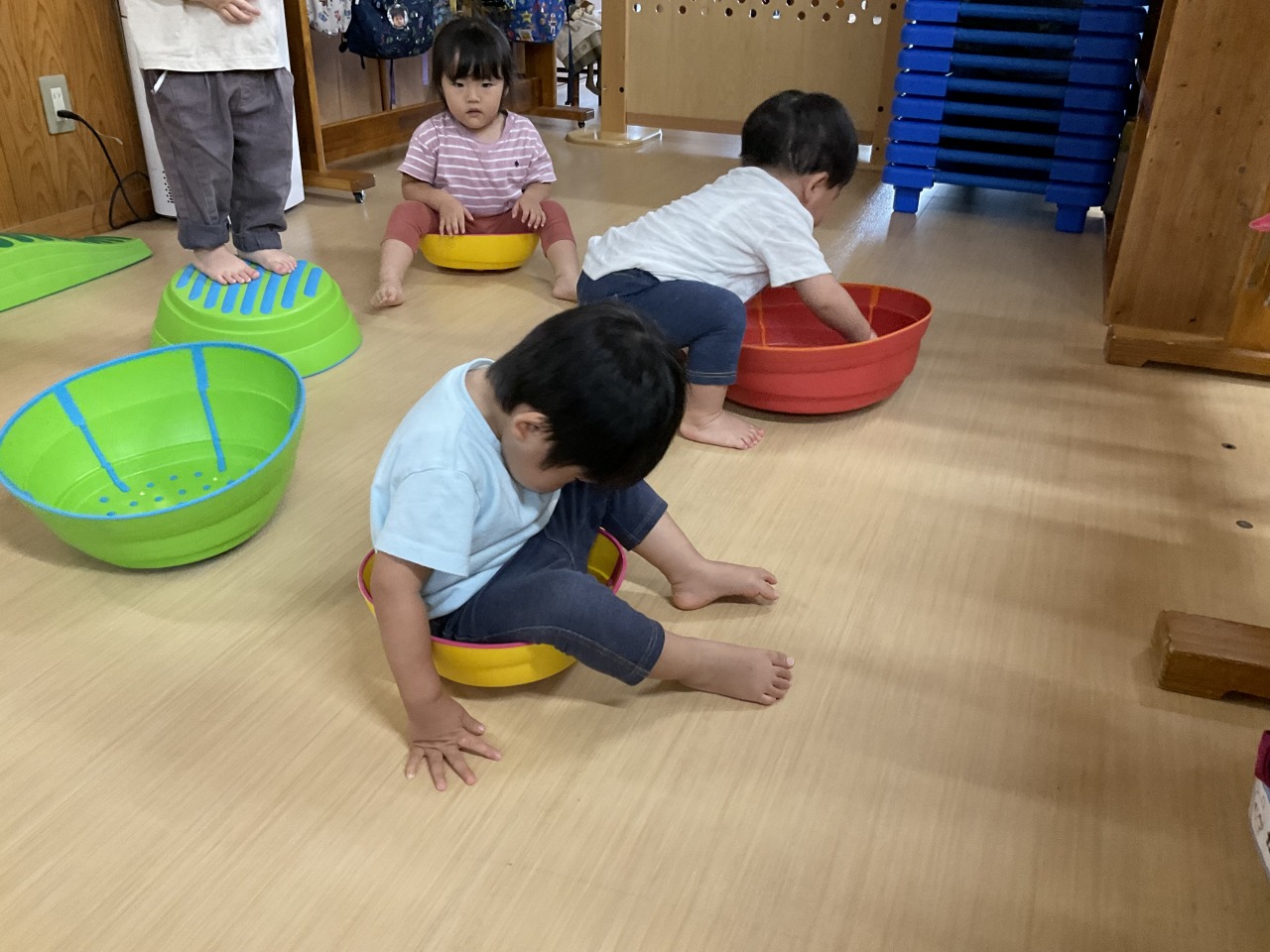 お部屋で過ごしたお友だちは、ホールで運動遊びをしました!最初は上を渡って遊んでいましたがひっくり返すと中に入れることに気が付いて、みんなで楽しそうに中に入って遊んでいました。お部屋の中でも身体を動かして遊べるようにしていきたいと思います。