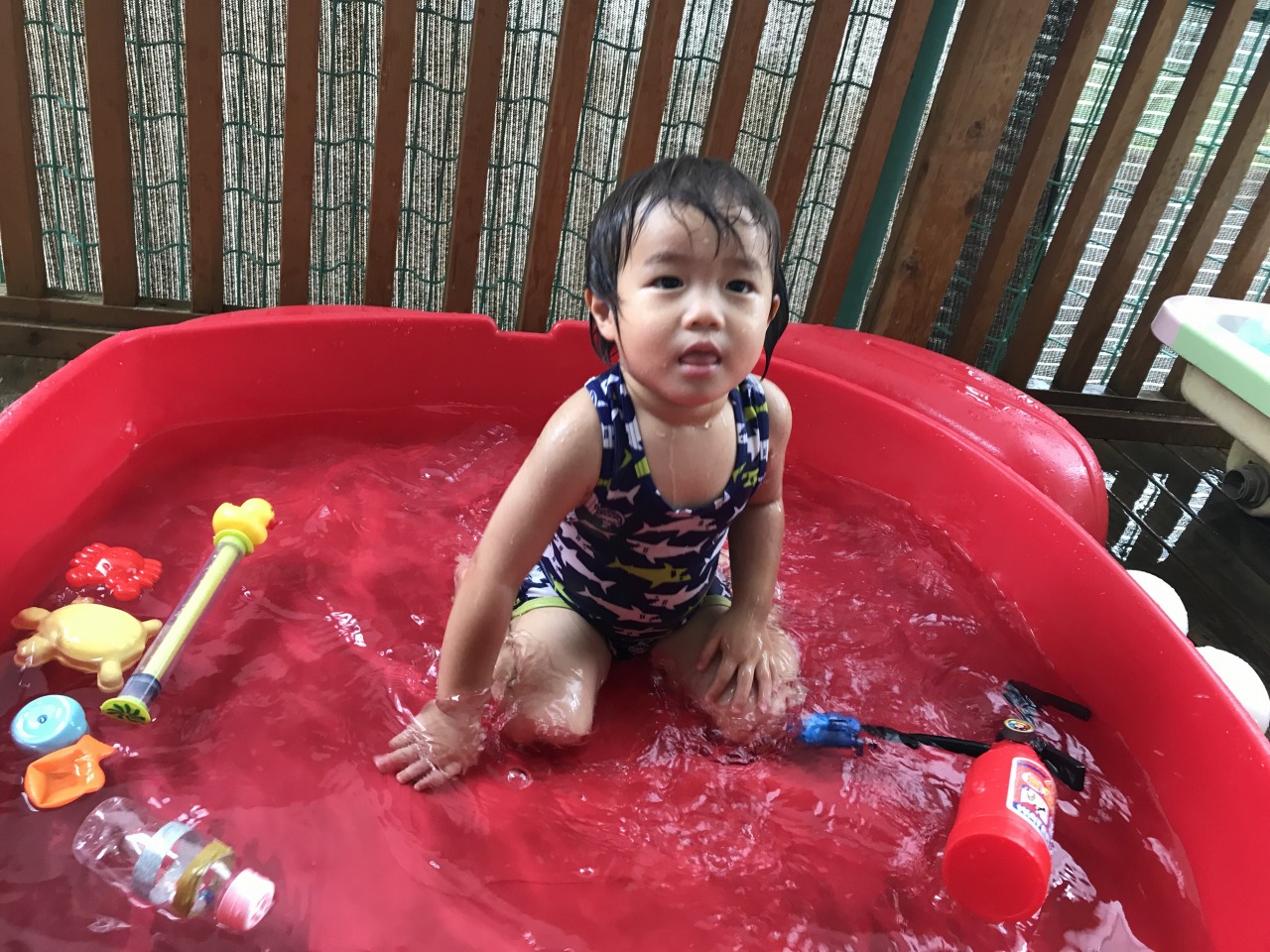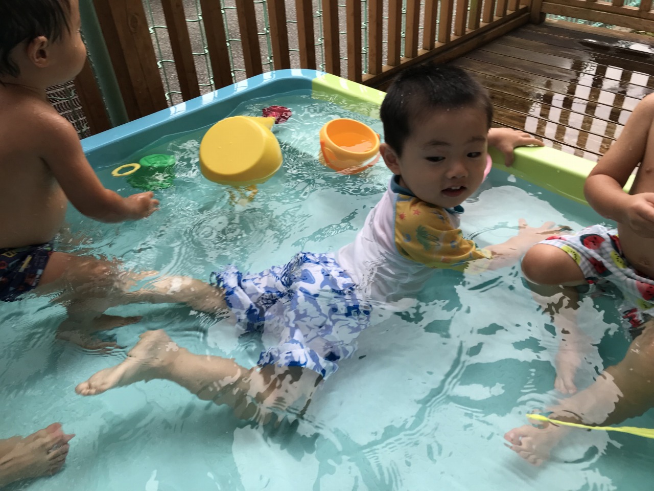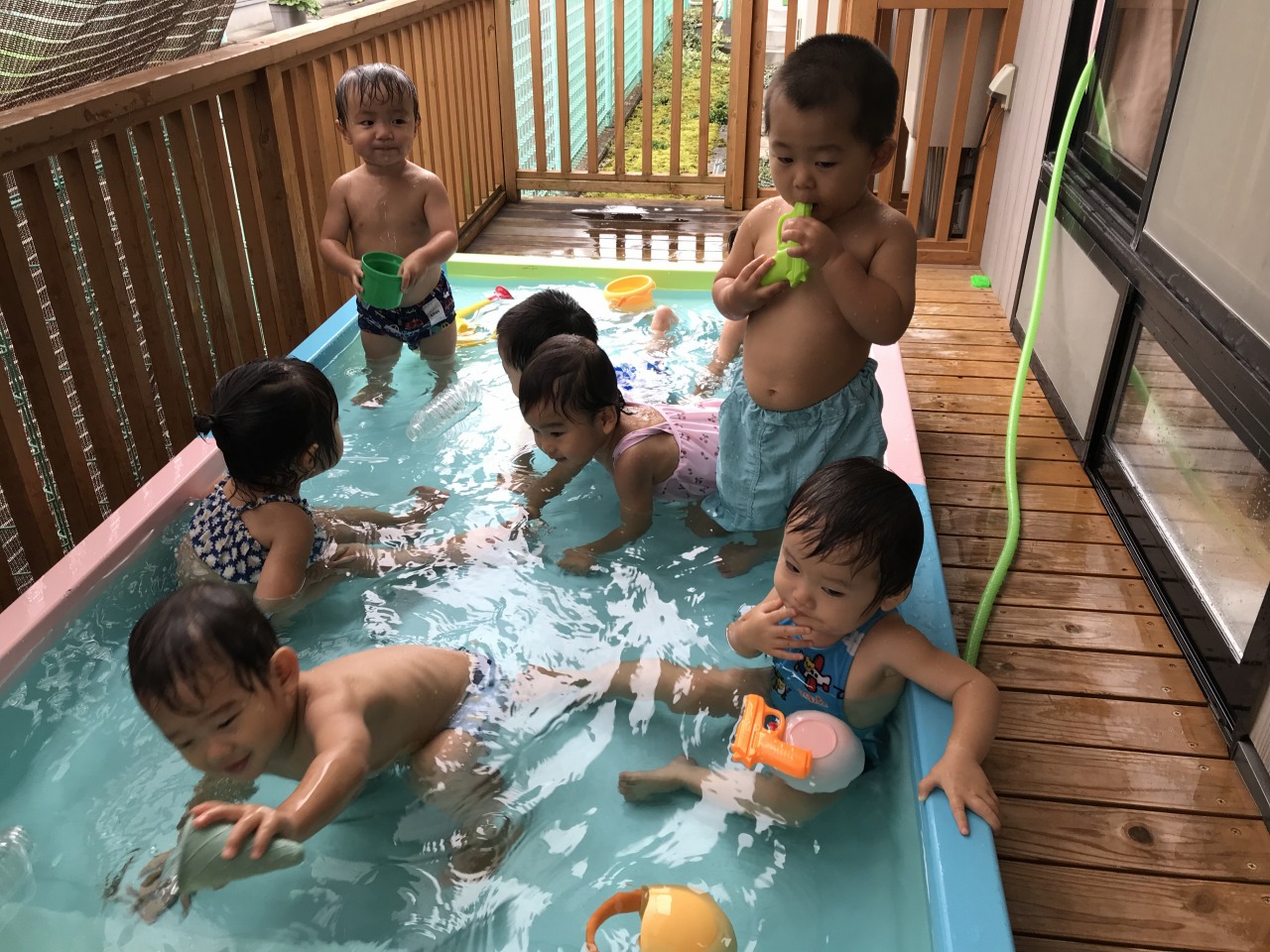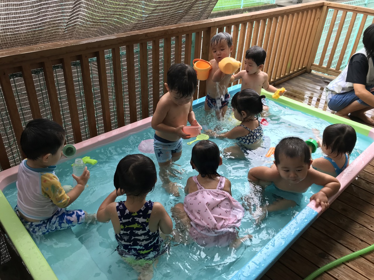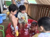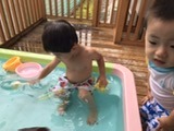 すみれ組(1歳児)は今年最後の水遊びをしました!最初は涙が見られることもありましたが、天気の良い日に水遊びをしていくうちに徐々に水と親しんでいく姿が見られました。遊び方も活発になってきて、自分の頭にコップで水をかけて遊んだり、お友だちと一緒にワニさん歩きをしたりして遊んでいた子ども達です。保育士等も一緒に中に入って水鉄砲で遊び、安心して遊べるようにしています。来年度の水遊びも楽しみです☆