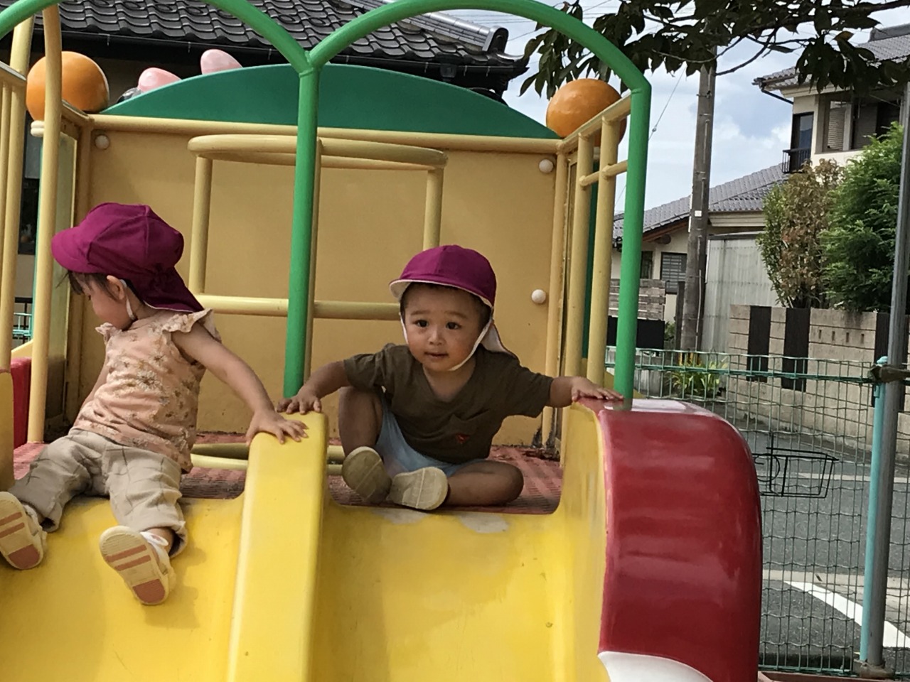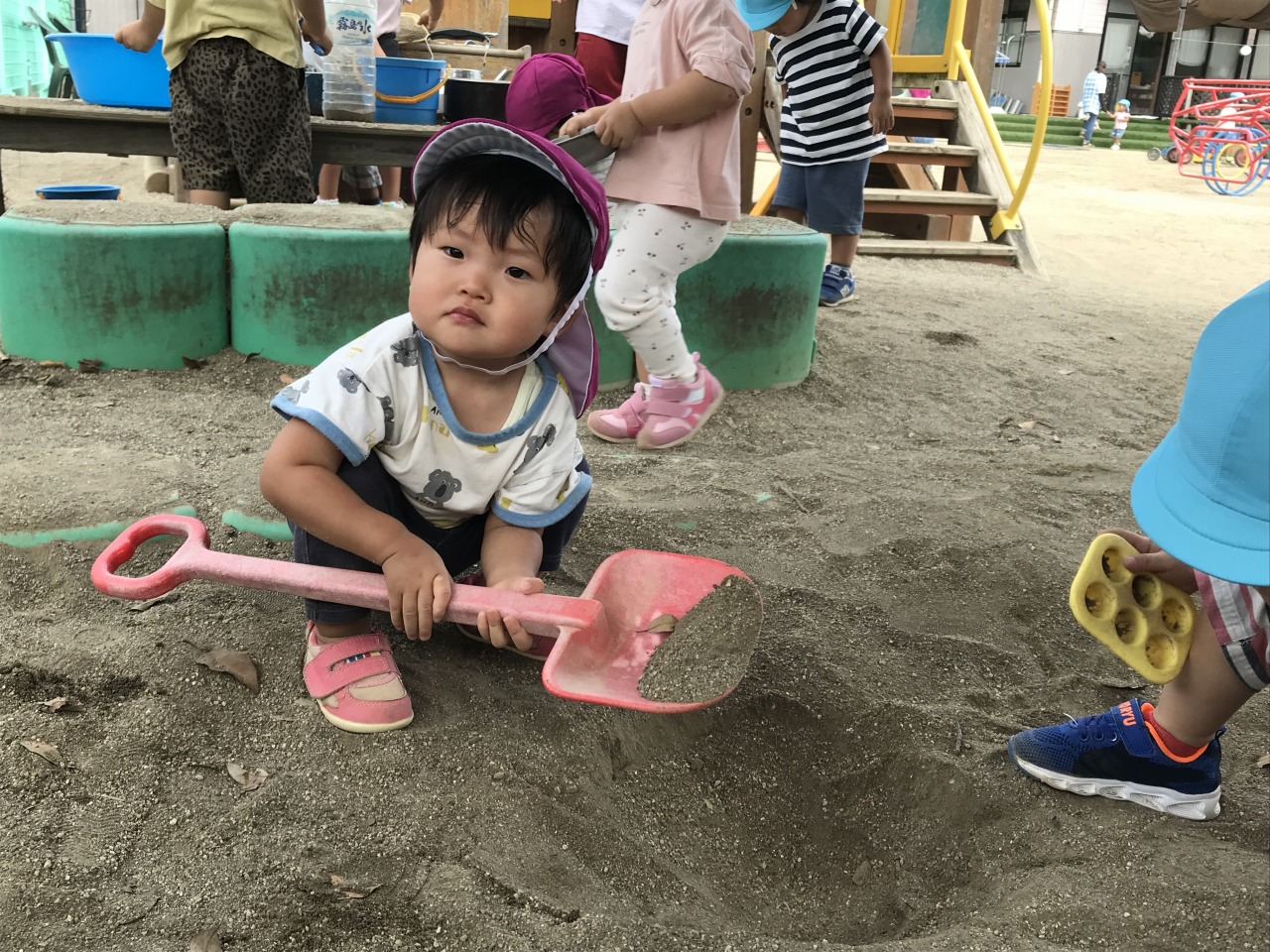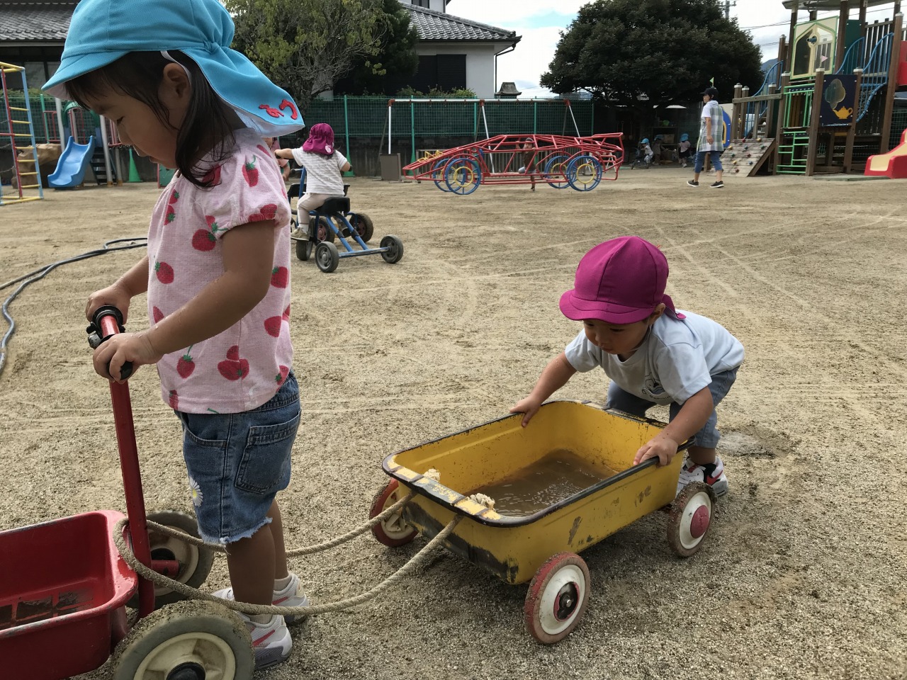すみれ組(1歳児)は園庭で遊びました。朝夕は涼しさを感じるようになりましたが、日中はまだまだ暑く、しっかり水分補給をしながら遊んでいます。お外に出る前に靴下を履いたり、帽子をかぶったりすることも自分で少しずつできるようになっています。園庭では砂場やすべり台など自分の好きな場所へ行って遊びを楽しんでいます。一人でできるようになったことが増えて、高いところまで登って行ったり、すべり台を滑ってきたりと子ども達のとっても満足そうな表情を見ることができます。子ども達のやってみたいという気持ちを受け止めて、遊びの中で様々な経験ができるようにしたり成長を見守っていきたいです。たくさん遊んで汗びっしょりになった後シャワーでさっぱりして食事の時間です。明日も元気いっぱい遊びましょうね。