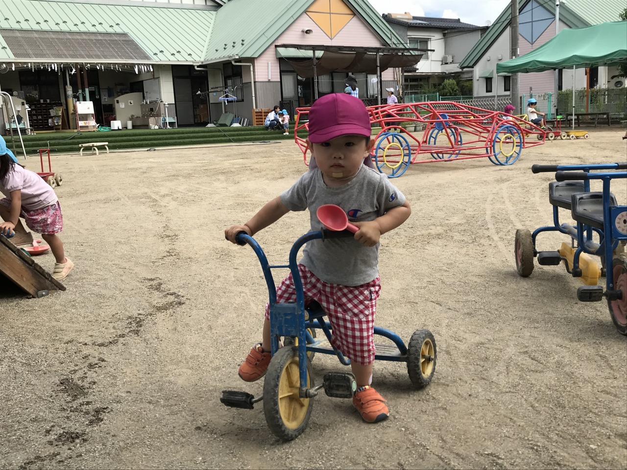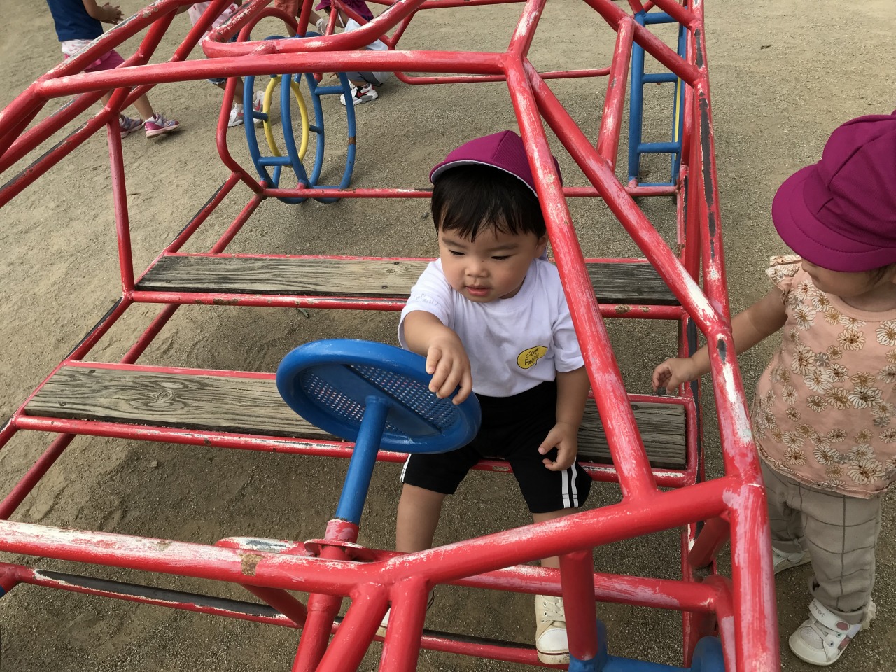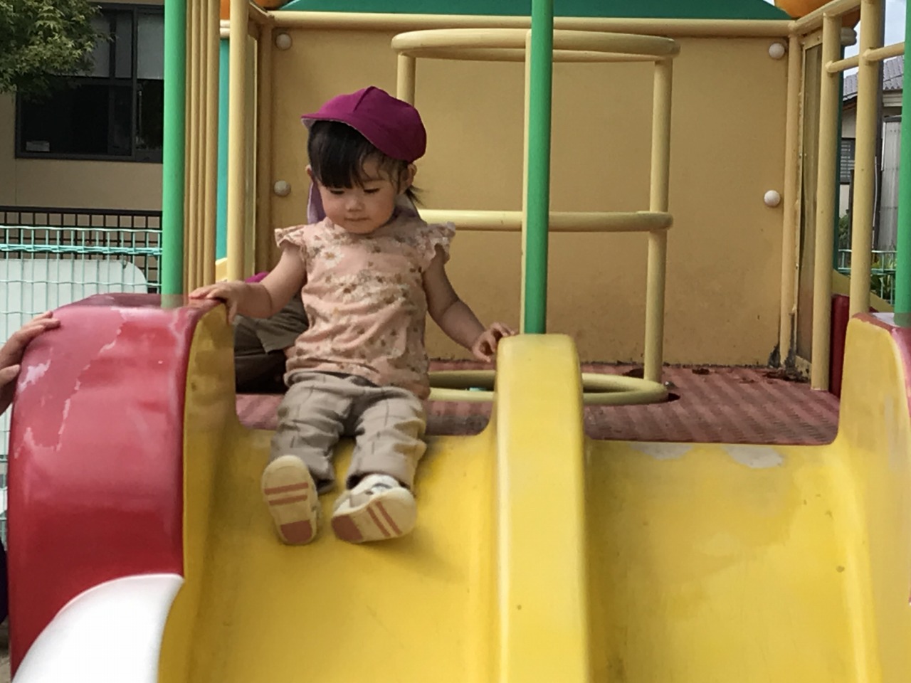 すみれ組(1歳児)は園庭で遊びました。朝夕は涼しさを感じるようになりましたが、日中はまだまだ暑く、しっかり水分補給をしながら遊んでいます。お外に出る前に靴下を履いたり、帽子をかぶったりすることも自分で少しずつできるようになっています。園庭では砂場やすべり台など自分の好きな場所へ行って遊びを楽しんでいます。一人でできるようになったことが増えて、高いところまで登って行ったり、すべり台を滑ってきたりと子ども達のとっても満足そうな表情を見ることができます。子ども達のやってみたいという気持ちを受け止めて、遊びの中で様々な経験ができるようにしたり成長を見守っていきたいです。たくさん遊んで汗びっしょりになった後シャワーでさっぱりして食事の時間です。明日も元気いっぱい遊びましょうね。