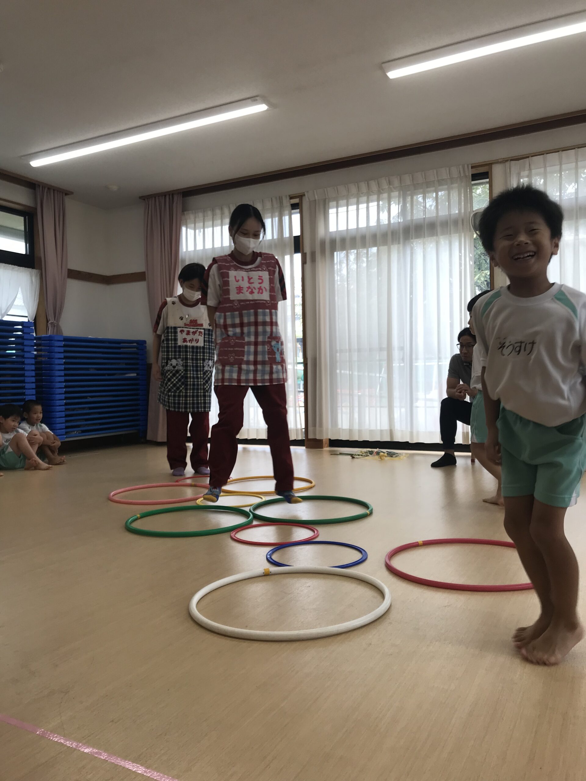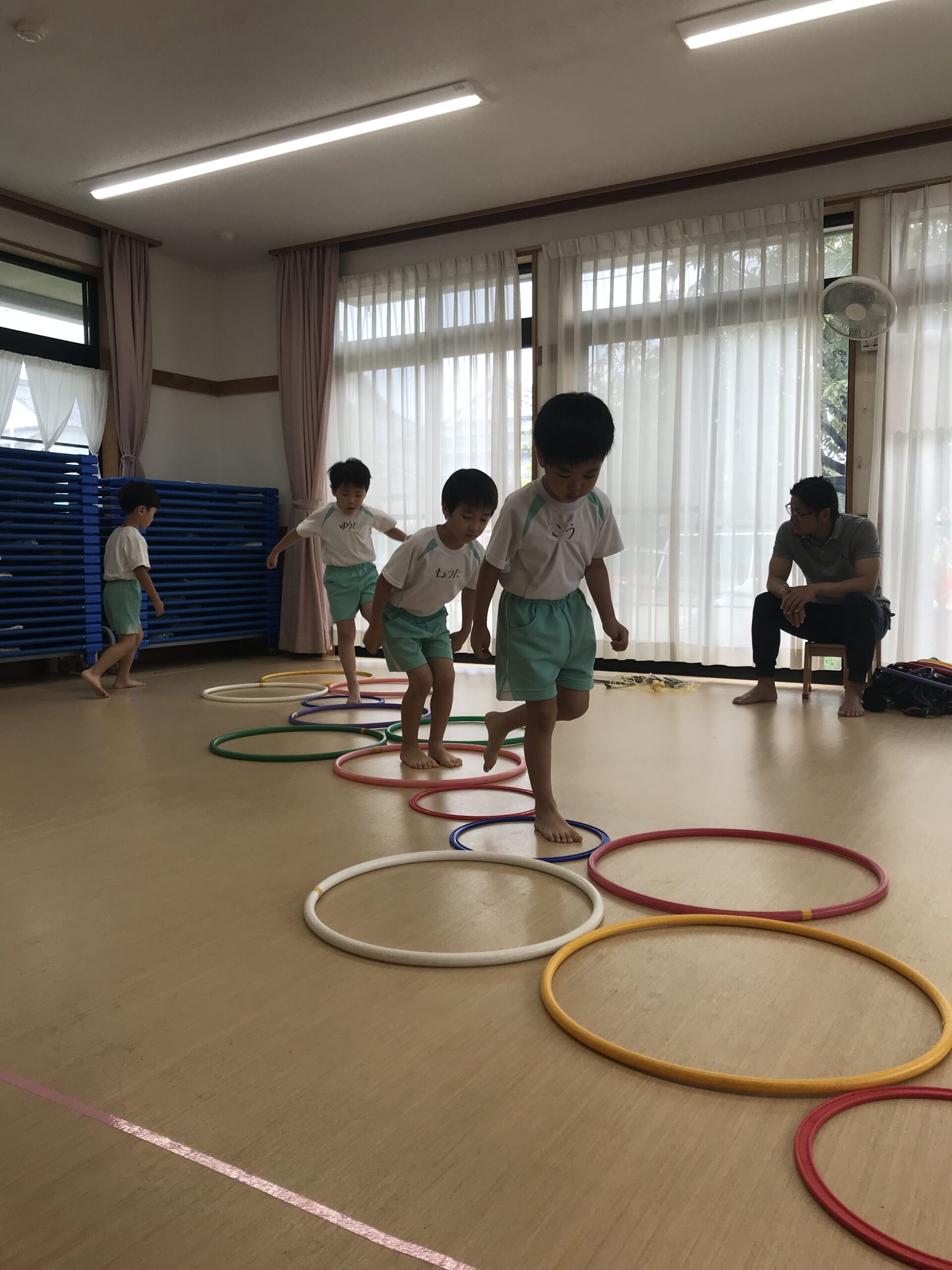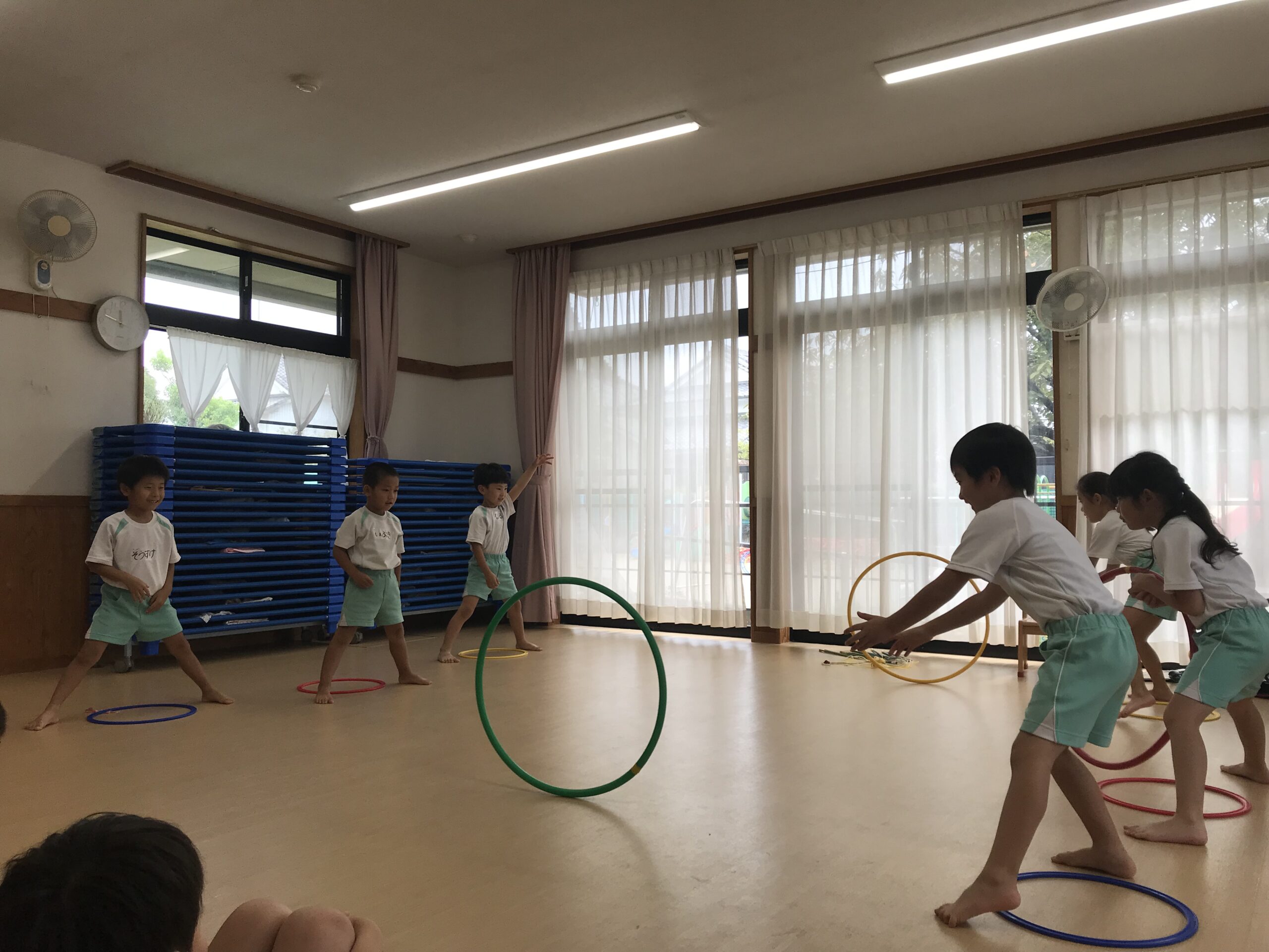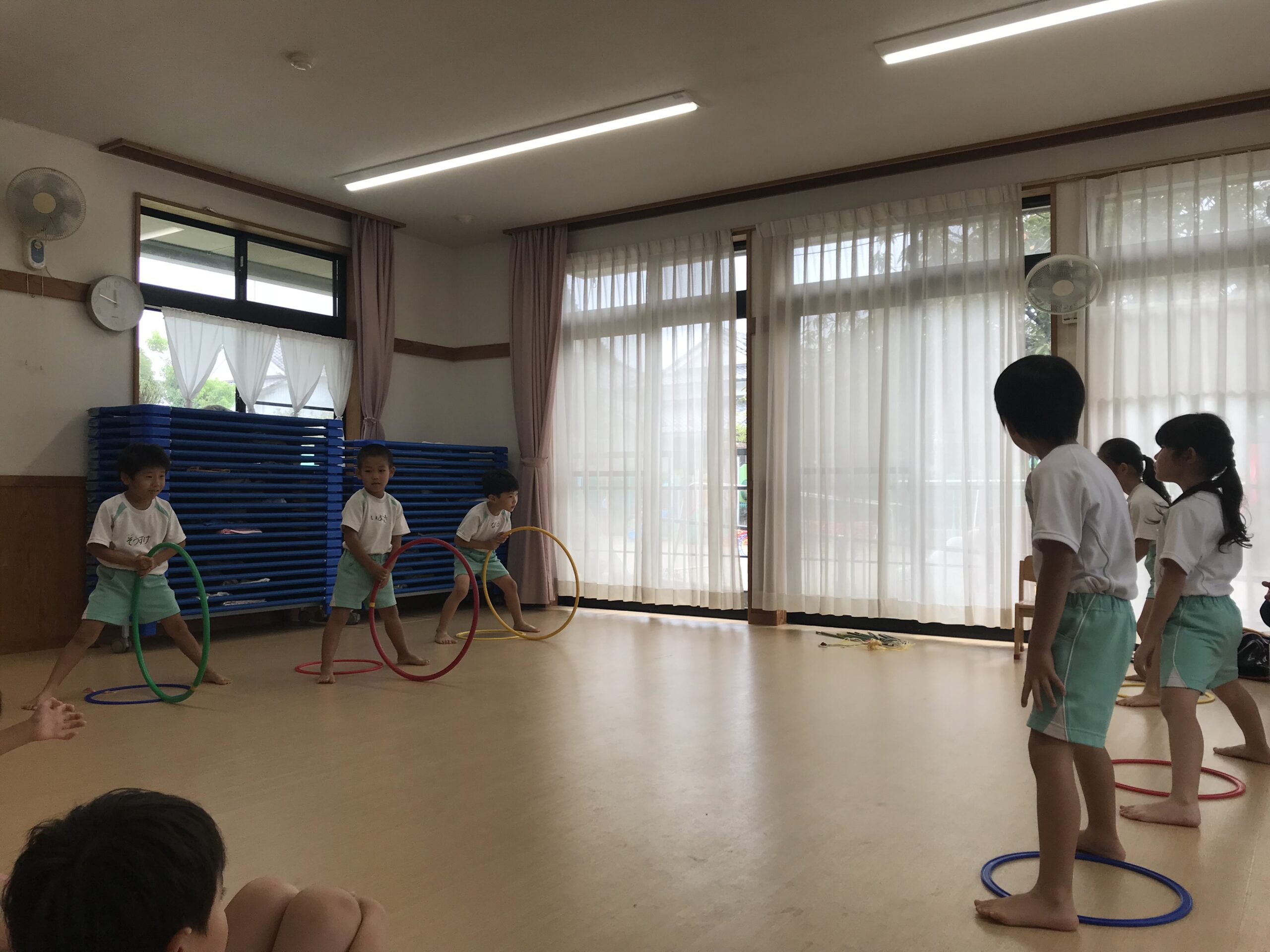 今日は体操教室がありました。縄跳びやフラフープで元気いっぱい体を動かしました。講師の先生のお話をしっかり聞きながら、縄跳びに挑戦する子ども達。跳び方のコツを教えてもらって上手に跳ぶことができました。「縄跳び楽しい!またしたい!」と意欲的に参加してくれました。フラフープ遊びでは地面にフラフープを並べてケンケンパをしたり、転がしてお友達にパスしたりと色々な遊びを教えてもらいました。みんな笑顔で楽しむ姿がありました。体を沢山動かして、沢山笑って楽しい時間を過ごすことができました。