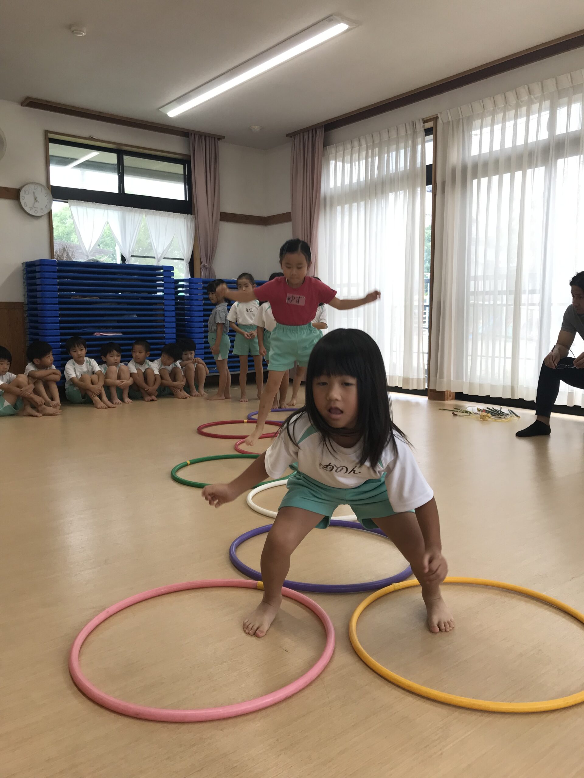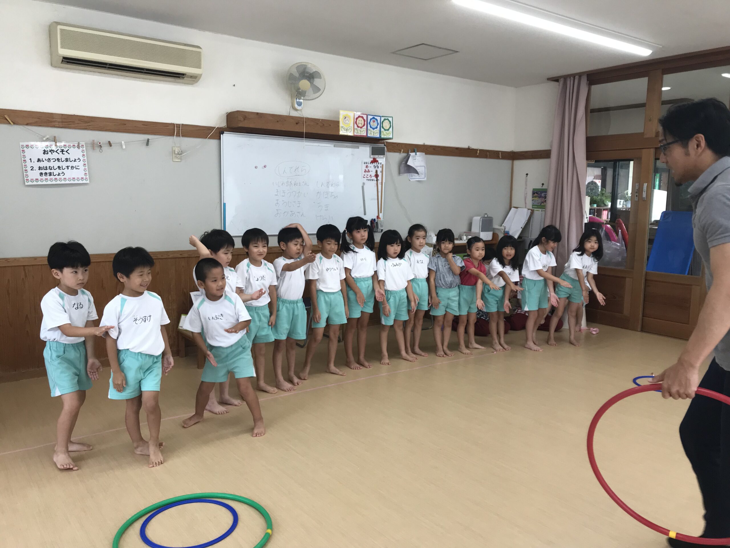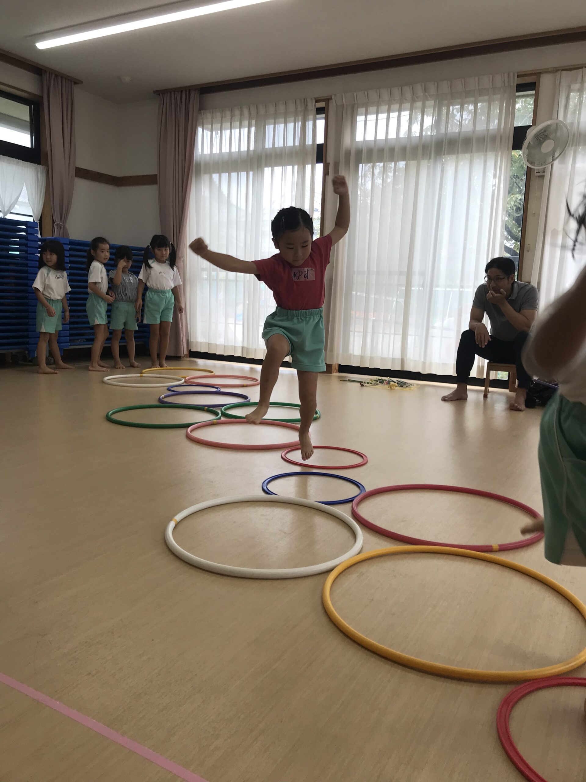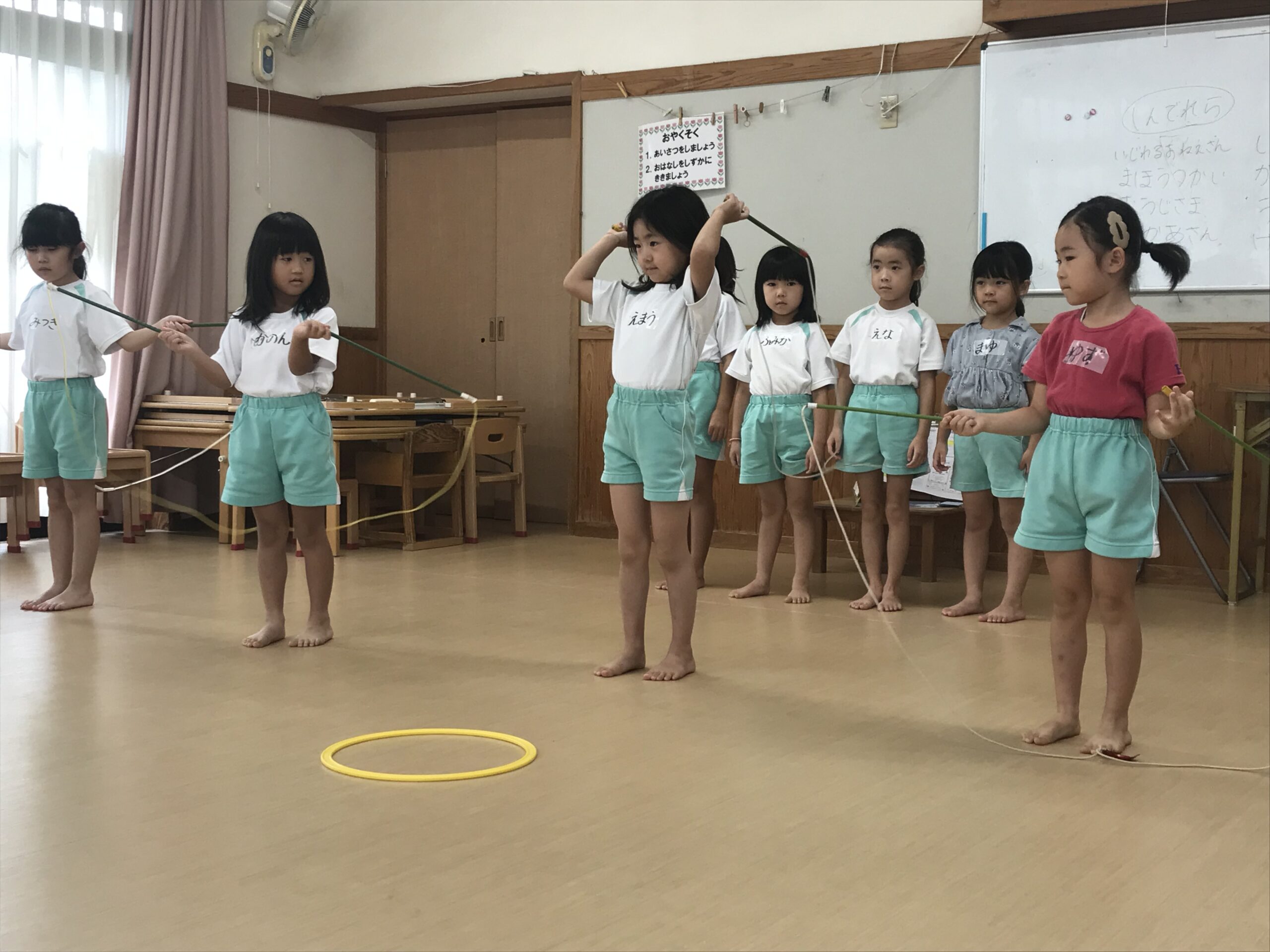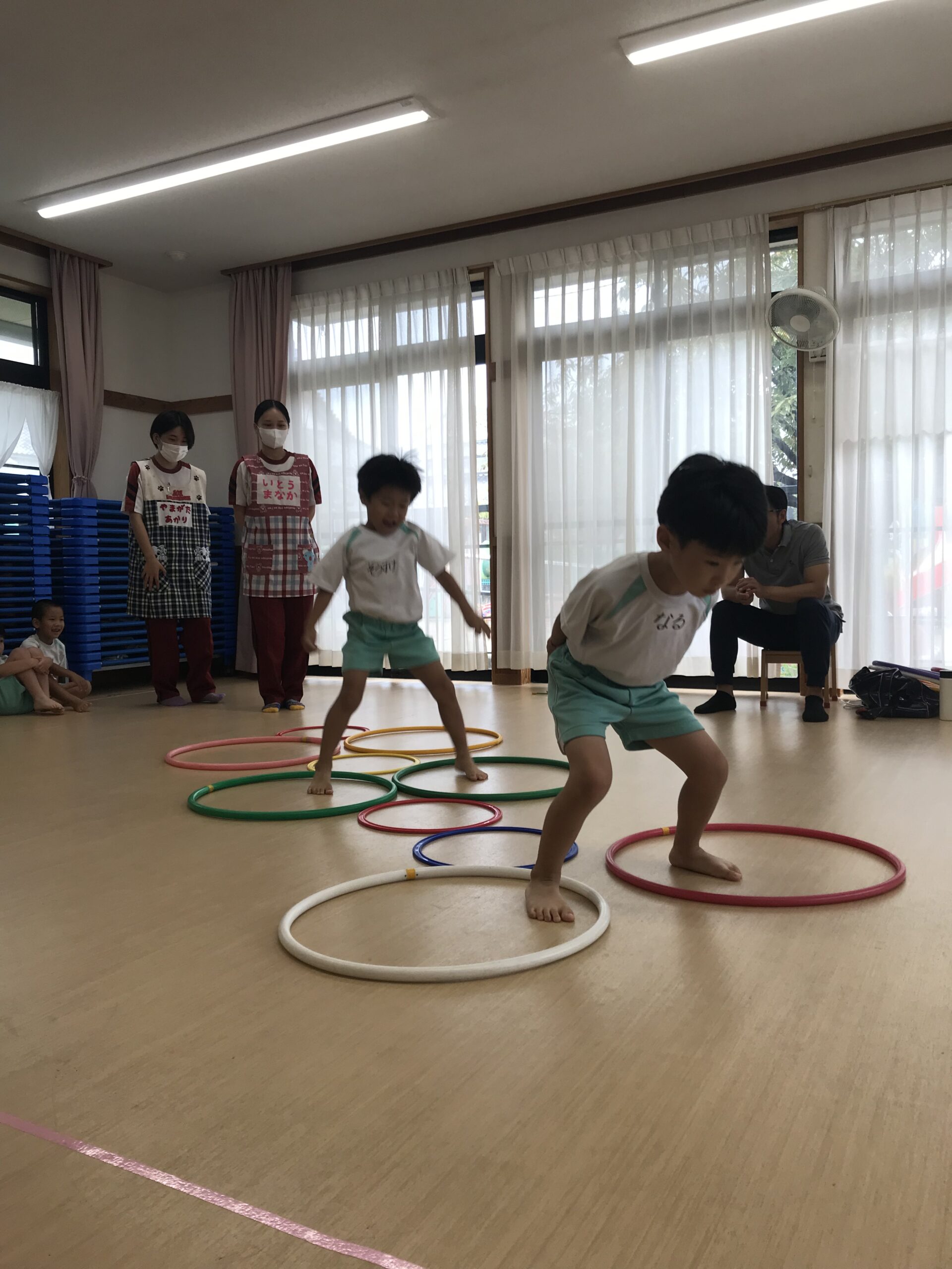 今日は体操教室がありました。縄跳びやフラフープで元気いっぱい体を動かしました。講師の先生のお話をしっかり聞きながら、縄跳びに挑戦する子ども達。跳び方のコツを教えてもらって上手に跳ぶことができました。「縄跳び楽しい!またしたい!」と意欲的に参加してくれました。フラフープ遊びでは地面にフラフープを並べてケンケンパをしたり、転がしてお友達にパスしたりと色々な遊びを教えてもらいました。みんな笑顔で楽しむ姿がありました。体を沢山動かして、沢山笑って楽しい時間を過ごすことができました。