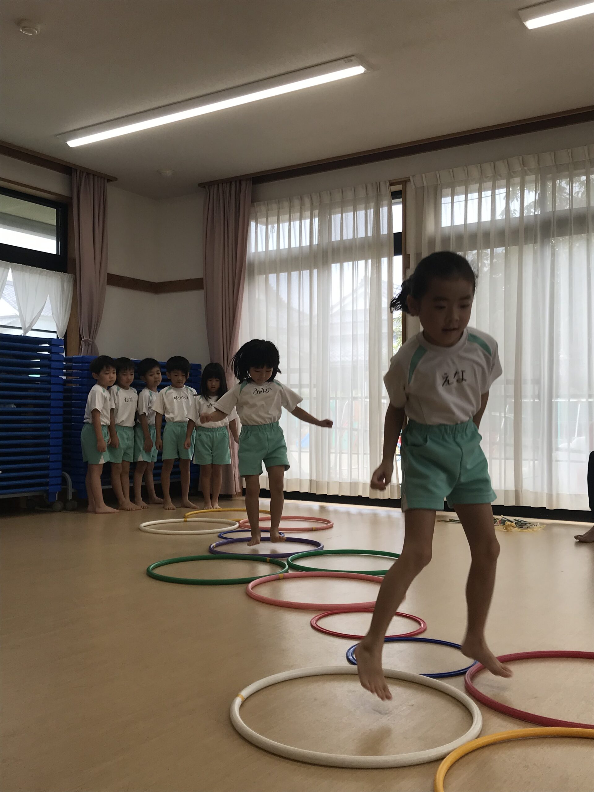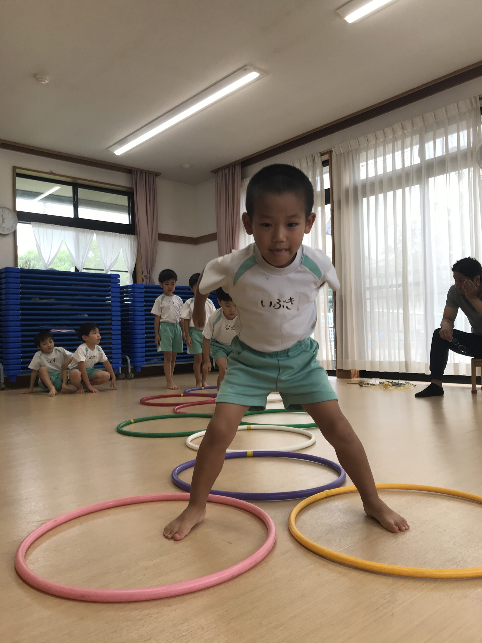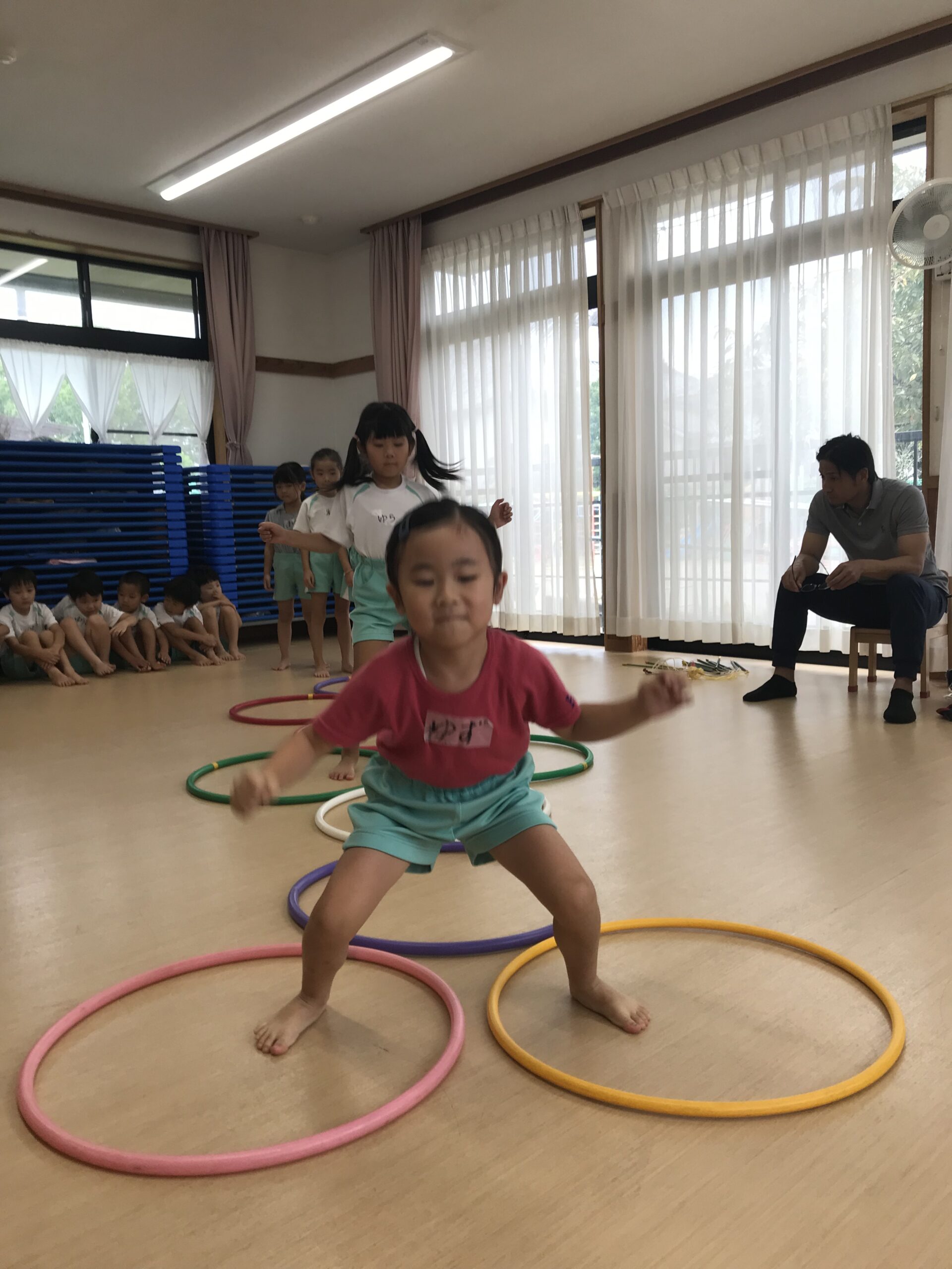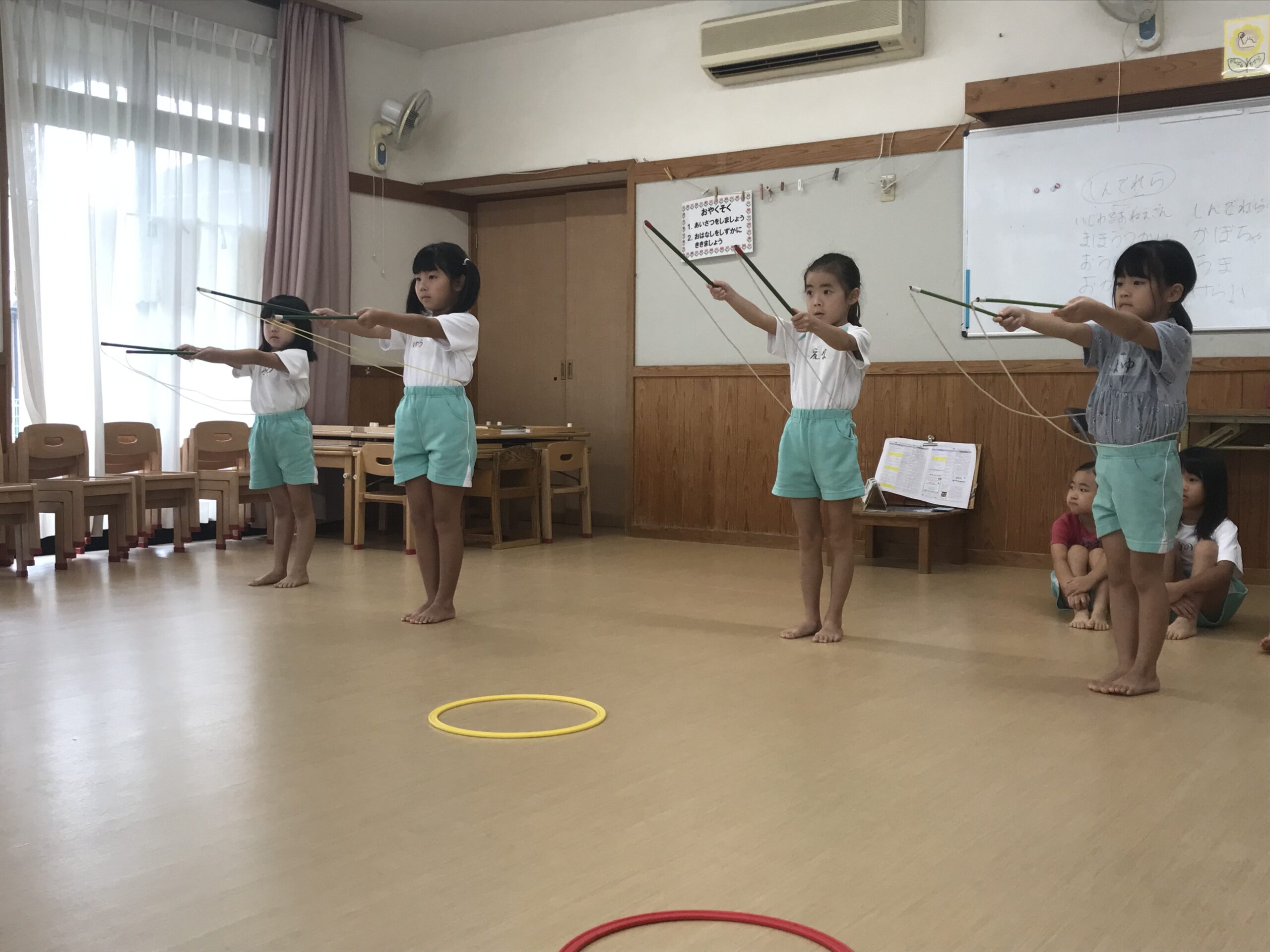 今日は体操教室がありました。縄跳びやフラフープで元気いっぱい体を動かしました。講師の先生のお話をしっかり聞きながら、縄跳びに挑戦する子ども達。跳び方のコツを教えてもらって上手に跳ぶことができました。「縄跳び楽しい!またしたい!」と意欲的に参加してくれました。フラフープ遊びでは地面にフラフープを並べてケンケンパをしたり、転がしてお友達にパスしたりと色々な遊びを教えてもらいました。みんな笑顔で楽しむ姿がありました。体を沢山動かして、沢山笑って楽しい時間を過ごすことができました。