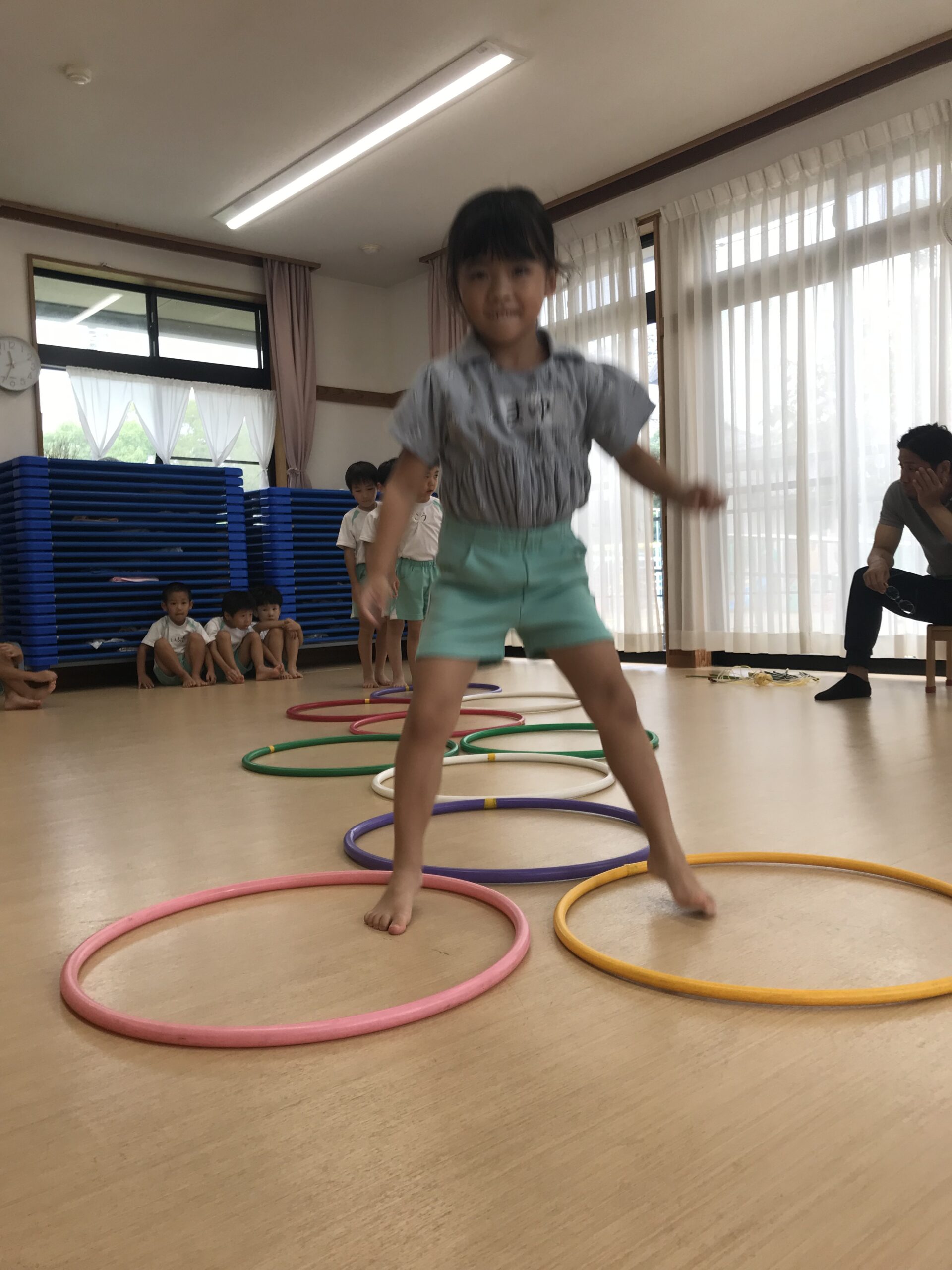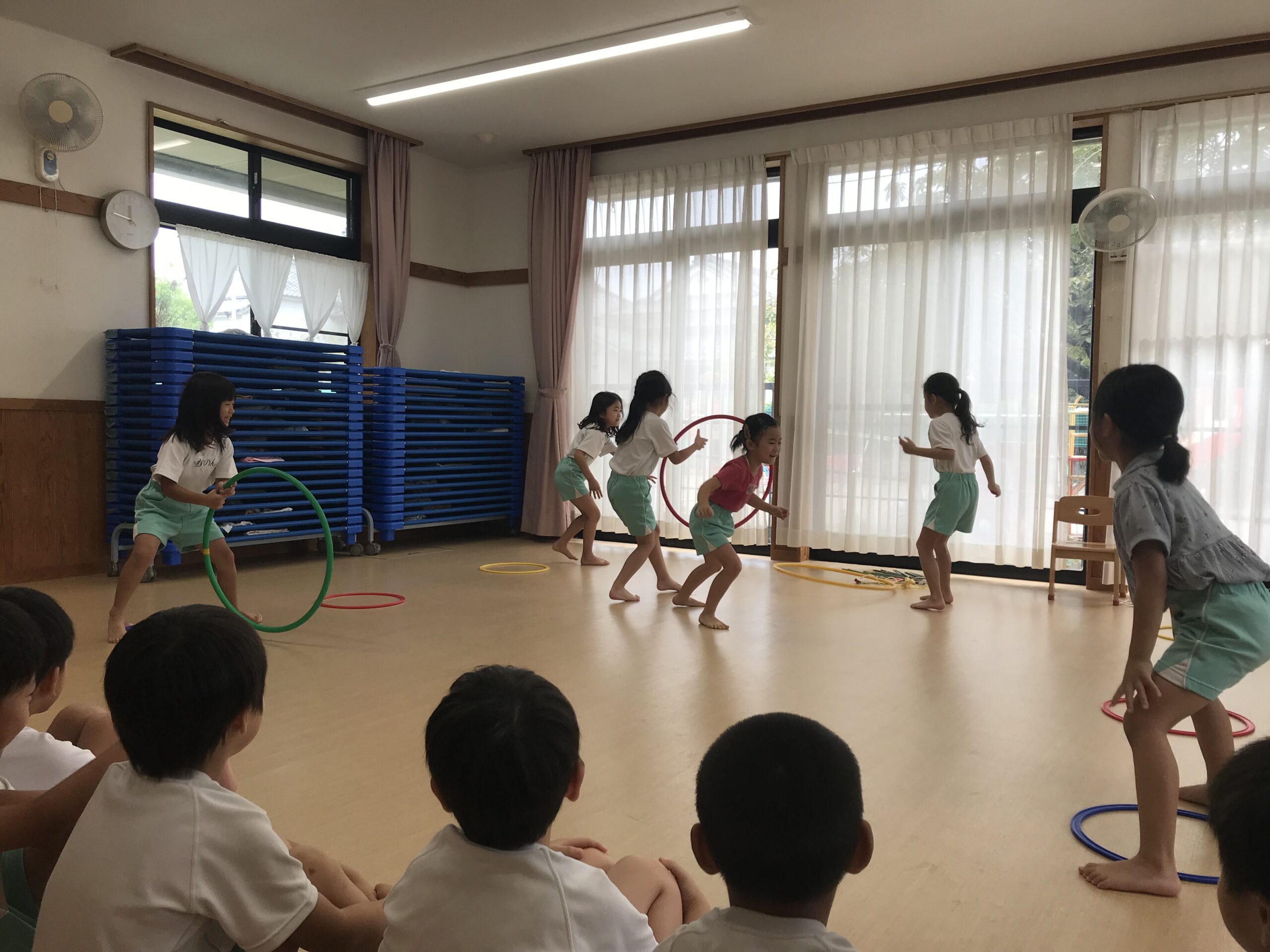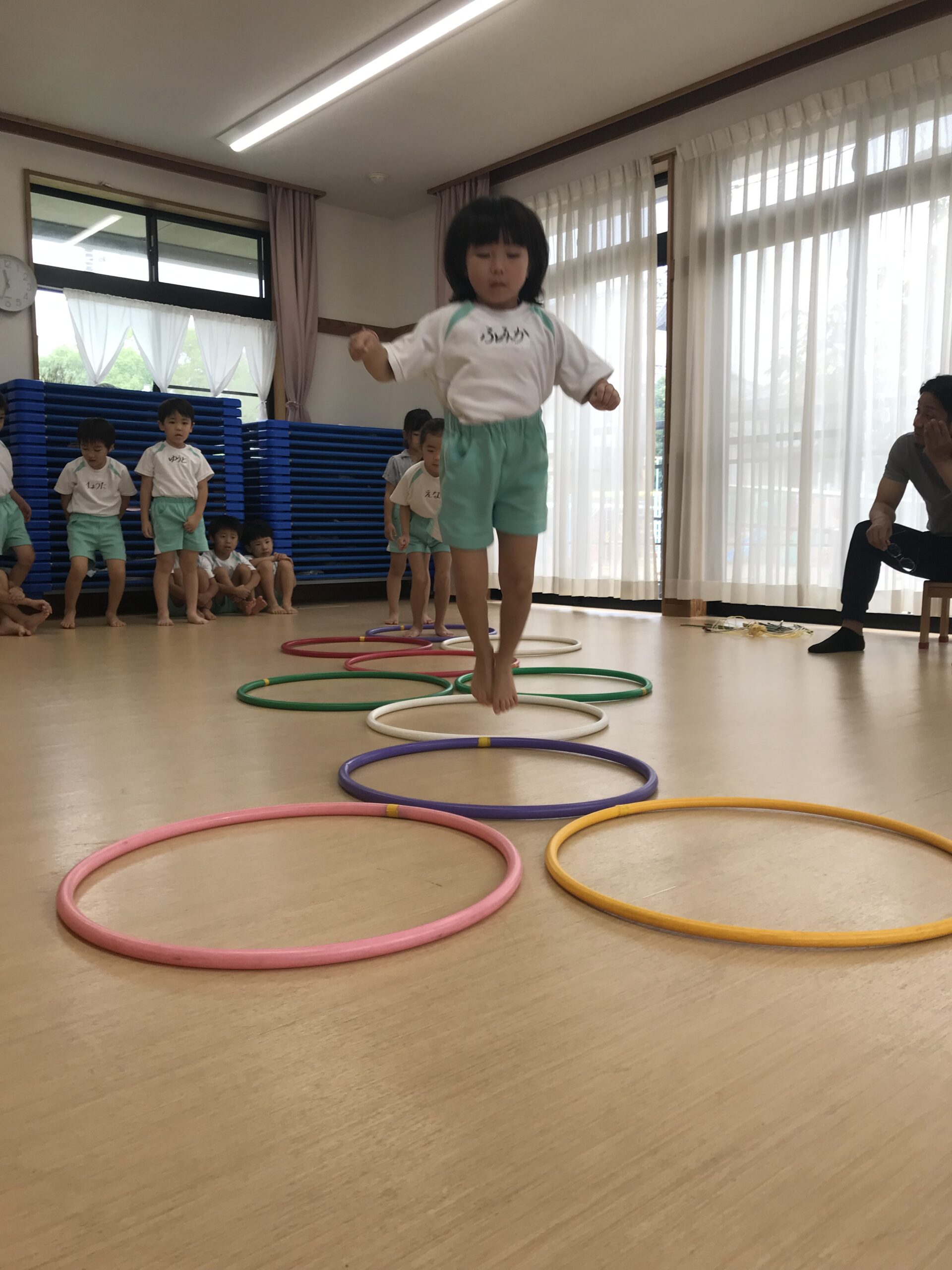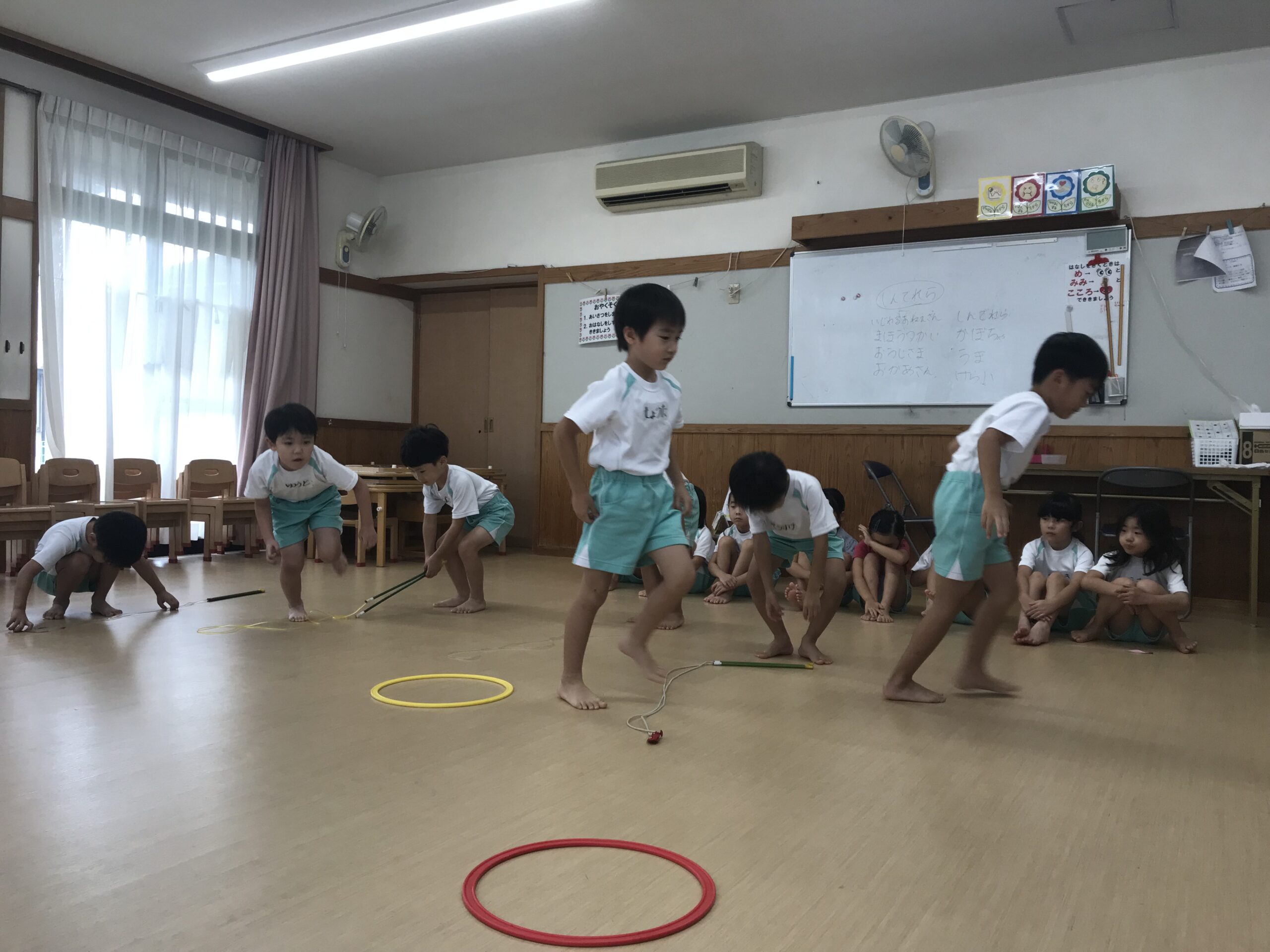 今日は体操教室がありました。縄跳びやフラフープで元気いっぱい体を動かしました。講師の先生のお話をしっかり聞きながら、縄跳びに挑戦する子ども達。跳び方のコツを教えてもらって上手に跳ぶことができました。「縄跳び楽しい!またしたい!」と意欲的に参加してくれました。フラフープ遊びでは地面にフラフープを並べてケンケンパをしたり、転がしてお友達にパスしたりと色々な遊びを教えてもらいました。みんな笑顔で楽しむ姿がありました。体を沢山動かして、沢山笑って楽しい時間を過ごすことができました。
