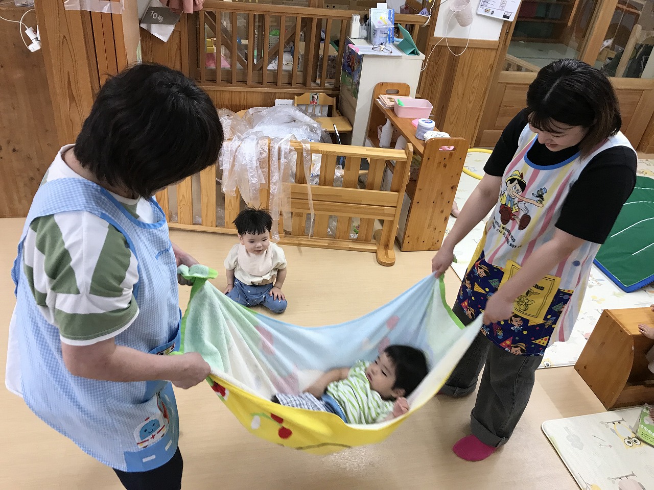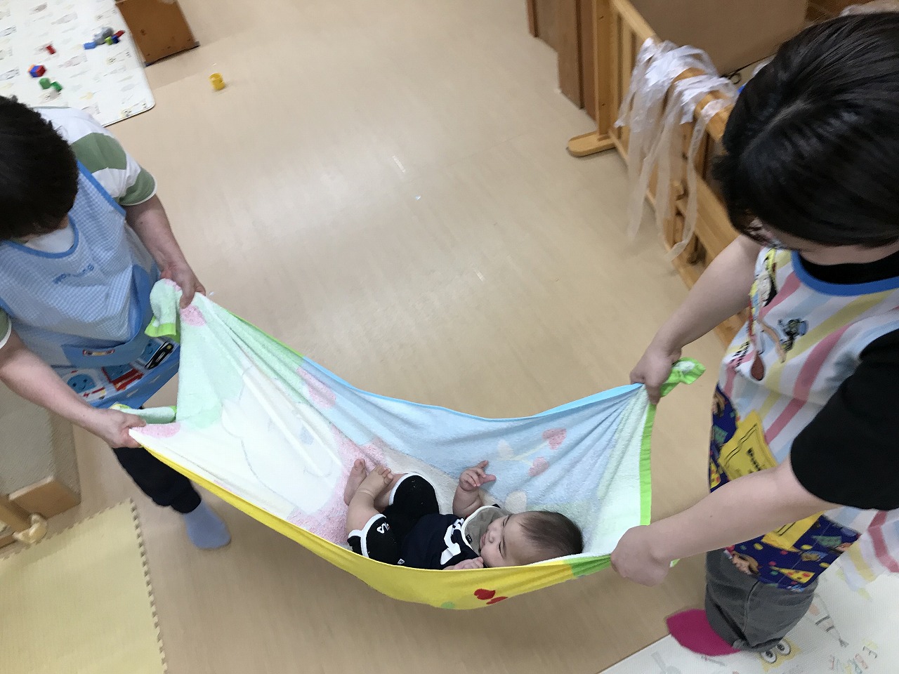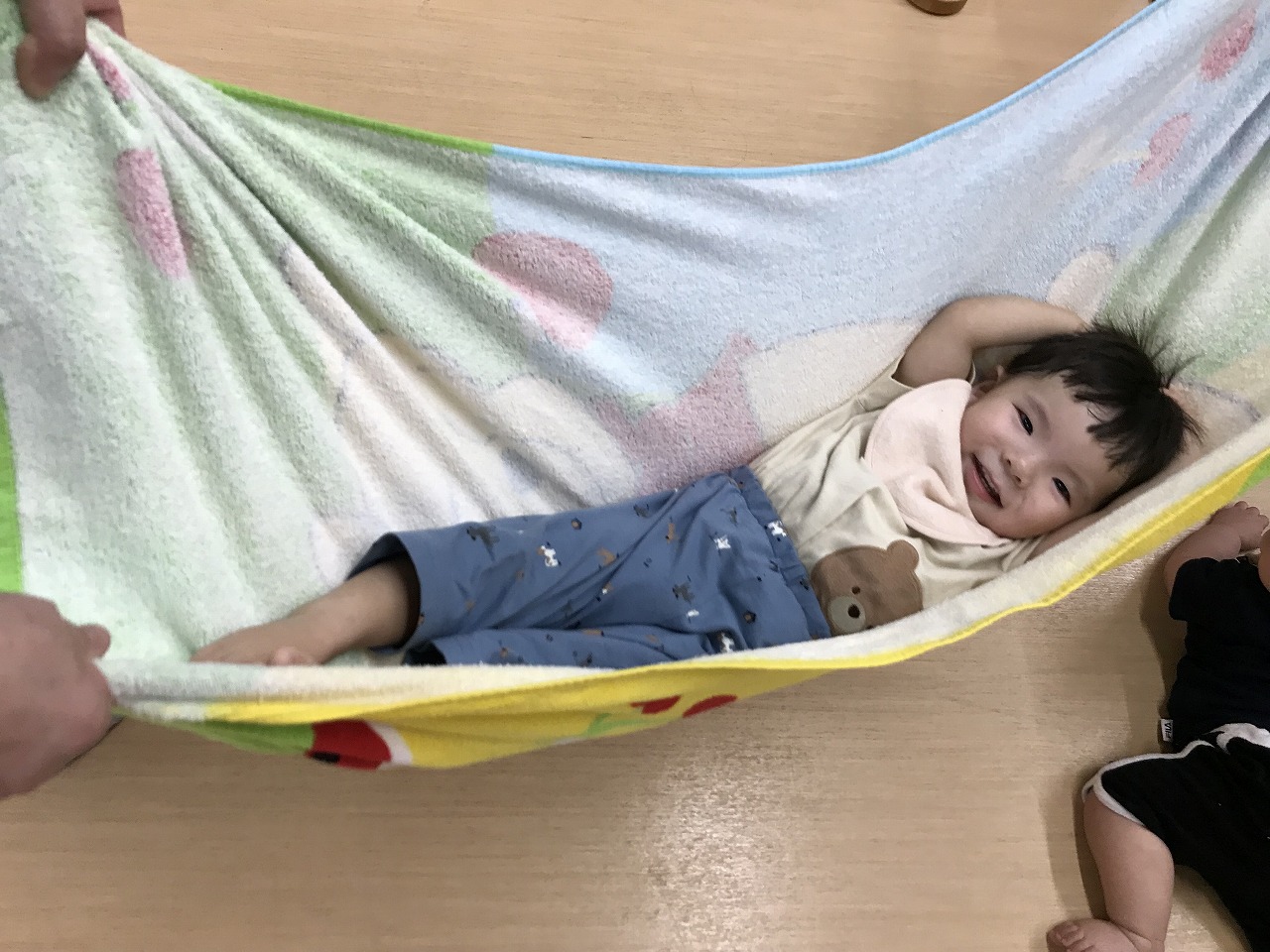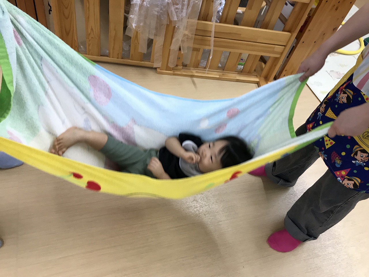 今日は、あいにくの雨だったので室内で身体をたくさん動かして遊びました。圧縮袋に風船を入れて風船ベットで遊んだり、マットのお山を登ったり、タオルをハンモックにしてゆらゆら~して遊びました。ハンモックでは、怖がるお友だちやゆらゆら揺られて気持ちよさそうにしていた子どもたちです。いっぱい遊んでお昼ご飯を食べてぐっすりお昼寝をしているひよこ組さんです♪