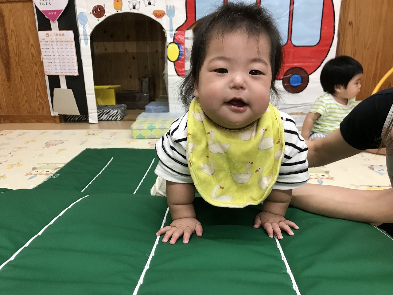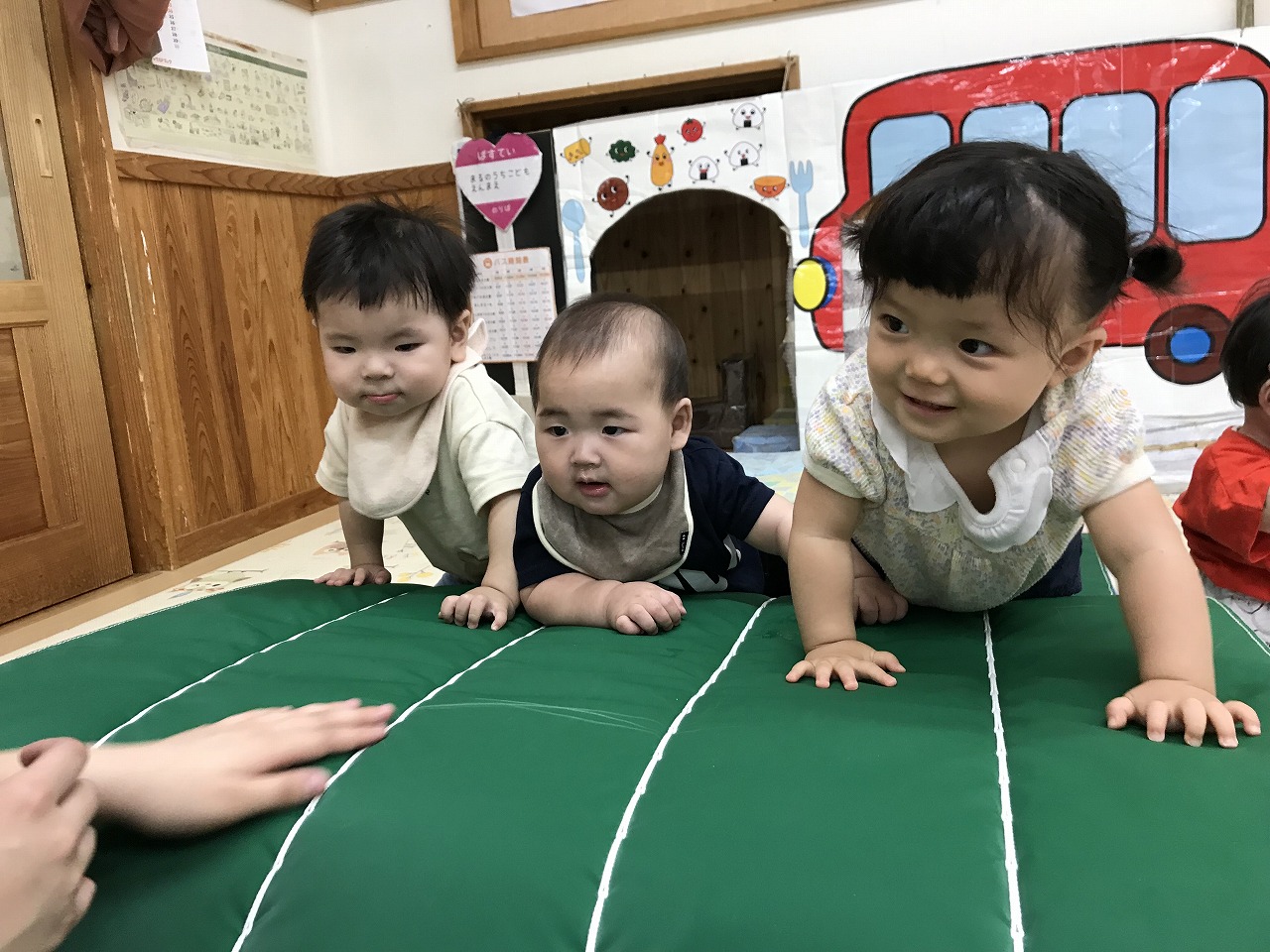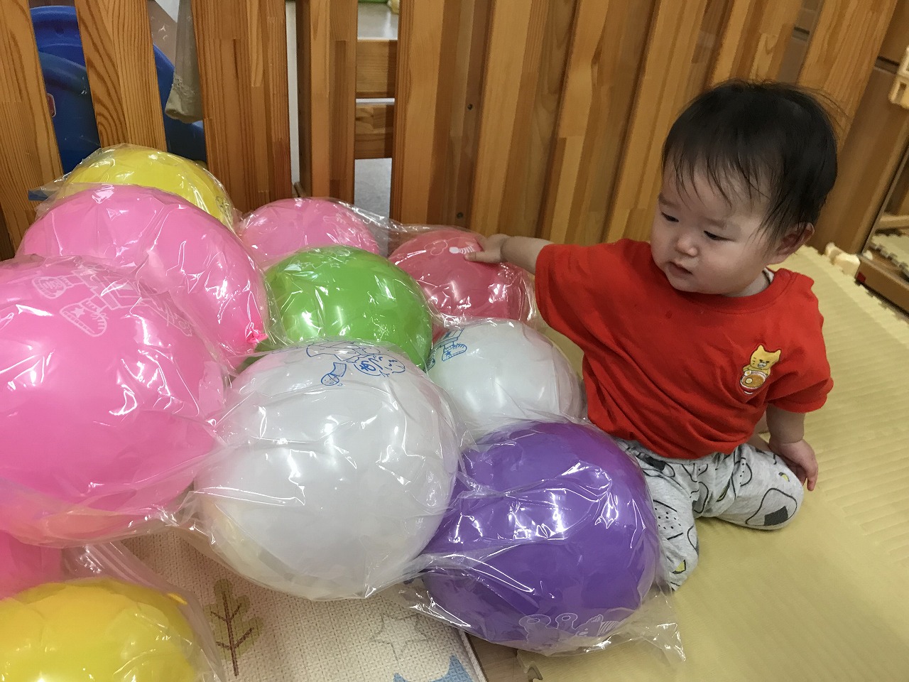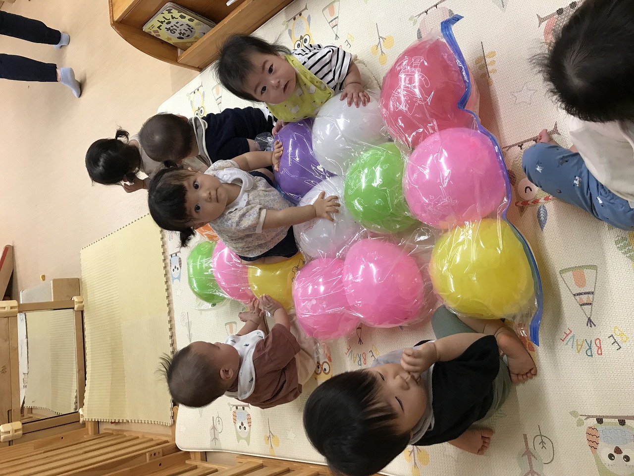 今日は、あいにくの雨だったので室内で身体をたくさん動かして遊びました。圧縮袋に風船を入れて風船ベットで遊んだり、マットのお山を登ったり、タオルをハンモックにしてゆらゆら~して遊びました。ハンモックでは、怖がるお友だちやゆらゆら揺られて気持ちよさそうにしていた子どもたちです。いっぱい遊んでお昼ご飯を食べてぐっすりお昼寝をしているひよこ組さんです♪