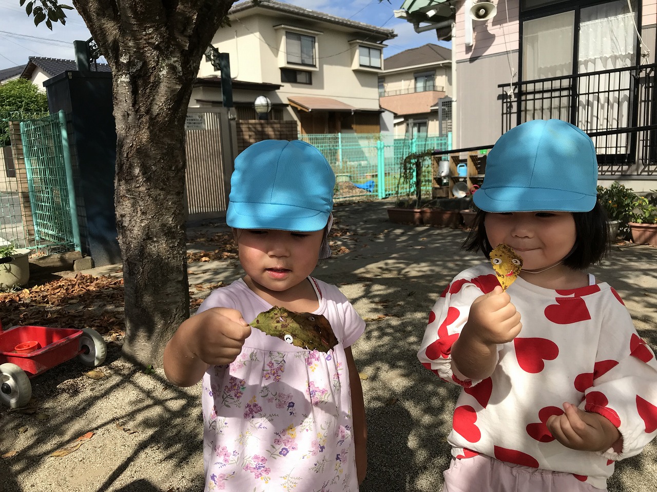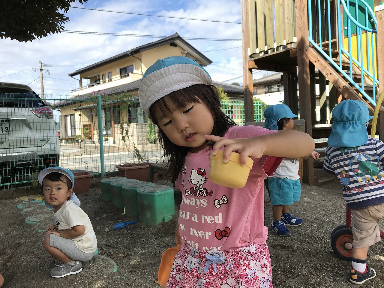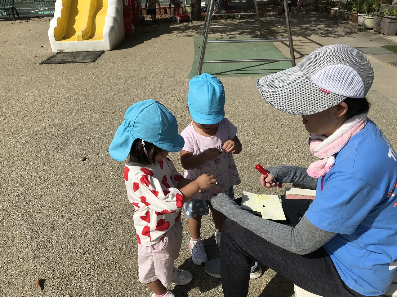 朝晩がだいぶ涼しくなり過ごしやすくなってきましたね!天気も良く涼しかったので、たんぽぽ組(2歳児)は朝早くから戸外で沢山遊びました。砂場でおままごとを楽しむ姿があり、「ケーキつくった!」「ただいま~おかえり~」などのやり取りも見られ、微笑ましく感じます。「〇〇くん、いっしょにむしさがそう!」と友だちを誘い合って遊びを楽しむ姿も多く見られるようになってきました。園庭に落ち葉が落ちていたので、保育士等がシールの準備をしていると、興味がある子は「せんせー、なんしよん?シール?」と興味や関心が高まって、落ち葉に目や口のシールを貼って、可愛いお顔を作っていました。「わらったかお~!おこったかお~!」と嬉しそうに見せてくれました☆日中は少しずつ日差しも出てきて、汗をかいてたっぷりと遊んだので、着替えや温かいシャワーをしています。