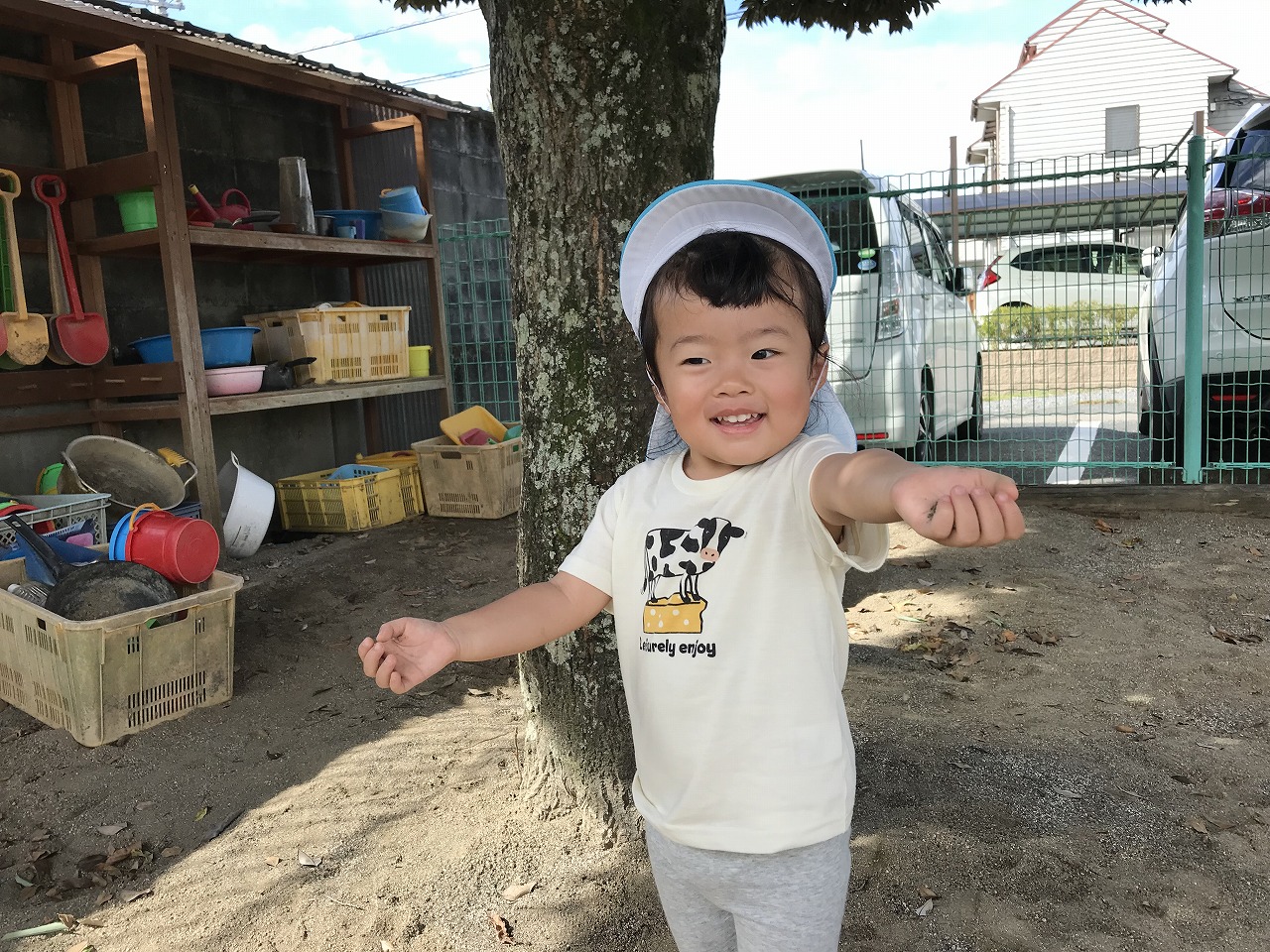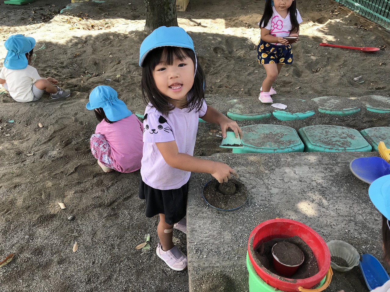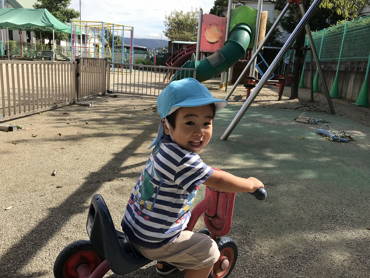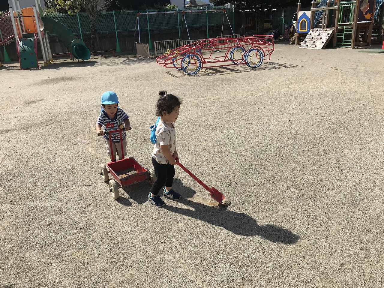 朝晩がだいぶ涼しくなり過ごしやすくなってきましたね!天気も良く涼しかったので、たんぽぽ組(2歳児)は朝早くから戸外で沢山遊びました。砂場でおままごとを楽しむ姿があり、「ケーキつくった!」「ただいま~おかえり~」などのやり取りも見られ、微笑ましく感じます。「〇〇くん、いっしょにむしさがそう!」と友だちを誘い合って遊びを楽しむ姿も多く見られるようになってきました。園庭に落ち葉が落ちていたので、保育士等がシールの準備をしていると、興味がある子は「せんせー、なんしよん?シール?」と興味や関心が高まって、落ち葉に目や口のシールを貼って、可愛いお顔を作っていました。「わらったかお~!おこったかお~!」と嬉しそうに見せてくれました☆日中は少しずつ日差しも出てきて、汗をかいてたっぷりと遊んだので、着替えや温かいシャワーをしています。