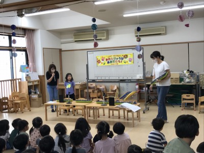 かえるのうたはもも組さんが代表で先生と輪唱してくれました。ちょっぴり緊張していましたが上手に弾くことが出来ていました。