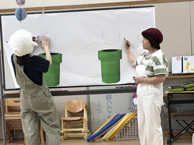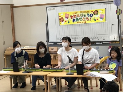 先生からの出し物は、もも組が発表会で披露する「かえるのうた」「ちゅうりっぷ」の演奏を行いました。
