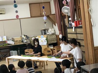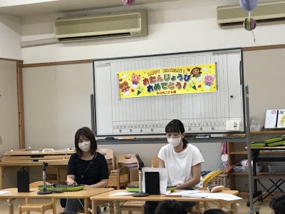 9月生まれのお友だちは前に出てインタビューに答えてくれました。好きな動物や食べ物、遊びを教えてくれましよ。