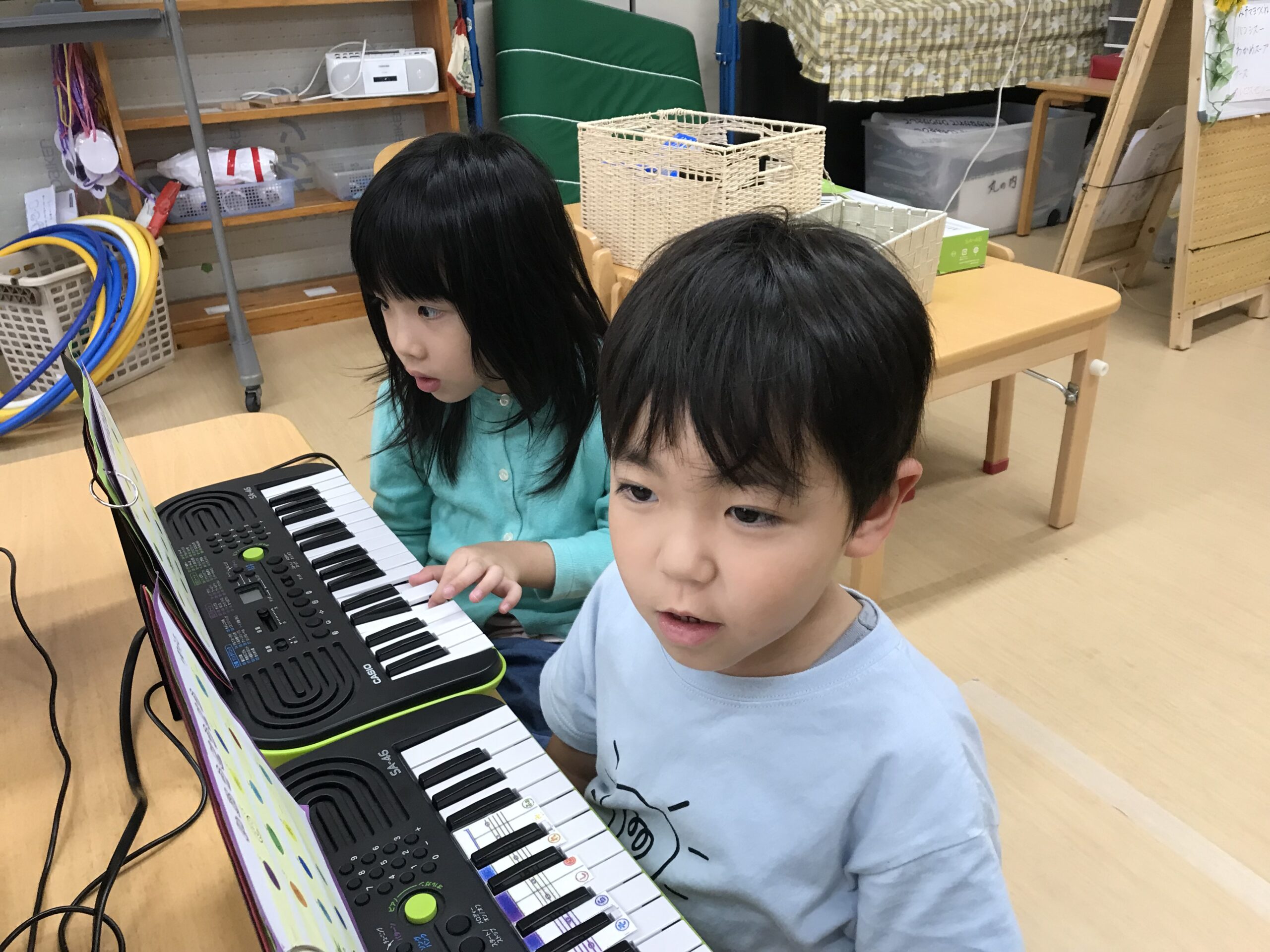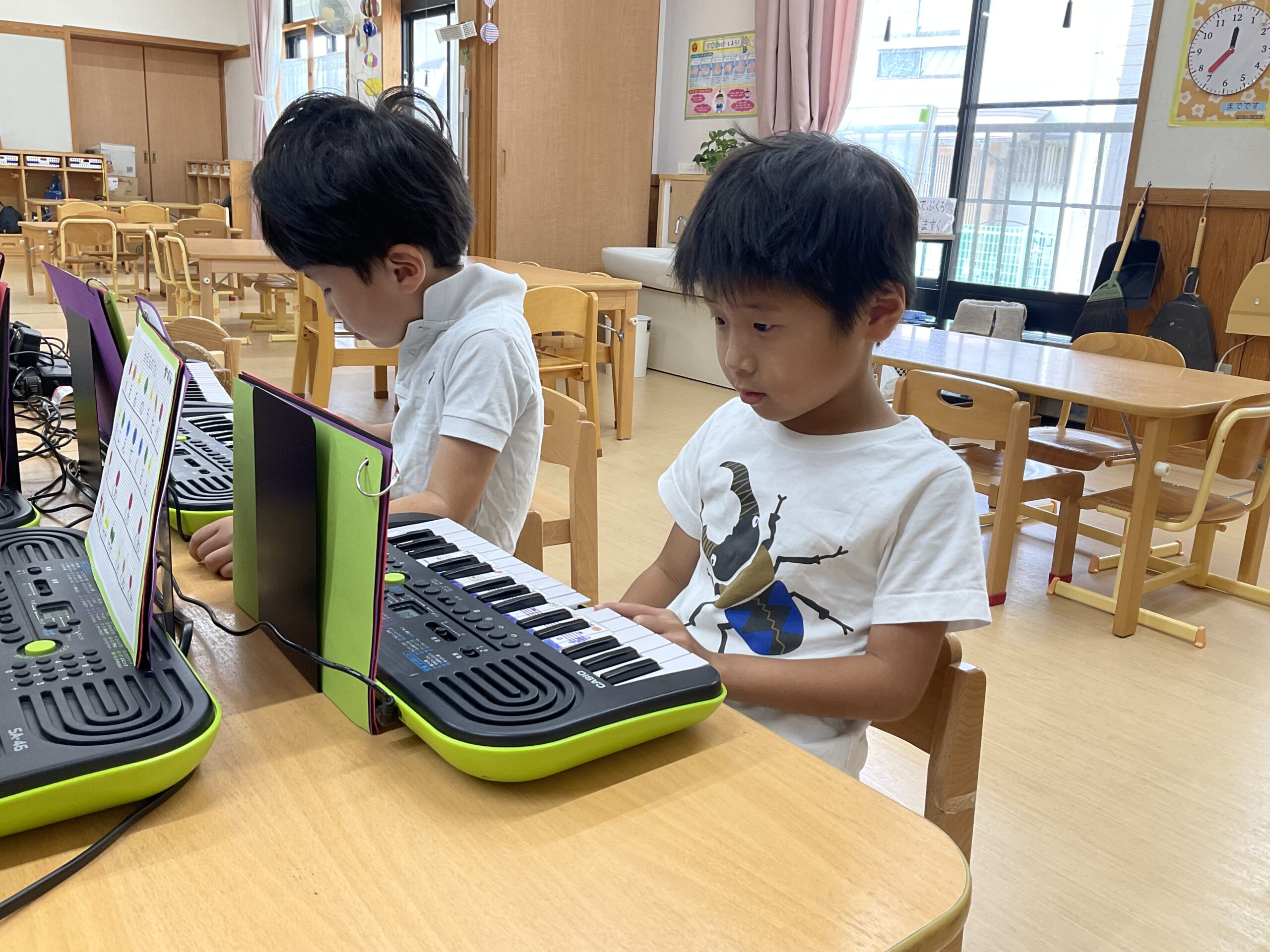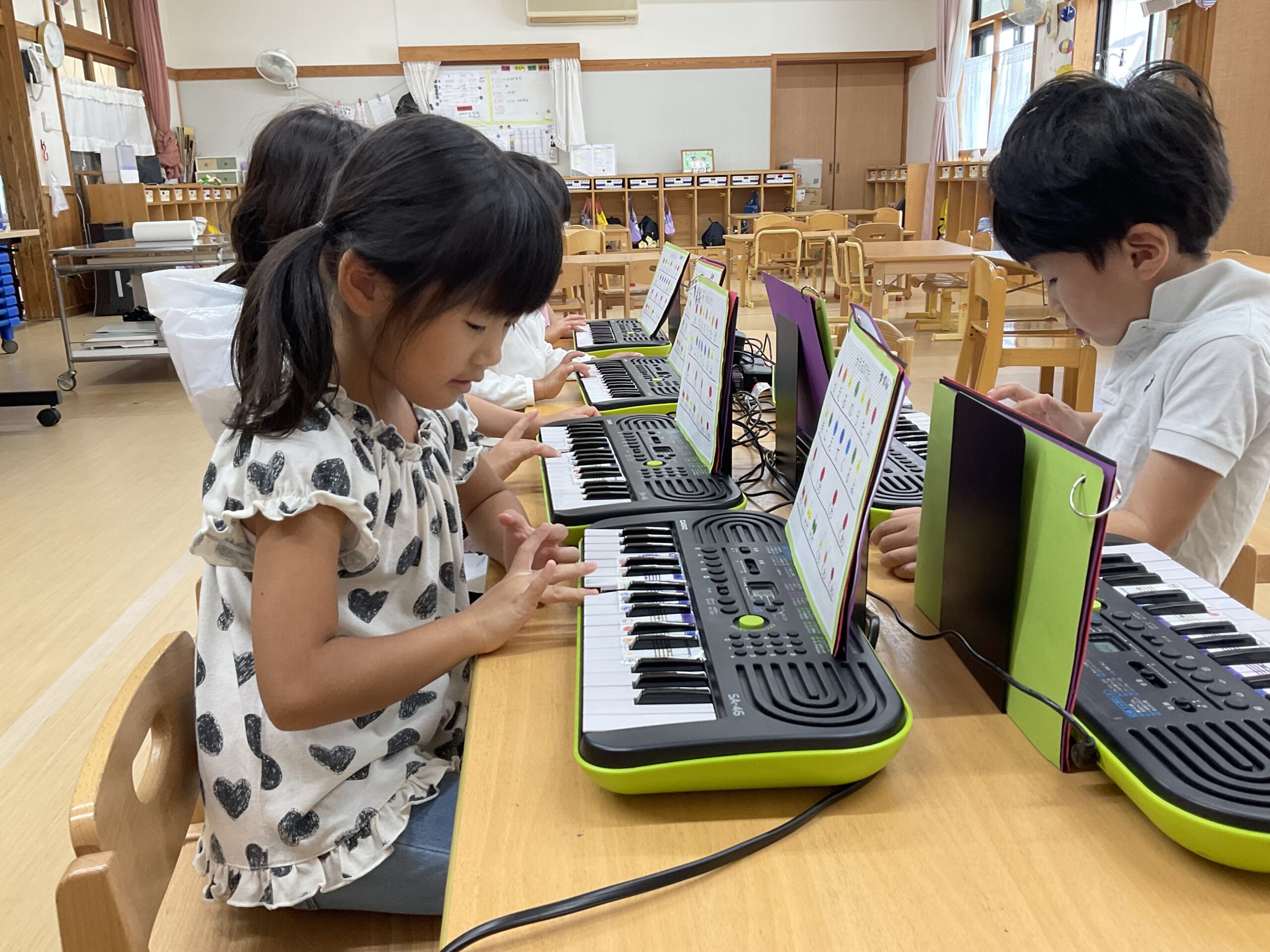 もも組(5歳児)は発表会で演奏するピアノの練習が始まりました。指番号のお約束をしっかりと聞いて「ドレミファソ」が上手に弾けるようになっています。音階を知り、指番号と一致させることが難しいですが、毎日練習に取り組んでいく中で上達していっています。楽譜を見ながら色んな曲を演奏していると“もっと上手になりたい!”と自主的に練習に頑張る姿もよく見られるようになりました。難しい指使いの部分は、出来るようになった友だちが先生になり、教えてくれています。友達数人と一緒に合わせてみたり、歌に合わせて弾いてみたり、楽しく音楽にも親しみながら練習に取り組んでいるもも組さんです。