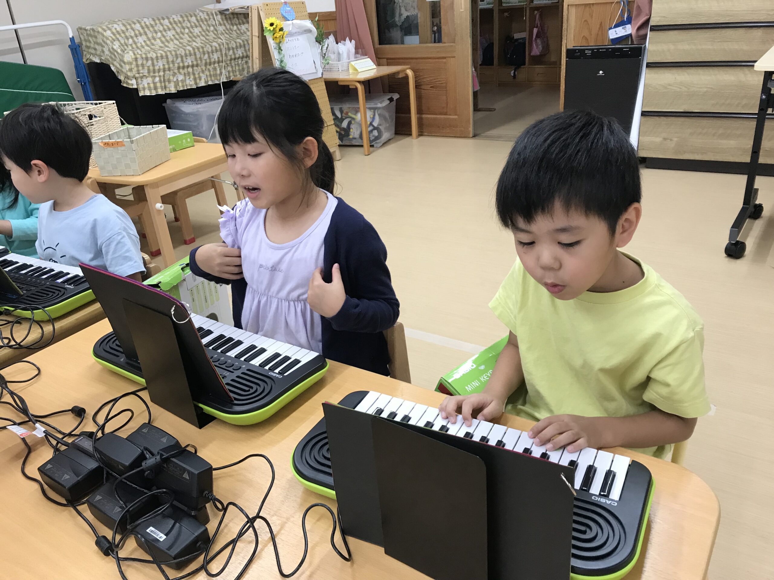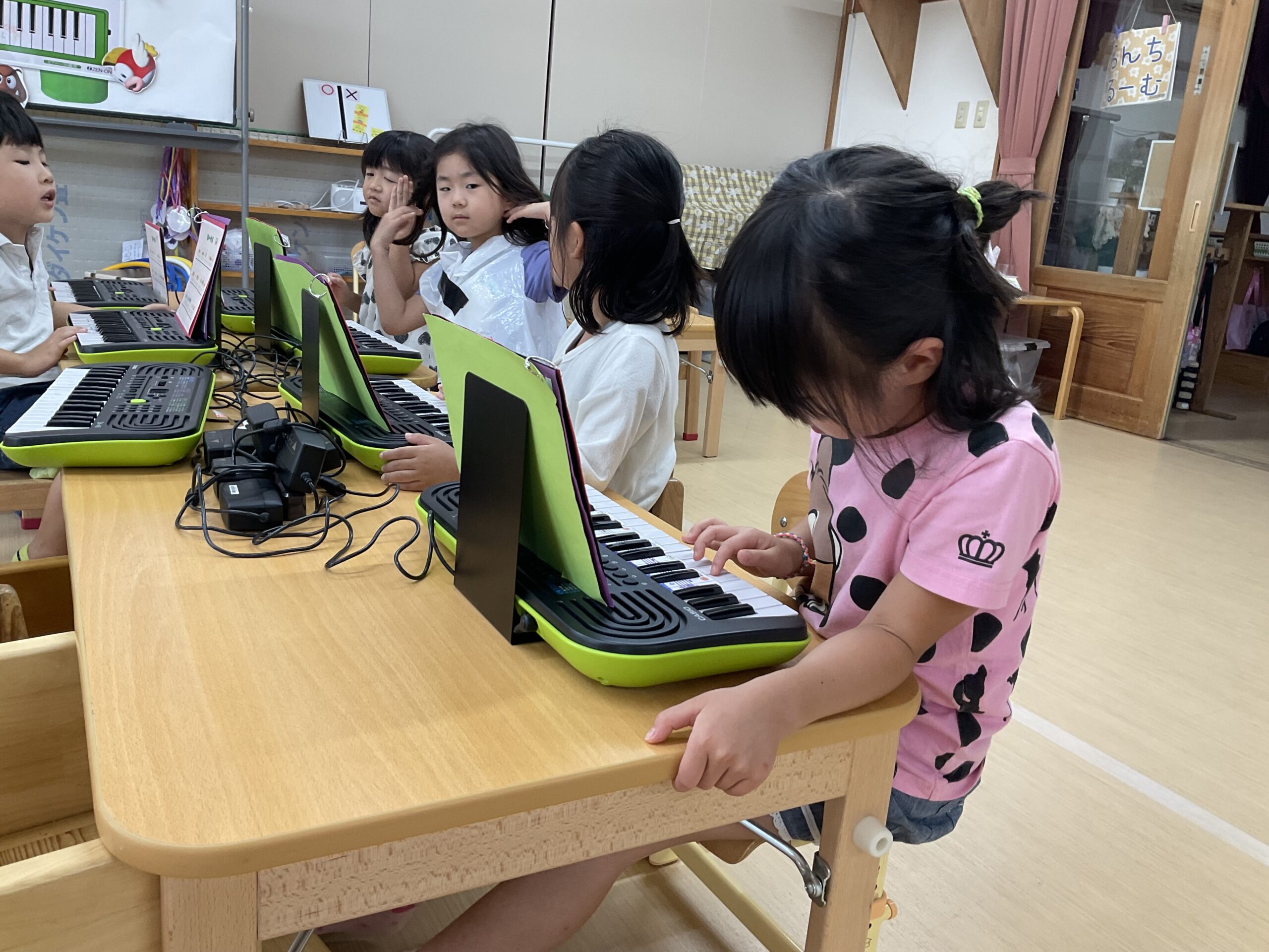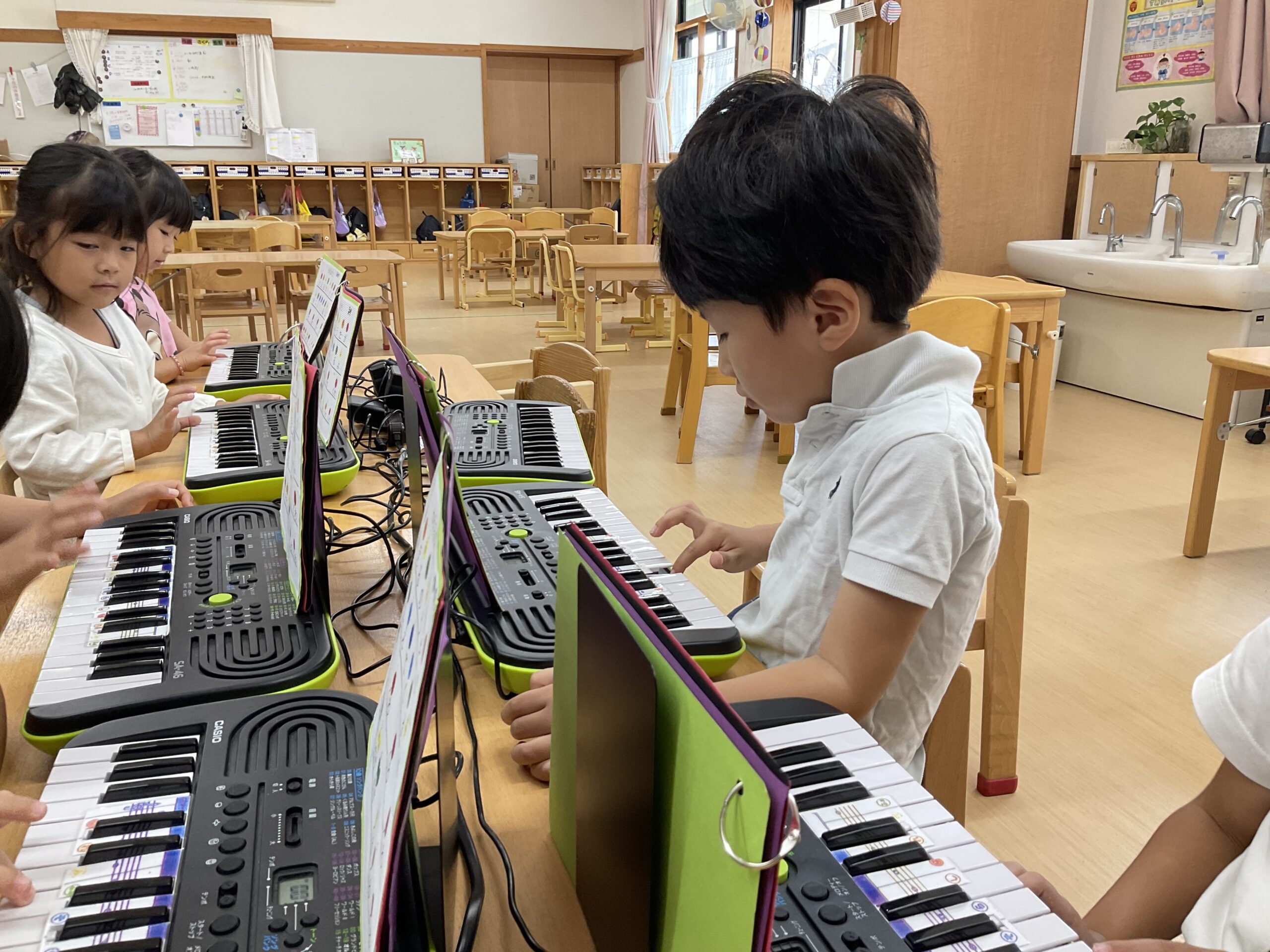 もも組(5歳児)は発表会で演奏するピアノの練習が始まりました。指番号のお約束をしっかりと聞いて「ドレミファソ」が上手に弾けるようになっています。音階を知り、指番号と一致させることが難しいですが、毎日練習に取り組んでいく中で上達していっています。楽譜を見ながら色んな曲を演奏していると“もっと上手になりたい!”と自主的に練習に頑張る姿もよく見られるようになりました。難しい指使いの部分は、出来るようになった友だちが先生になり、教えてくれています。友達数人と一緒に合わせてみたり、歌に合わせて弾いてみたり、楽しく音楽にも親しみながら練習に取り組んでいるもも組さんです。