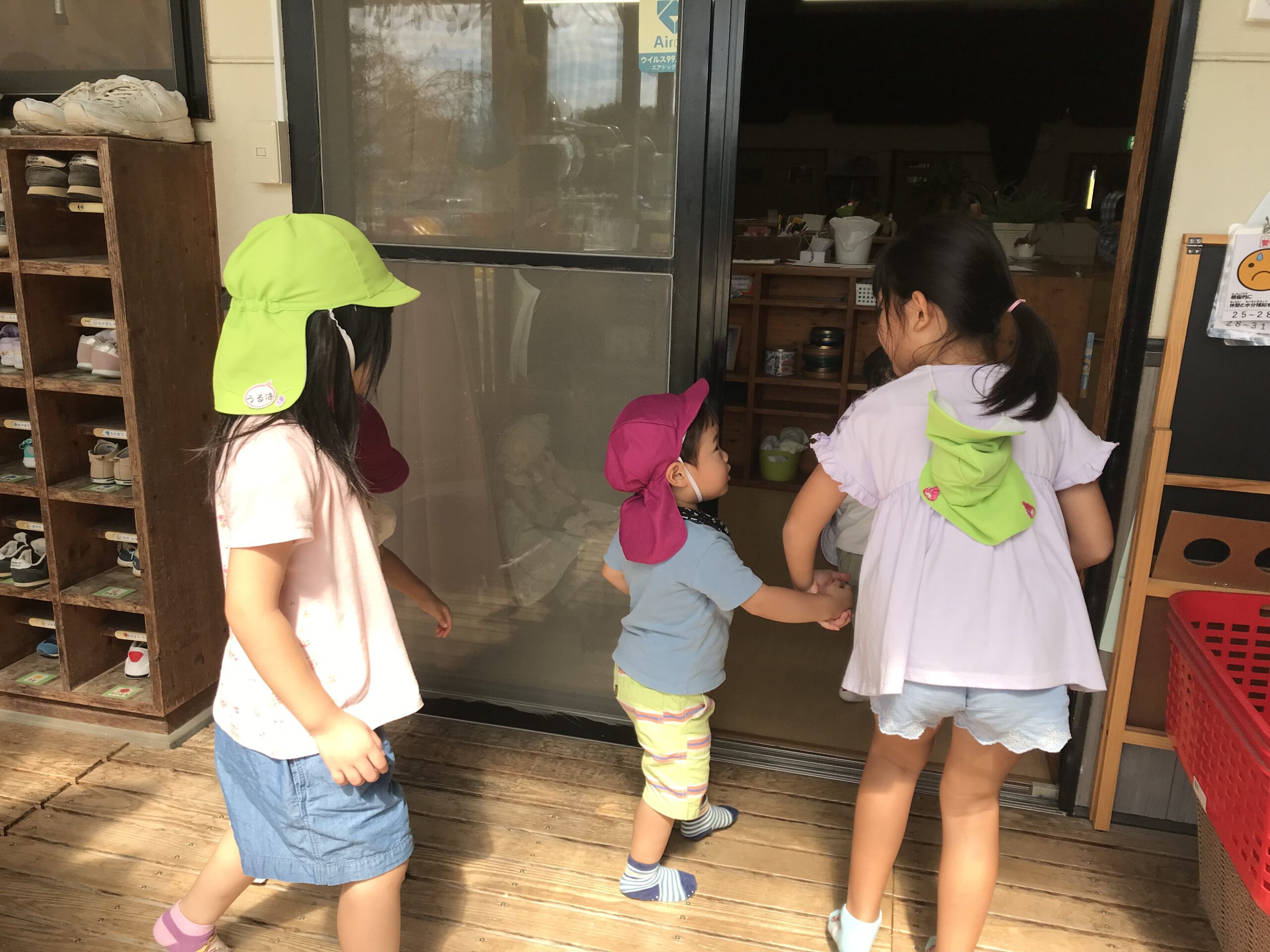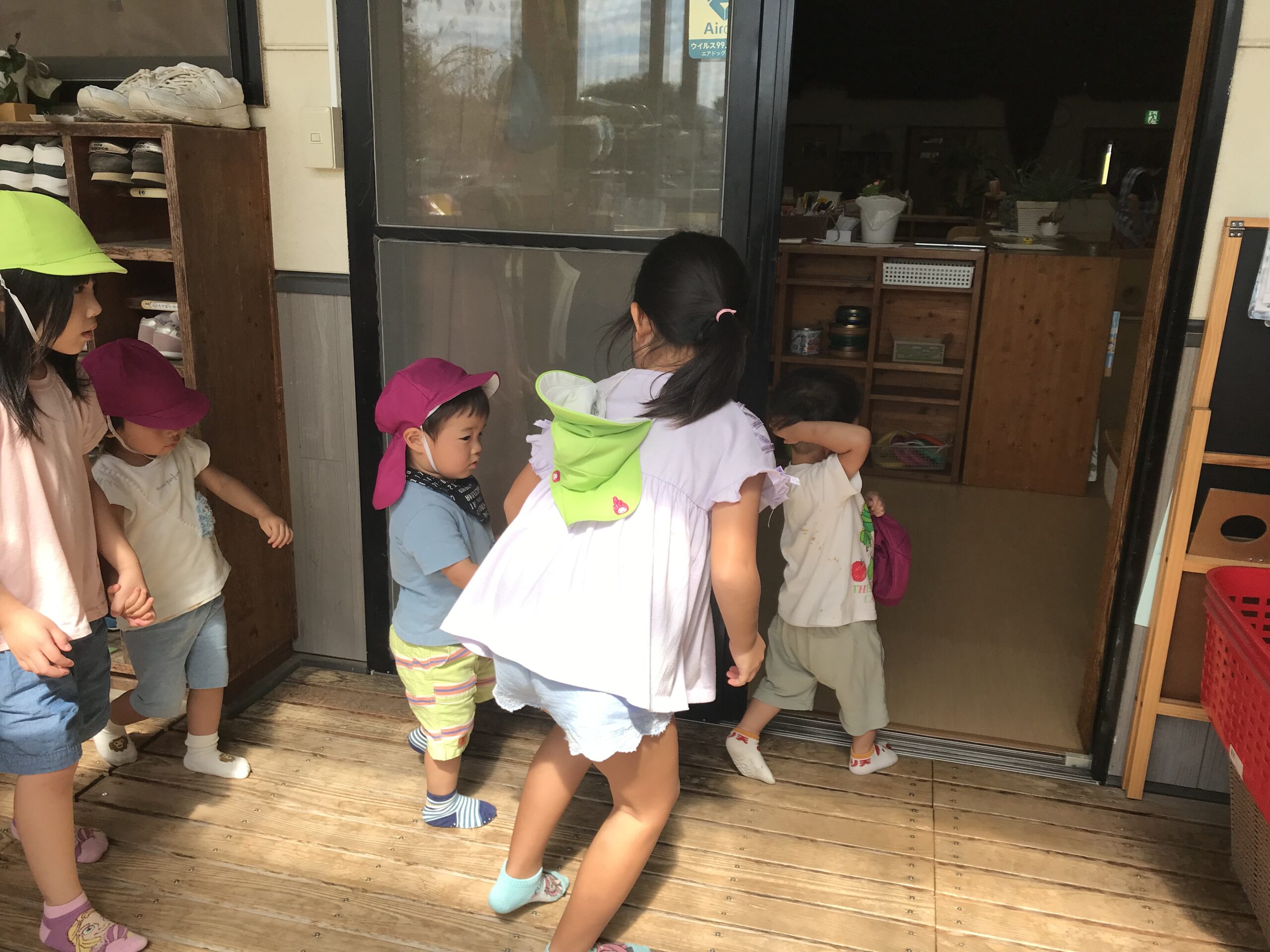 戸外遊びの時間、すみれ組(1歳児)さんがお部屋に戻る時に、近くで遊んでいたもも組さんが靴を脱がせてあげたり、手を繋いで連れて行ってあげたり保育士のお手伝いをしてくれました。異年齢の関わりの中で自然と優しい年上の子らしい姿がたくさん見られます。みんなのお姉さん、お兄さんとなって頼りがいのあるもも組さんです。お手伝いしてくれてありがとう★