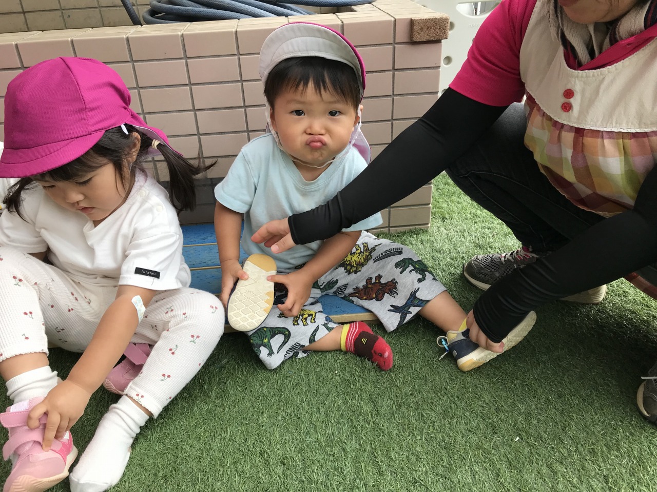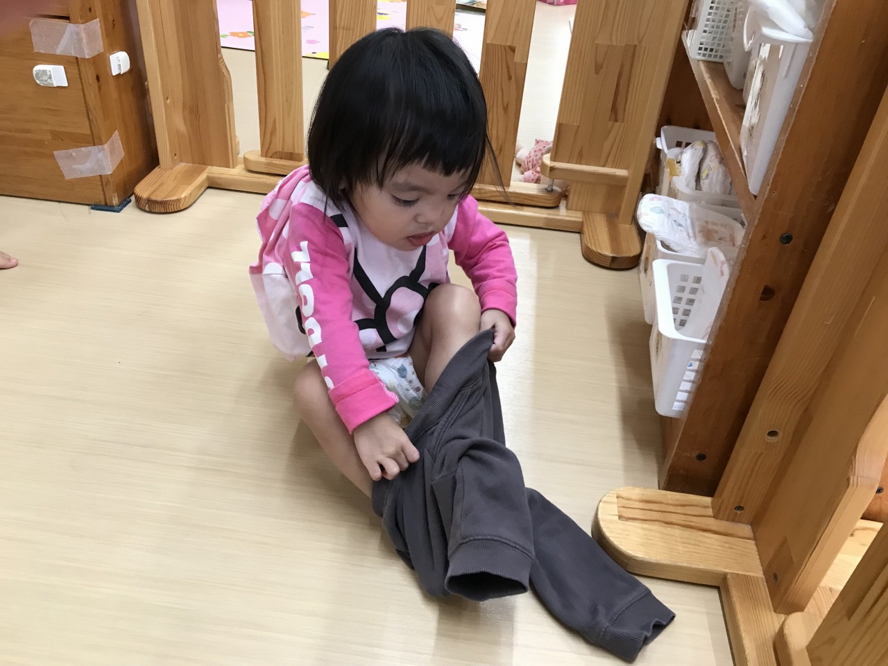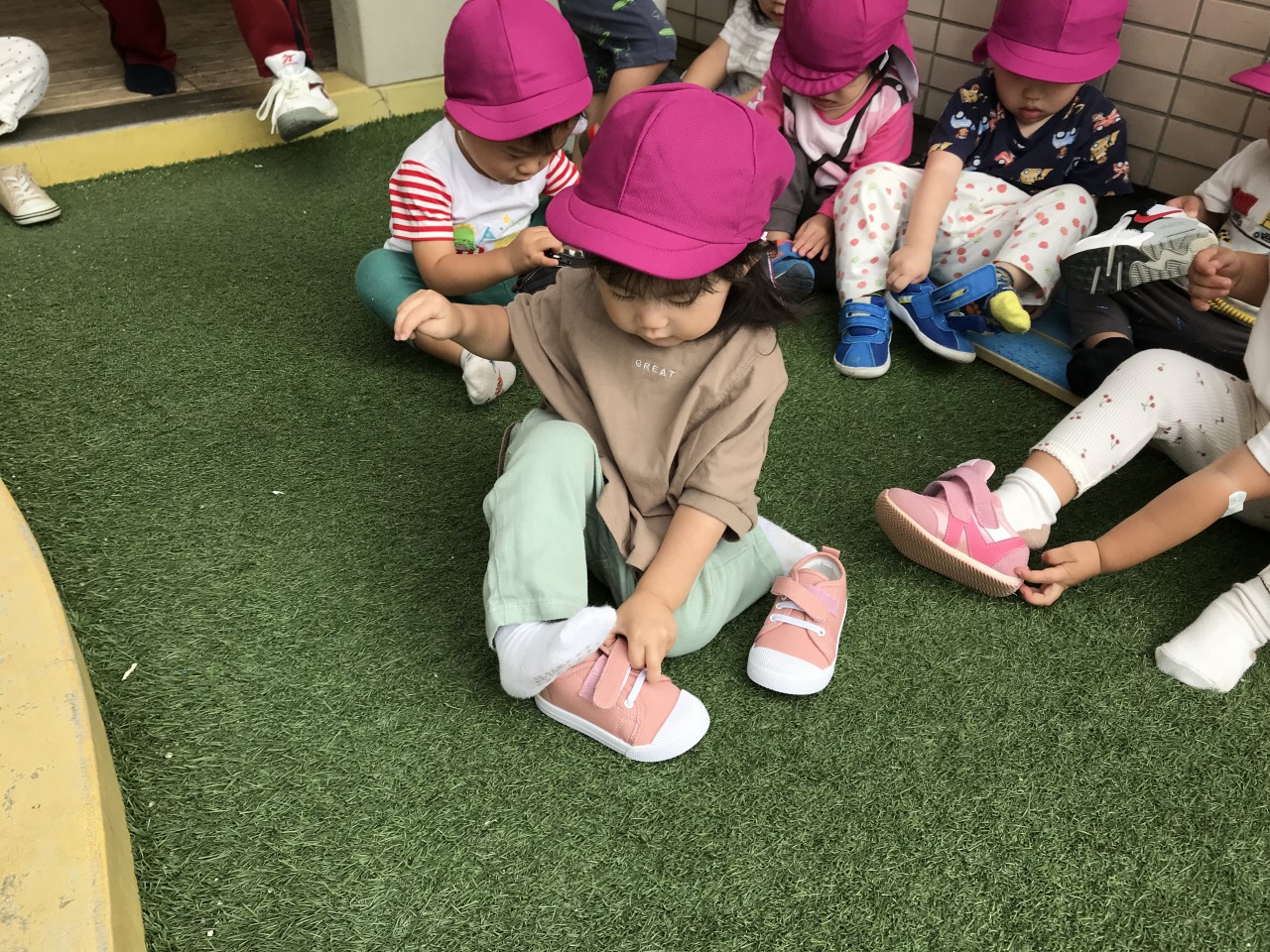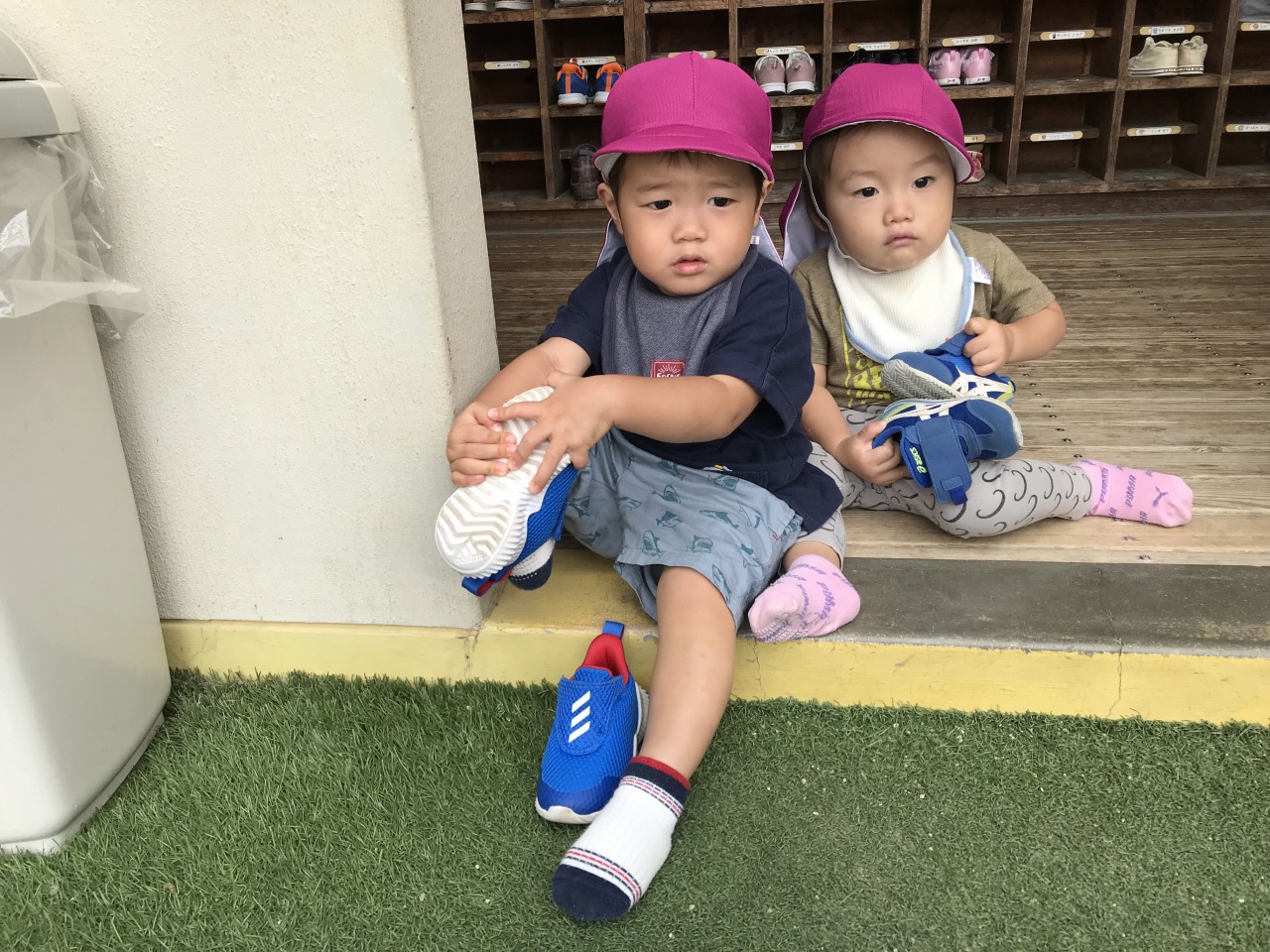 心地良い気候の中、すみれ組(1歳児)は戸外遊びを楽しみました。お外に出る前にはトイレに行ったり、靴下をはいたり帽子をかぶったりと色々な準備があります。今まで保育士にしてもらうことが多かったすみれ組さんですが、自分のマークや場所を覚えてそこから取ってくることができるようになり、自分でやってみようとする姿が見られるようになりました。ズボンに足を通したり、靴下や靴を持って足を入れたりすることはなかなか難しいことですが、上手く身体のバランスをとったり手先を上手に使って自分で頑張っています。できない時には「して」と言ったり、できないということをアピールして教えてくれます。そんな時には、「こやってみるとできそうだよ」と仕方を伝えたり「自分で頑張ってはいてみようとしたんだね」など子ども達の頑張りをたくさん褒めて次も頑張ってみようと思えるような関わりをしています。できたときにはとっても嬉しそうに「できたよ」と教えてくれます。これからも様々な場面で子ども達のやってみようとする気持ちの芽をのばしていきたいです。準備が完了すると、元気いっぱいに園庭へ駈け出していきました。