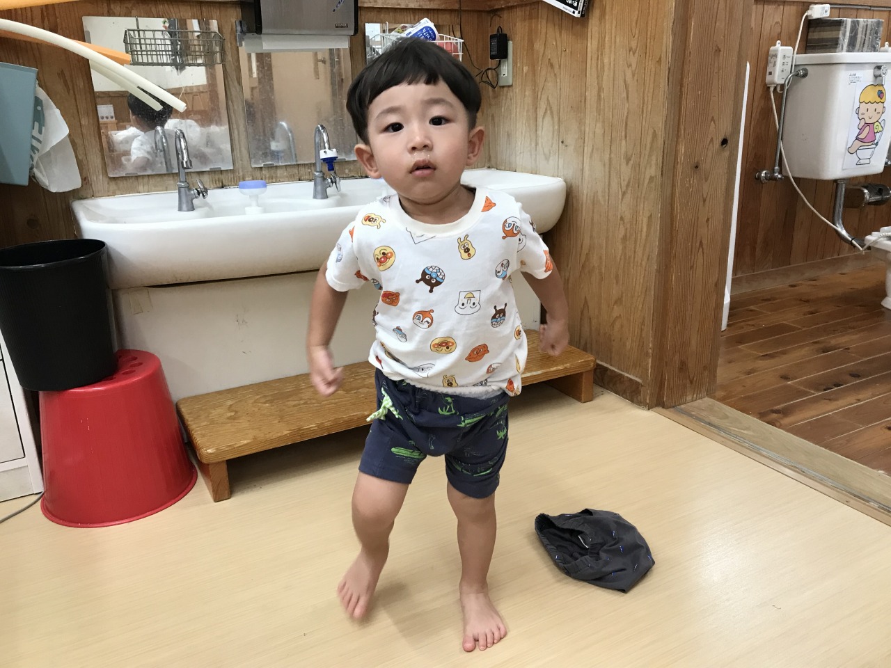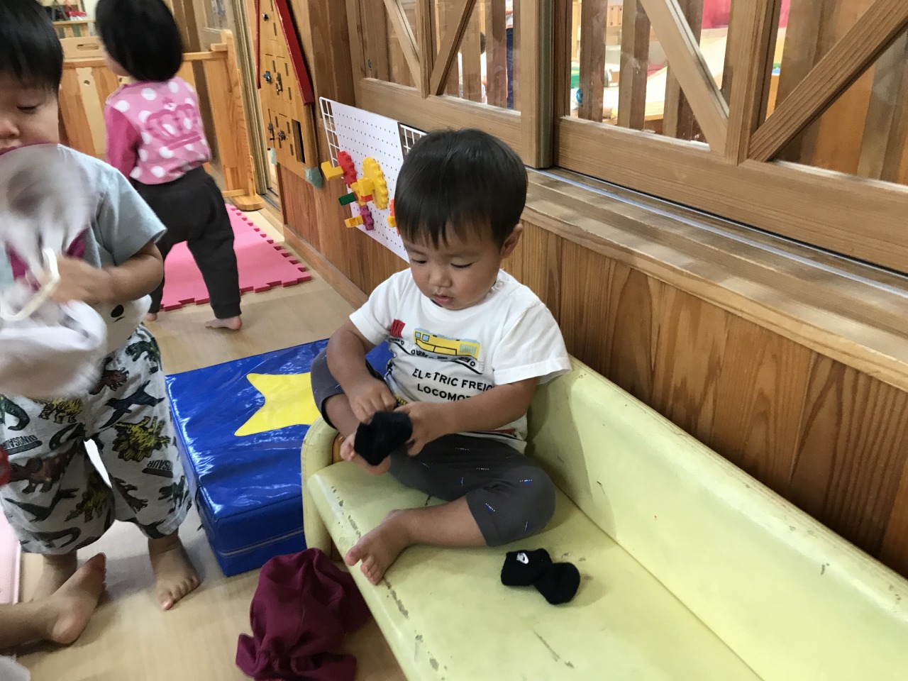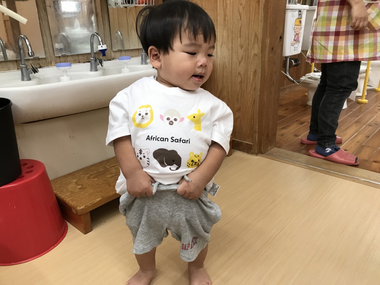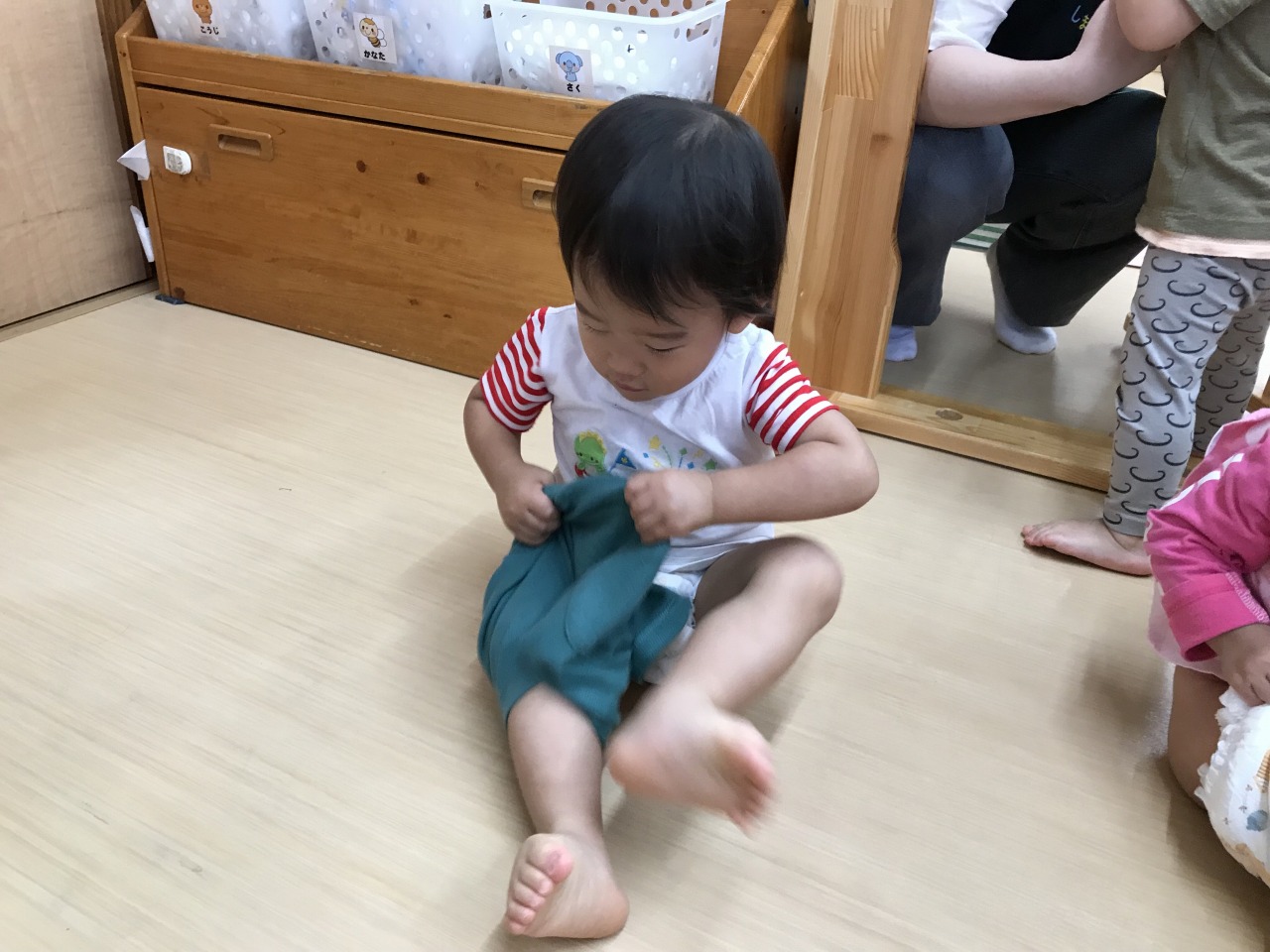 心地良い気候の中、すみれ組(1歳児)は戸外遊びを楽しみました。お外に出る前にはトイレに行ったり、靴下をはいたり帽子をかぶったりと色々な準備があります。今まで保育士にしてもらうことが多かったすみれ組さんですが、自分のマークや場所を覚えてそこから取ってくることができるようになり、自分でやってみようとする姿が見られるようになりました。ズボンに足を通したり、靴下や靴を持って足を入れたりすることはなかなか難しいことですが、上手く身体のバランスをとったり手先を上手に使って自分で頑張っています。できない時には「して」と言ったり、できないということをアピールして教えてくれます。そんな時には、「こやってみるとできそうだよ」と仕方を伝えたり「自分で頑張ってはいてみようとしたんだね」など子ども達の頑張りをたくさん褒めて次も頑張ってみようと思えるような関わりをしています。できたときにはとっても嬉しそうに「できたよ」と教えてくれます。これからも様々な場面で子ども達のやってみようとする気持ちの芽をのばしていきたいです。準備が完了すると、元気いっぱいに園庭へ駈け出していきました。