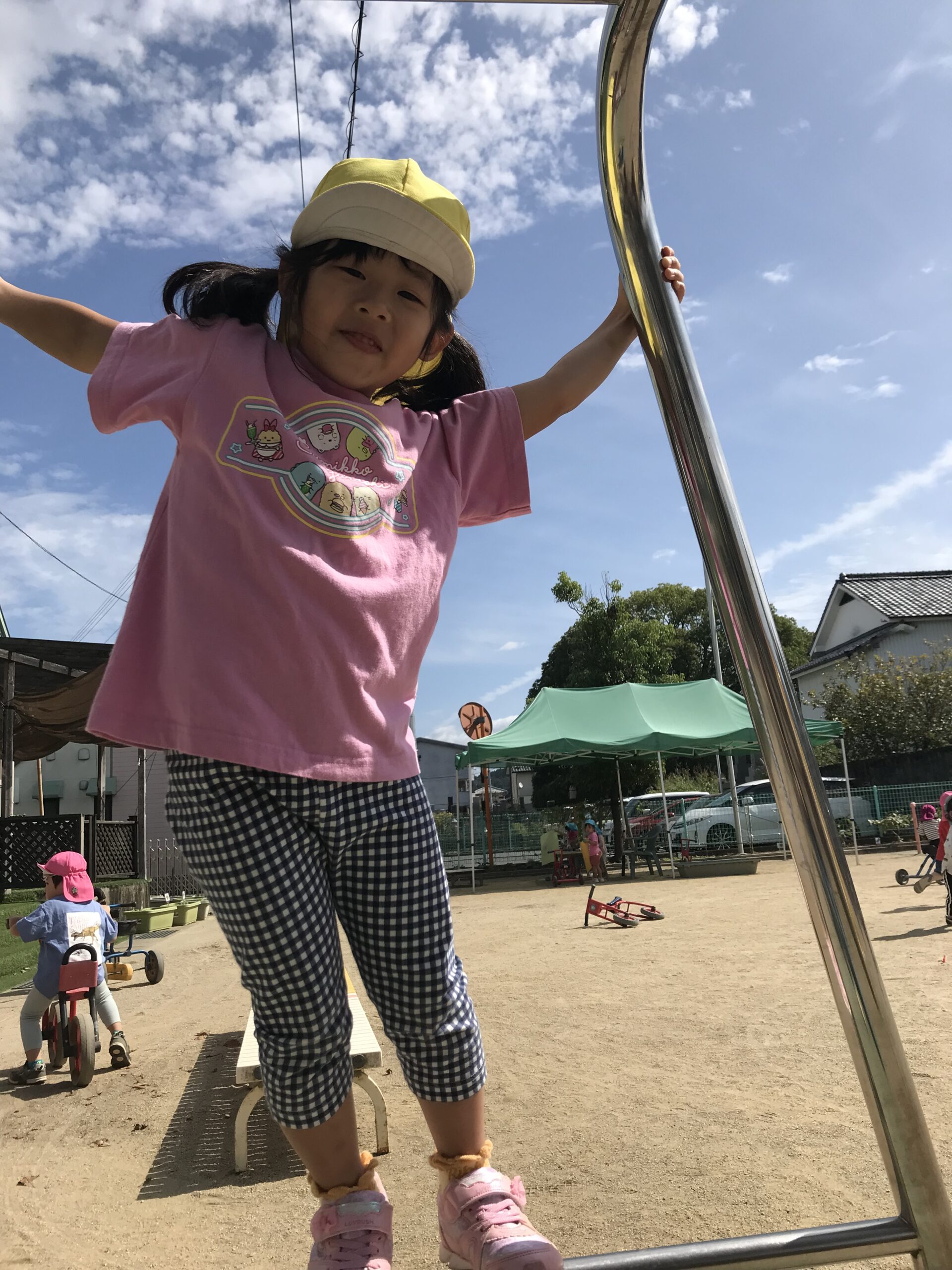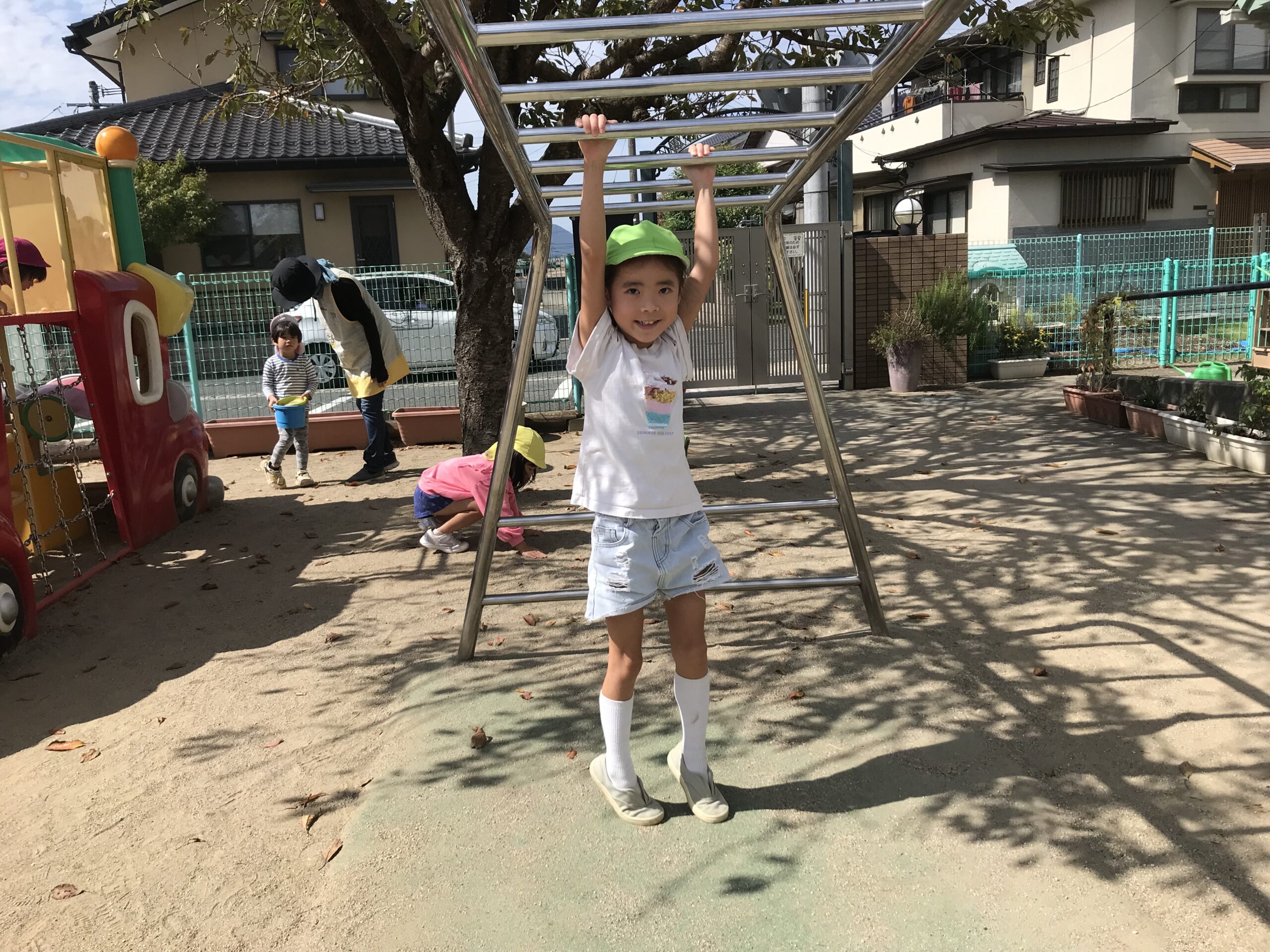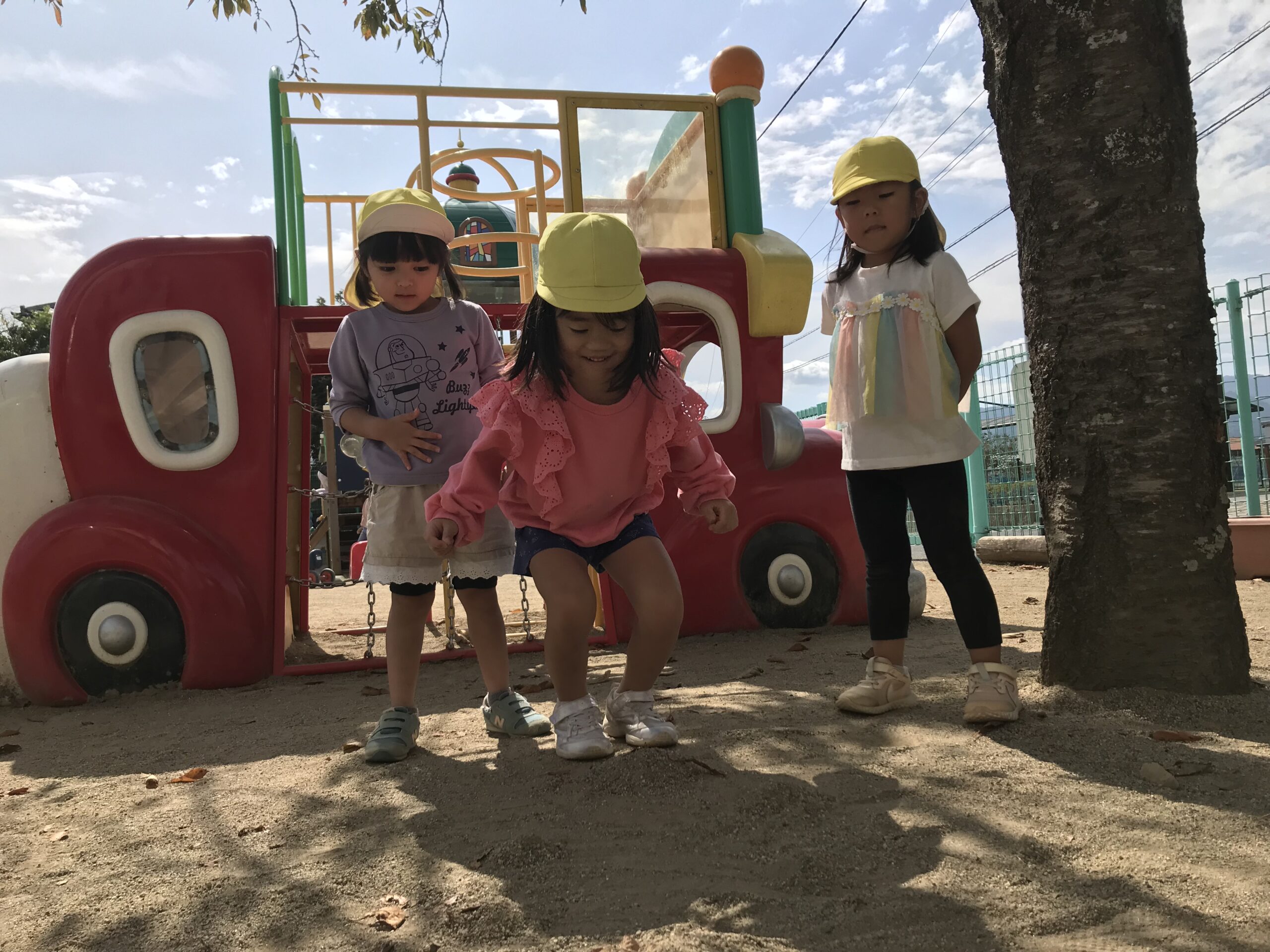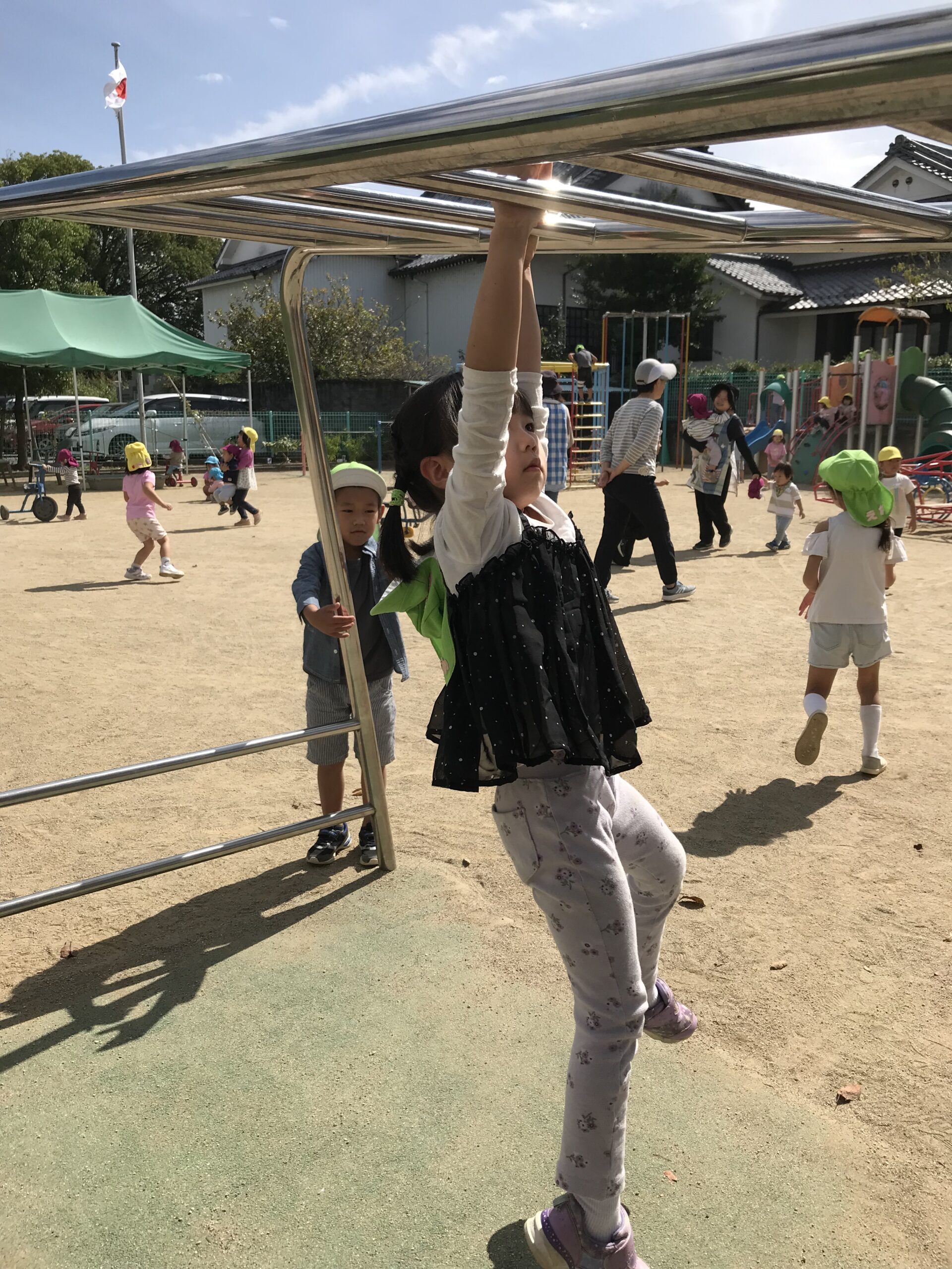 練習が終わると戸外遊び!お外で遊ぶことが大好きな子ども達は、追いかけっこで思い切り走ったり、秋の自然を見つけたりと戸外遊びを満喫していました。気持ちのいい風が吹き「先生!風が涼しくて気持ちいいね」と季節の移り変わりを肌で感じることができました。