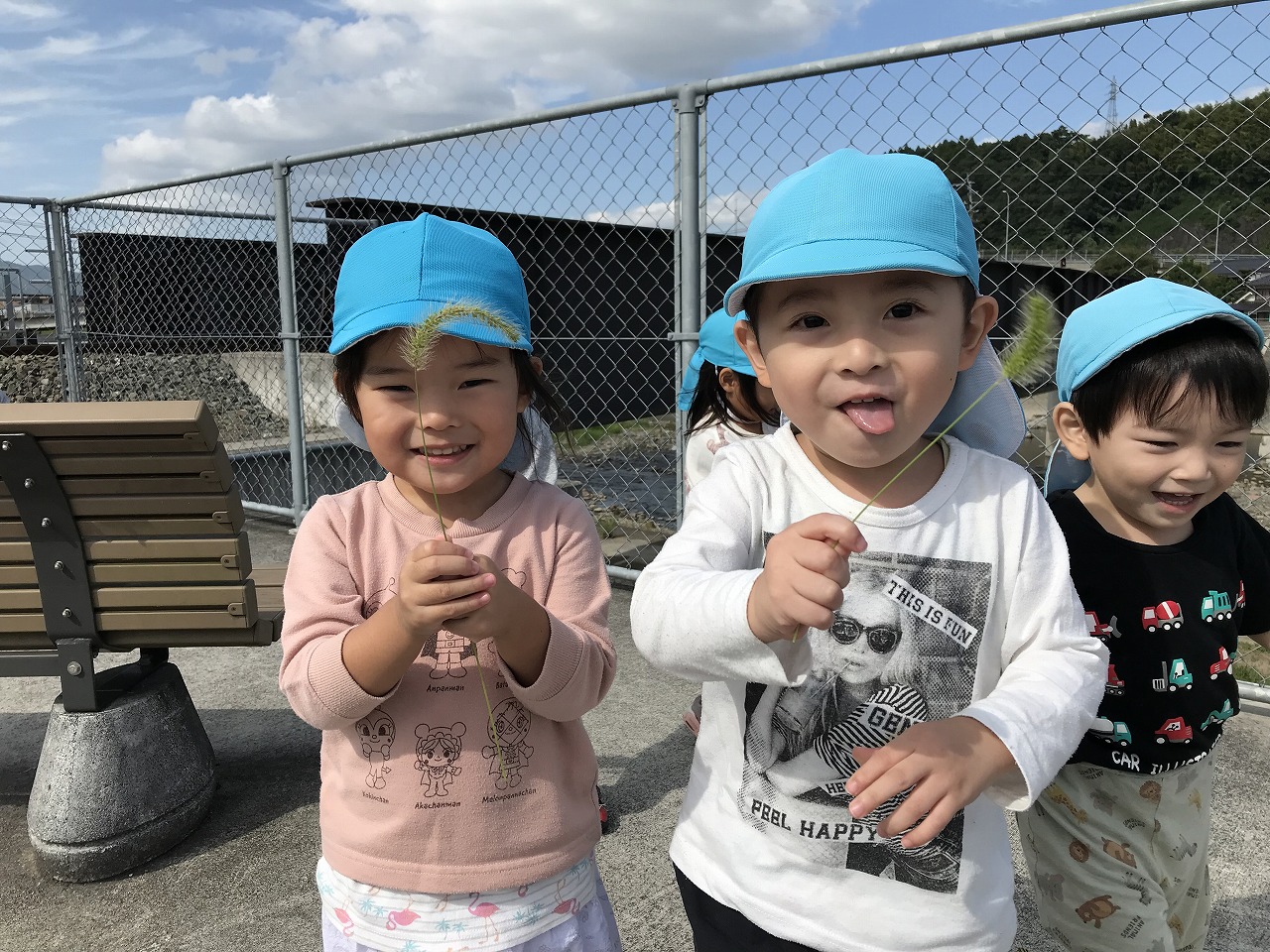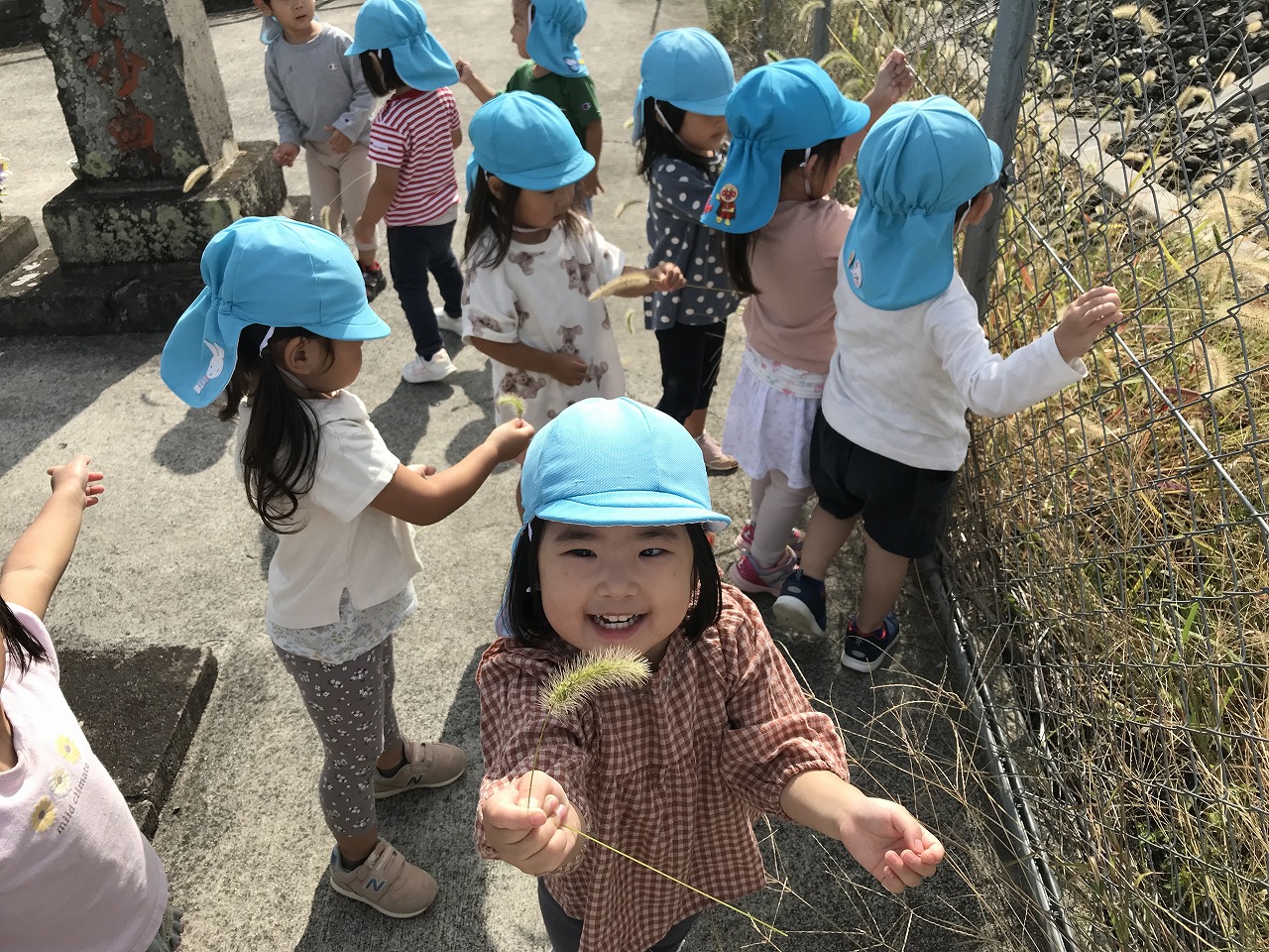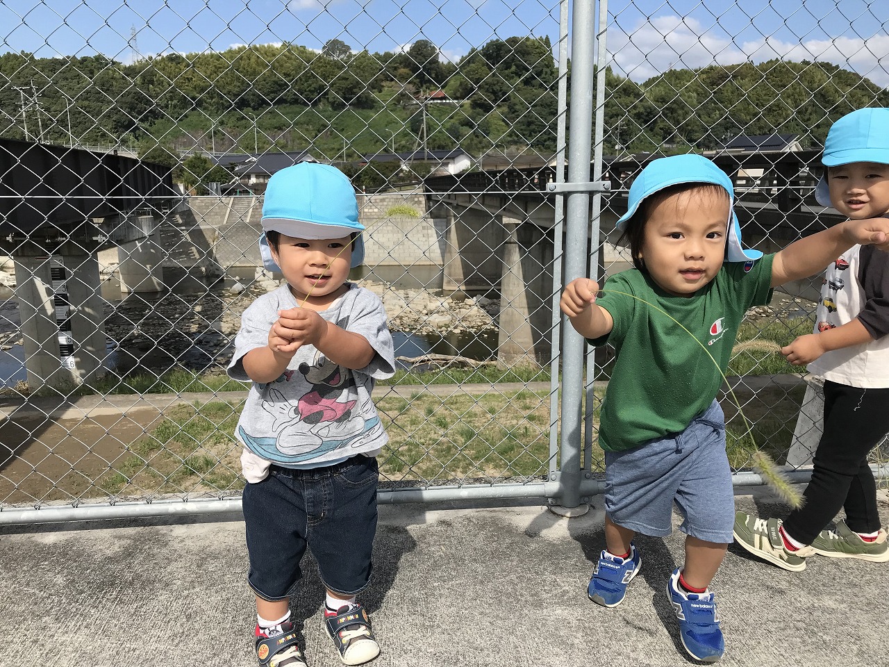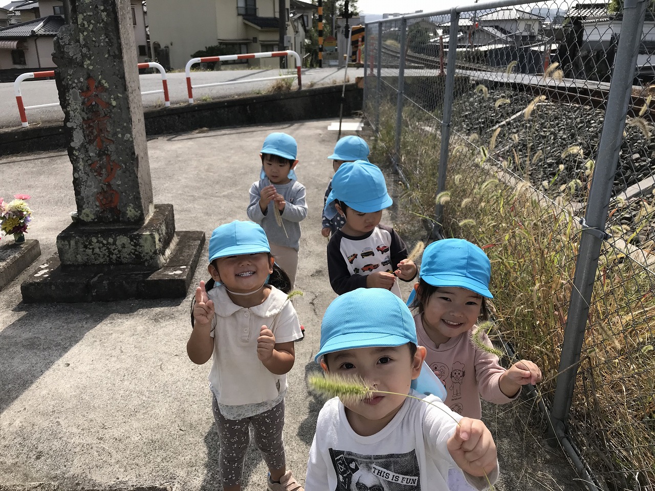 朝晩は寒くなりましたが日中は天気も良く過ごしやすい気候ですね!たんぽぽ組(2歳児)は久しぶりに散歩に出掛けました。身の回りのことも自分で出来るようになり、散歩に行く準備も早くなりました。今日は汽車コースで土手を通って行きました。カモが泳いでいたり、乗り物を通ると嬉しそうに「〇〇みえた!ばいばーい!!」と手を振ってたくさんお喋りも楽しみました。汽車が通るのを待っている間は、ねこじゃらしを見つけて友だちと一緒に「ハイ、チーズ★」と写真を撮りました。決めポーズをとったりと、可愛いたんぽぽ組(2歳児)です。過ごしやすいこの時期に、たくさん秋を感じながら遊びを満喫したいです!