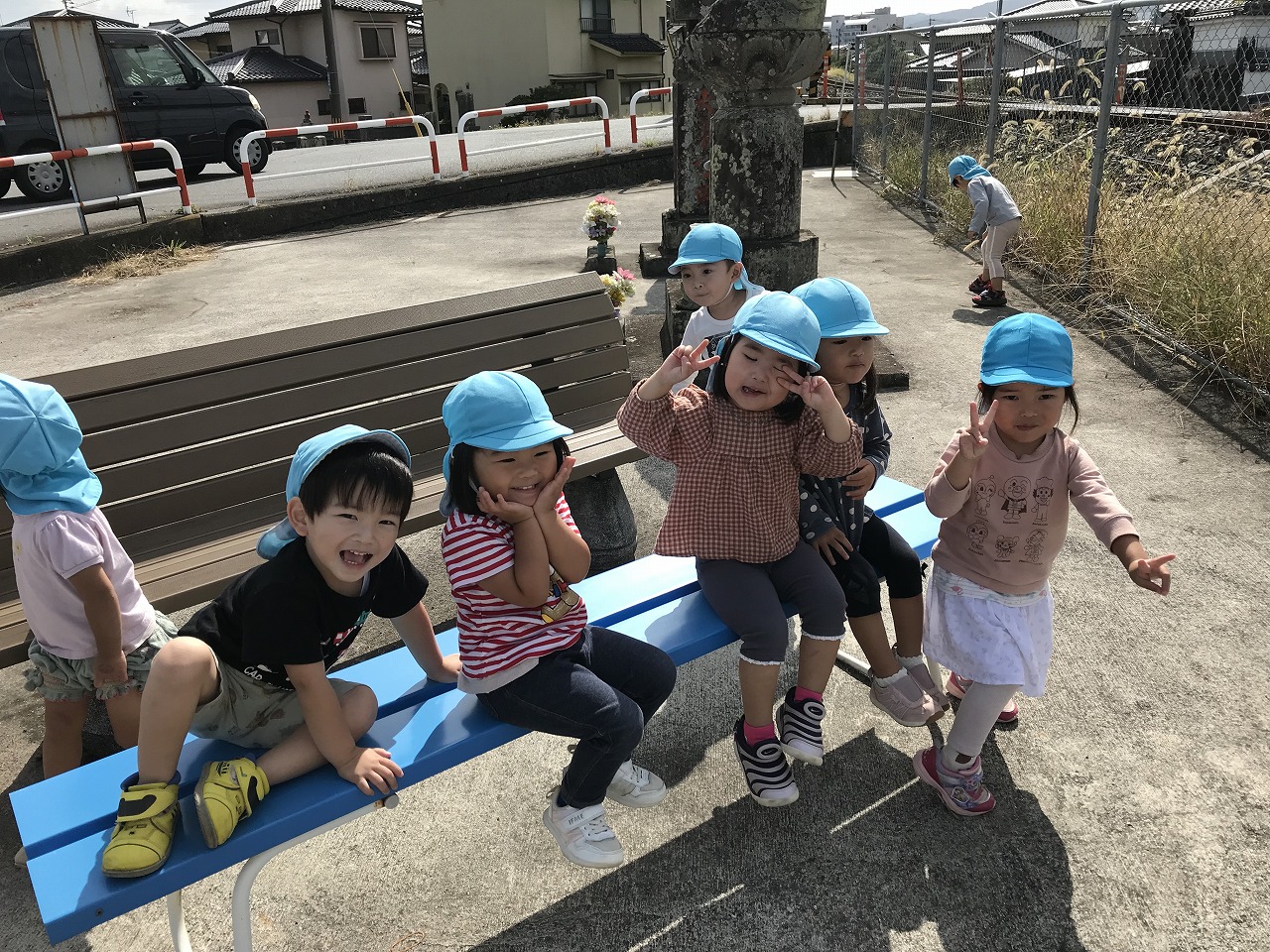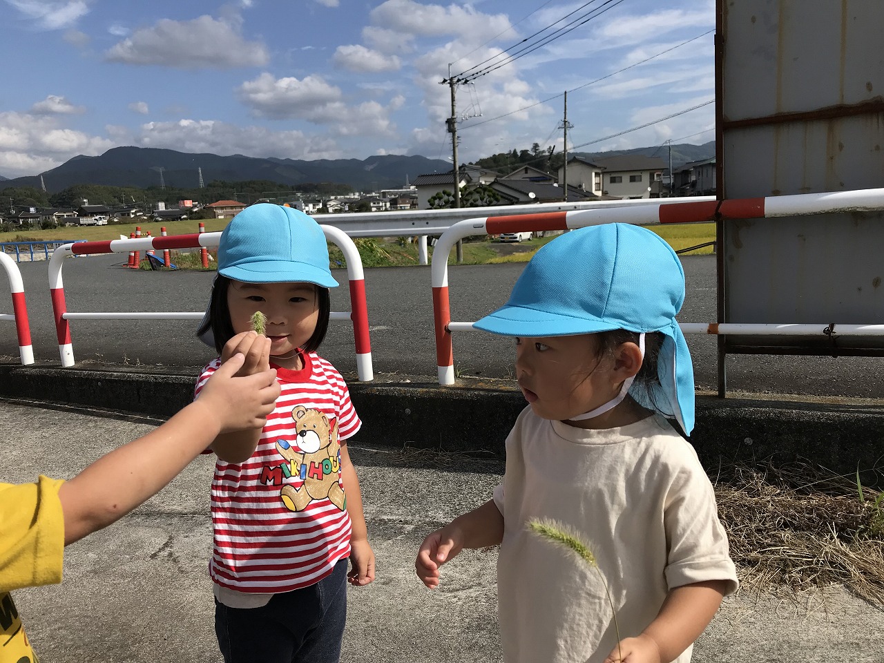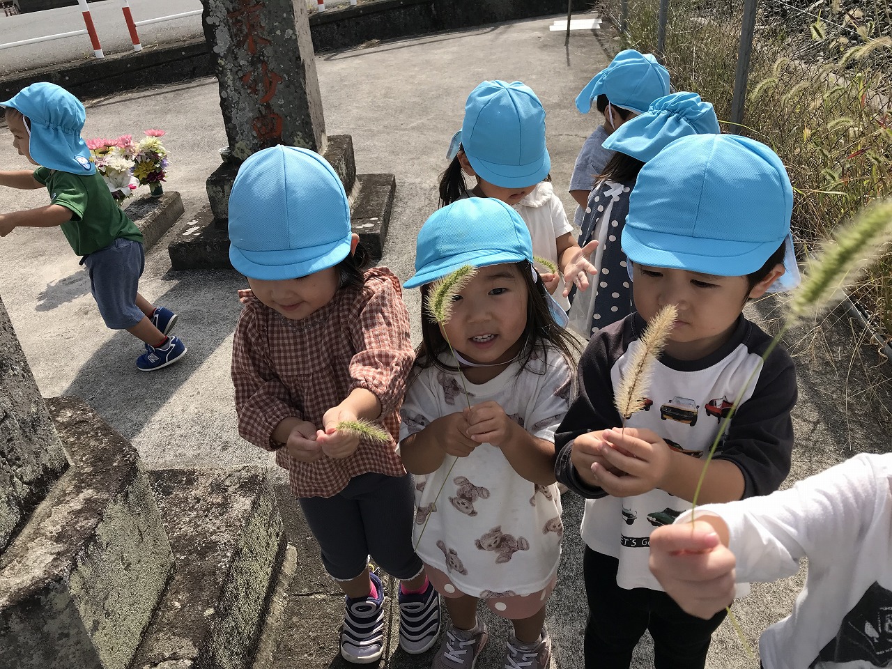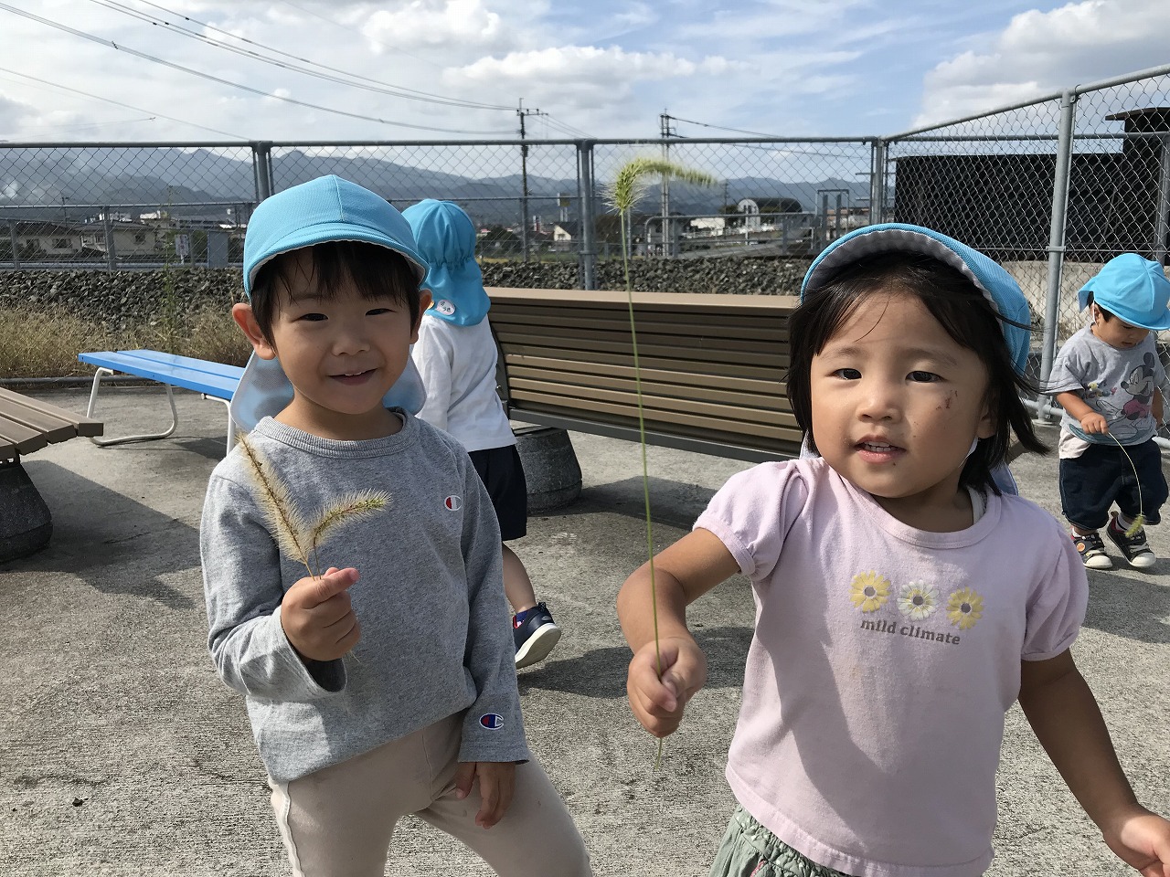 朝晩は寒くなりましたが日中は天気も良く過ごしやすい気候ですね!たんぽぽ組(2歳児)は久しぶりに散歩に出掛けました。身の回りのことも自分で出来るようになり、散歩に行く準備も早くなりました。今日は汽車コースで土手を通って行きました。カモが泳いでいたり、乗り物を通ると嬉しそうに「〇〇みえた!ばいばーい!!」と手を振ってたくさんお喋りも楽しみました。汽車が通るのを待っている間は、ねこじゃらしを見つけて友だちと一緒に「ハイ、チーズ★」と写真を撮りました。決めポーズをとったりと、可愛いたんぽぽ組(2歳児)です。過ごしやすいこの時期に、たくさん秋を感じながら遊びを満喫したいです!