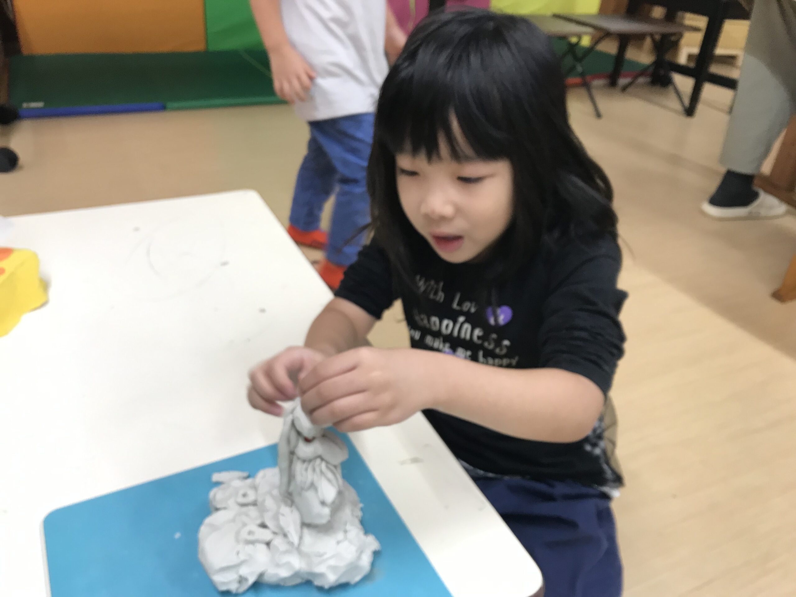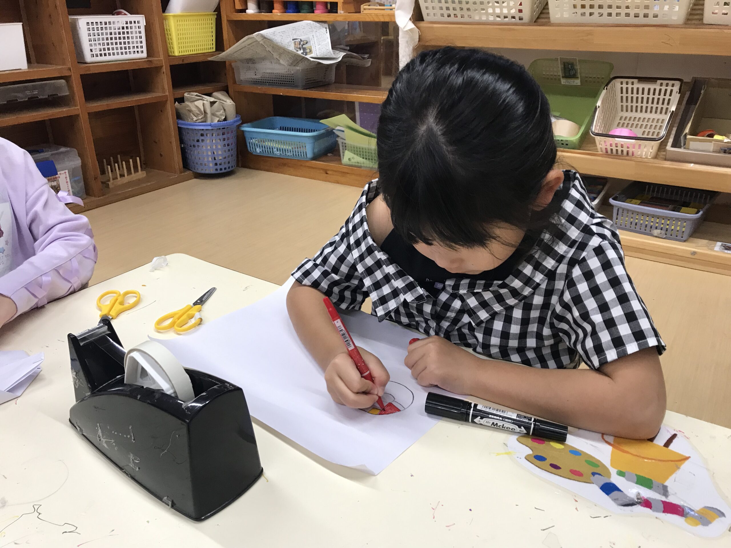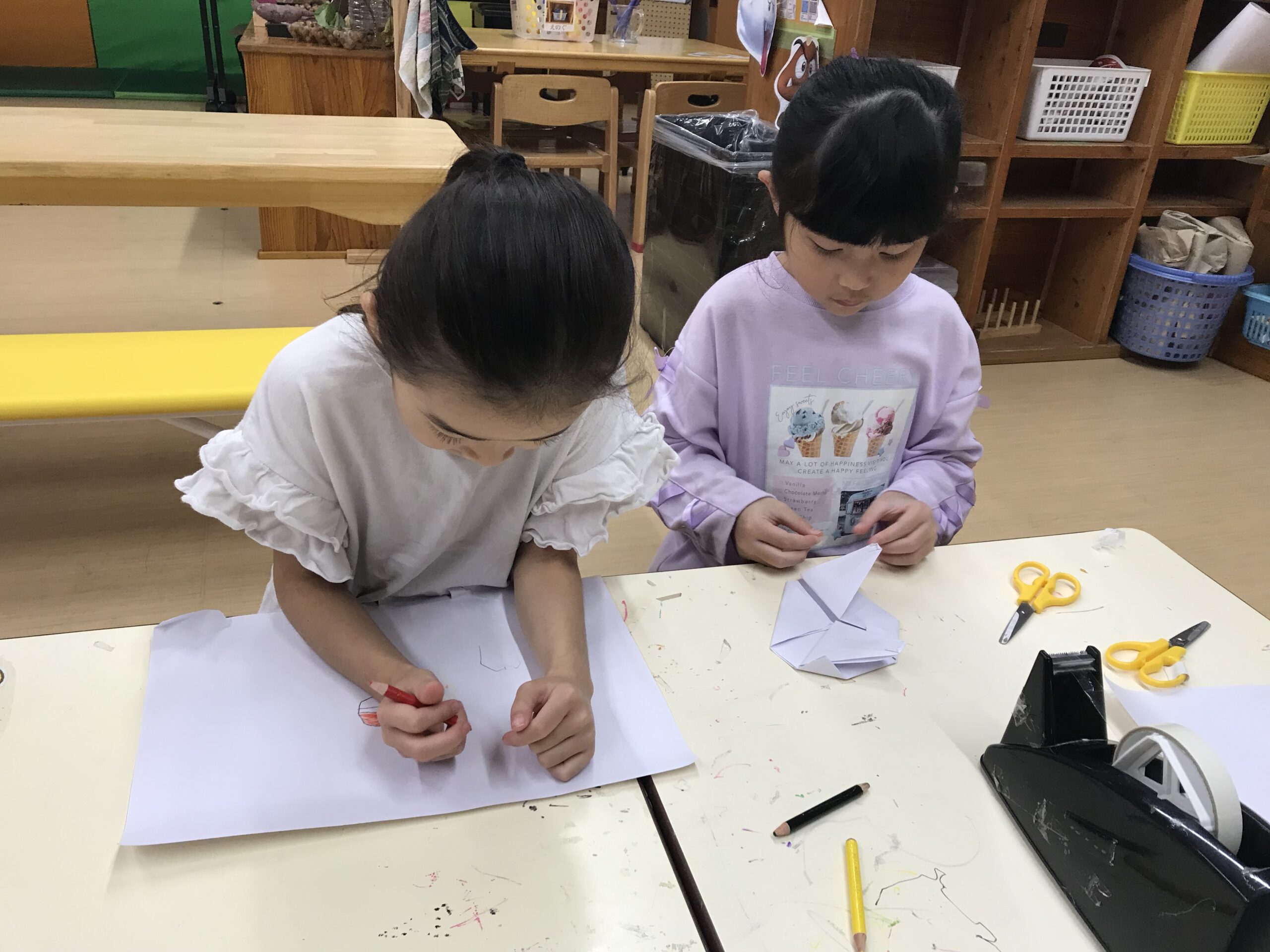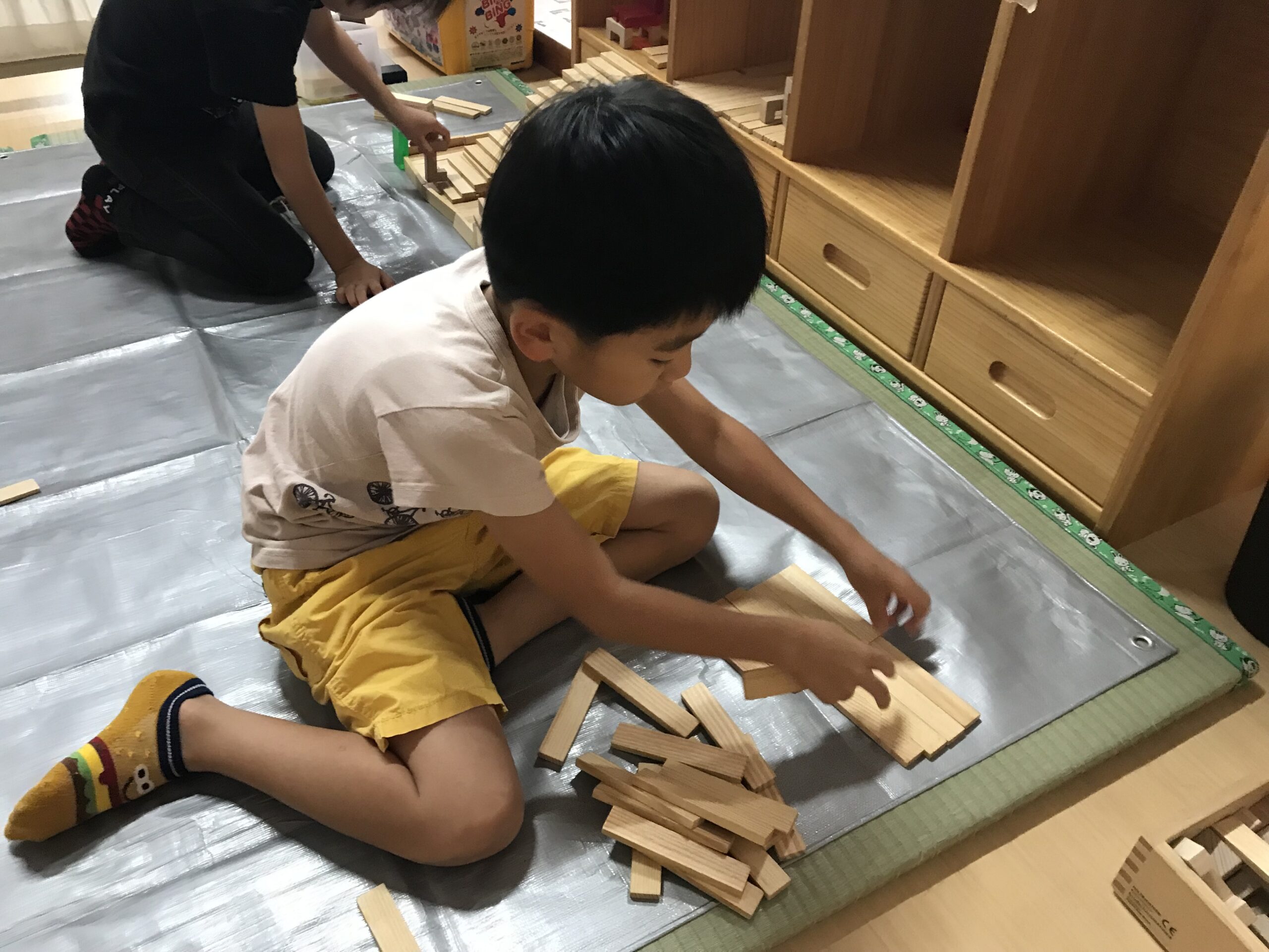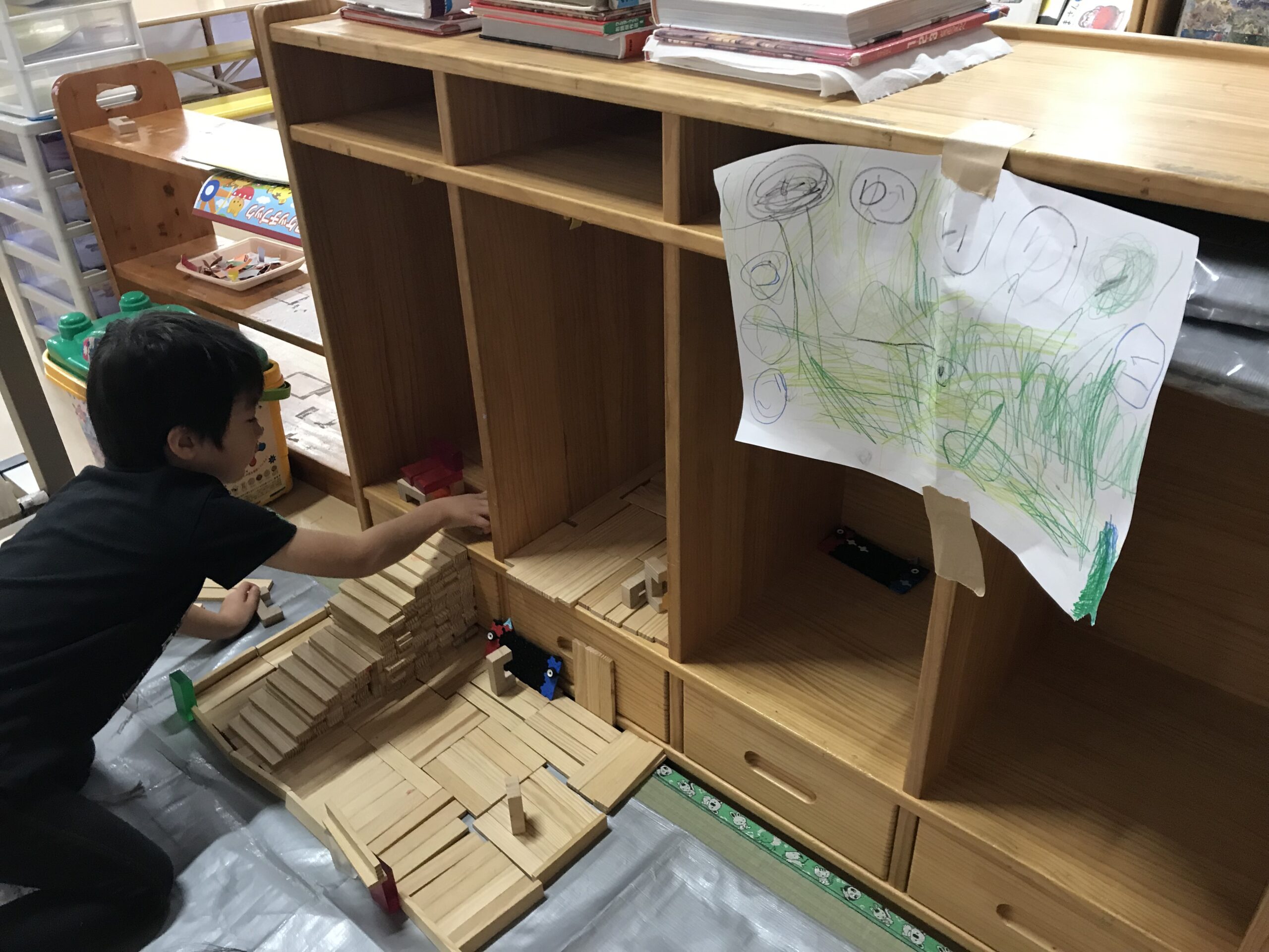 もも組の男の子たちは最近“自分たちの街を作る!”と張り切っています。遊びの前にはサークルタイムでルールを決めていきました。「これはもも組だけで作りたいからうめさんやさくらさんは壊さないで欲しいな…」「見るだけならOKにしよう!」など決めたルールをお集まりでもみんなに知らせてくれました。今日から早速街づくりの開始です。昨日描いた設計図の中には一人ひとりのお家が描かれています。「また明日も続きをしよ!」と遊びの続きを楽しみしています。どんなお家が出来上がるのか、楽しみです。他にも遊びで大好きなキャラクターの絵を描いたり、粘土遊びでも立体的な物をつくることに挑戦したり、難しい遊びにも挑戦する姿がたくさん見られるようになってきたもも組さんです!