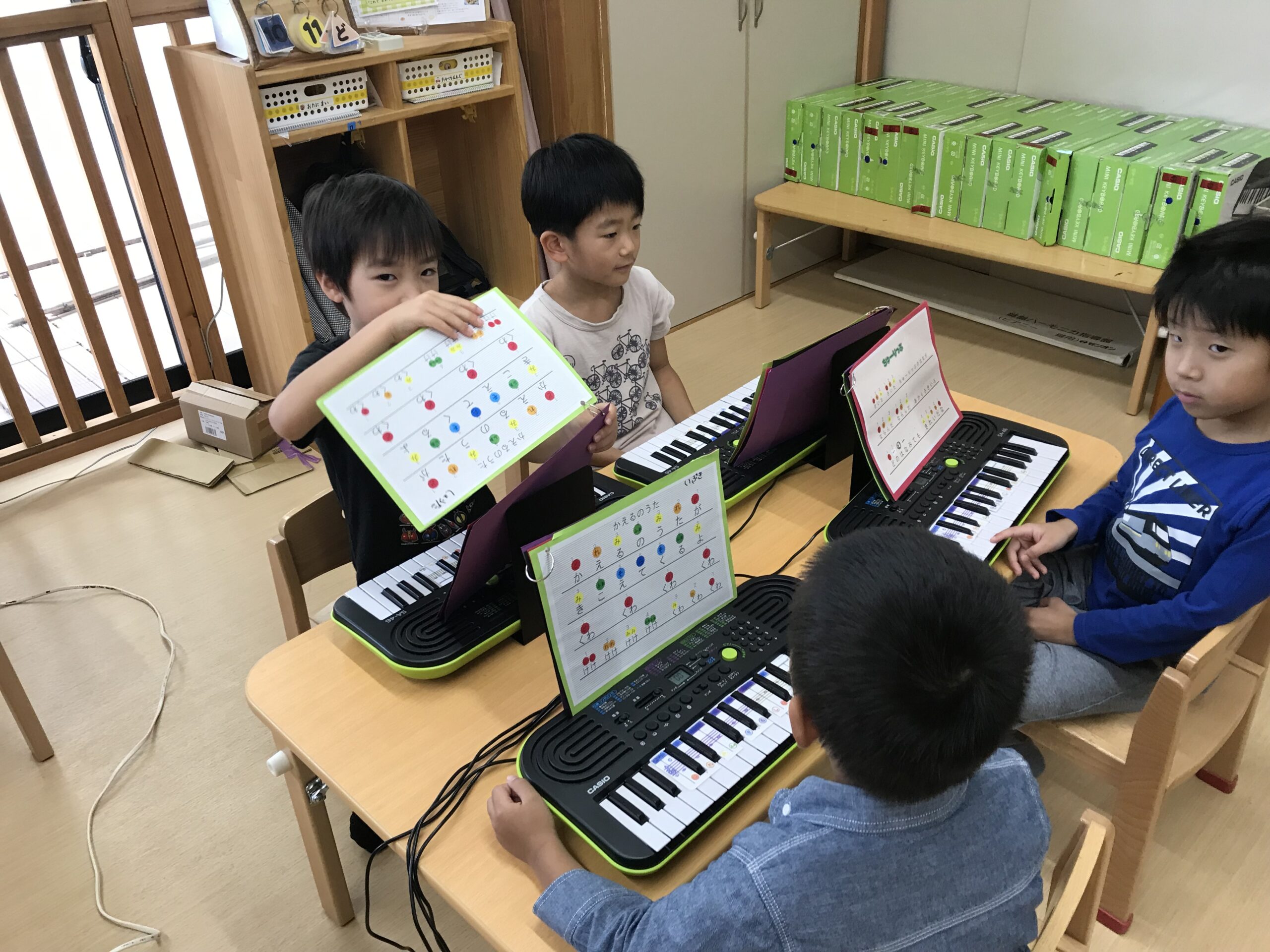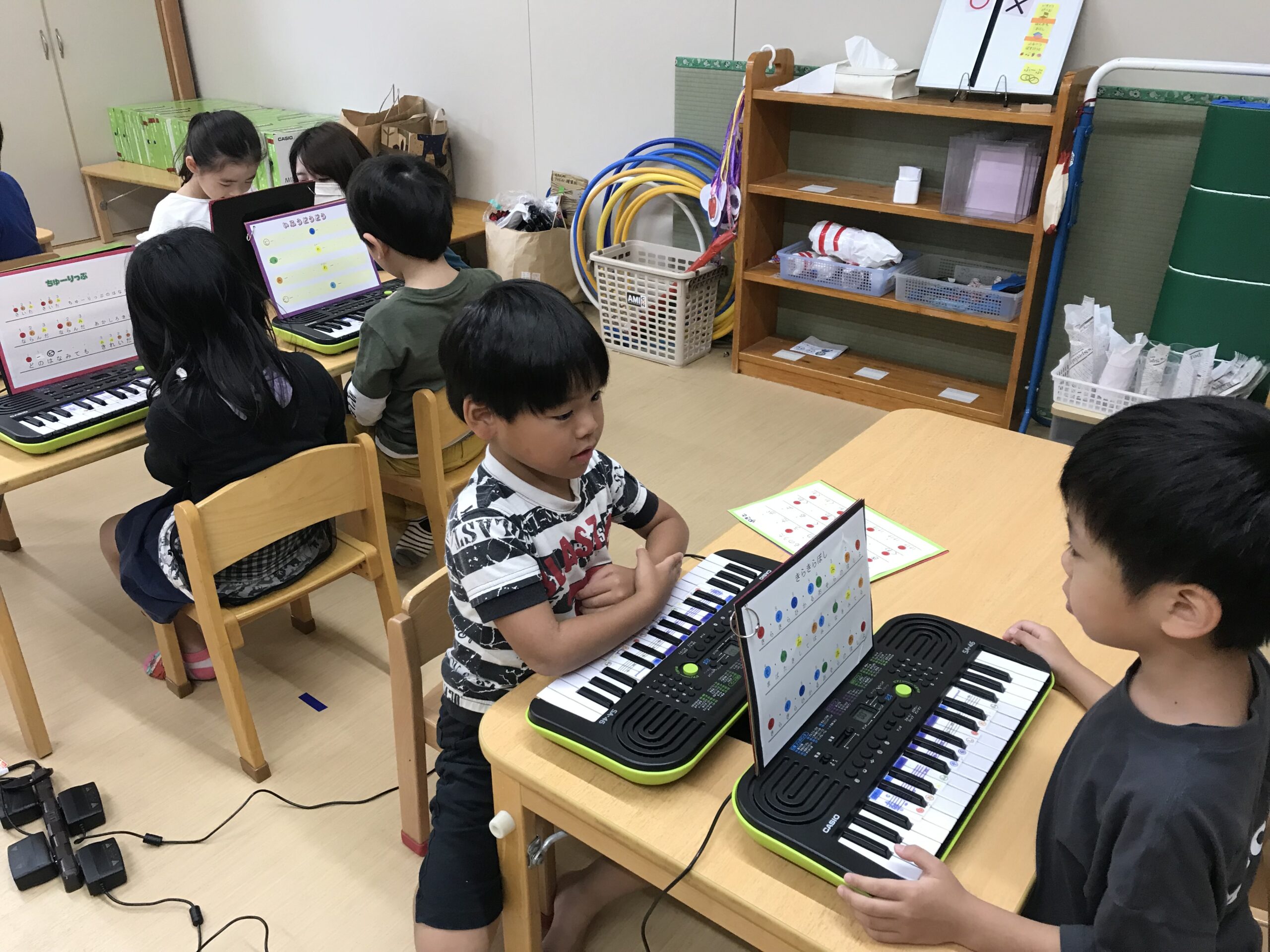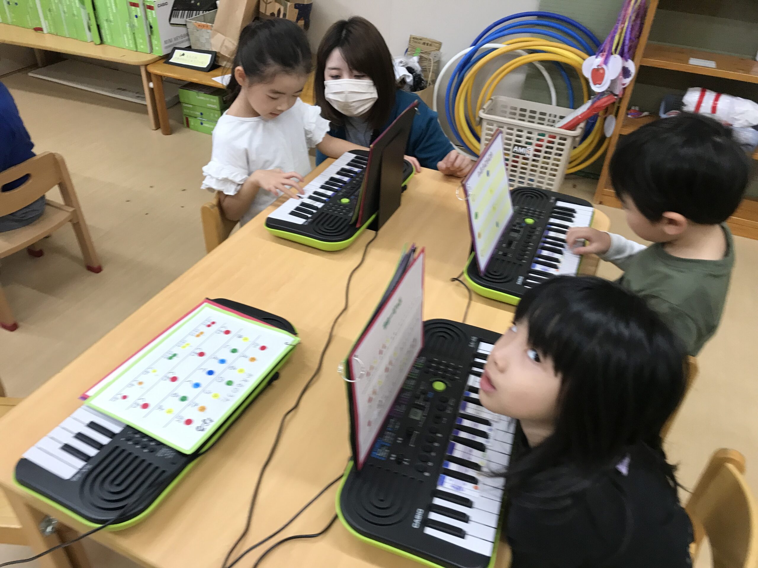 発表会に向けて毎日練習を頑張っているもも組(5歳児)さん。少人数での練習から少しずつ全体の練習へと進んでいます。ピアノの練習ではみんなで合わせて弾くことを楽しんでいます。まだまだ合わせ始めたばかりなので音がずれてしまうこともありますが、お友達が声に出して音階を歌ってくれるので、合わせやすくなっているようです。みんなで協力して頑張る、という姿がたくさん練習の中でも感じられます。