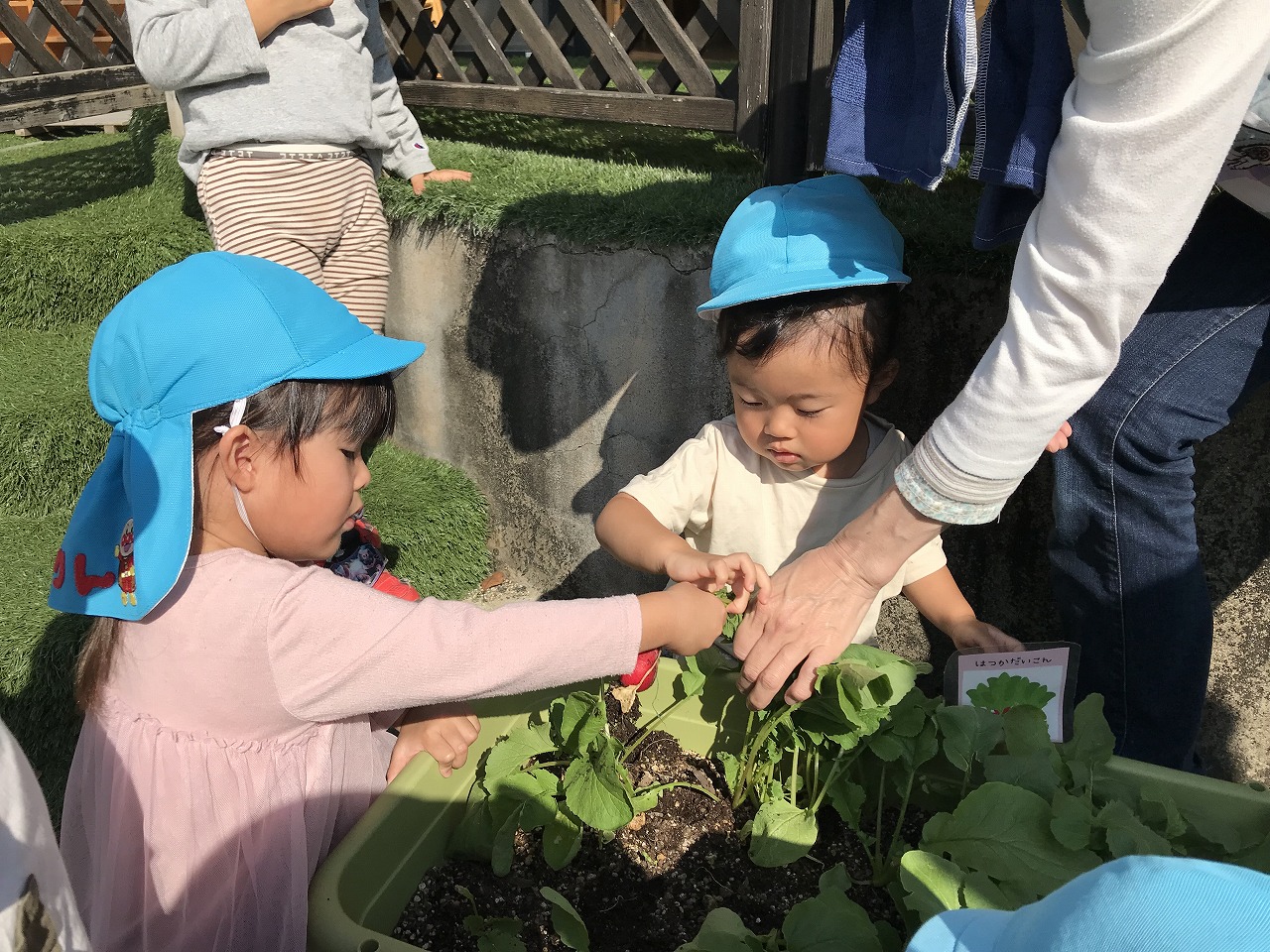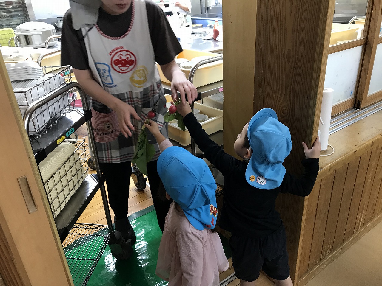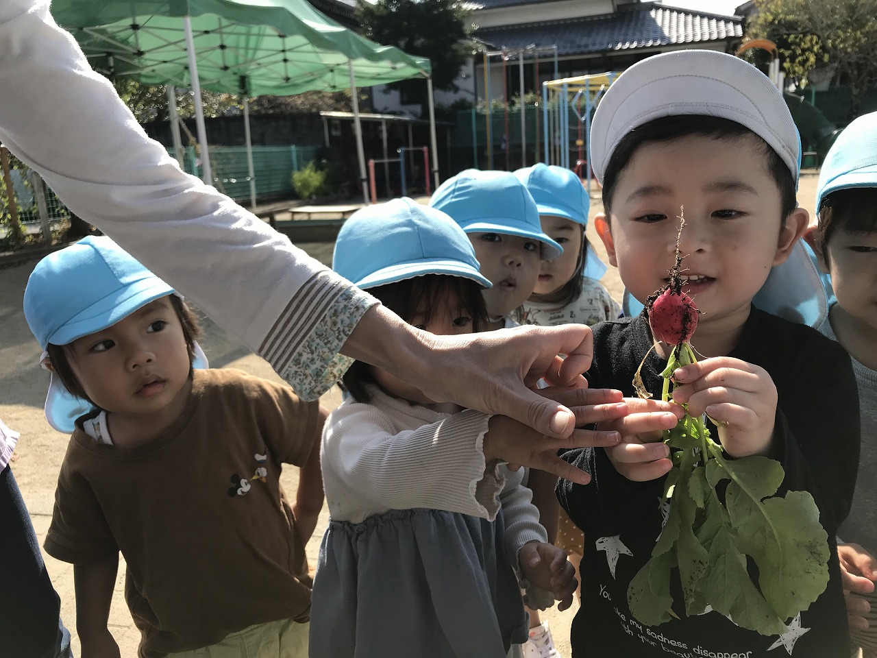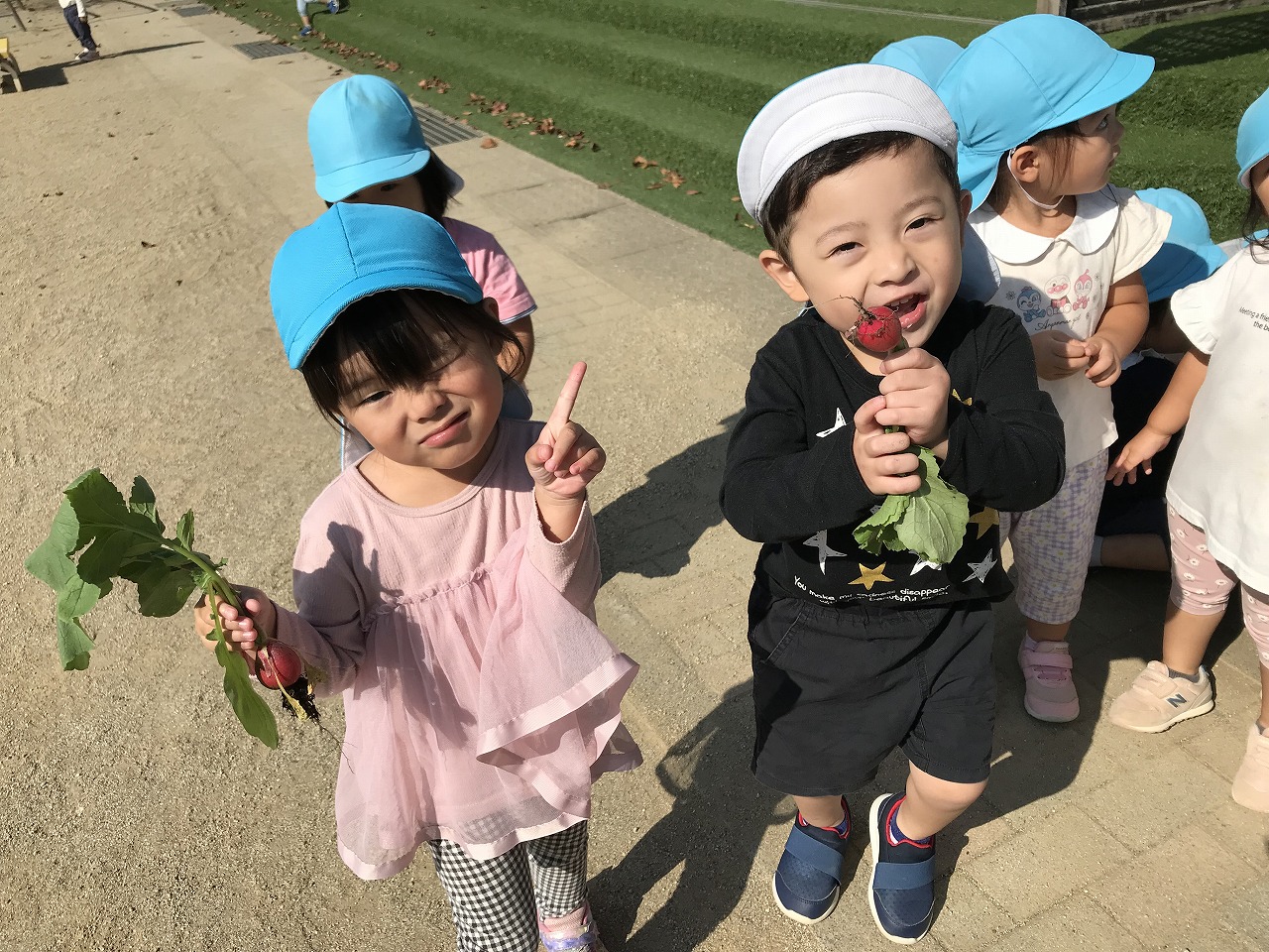 発表会の練習を頑張っているたんぽぽ組(2歳児)の子ども達。今年は言葉遊びと踊りをします。言葉遊びでは【おおきなかぶ】をします。練習を何度かしていくうちに、「うんとこしょ!どっこいしょ!」と大きな声で言えるようになってきました。保育士等との掛け合いの場面も、しっかりとセリフを覚えてきて、楽しそうに取り組んでいます。当日を楽しみにしていて下さい♪練習の前は、戸外でたくさん遊びました。友だちと一緒に三輪車に乗って遊んだり、砂場で遊んだりと、それぞれに好きな遊びを楽しんでいましたよ。たんぽぽ組(2歳児)さんが以前から育てている二十日大根もぐんぐんと大きくなり、今日初めて収穫をしました。「ちいさーい!あかいね~!」と子ども達の感想も聞かれました。なかには、「まだちいさいカブもあるから、もっとおおきくなるようにおみずをあげるね!」と言って、水やりをせっせと頑張ってくれました。次の収穫も楽しみにしている子ども達です。今日のお汁に二十日大根が入っていて、「あった!!」と嬉しそうに食べていました☆