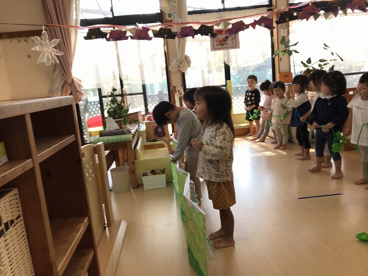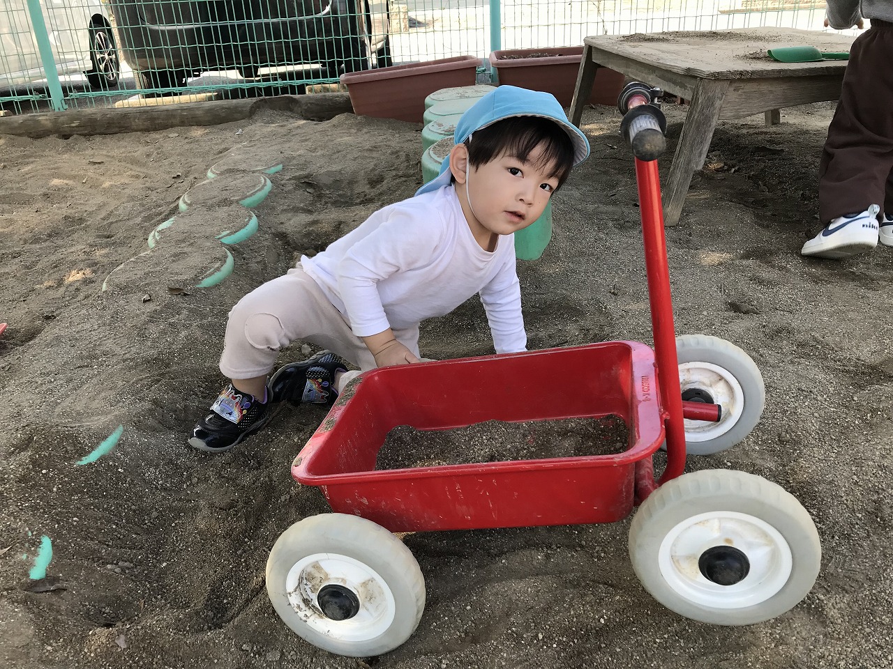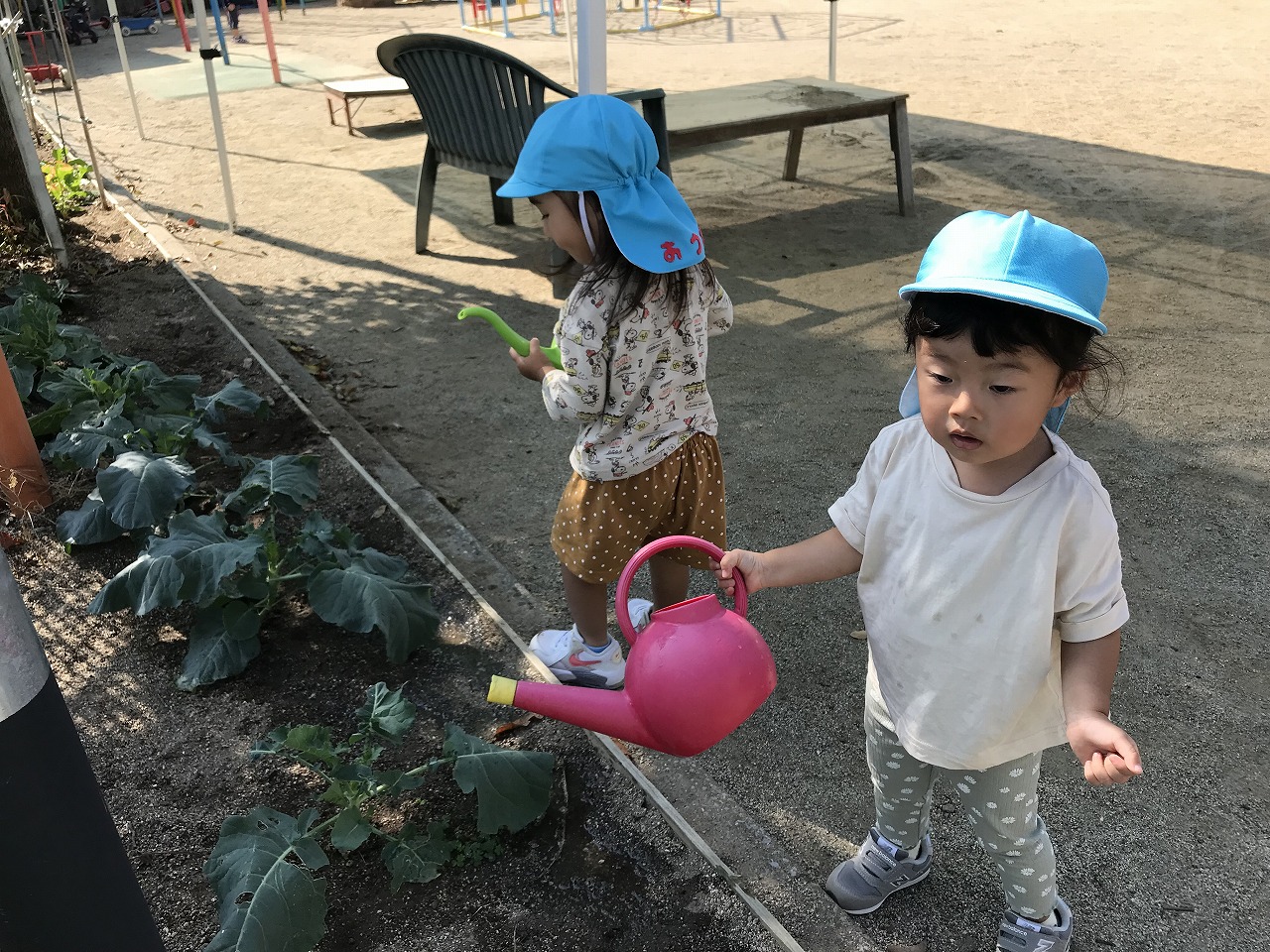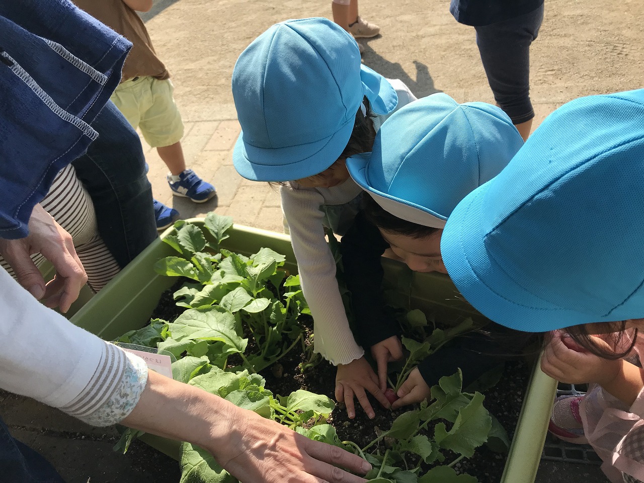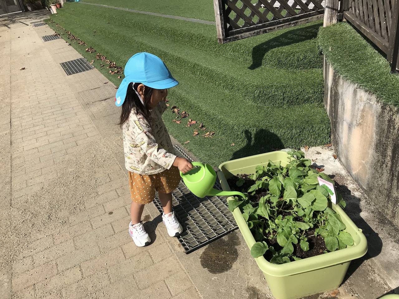 発表会の練習を頑張っているたんぽぽ組(2歳児)の子ども達。今年は言葉遊びと踊りをします。言葉遊びでは【おおきなかぶ】をします。練習を何度かしていくうちに、「うんとこしょ!どっこいしょ!」と大きな声で言えるようになってきました。保育士等との掛け合いの場面も、しっかりとセリフを覚えてきて、楽しそうに取り組んでいます。当日を楽しみにしていて下さい♪練習の前は、戸外でたくさん遊びました。友だちと一緒に三輪車に乗って遊んだり、砂場で遊んだりと、それぞれに好きな遊びを楽しんでいましたよ。たんぽぽ組(2歳児)さんが以前から育てている二十日大根もぐんぐんと大きくなり、今日初めて収穫をしました。「ちいさーい!あかいね~!」と子ども達の感想も聞かれました。なかには、「まだちいさいカブもあるから、もっとおおきくなるようにおみずをあげるね!」と言って、水やりをせっせと頑張ってくれました。次の収穫も楽しみにしている子ども達です。今日のお汁に二十日大根が入っていて、「あった!!」と嬉しそうに食べていました☆