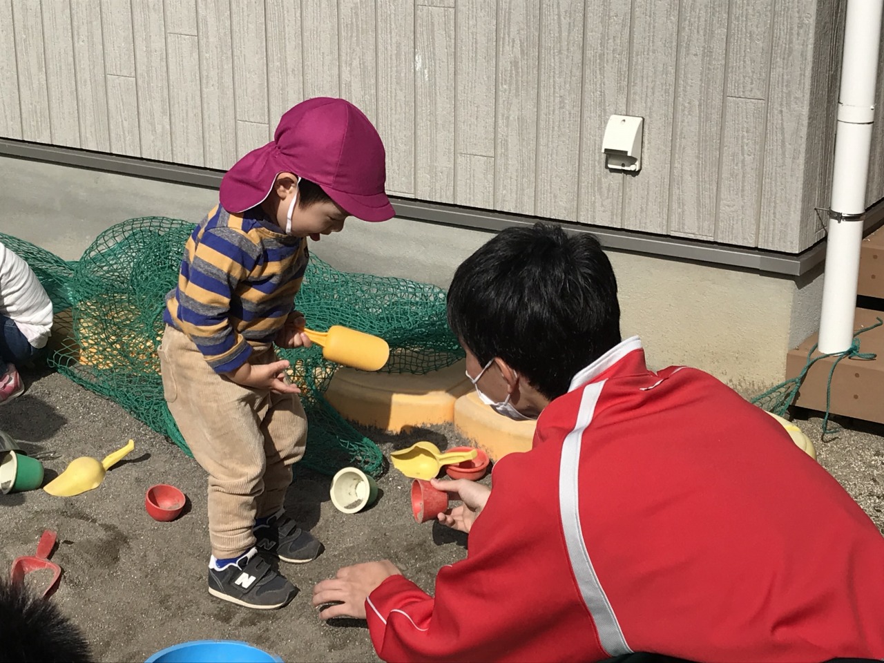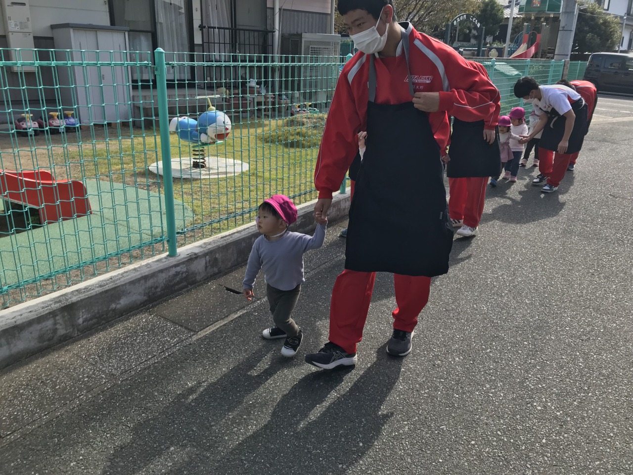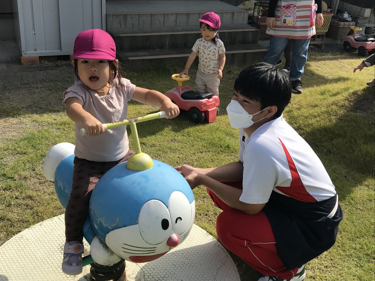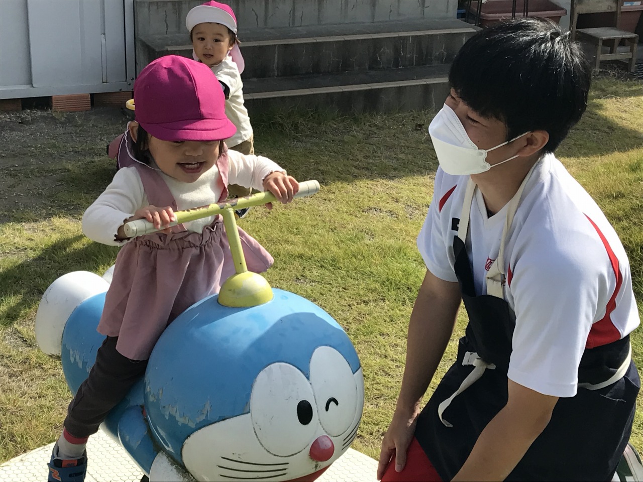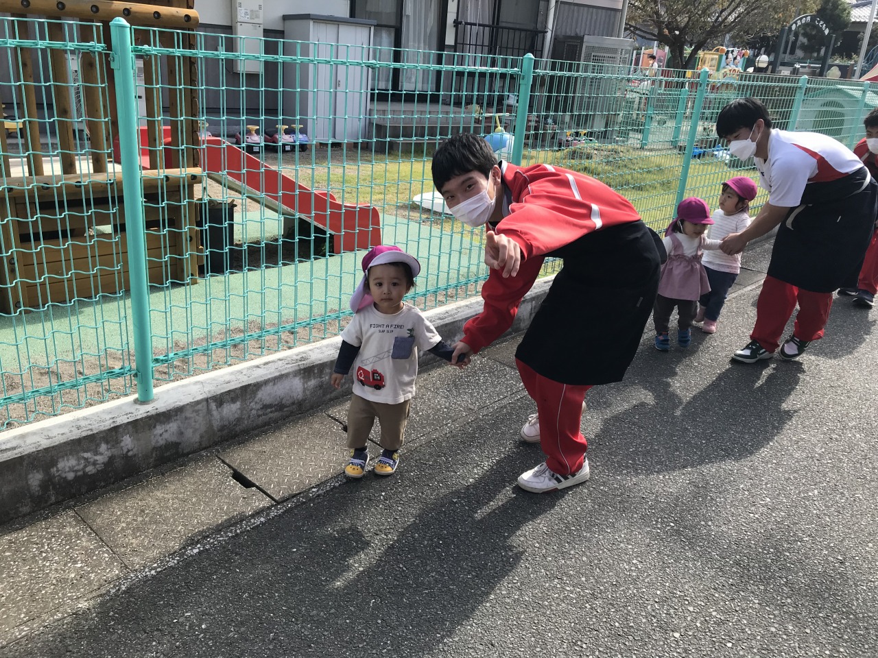 今日は、子育て支援センターの行事“ぴよぴよルーム特別企画 未来塾∼PAM(パパ&ママ)~”があり、高校生との交流を行いました。大きなお兄ちゃん達に最初は驚いていた子ども達でしたが、優しく声を掛けてもらったり一緒に遊んで行くうちに少しずつ仲良くなっていく様子が見られました。小さなすみれ組さんを泣かせないように大切に優しく接する高校生の優しさを感じました。時間がたつにつれ子ども達のほうからかけよって行ったり、嬉しそうに手を繋いで歩く姿が見られたり、心が和む光景がたくさんで した。お兄ちゃん達が返る時にはバイバイーと手を振る子ども達でした。高校生にとってもすみれ組さんにとっても楽しい時間になったことと思います。