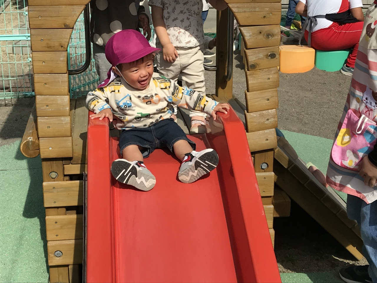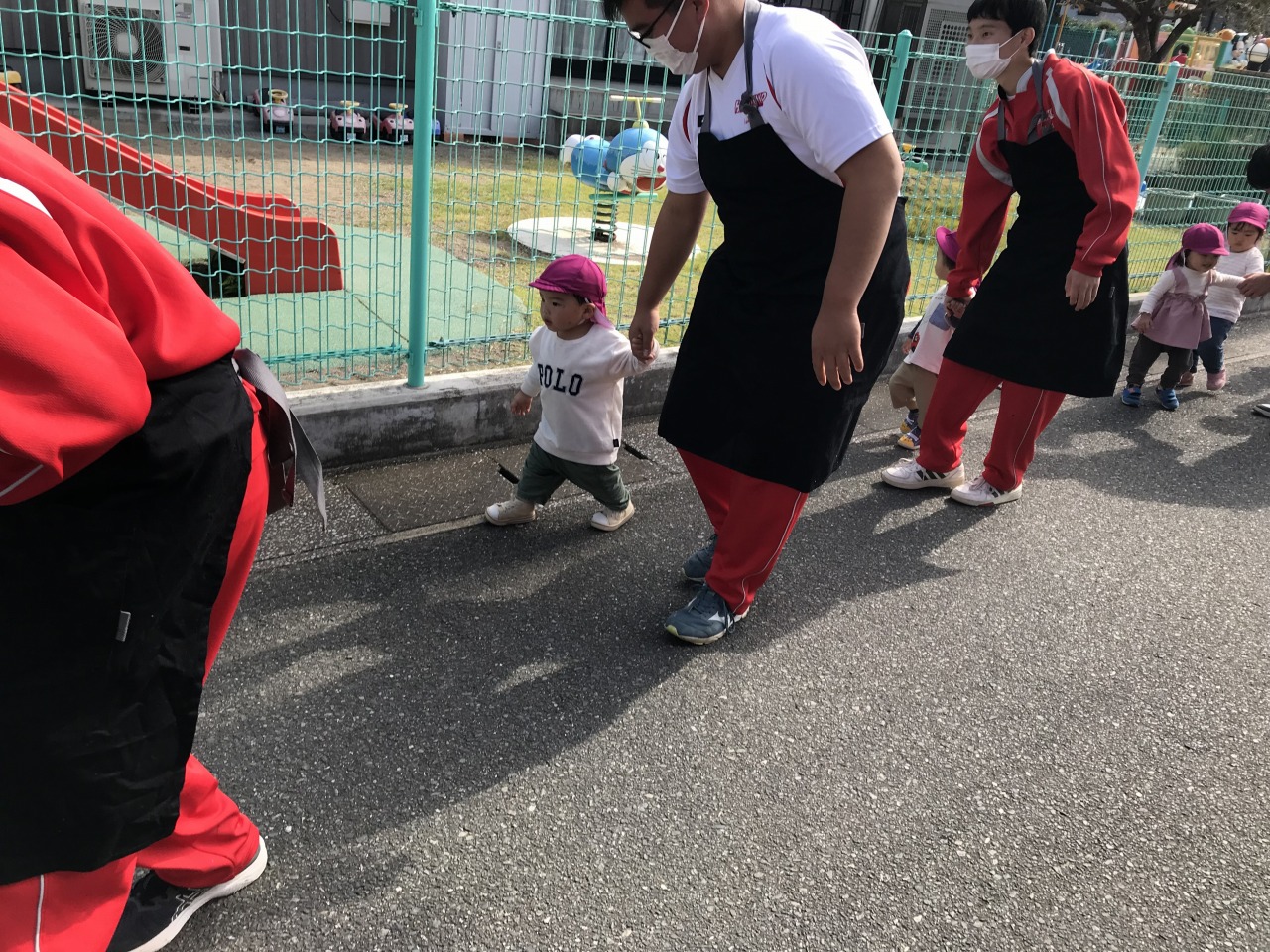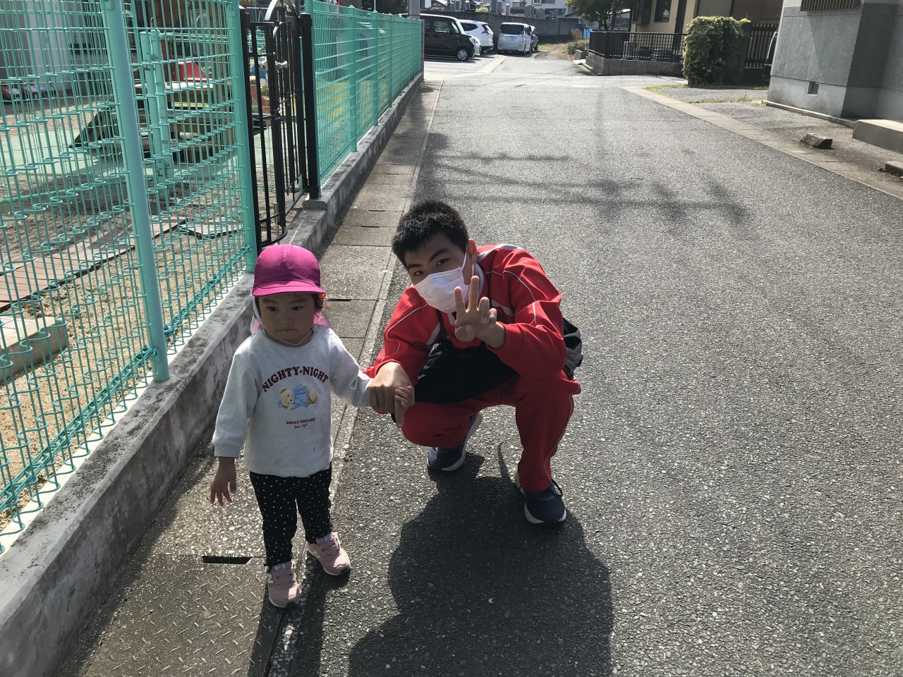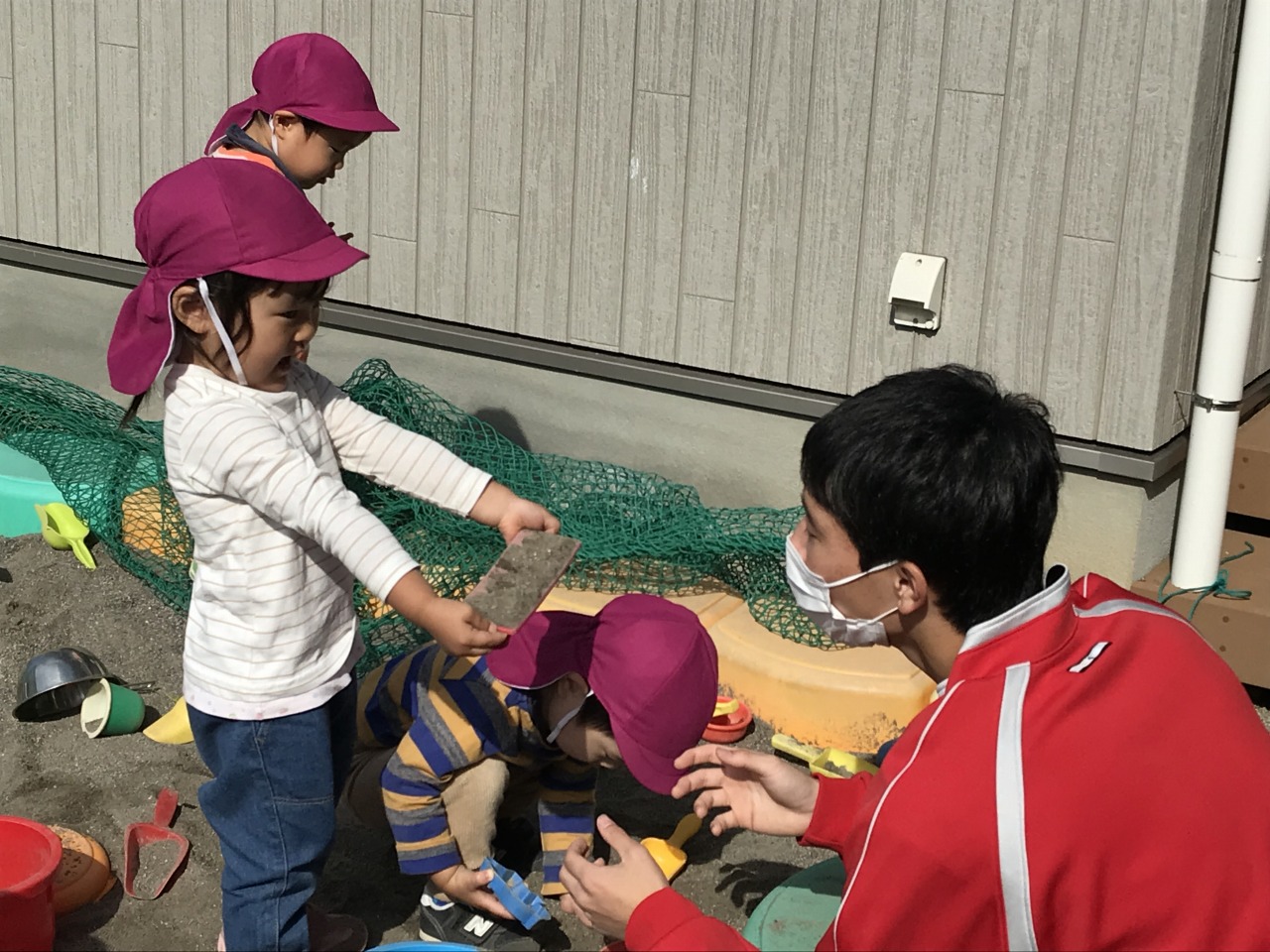 今日は、子育て支援センターの行事“ぴよぴよルーム特別企画 未来塾∼PAM(パパ&ママ)~”があり、高校生との交流を行いました。大きなお兄ちゃん達に最初は驚いていた子ども達でしたが、優しく声を掛けてもらったり一緒に遊んで行くうちに少しずつ仲良くなっていく様子が見られました。小さなすみれ組さんを泣かせないように大切に優しく接する高校生の優しさを感じました。時間がたつにつれ子ども達のほうからかけよって行ったり、嬉しそうに手を繋いで歩く姿が見られたり、心が和む光景がたくさんで した。お兄ちゃん達が返る時にはバイバイーと手を振る子ども達でした。高校生にとってもすみれ組さんにとっても楽しい時間になったことと思います。
