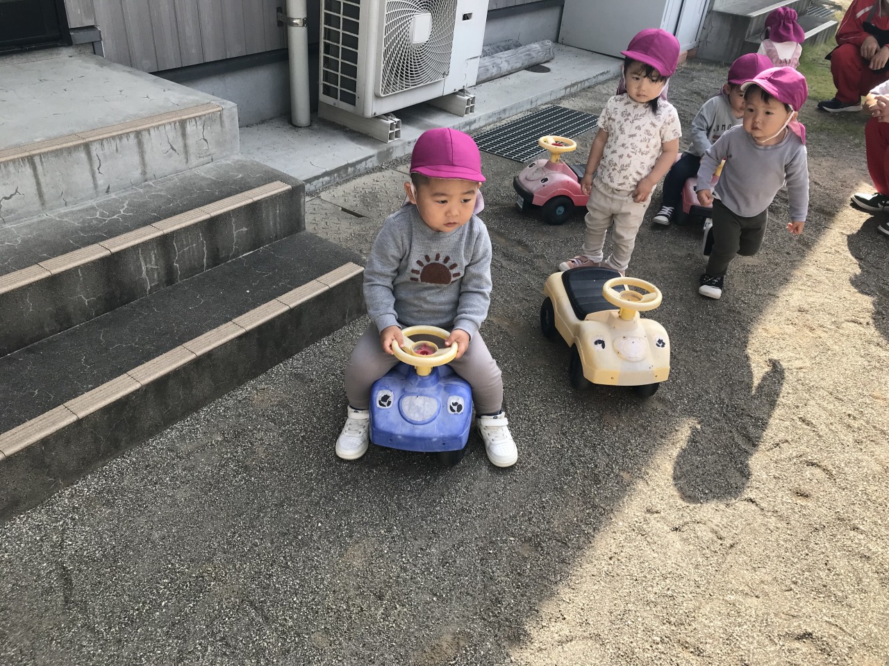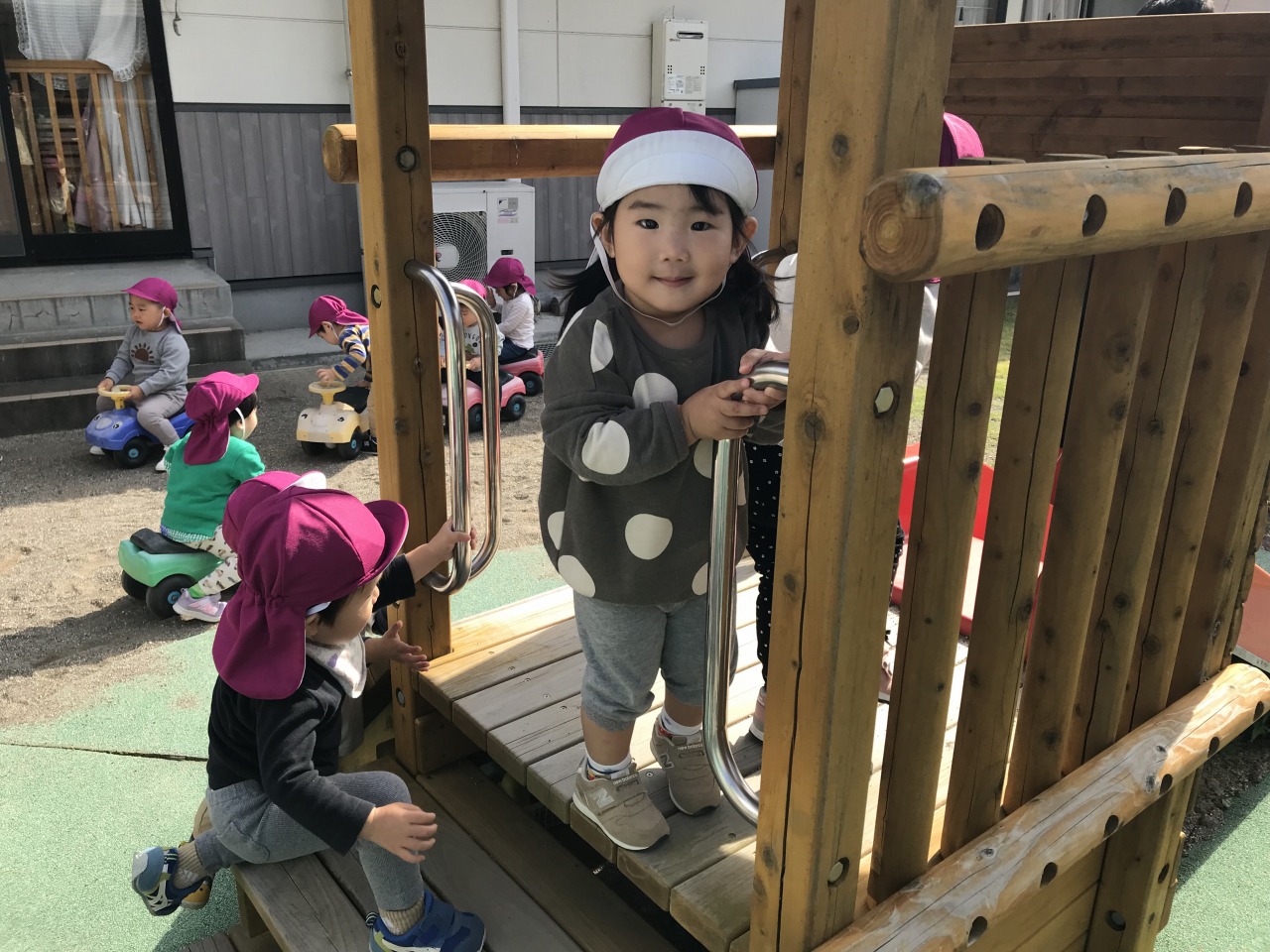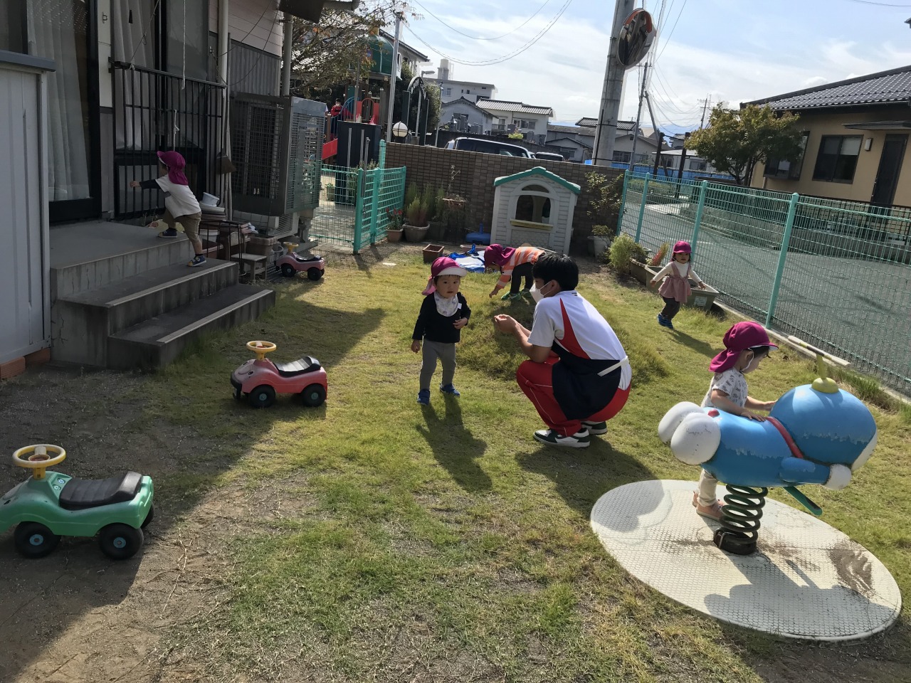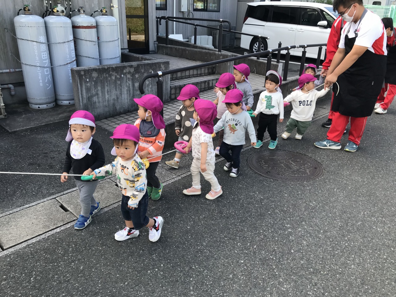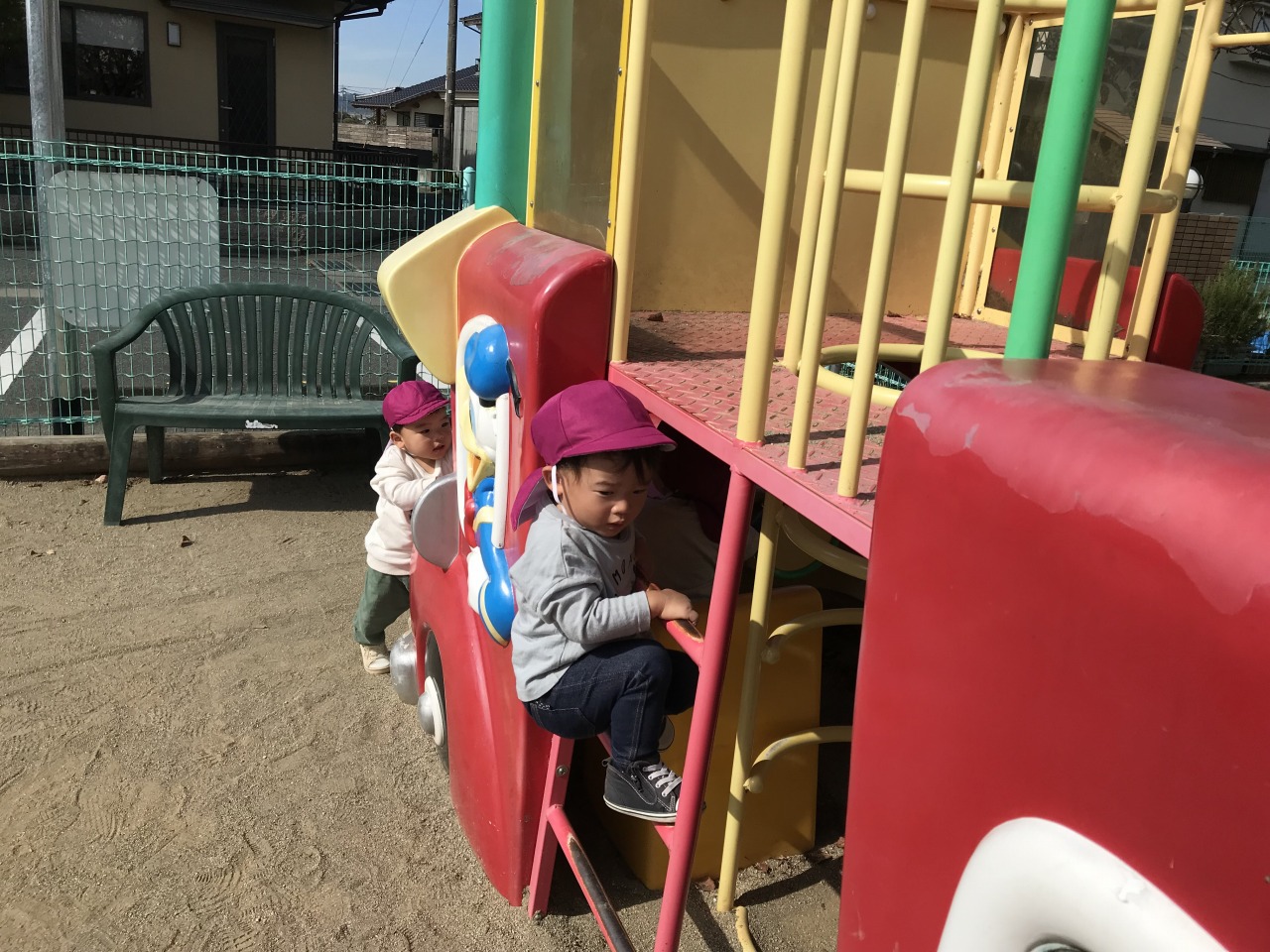 今日は、子育て支援センターの行事“ぴよぴよルーム特別企画 未来塾∼PAM(パパ&ママ)~”があり、高校生との交流を行いました。大きなお兄ちゃん達に最初は驚いていた子ども達でしたが、優しく声を掛けてもらったり一緒に遊んで行くうちに少しずつ仲良くなっていく様子が見られました。小さなすみれ組さんを泣かせないように大切に優しく接する高校生の優しさを感じました。時間がたつにつれ子ども達のほうからかけよって行ったり、嬉しそうに手を繋いで歩く姿が見られたり、心が和む光景がたくさんで した。お兄ちゃん達が返る時にはバイバイーと手を振る子ども達でした。高校生にとってもすみれ組さんにとっても楽しい時間になったことと思います。