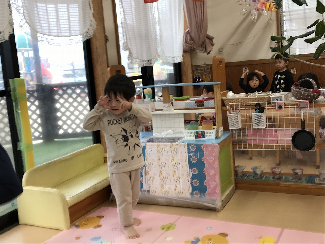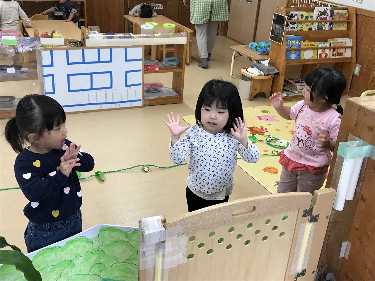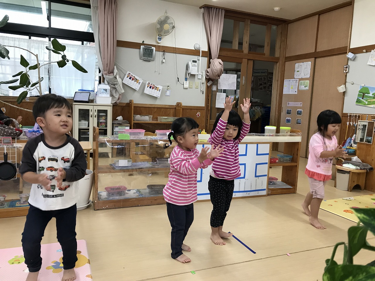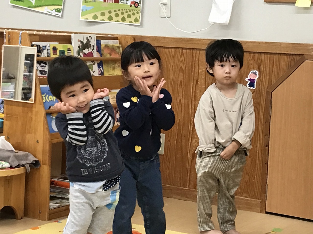 発表会がだんだん近づいてきました。たんぽぽ組(2歳児)は朝から劇あそび、リズムの練習をしました。ずいぶんセリフも覚えて声も大きくなり、他の友だちのセリフまで一緒に言っています。またリズムでは自分の立ち位置のテープの色を覚え、「ゴーゴー!」「パンパカパーン!」と声を出しながら楽しんでいます。今までモジモジしていた子が急におおきな声で言うようになったり、踊らなかった子がニコニコして跳びはねたりと日々成長の見られる子ども達です。