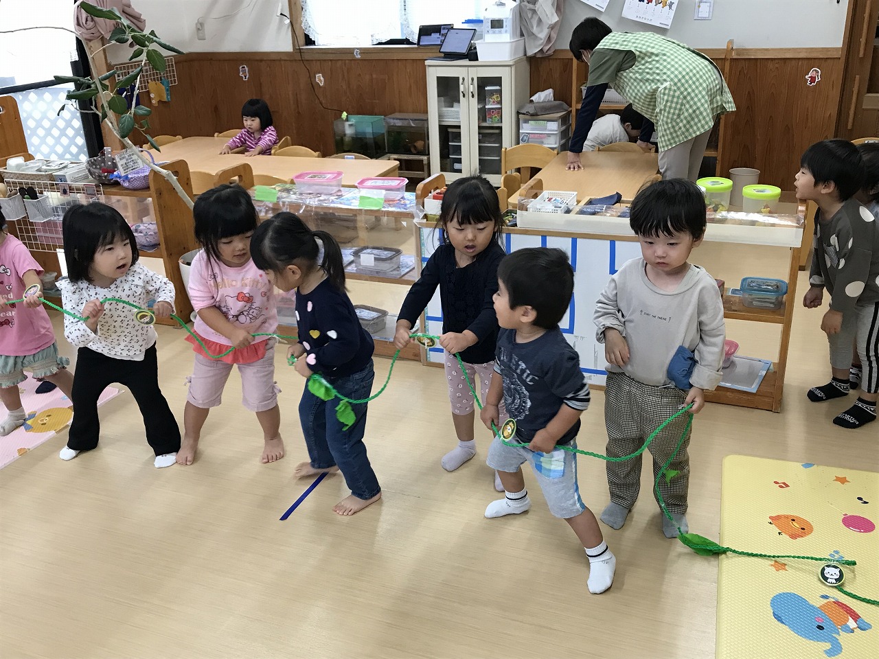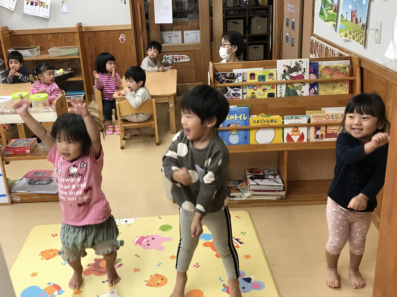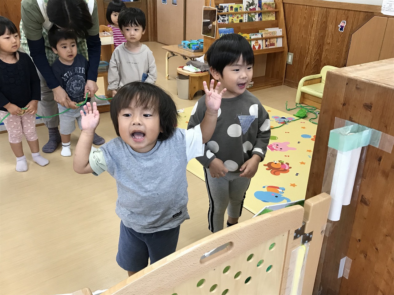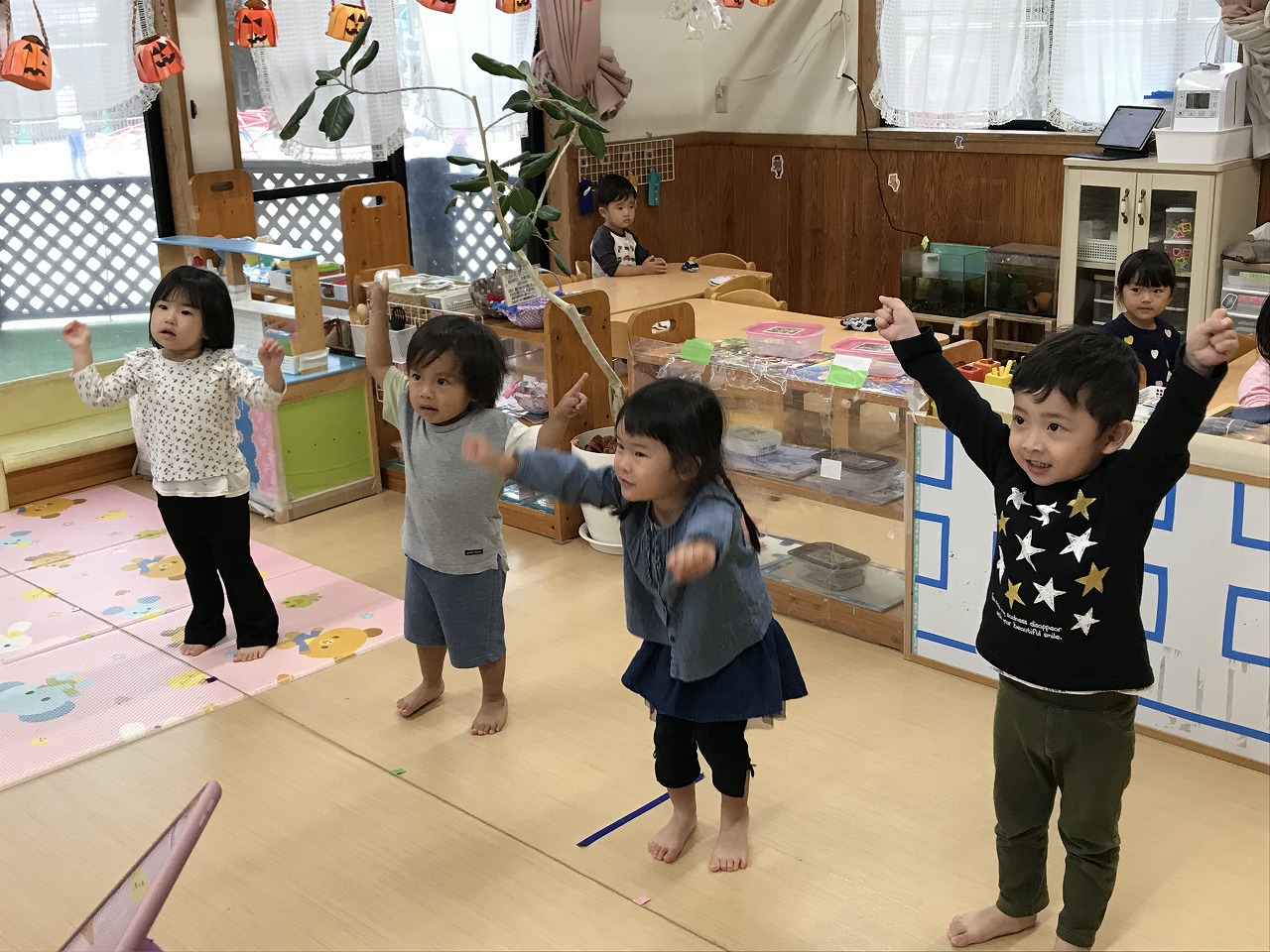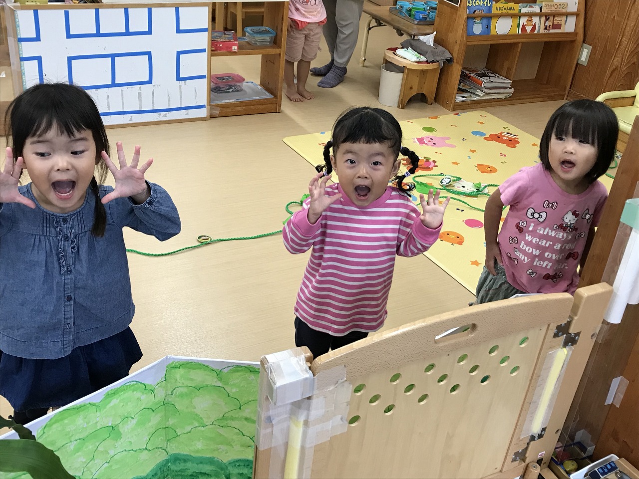 発表会がだんだん近づいてきました。たんぽぽ組(2歳児)は朝から劇あそび、リズムの練習をしました。ずいぶんセリフも覚えて声も大きくなり、他の友だちのセリフまで一緒に言っています。またリズムでは自分の立ち位置のテープの色を覚え、「ゴーゴー!」「パンパカパーン!」と声を出しながら楽しんでいます。今までモジモジしていた子が急におおきな声で言うようになったり、踊らなかった子がニコニコして跳びはねたりと日々成長の見られる子ども達です。
