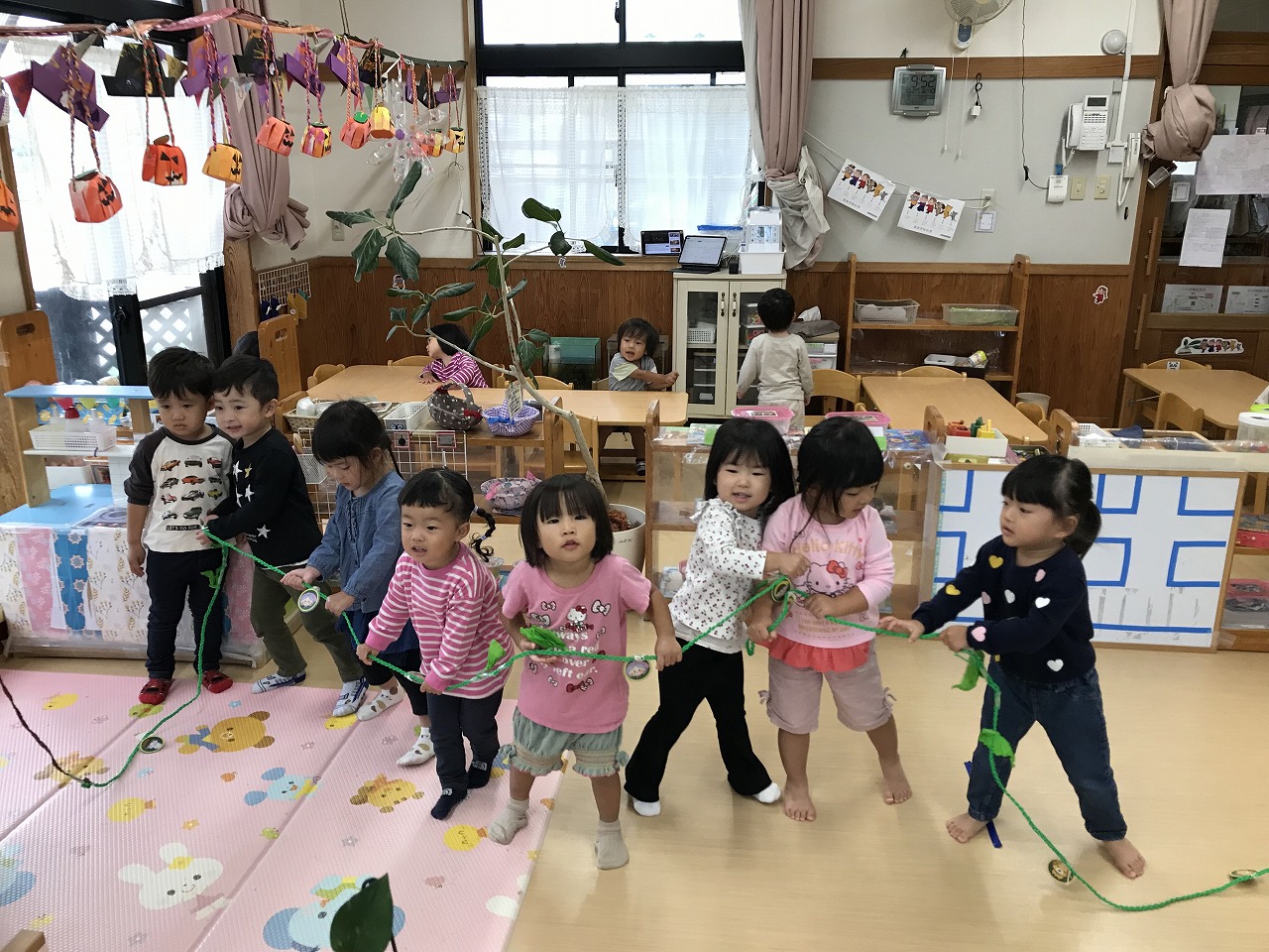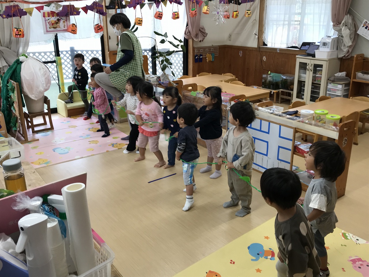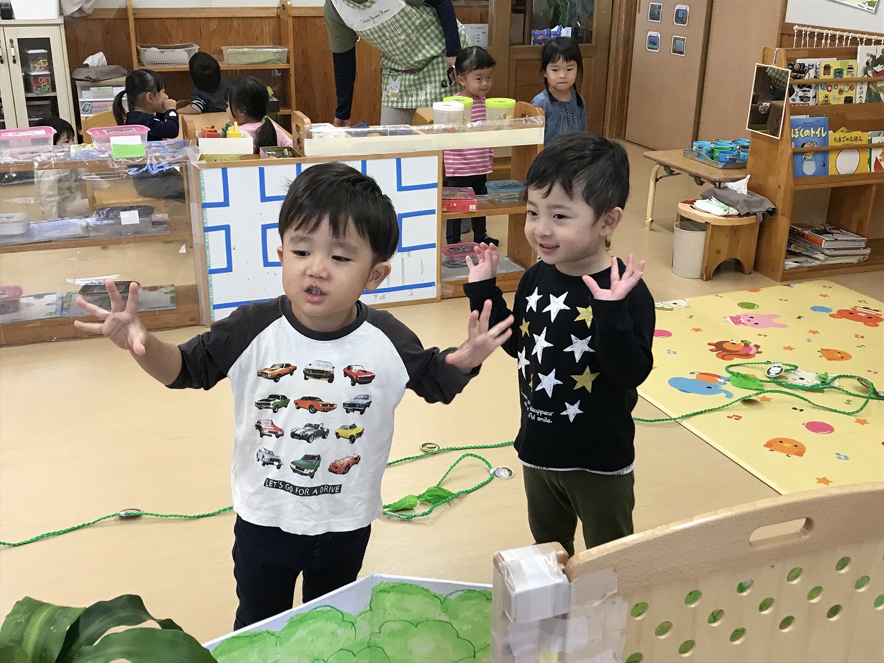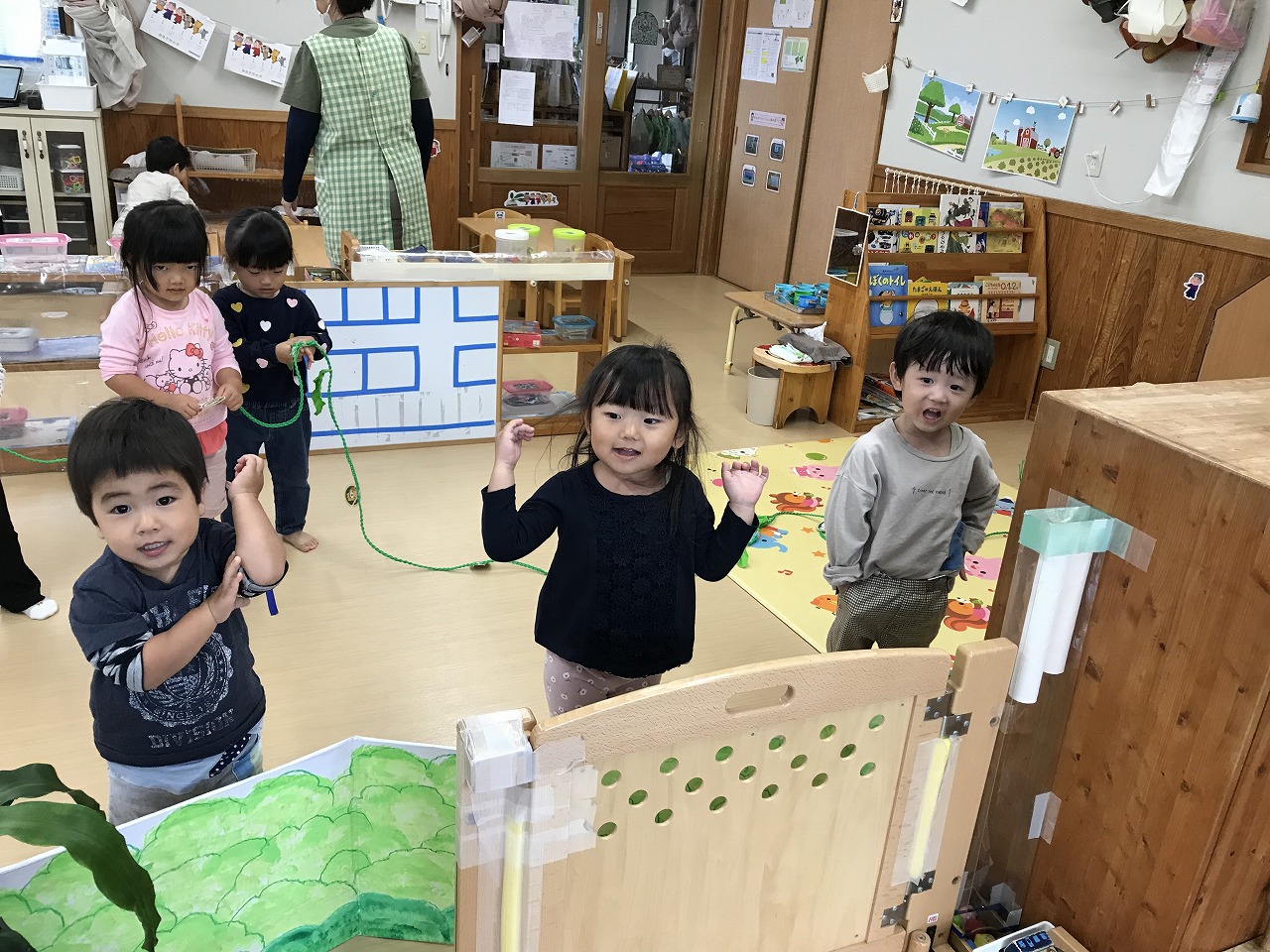 発表会がだんだん近づいてきました。たんぽぽ組(2歳児)は朝から劇あそび、リズムの練習をしました。ずいぶんセリフも覚えて声も大きくなり、他の友だちのセリフまで一緒に言っています。またリズムでは自分の立ち位置のテープの色を覚え、「ゴーゴー!」「パンパカパーン!」と声を出しながら楽しんでいます。今までモジモジしていた子が急におおきな声で言うようになったり、踊らなかった子がニコニコして跳びはねたりと日々成長の見られる子ども達です。
