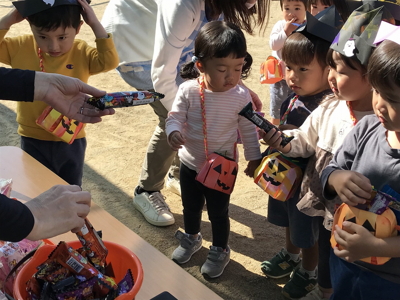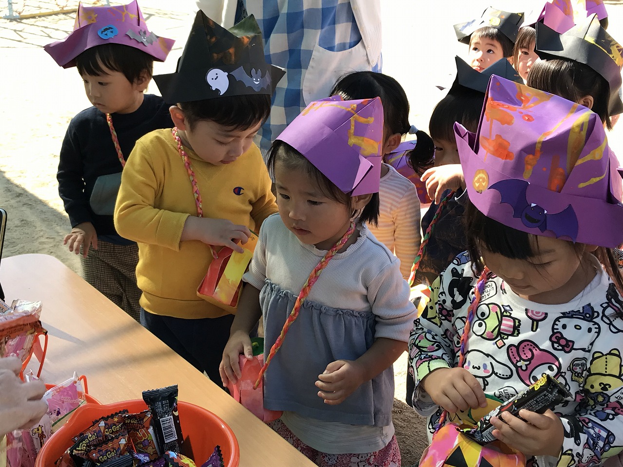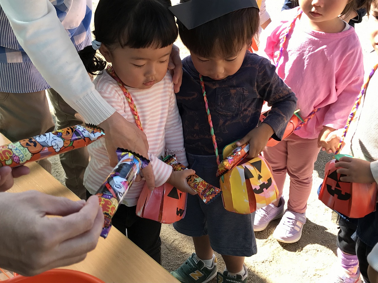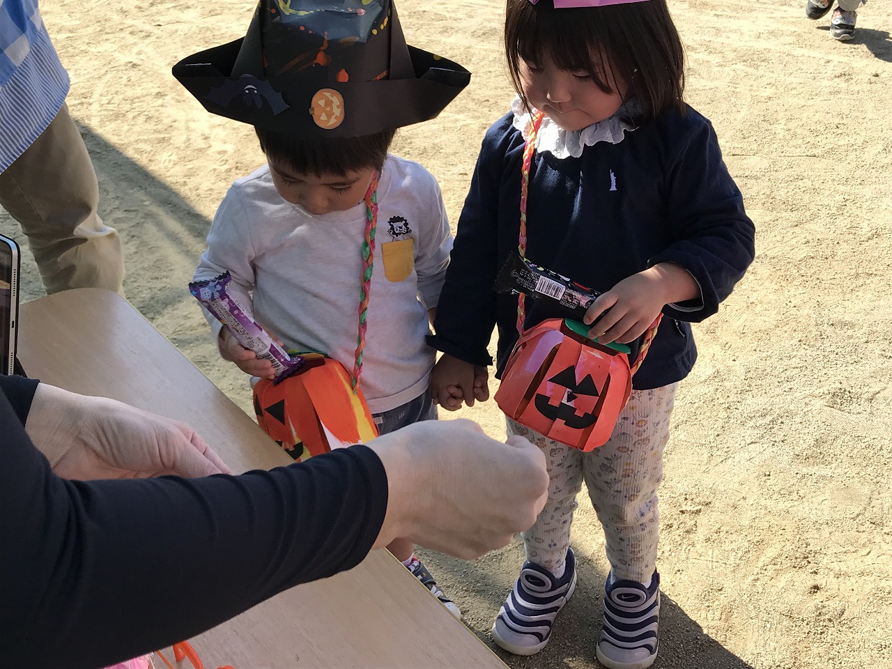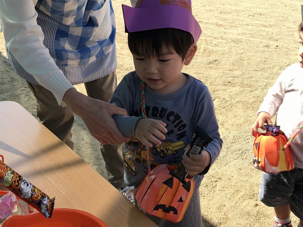 待ちに待ったハロウィンの日。たんぽぽ組(2歳児)は早くから帽子やバックをつくり、部屋に飾っていたので「明日、ハロウィン?」と待ち遠しかったようです。最初に暗い中でのブラックシアターは泣いてしまった子もいましたが、ほとんどの子が終わって楽しかったね!と言っていました。さて、準備してお菓子をもらいに回ります。「今日は三つもらいにいくよ!」としっかり数えながら「トリックオアトリート!」とみんなで元気に声を出してもらいました。お菓子はおうちでのお楽しみです…。