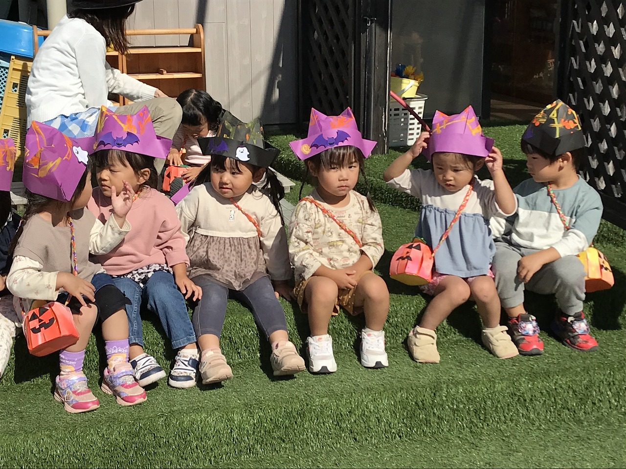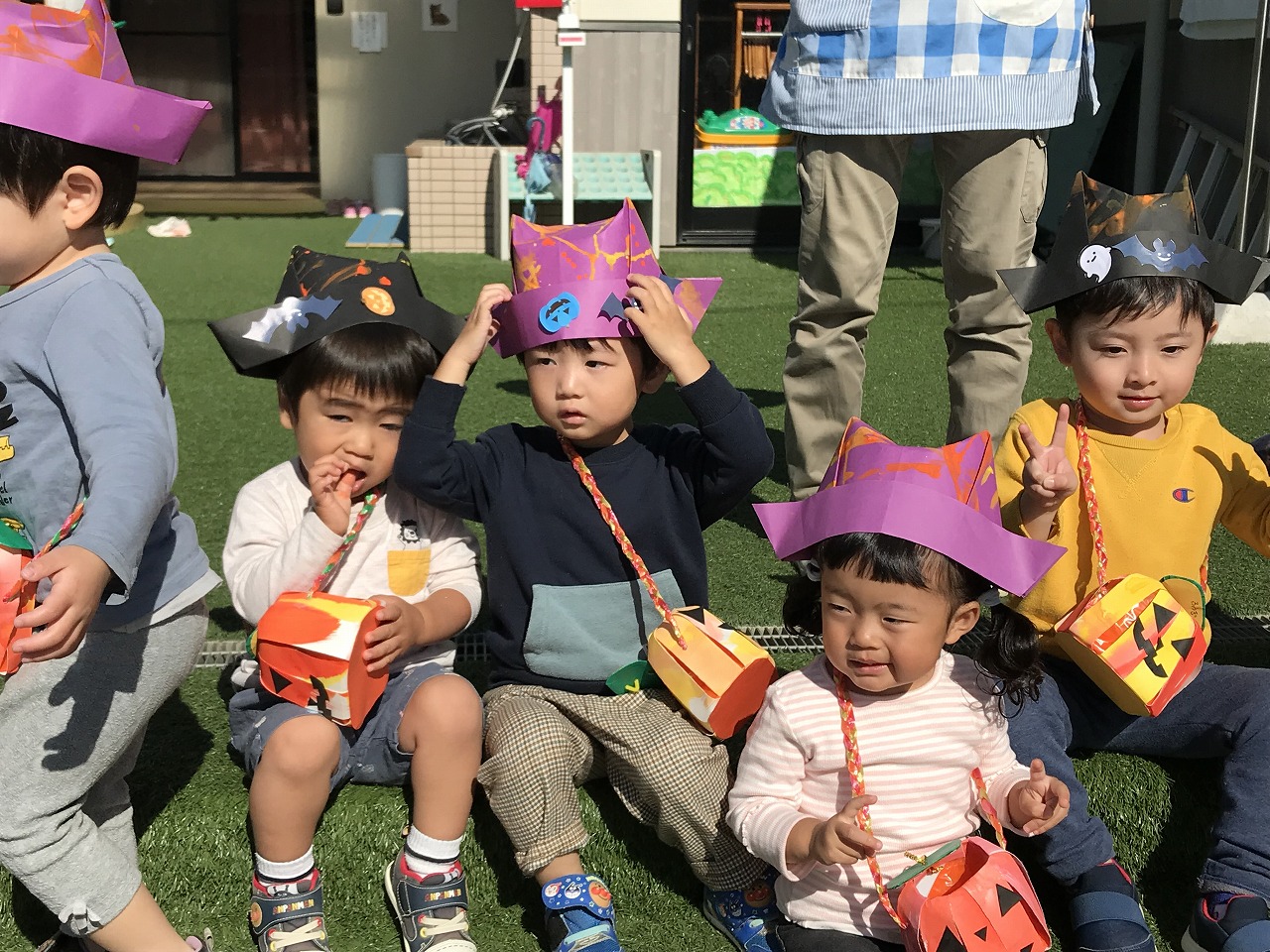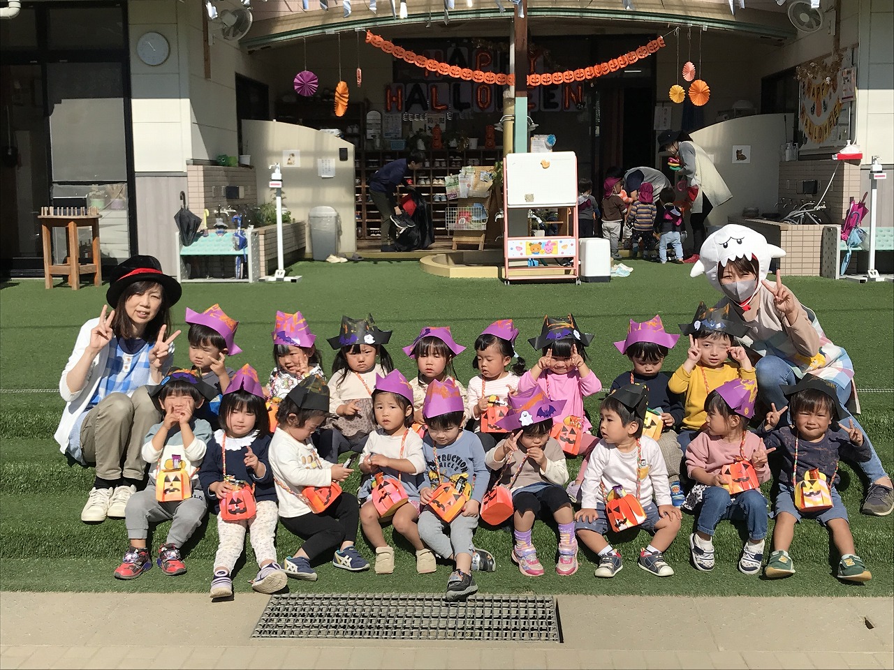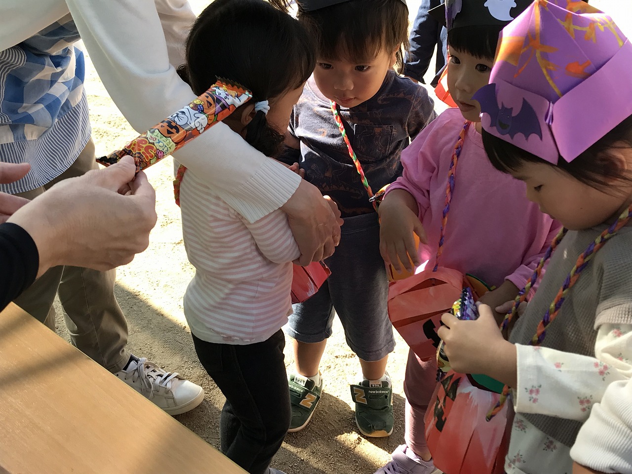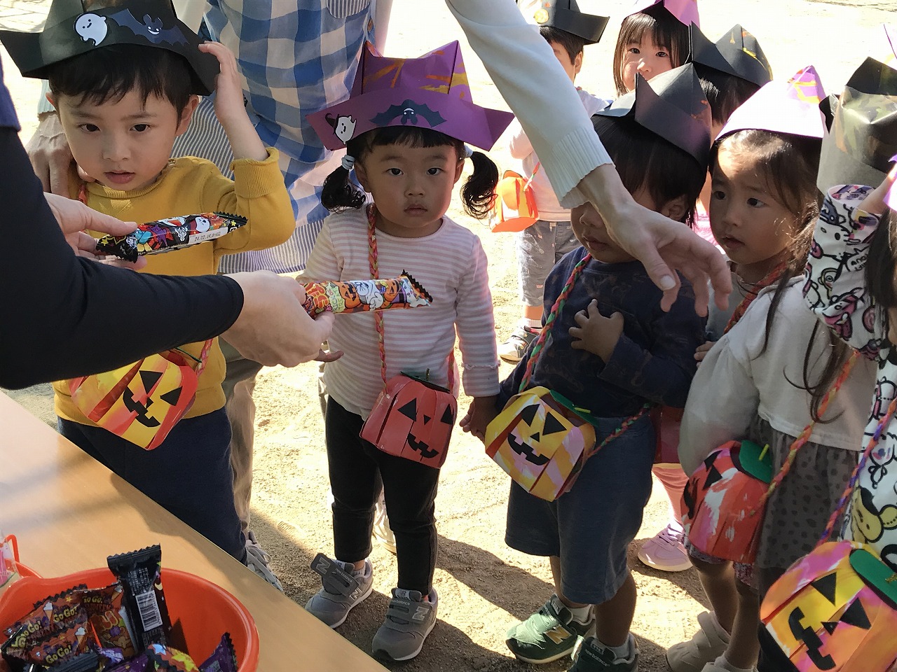 待ちに待ったハロウィンの日。たんぽぽ組(2歳児)は早くから帽子やバックをつくり、部屋に飾っていたので「明日、ハロウィン?」と待ち遠しかったようです。最初に暗い中でのブラックシアターは泣いてしまった子もいましたが、ほとんどの子が終わって楽しかったね!と言っていました。さて、準備してお菓子をもらいに回ります。「今日は三つもらいにいくよ!」としっかり数えながら「トリックオアトリート!」とみんなで元気に声を出してもらいました。お菓子はおうちでのお楽しみです…。