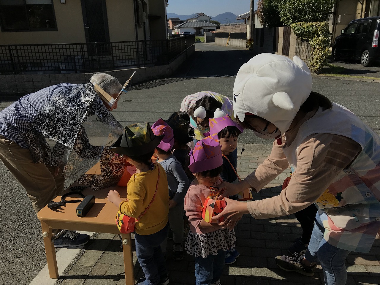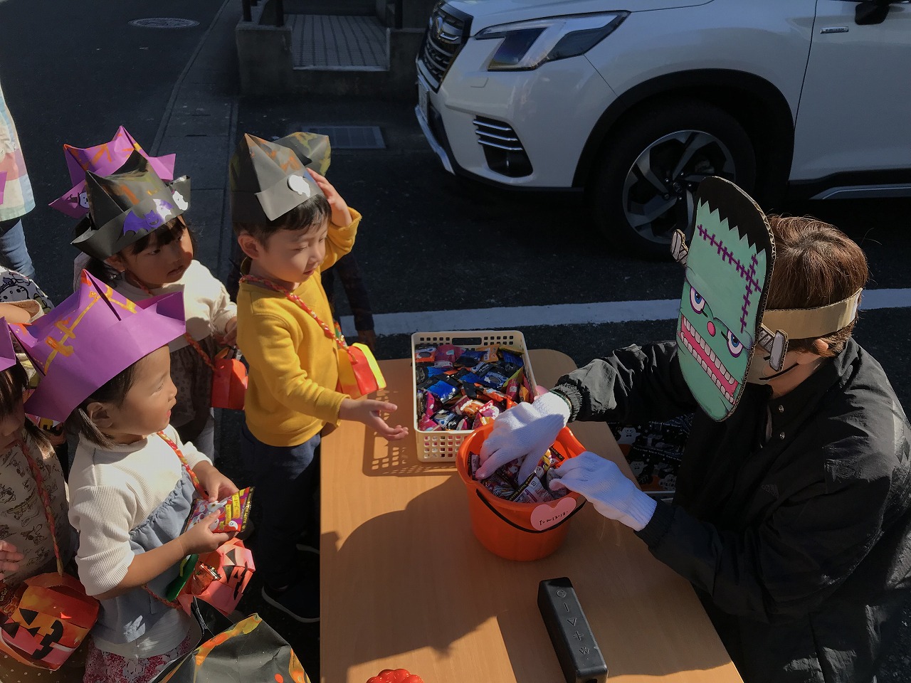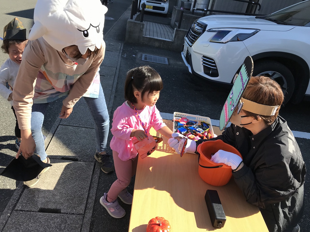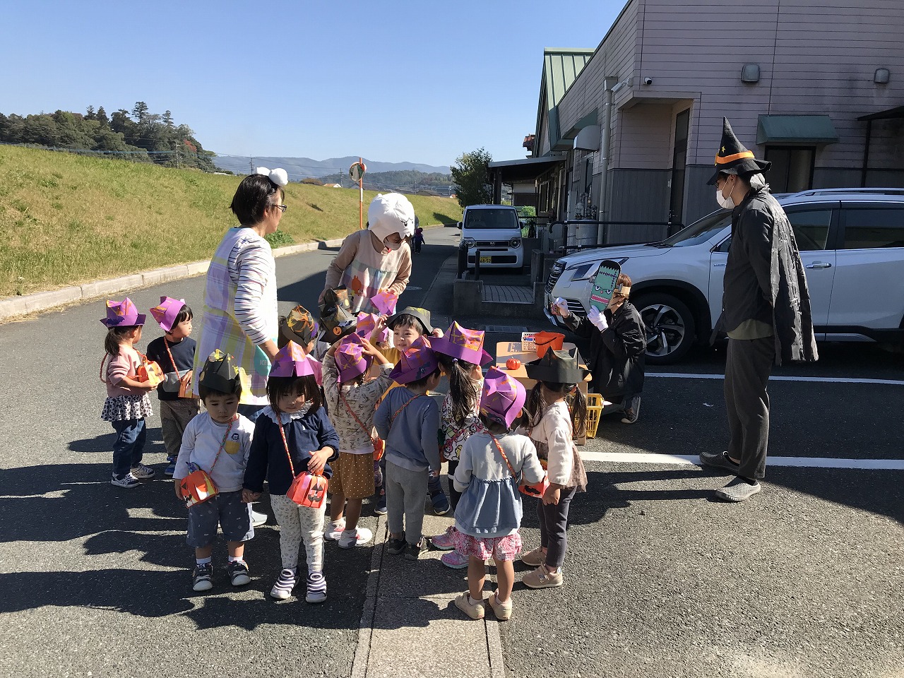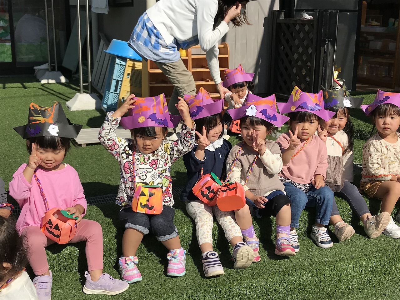 待ちに待ったハロウィンの日。たんぽぽ組(2歳児)は早くから帽子やバックをつくり、部屋に飾っていたので「明日、ハロウィン?」と待ち遠しかったようです。最初に暗い中でのブラックシアターは泣いてしまった子もいましたが、ほとんどの子が終わって楽しかったね!と言っていました。さて、準備してお菓子をもらいに回ります。「今日は三つもらいにいくよ!」としっかり数えながら「トリックオアトリート!」とみんなで元気に声を出してもらいました。お菓子はおうちでのお楽しみです…。